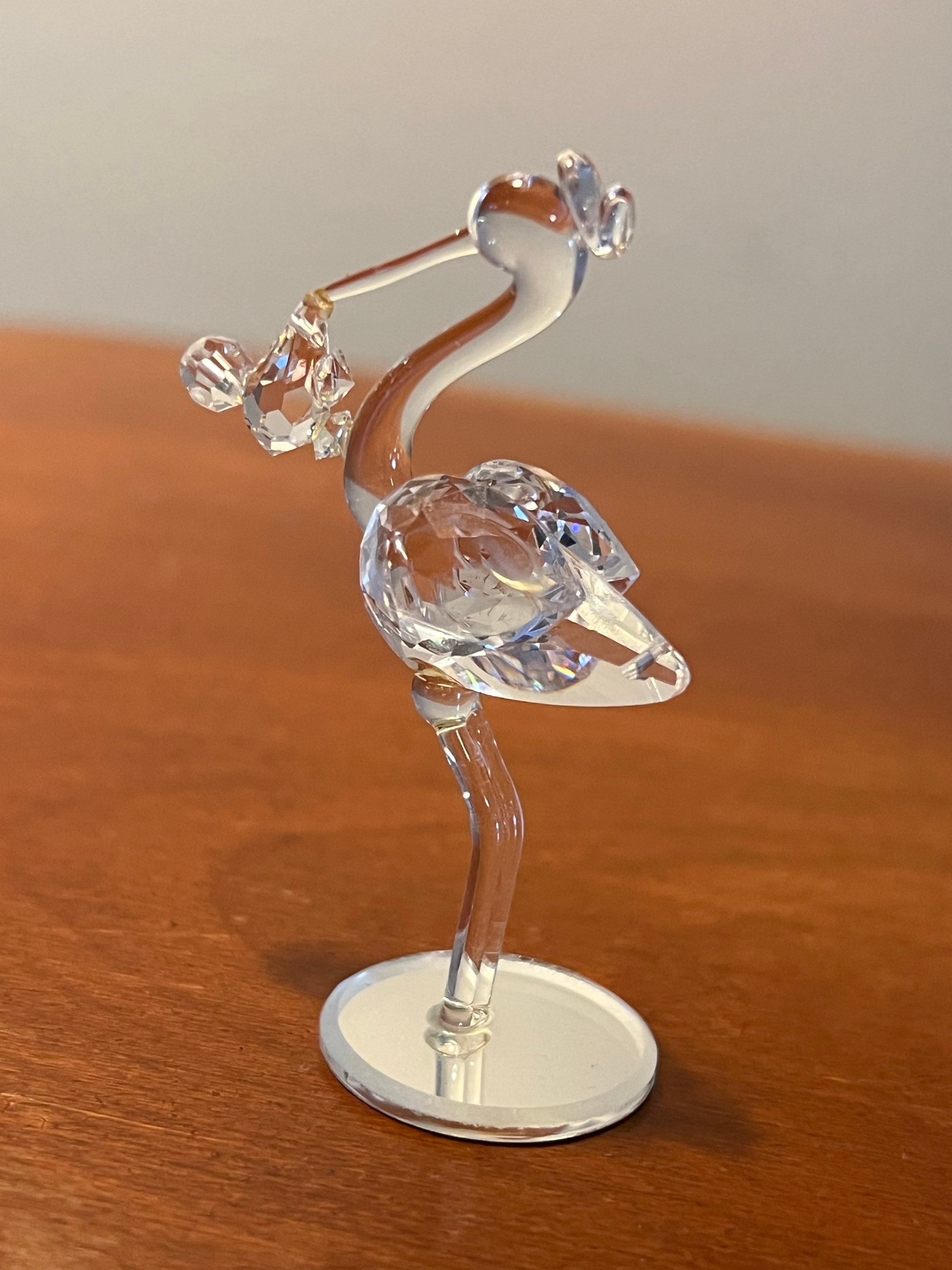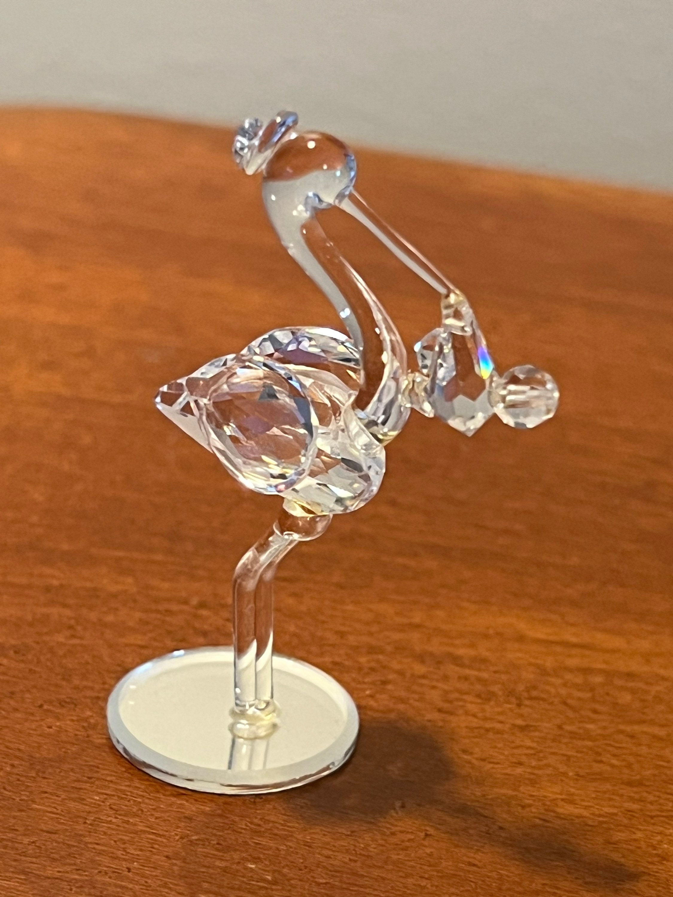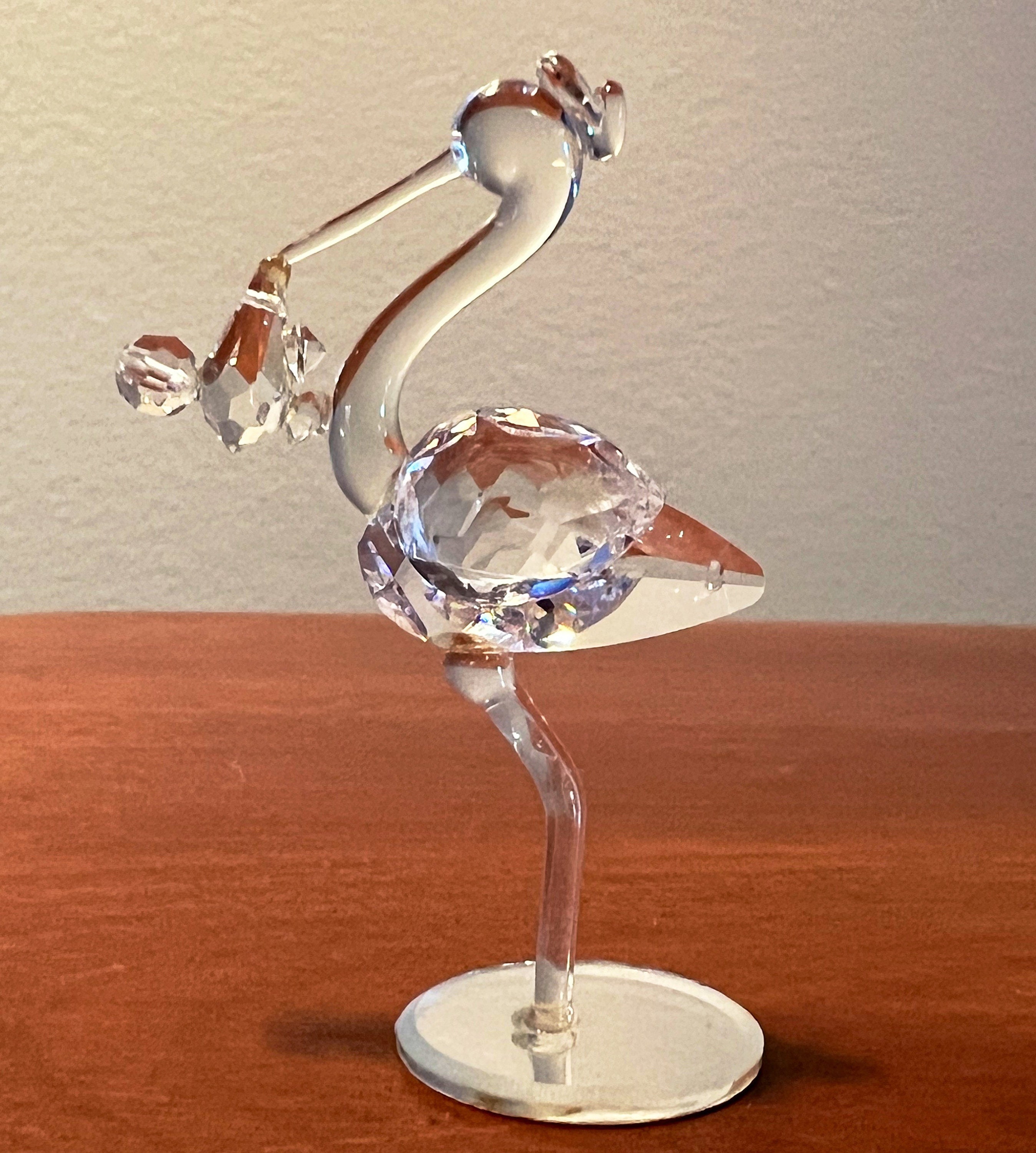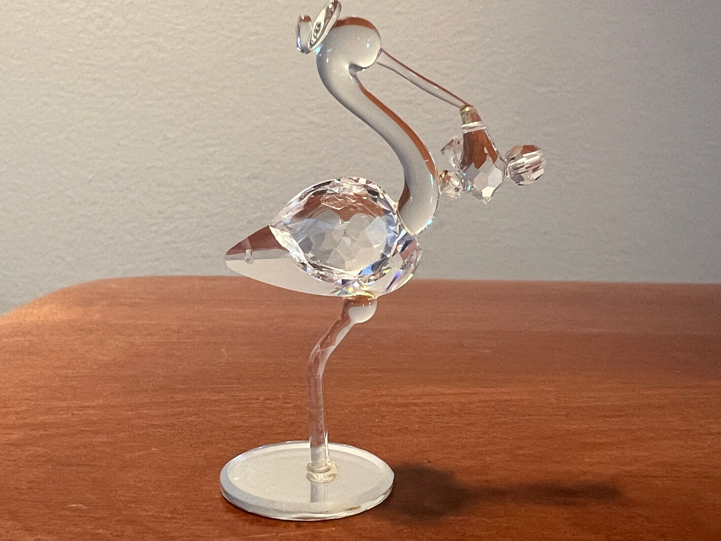 We have a Vintage Crystal Glass Stork figurine. It is in very nice condition. Perfect gift to let family know you are expecting!