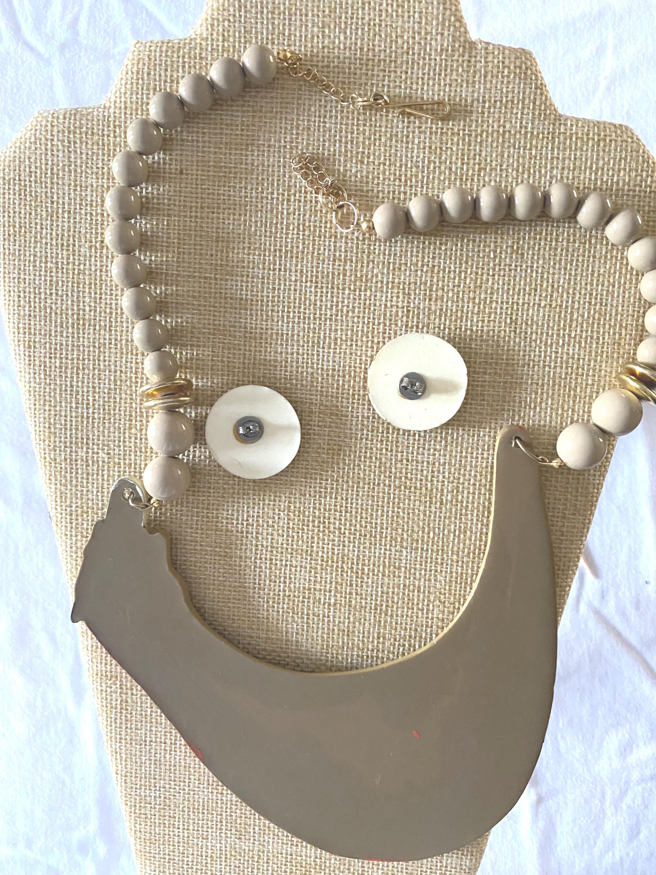 Crafted from high-quality resin, the necklace features a striking giraffe-shaped pendant with intricate cut-out details that mimic the animal’s distinctive spots. The beaded chain, adorned with cream-colored beads and subtle gold accents, complements the pendant beautifully. The matching earrings echo the giraffe motif, creating a coordinated look that’s both fun and sophisticated.