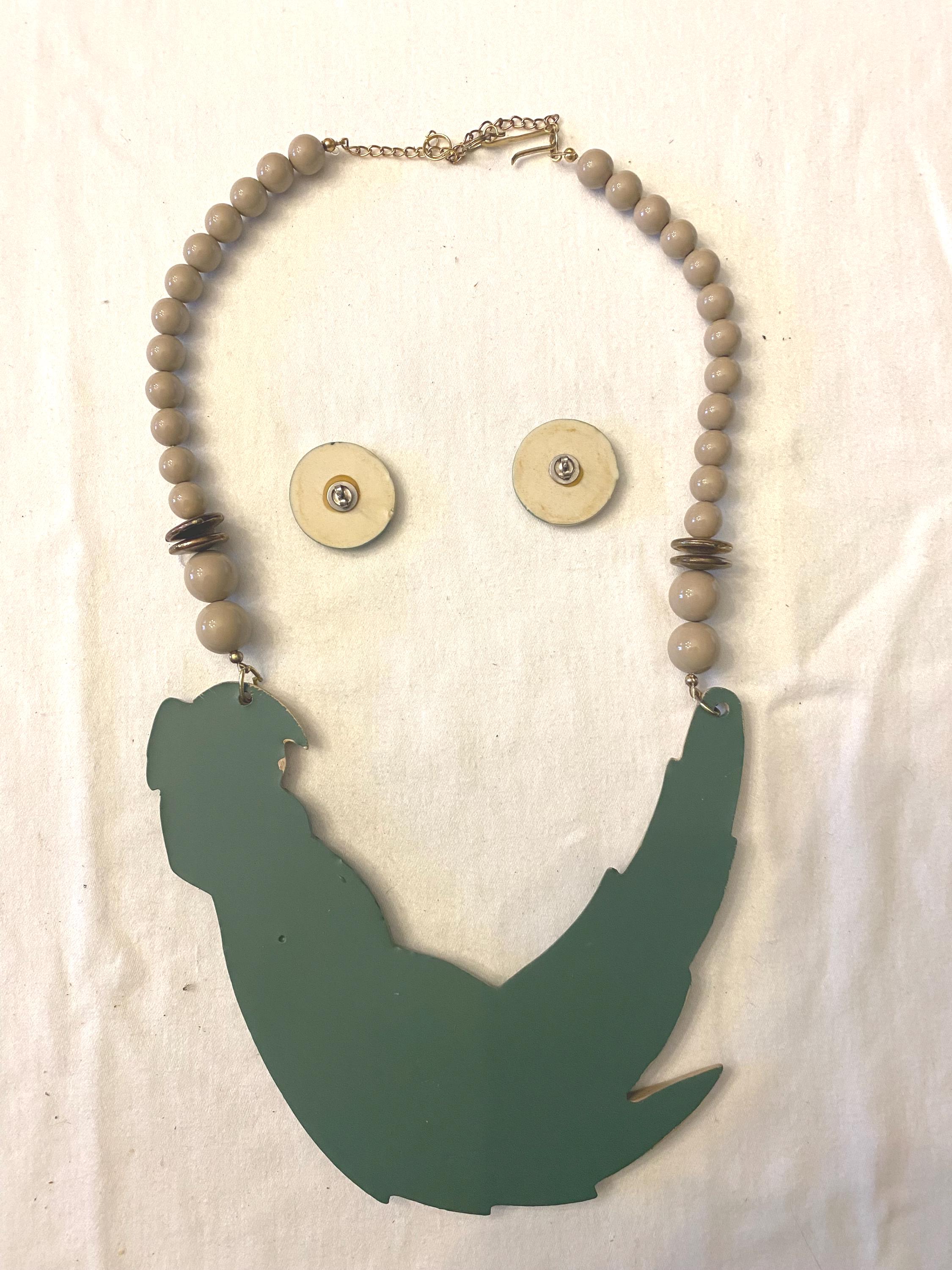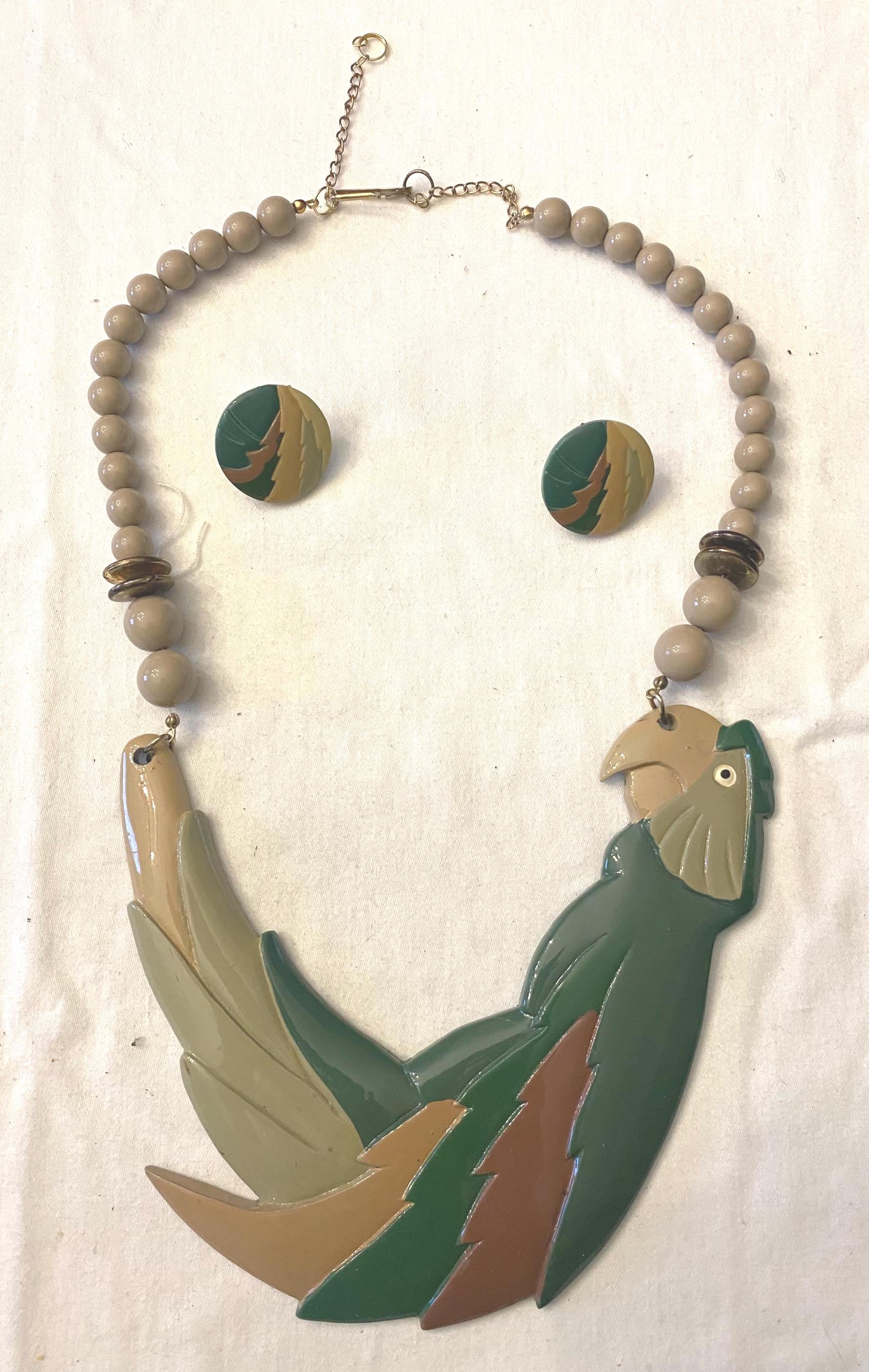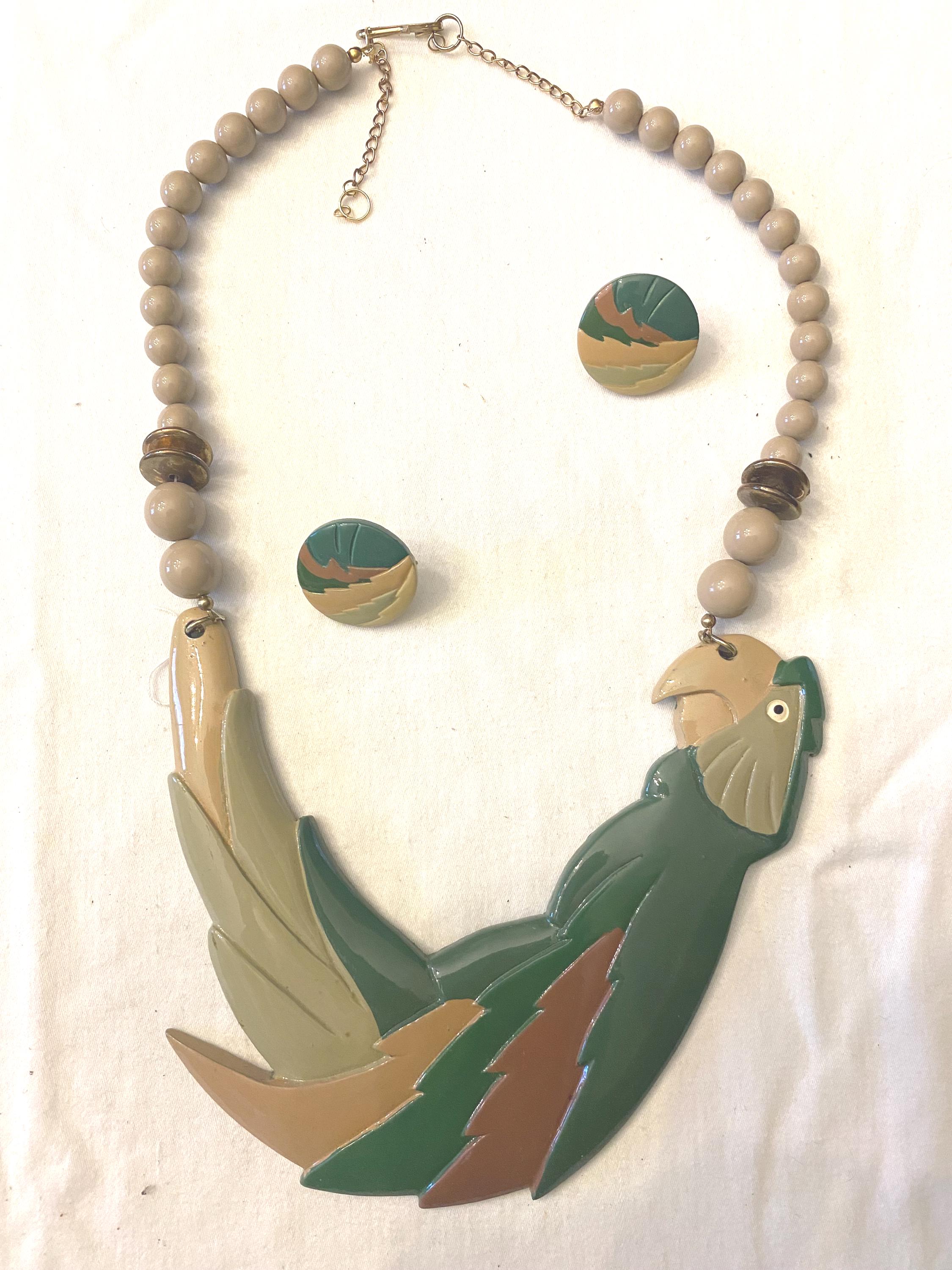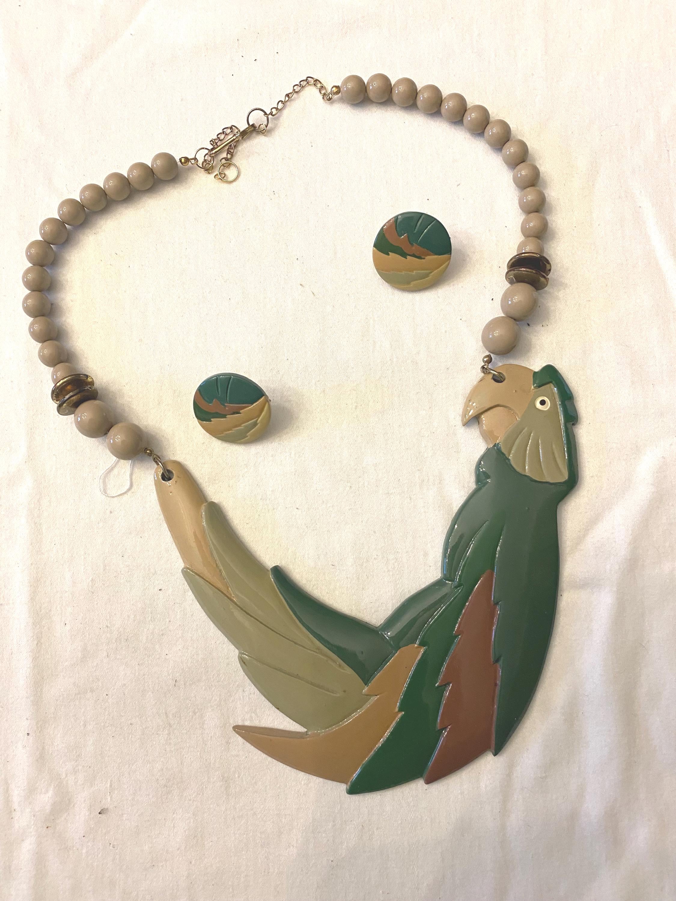 This unique necklace features a striking parrot pendant with detailed feather accents in shades of green, brown, and beige, complemented by a beaded chain made of neutral-toned beads and subtle spacer accents. The matching earrings echo the parrot motif, creating a cohesive and fun accessory set.