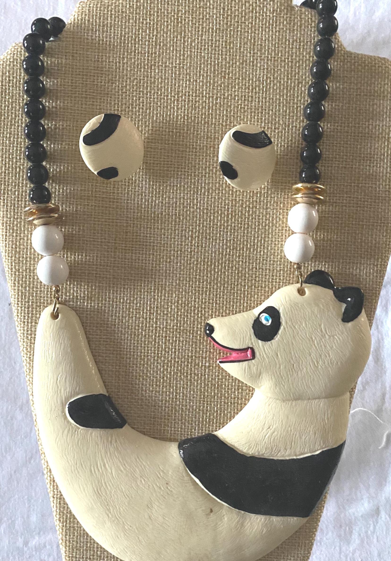 Discover this adorable vintage panda bear figural bib and beaded statement resin necklace set, a truly unique piece perfect for lovers of vintage jewelry and charming collectibles. Featuring a whimsical panda design, this set includes a striking necklace and matching earrings that highlight the playful spirit of panda bear jewelry.