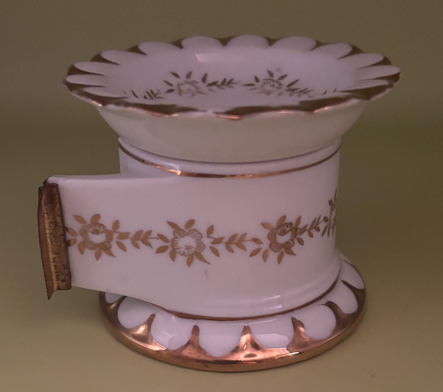 We have a gorgeous Vintage Porcelain Tape/Stamp Dispenser with Stamp Bowl. It has lovely white with gold gilding. It is stamped H1000 on the bottom.