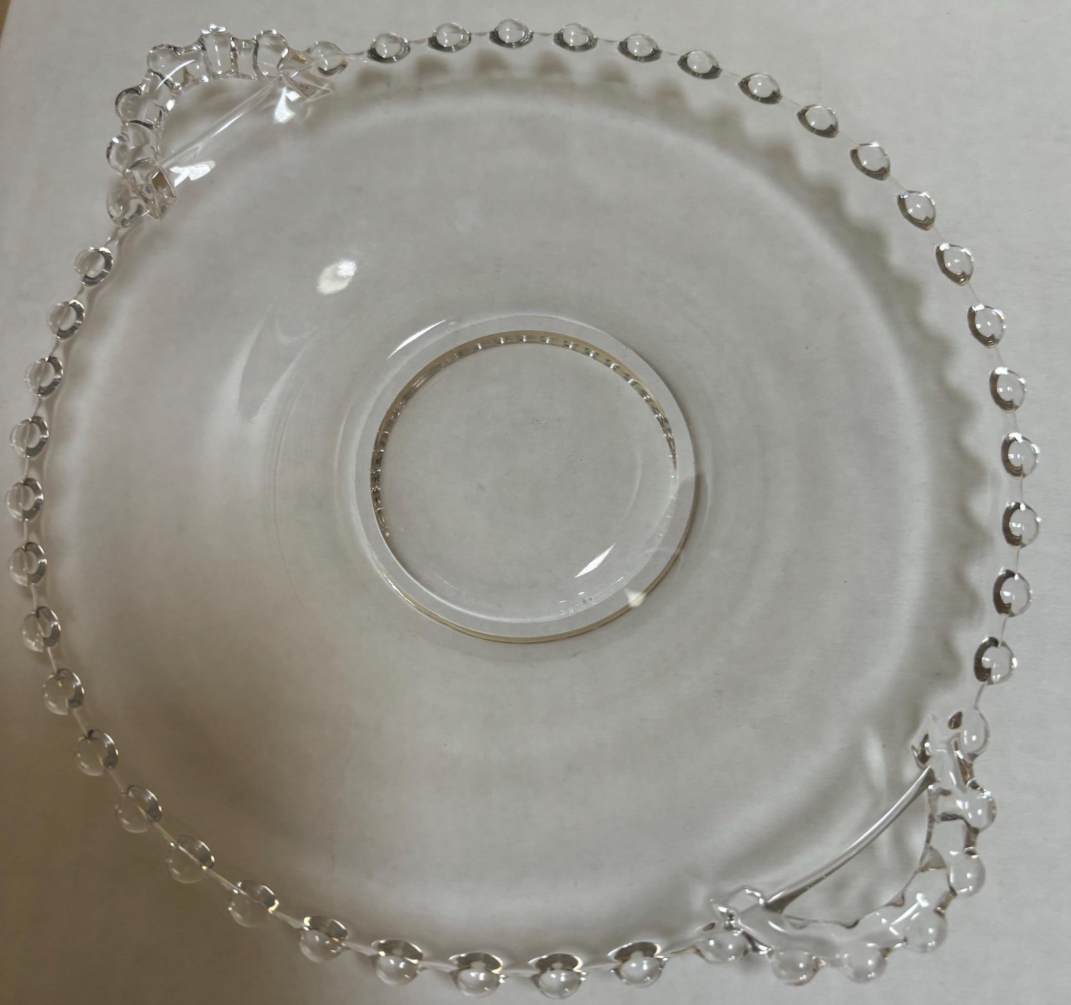 Measuring approximately 8 1/2 inches wide from handle to handle, with a base diameter of 2 5/8 inches and a height of 7/8 inches, this plate or serving platter showcases intricate candlewick beading along the rim, adding a delicate touch of texture and sophistication. Crafted from high-quality glass, it features the iconic Imperial Glass design, renowned for its durability and beauty.