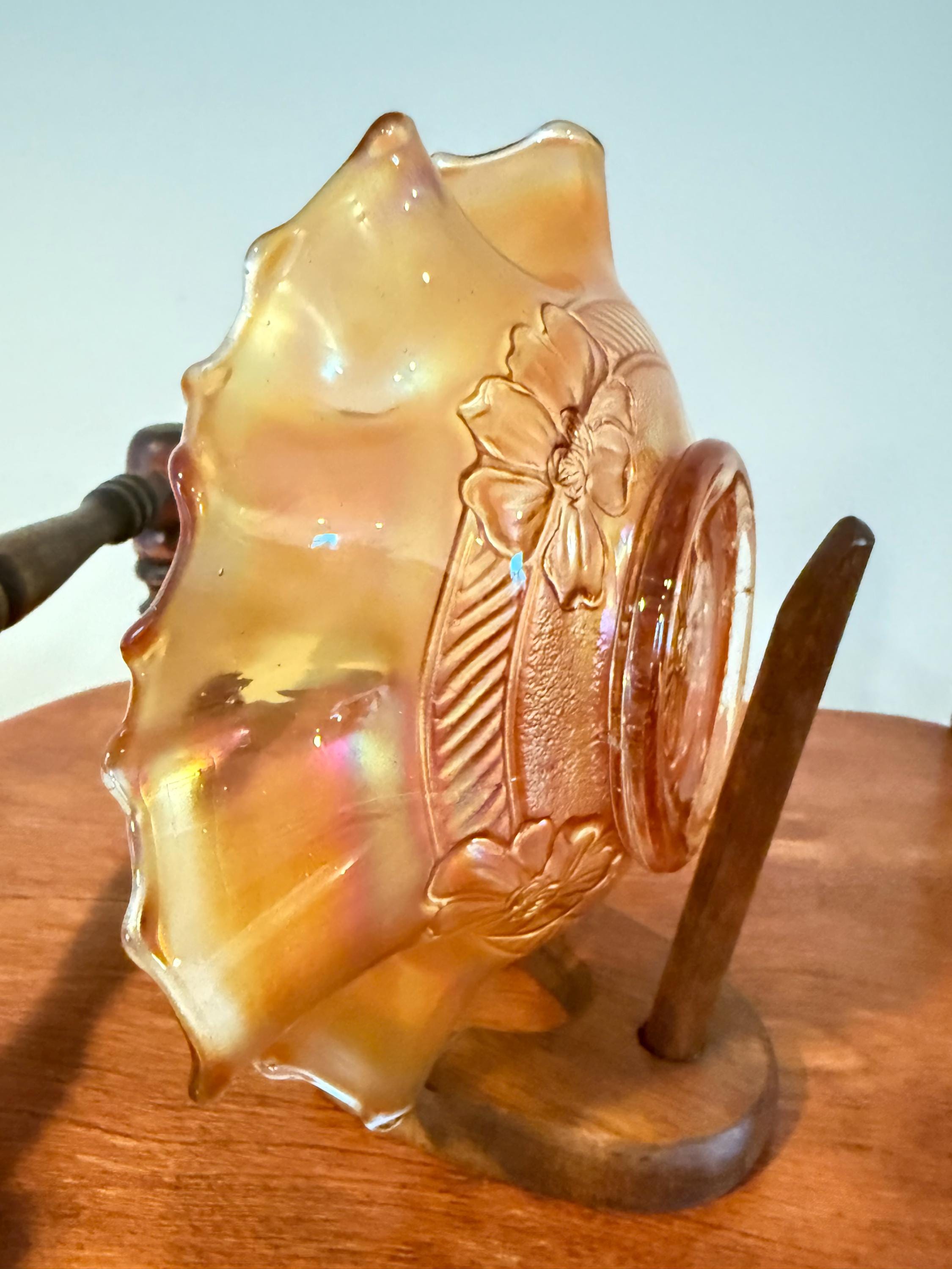 We have a gorgeous Vintage Fenton Marigold Carnival Glass Plate/Dish/Bowl. It features the attractive “Holly” Pattern Design.