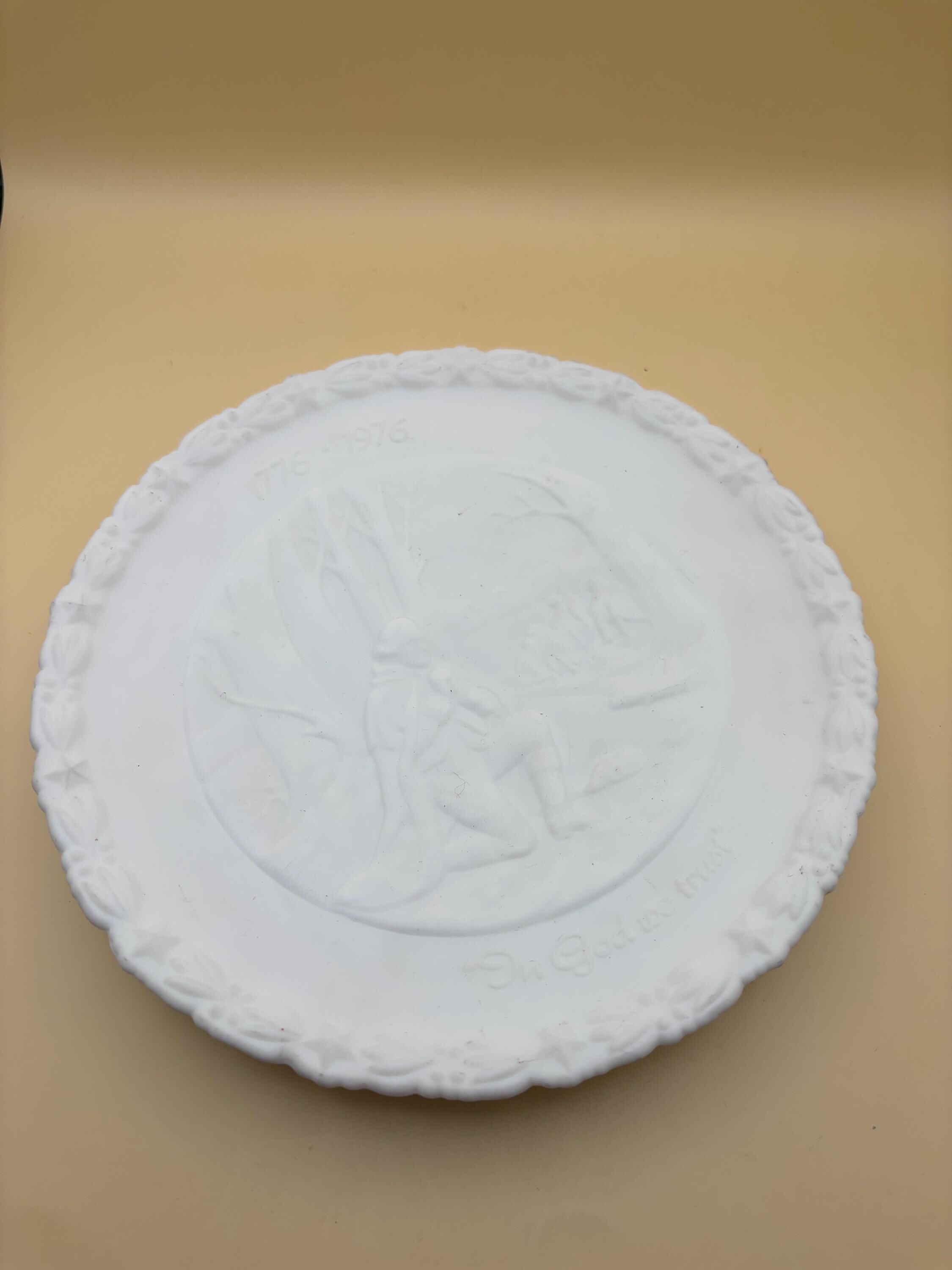 We have a lovely, like new Vintage Fenton White Milk Glass Commemorative Bicentennial Glass Handmade Plate. This plate commemorates the Bicentennial from 1776-1976. It measures approximately 8 1/4" round, 1" high.