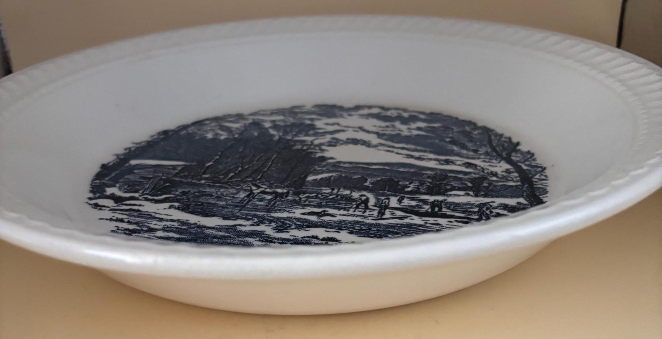 We are pleased to present this gorgeous Vintage Royal China Blue & White Pie Plate. It features a winter with people cutting wood and a horse.