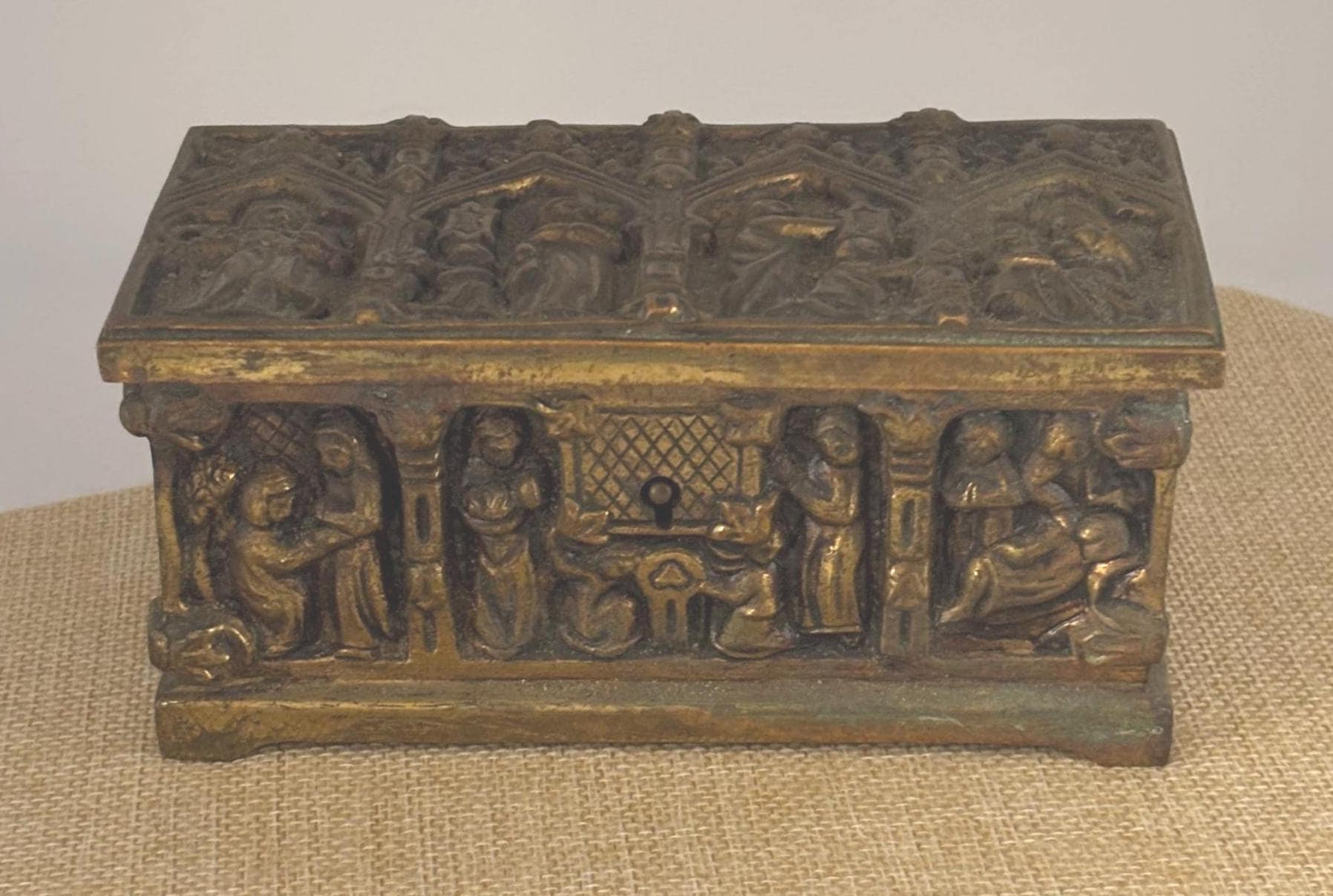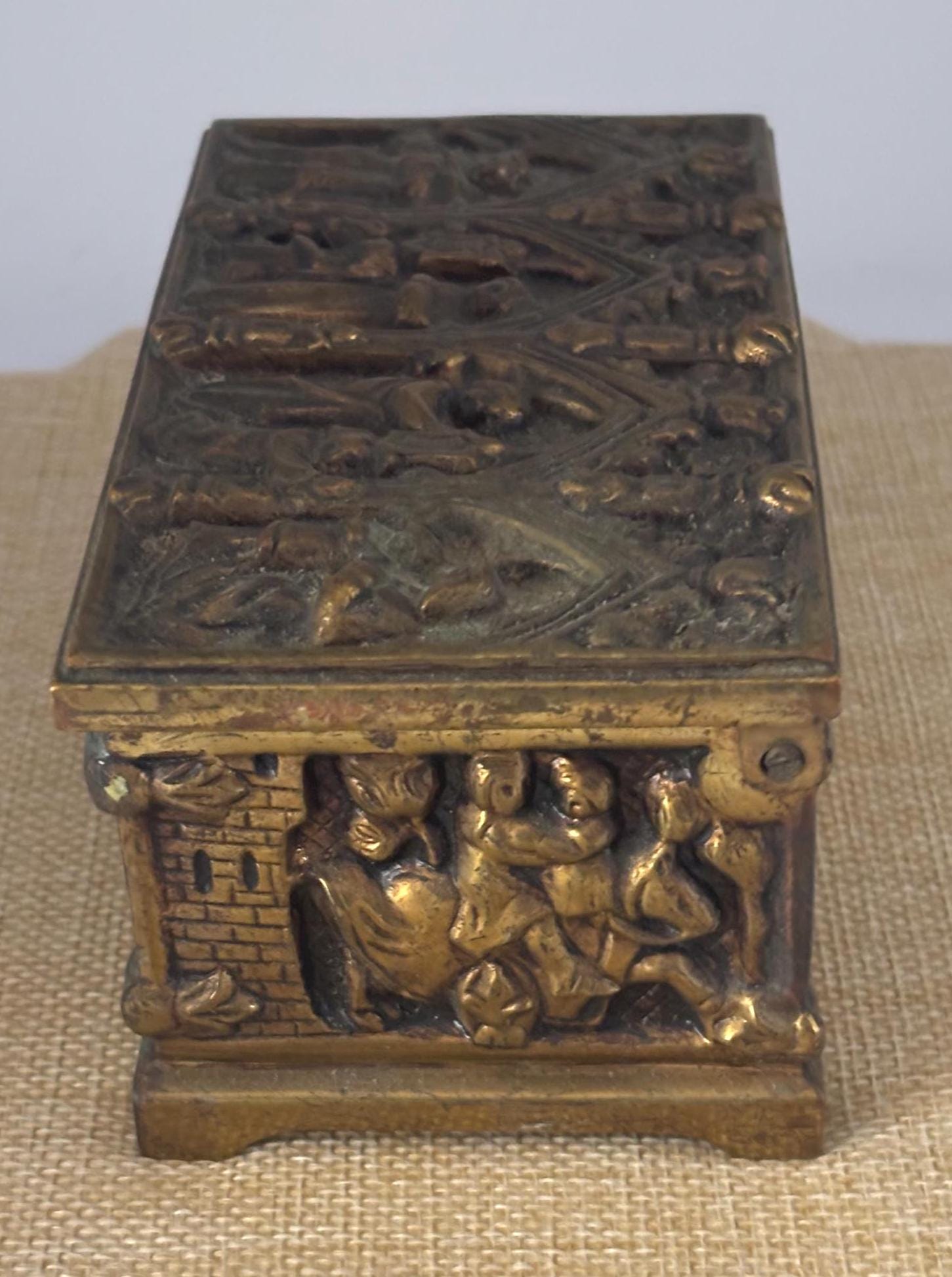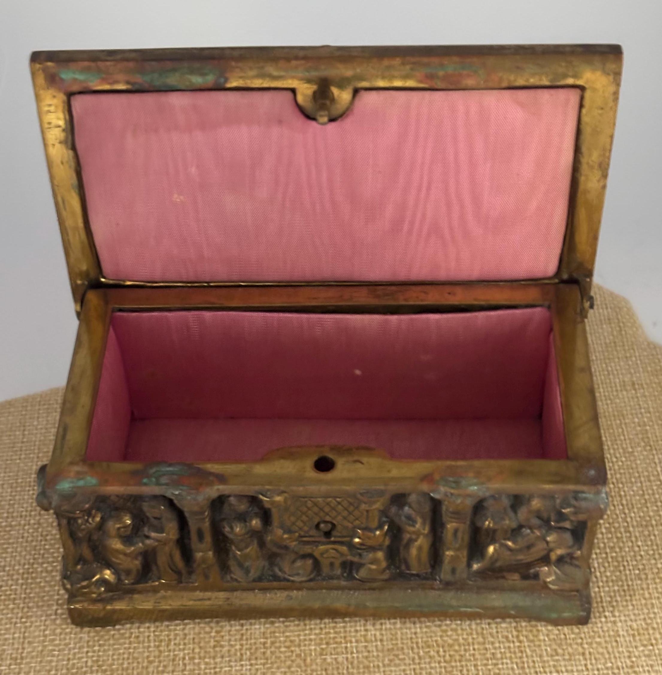 Crafted from durable bronze brass with a captivating gothic design, this antique trinket box features detailed relief carvings that depict a mysterious scene, adding a touch of mystique to your collection. Its rich patina and signs of gentle wear tell the story of centuries past, making it an authentic relic for display or storage. The box opens smoothly even without a key, which is not included, preserving its vintage charm.