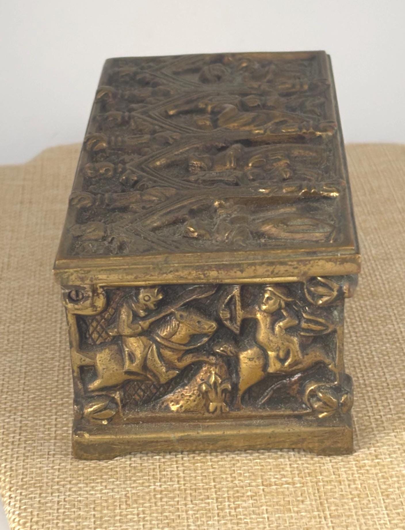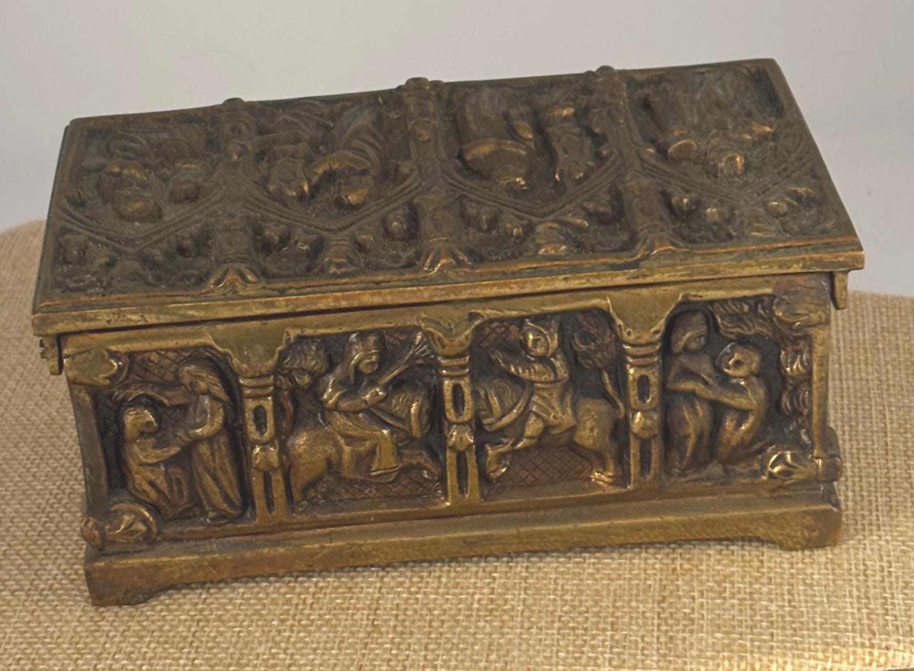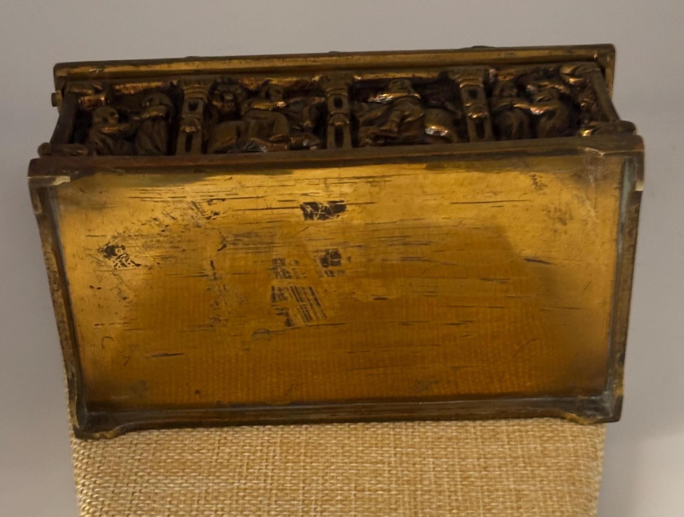 Crafted from durable bronze brass with a captivating gothic design, this antique trinket box features detailed relief carvings that depict a mysterious scene, adding a touch of mystique to your collection. Its rich patina and signs of gentle wear tell the story of centuries past, making it an authentic relic for display or storage. The box opens smoothly even without a key, which is not included, preserving its vintage charm.