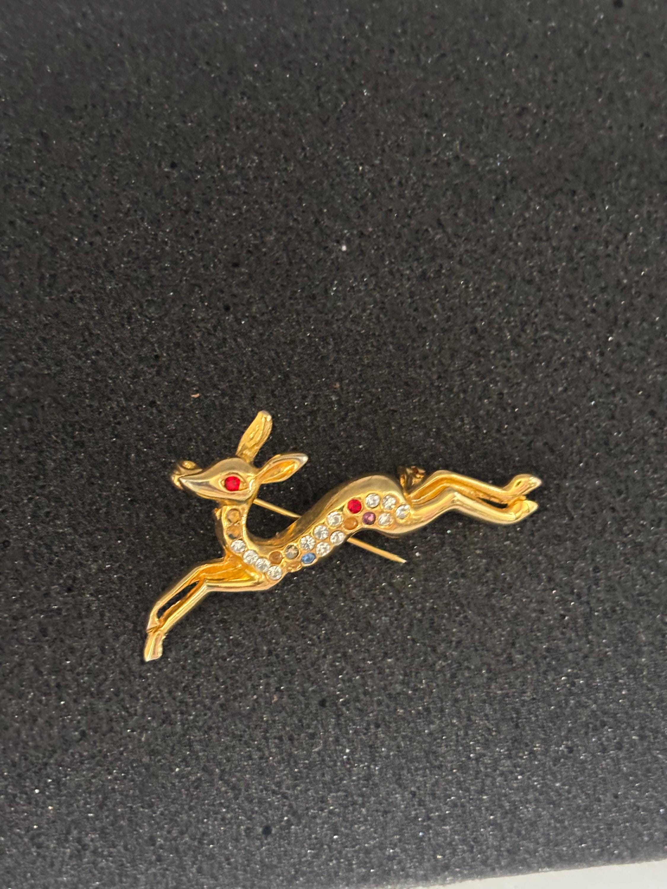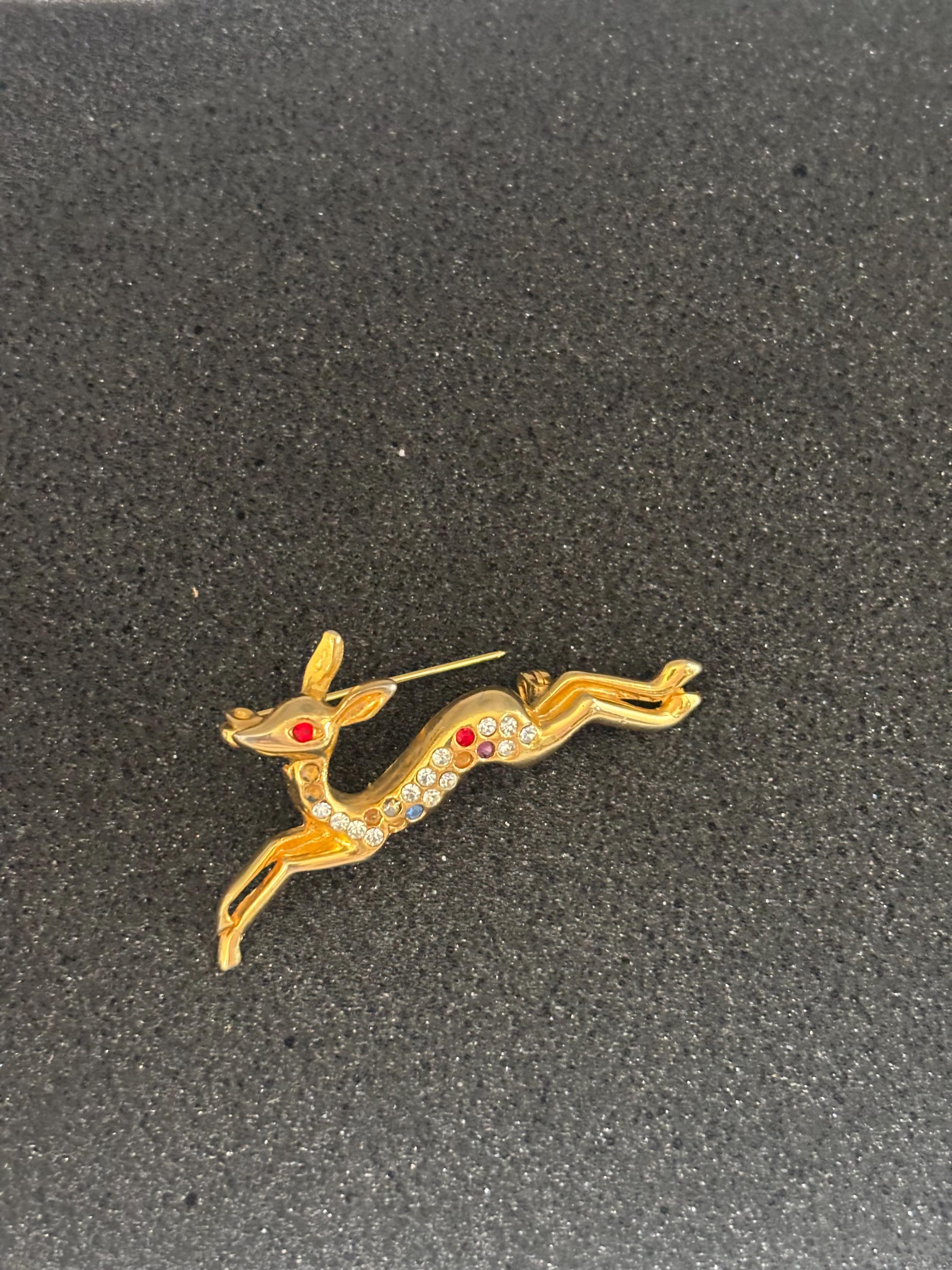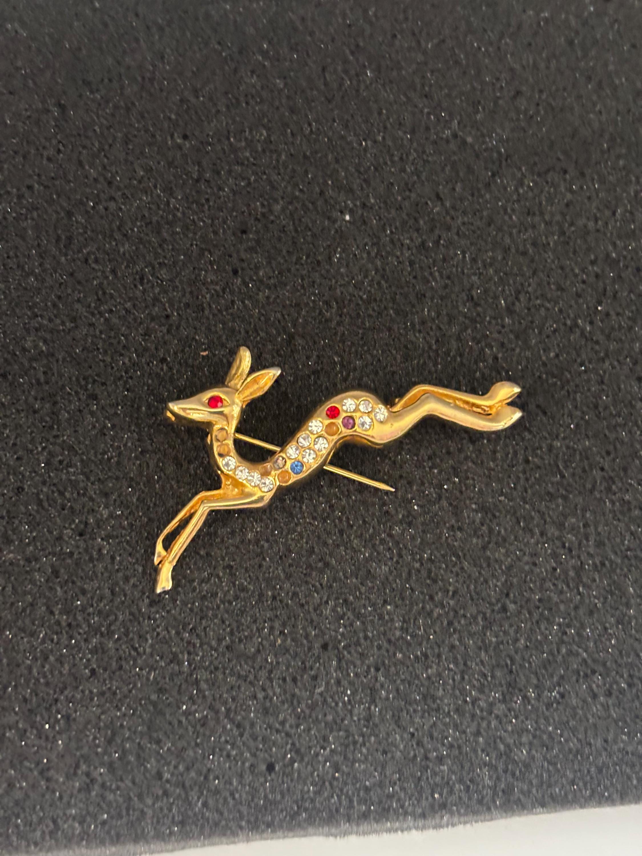 We have a lovely Vintage Running Deer Brooch Gold and Colored Rhinestones.