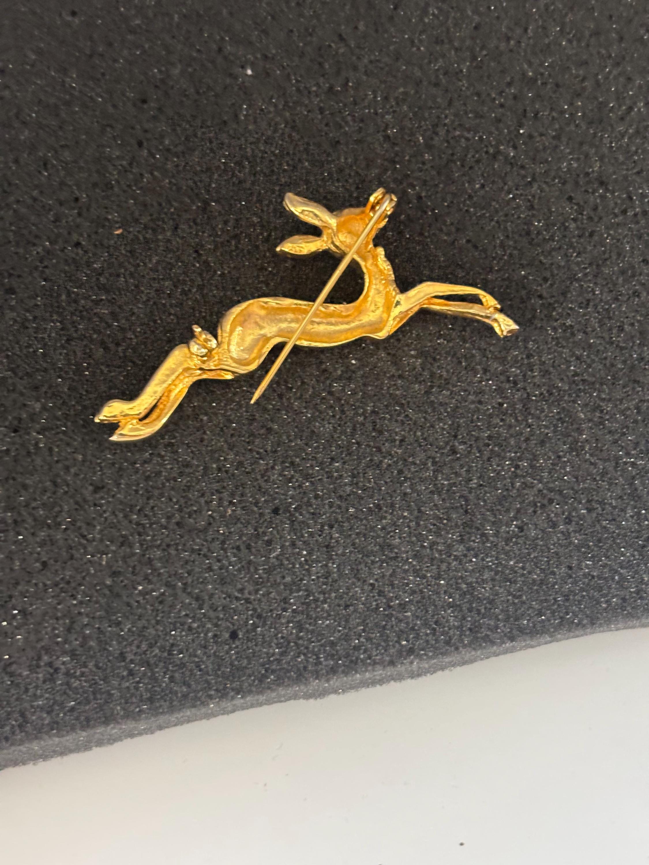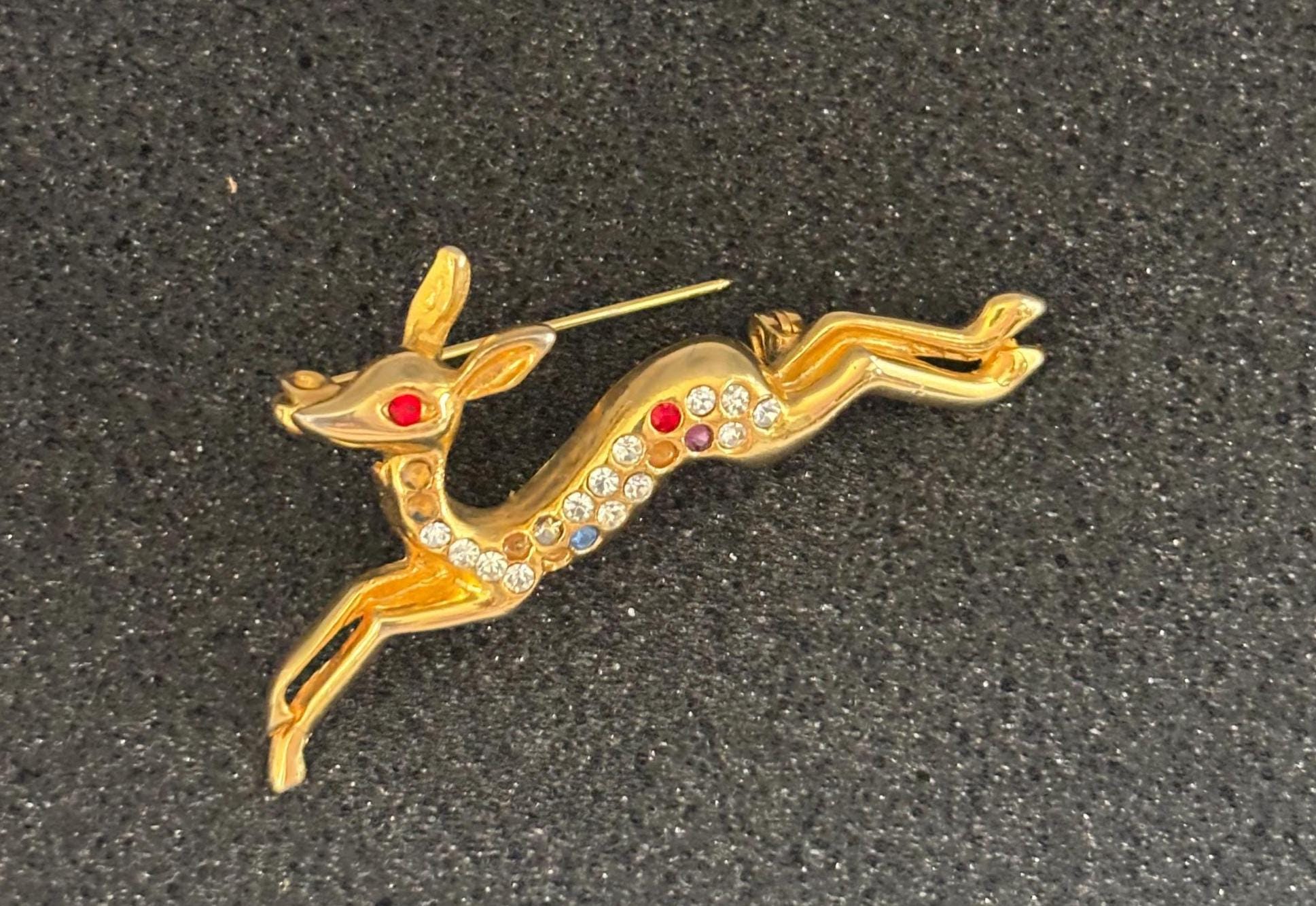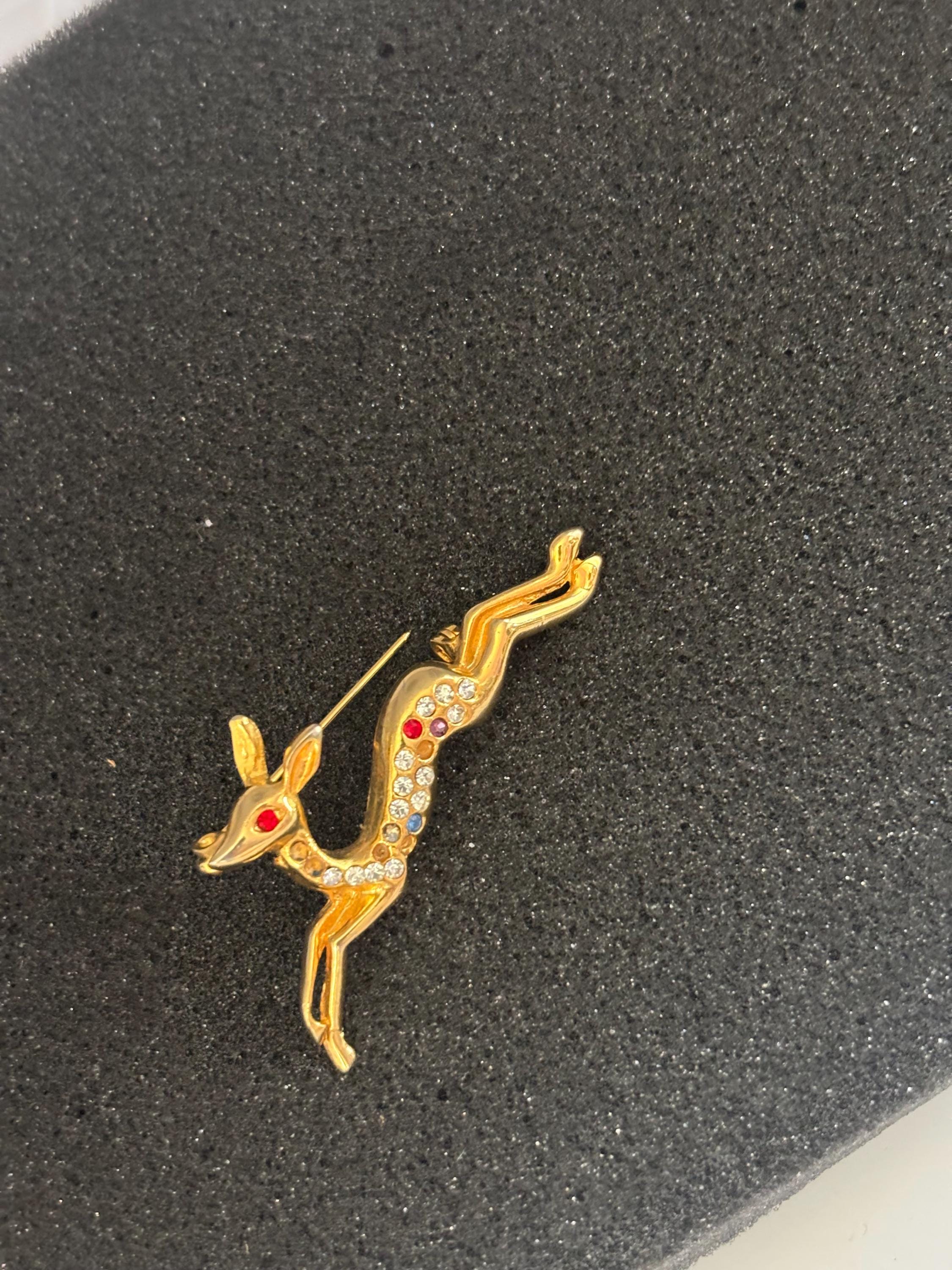 We have a lovely Vintage Running Deer Brooch Gold and Colored Rhinestones.