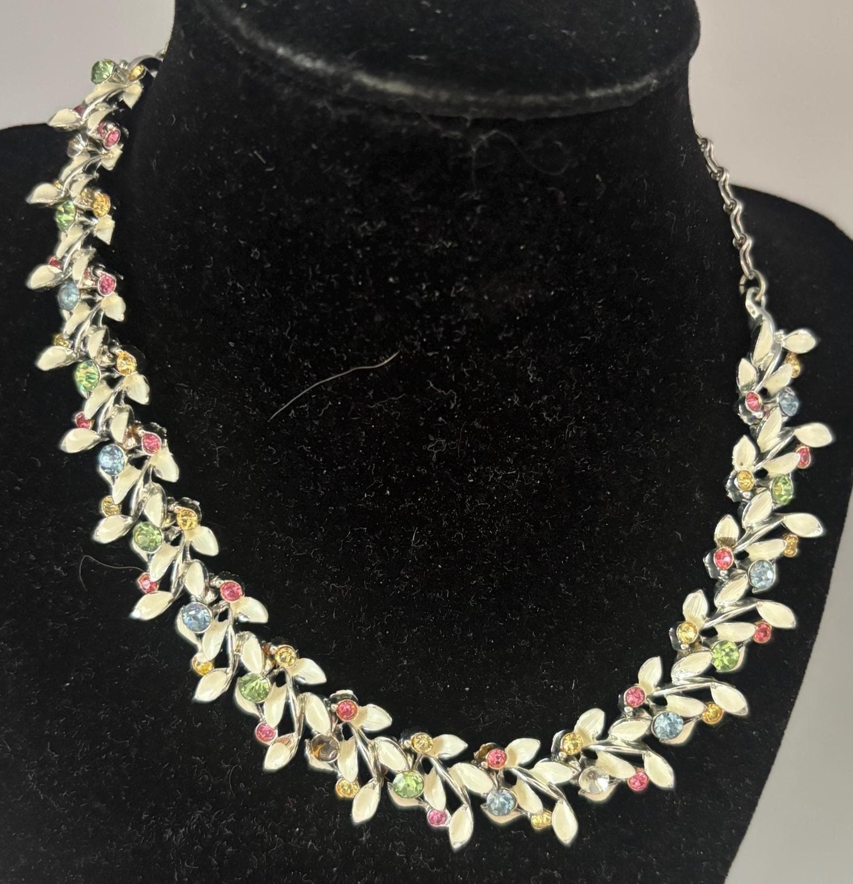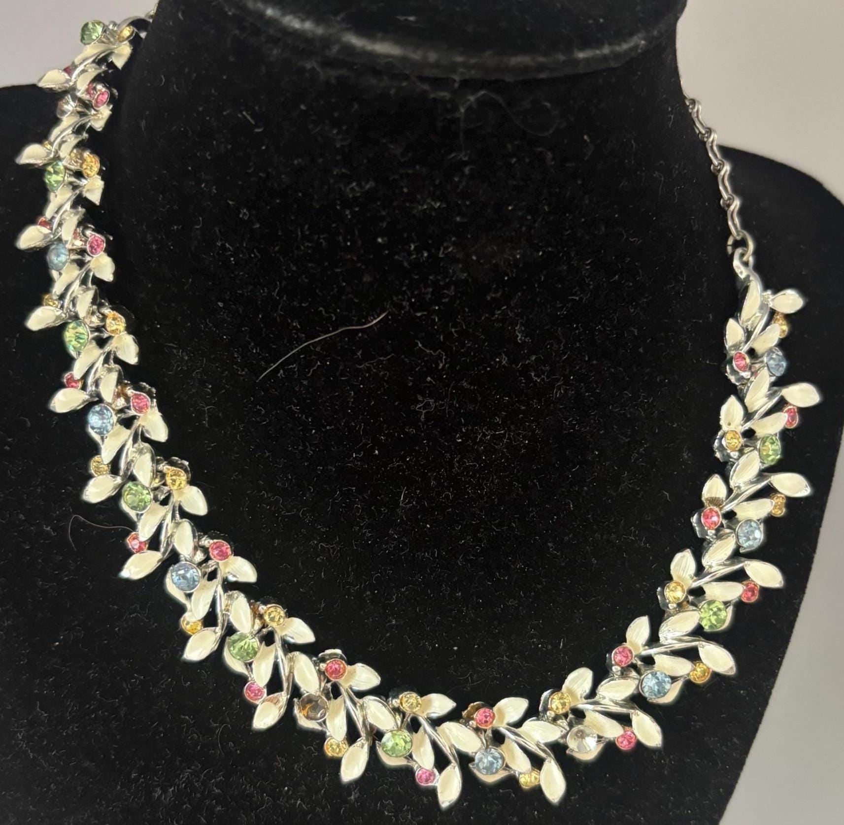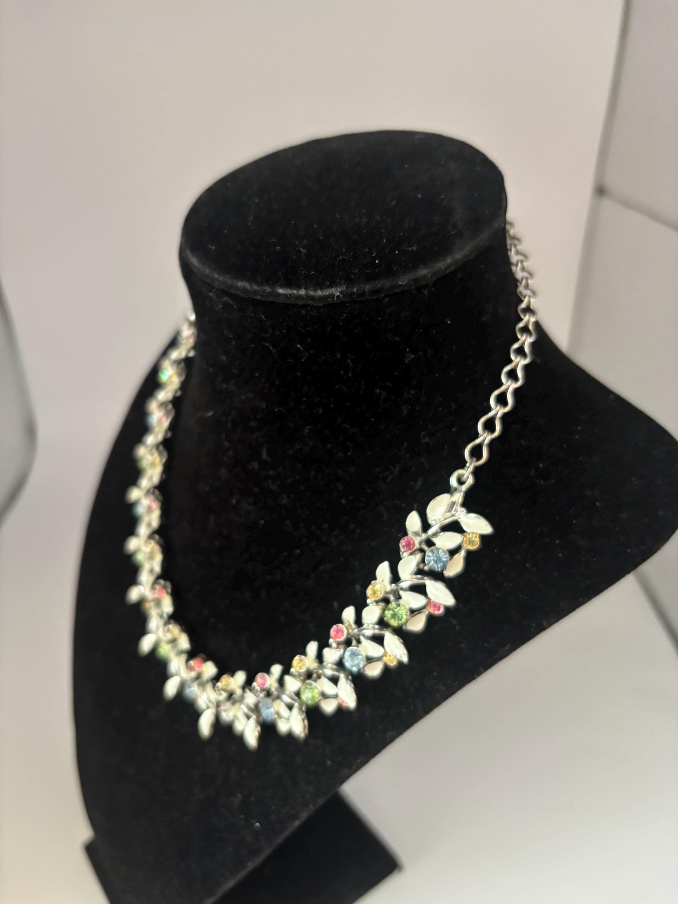 We have a lovely Vintage Multi Color Stones & Enamel Necklace. It measures approximately 6 1/2" long on your chest.