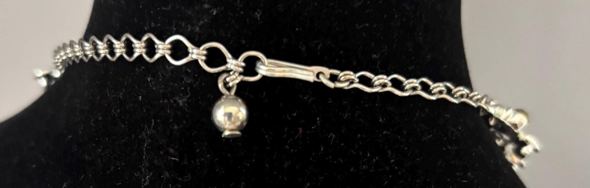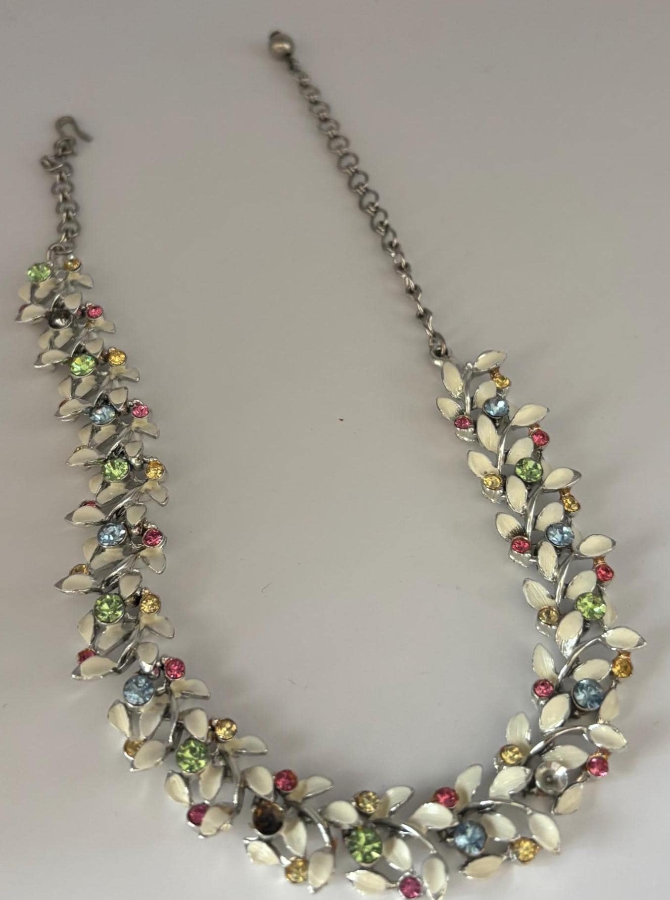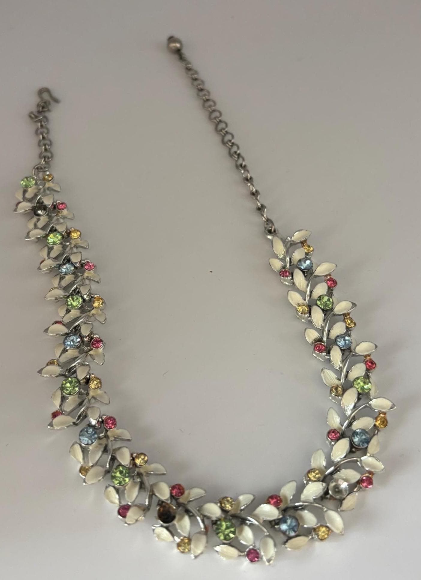 We have a lovely Vintage Multi Color Stones & Enamel Necklace. It measures approximately 6 1/2" long on your chest.