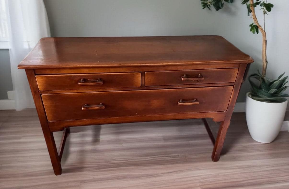 The piece is in good vintage condition, displaying natural and appropriate wear that enhances its authentic, rustic appeal. Its timeless design and sturdy construction make it a versatile addition to farmhouse, rustic, or vintage-inspired decor. Whether you're seeking a unique buffet for entertaining or a charming storage solution, this Cushman Colonial piece is sure to impress.