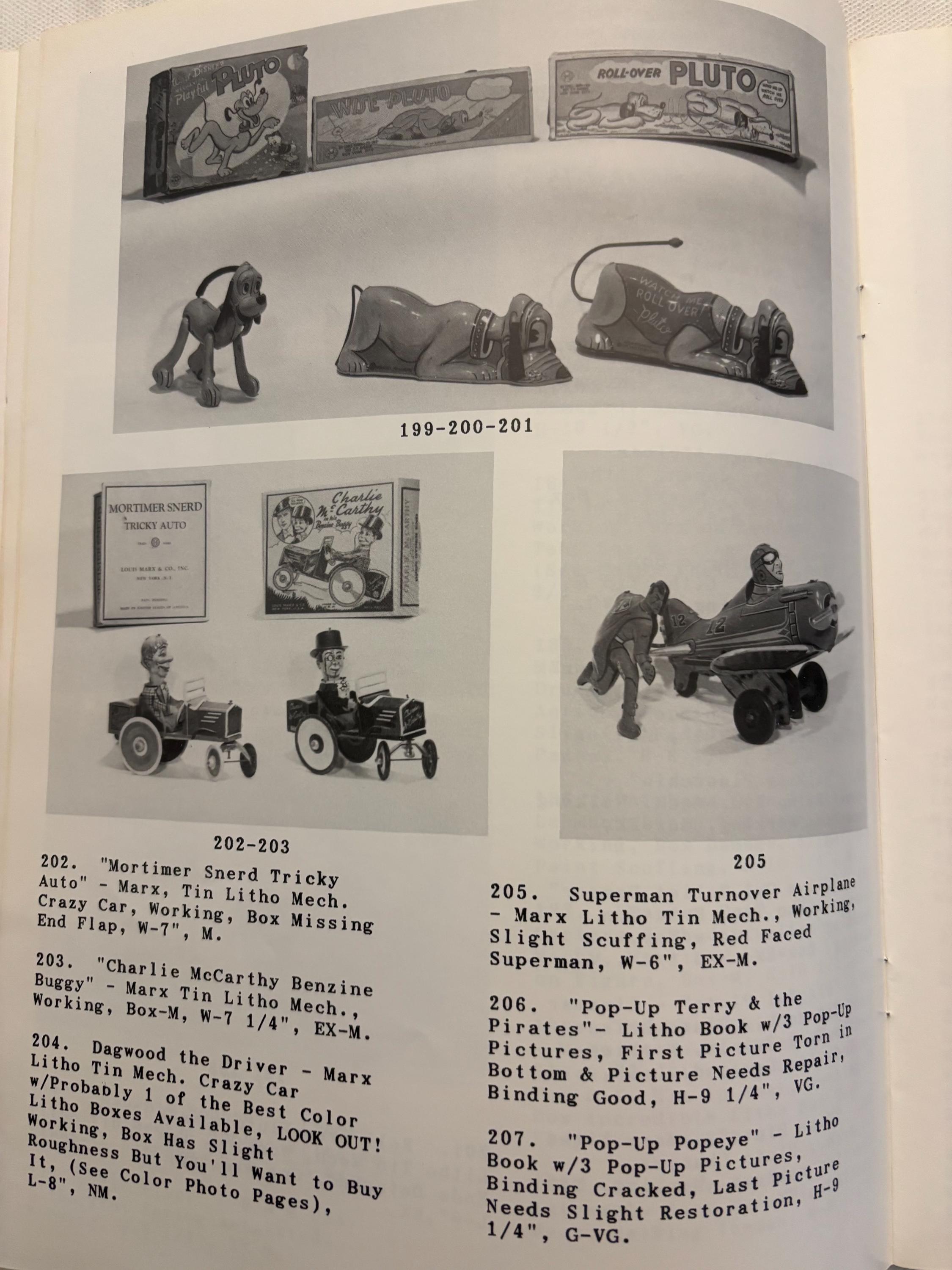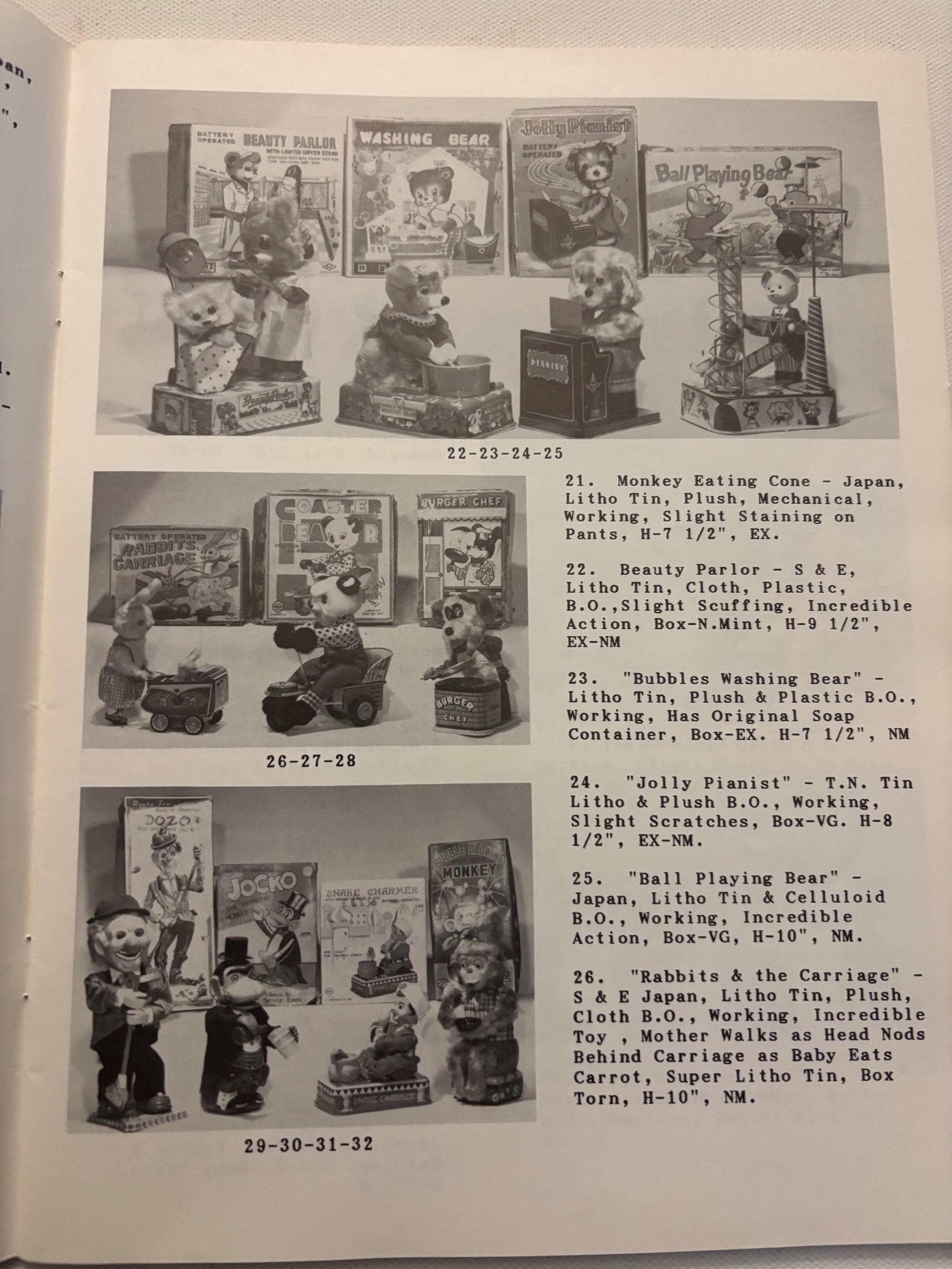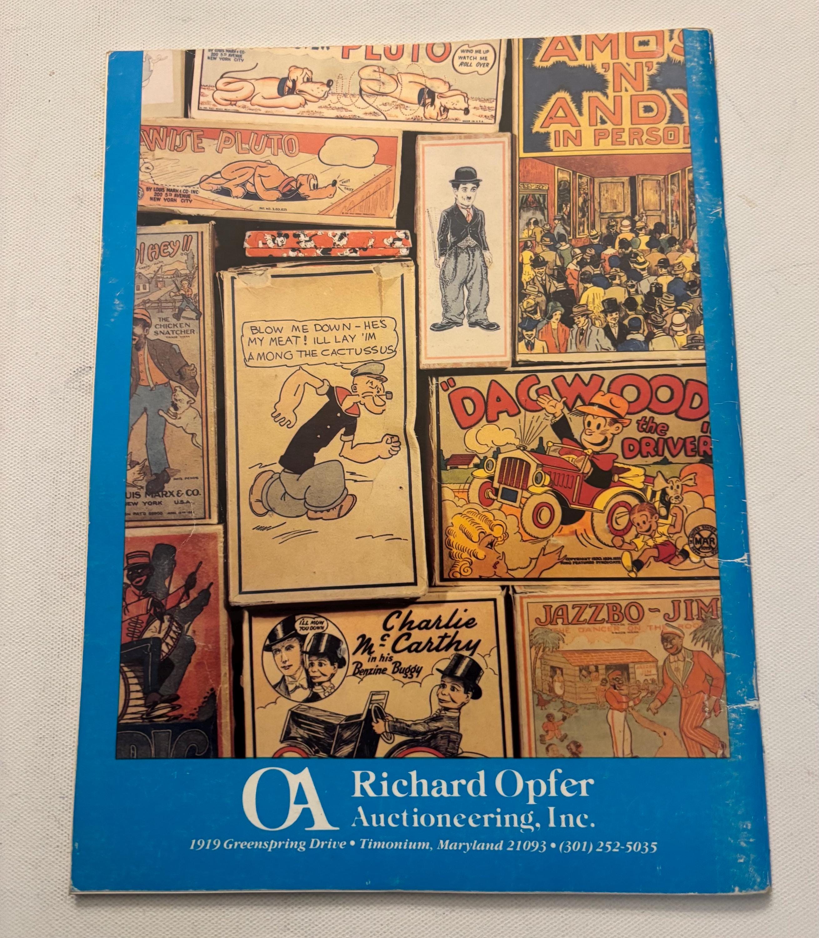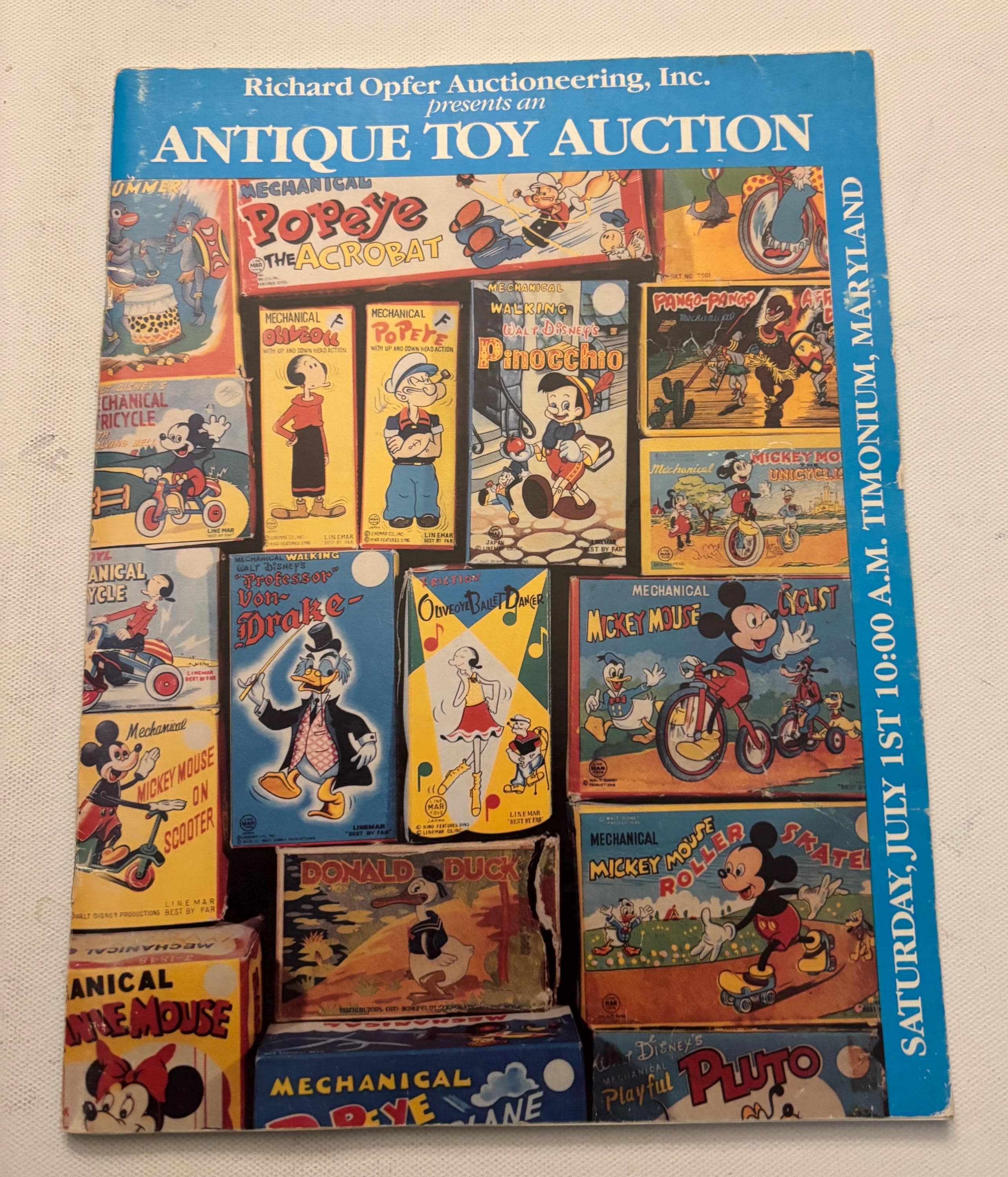 We are so happy to be featuring this vintage flyer for an "ANTIQUE TOY AUCTION" presented by Richard Opfer Auctioneering, Inc. The flyer features images of various vintage mechanical toys, many of which are based on classic Disney and King Features Syndicate characters.