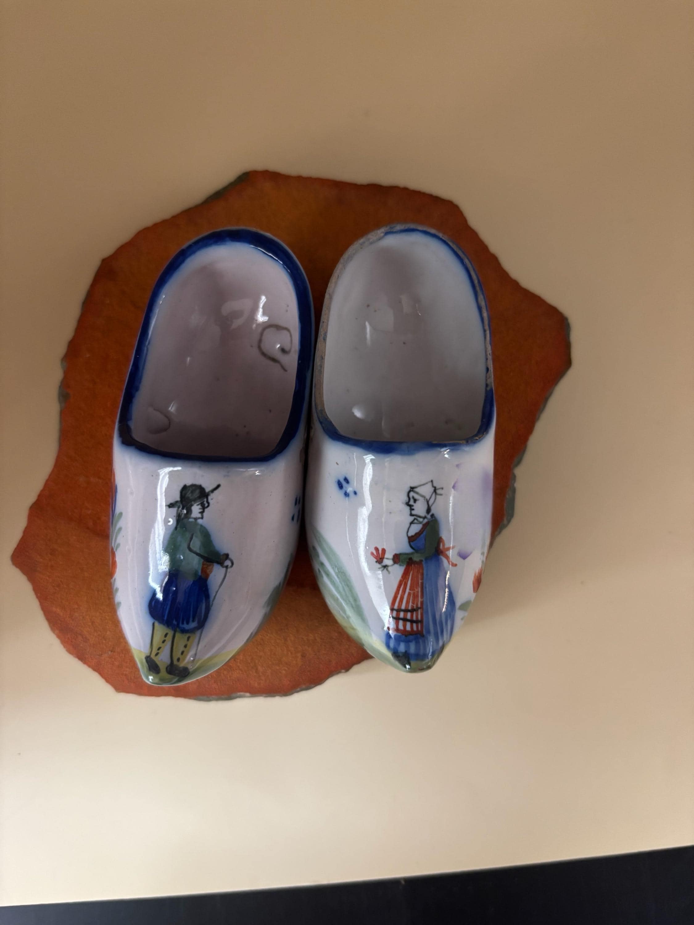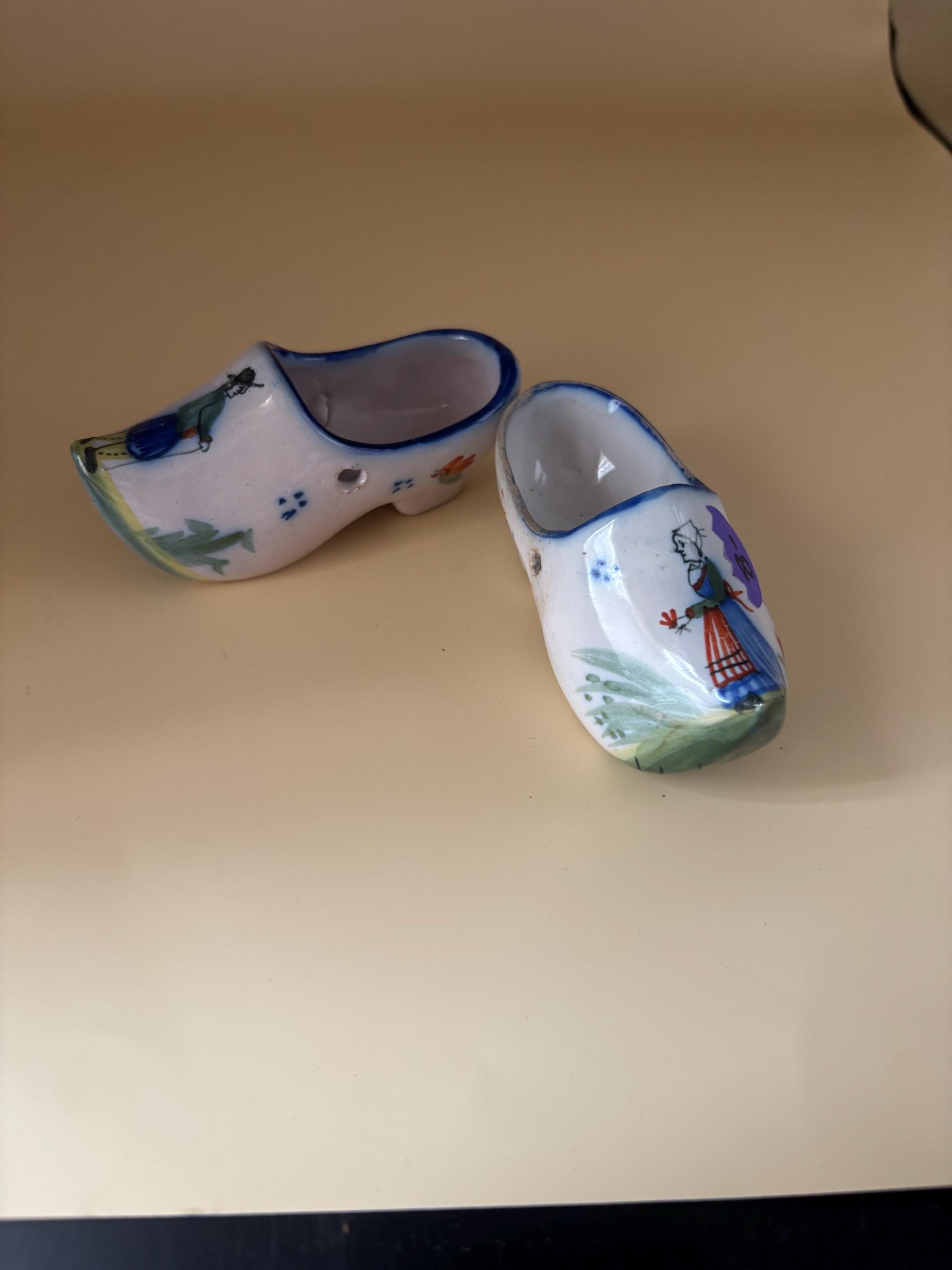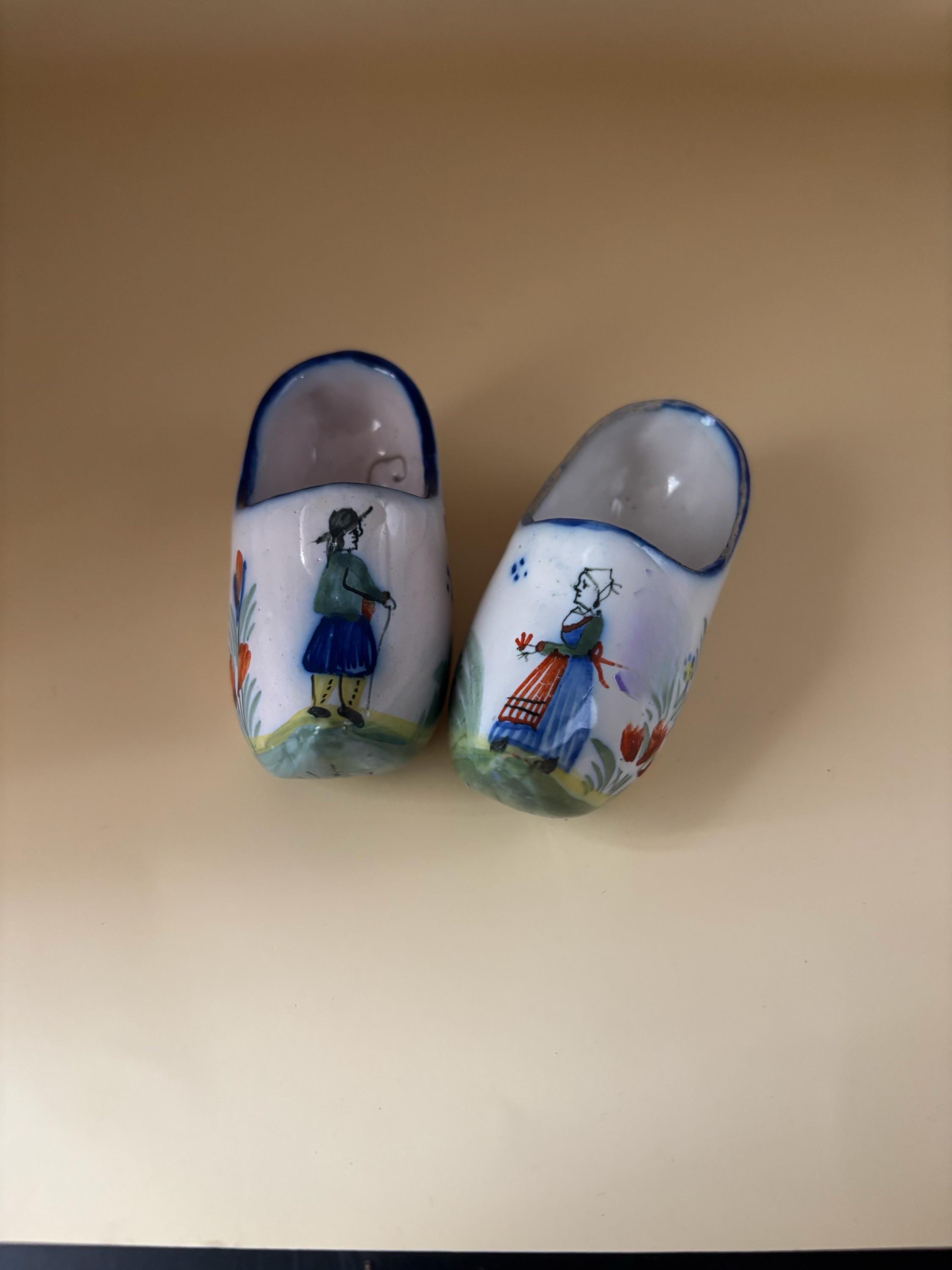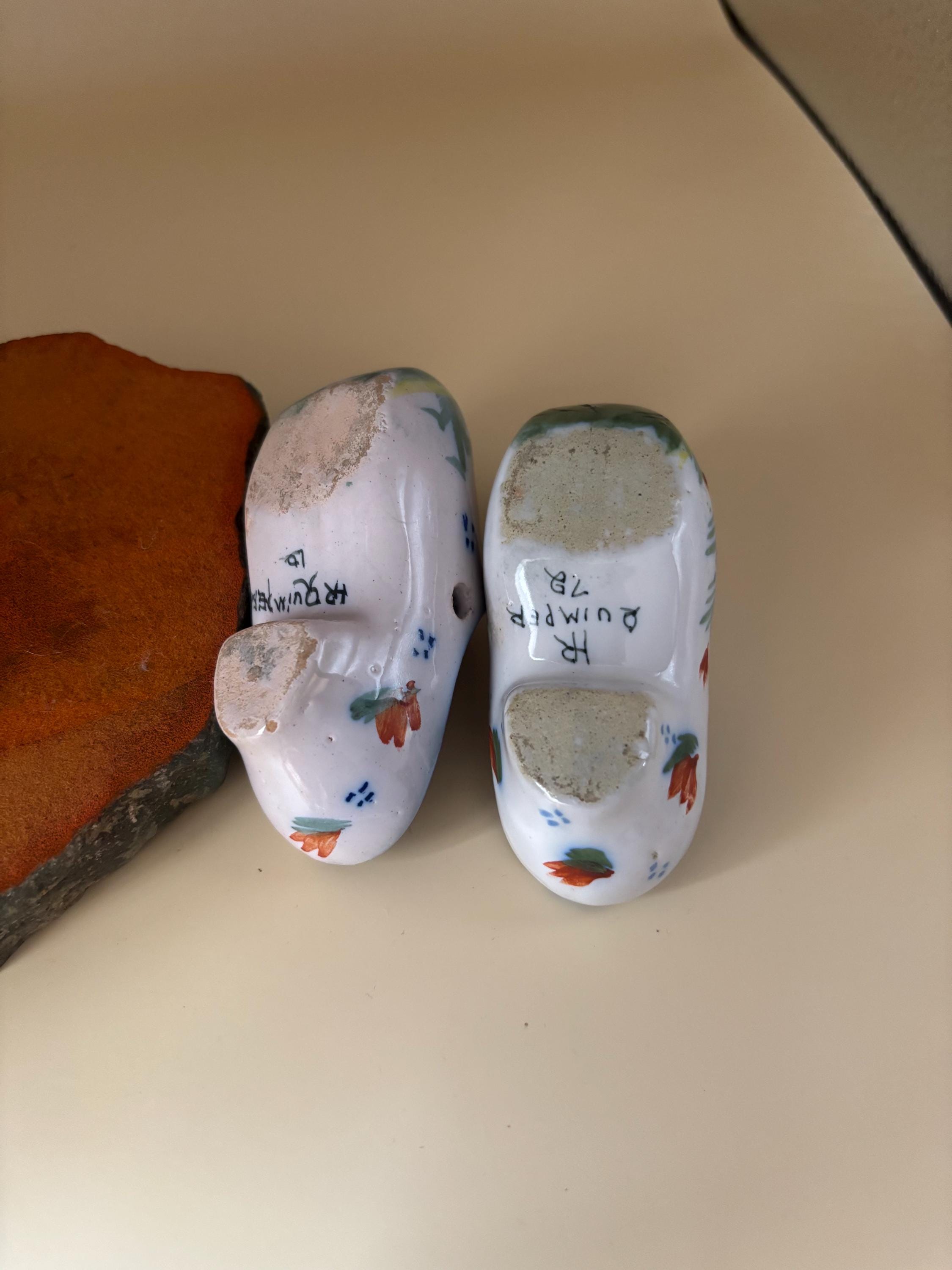 We are delighted to be featuring this pair of Antique HR Quimper Faience Pottery Clog, Miniature Shoes, Double Salt Cellar.
