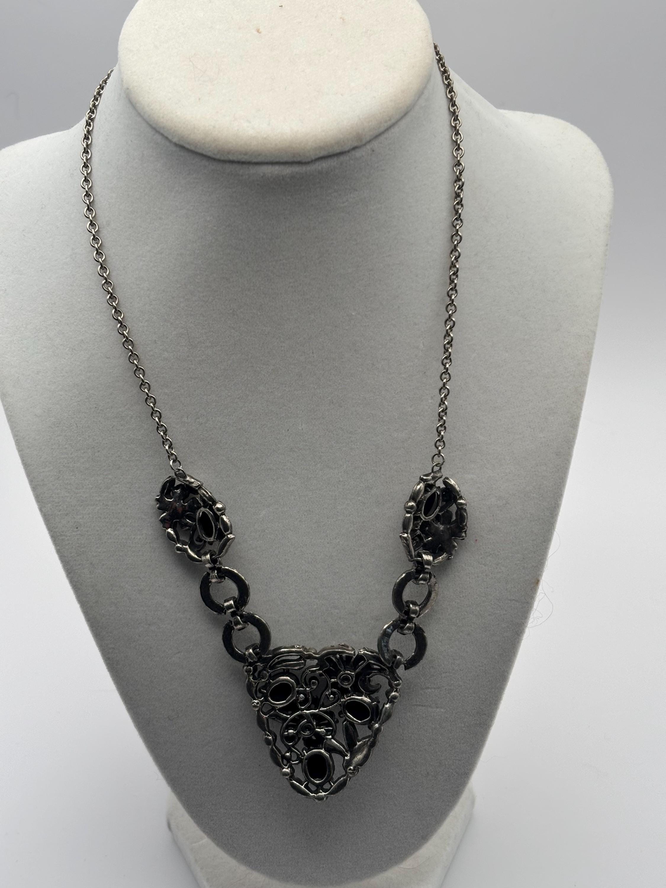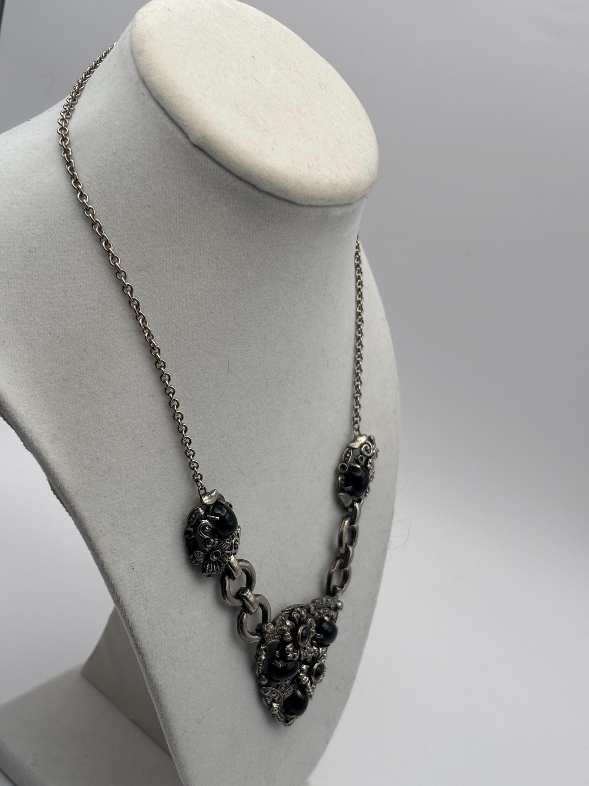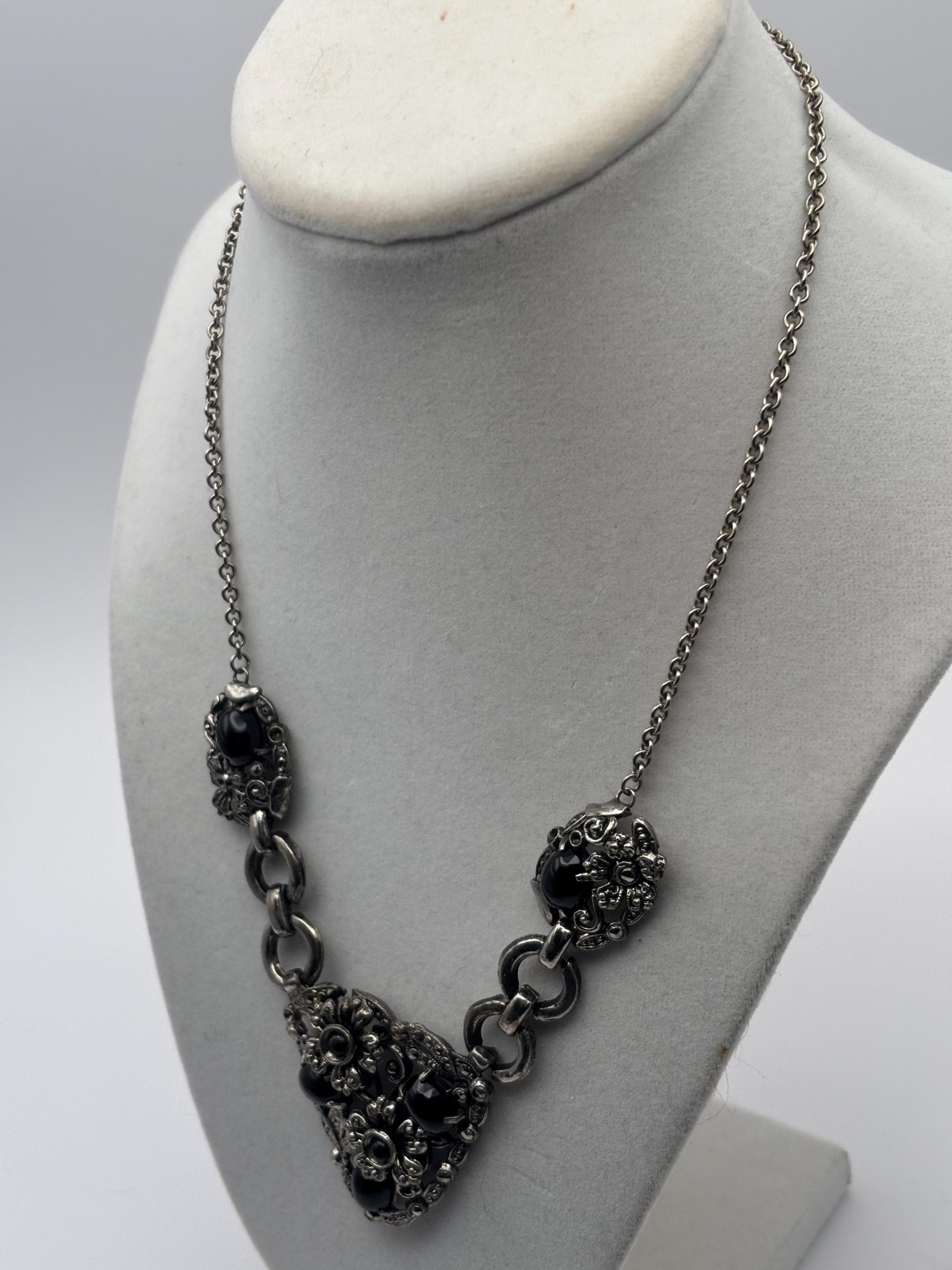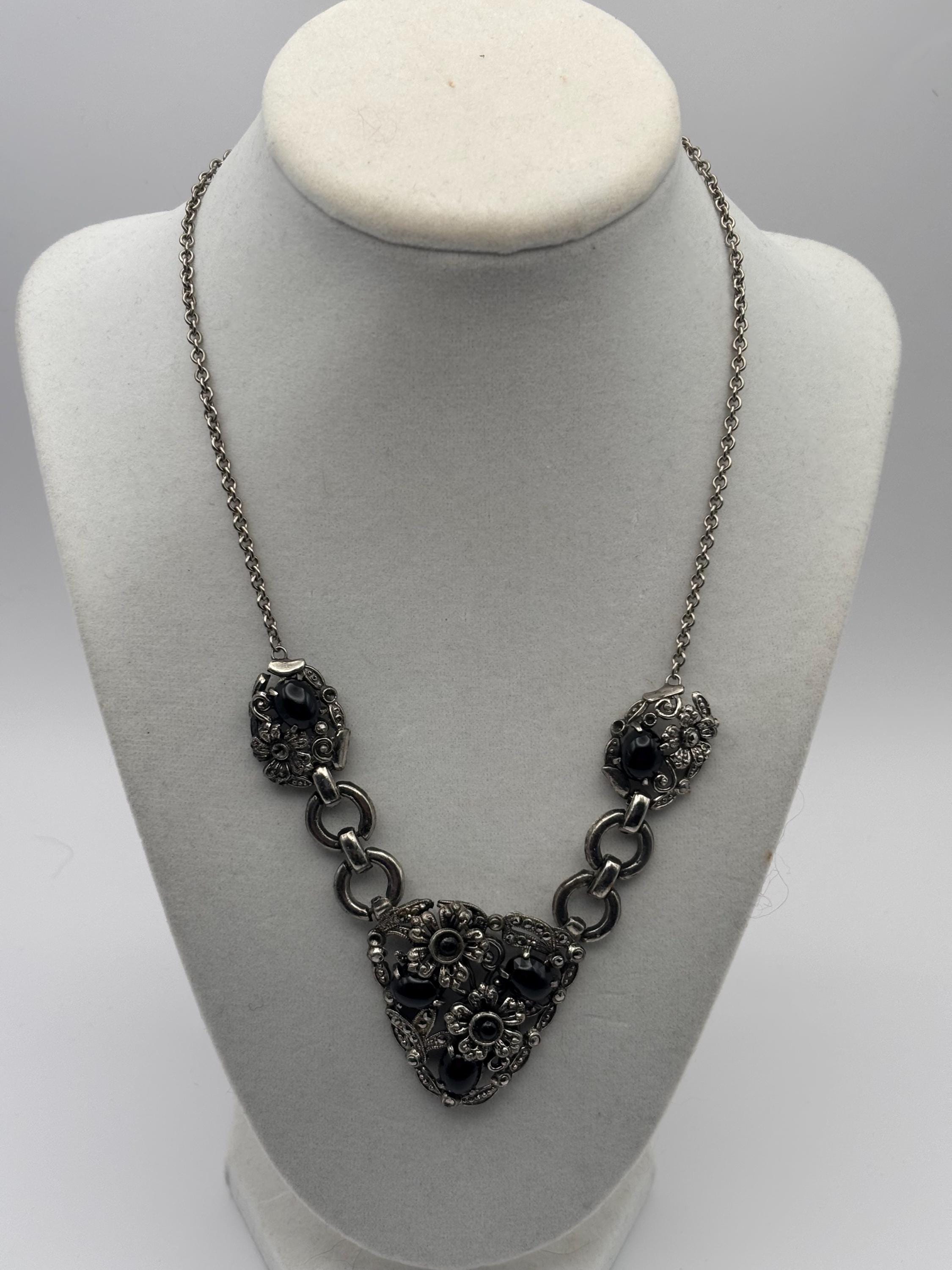 We have a lovely Vintage Silver Bib Style Black Cabochon Necklace. It is in Very Good Condition.