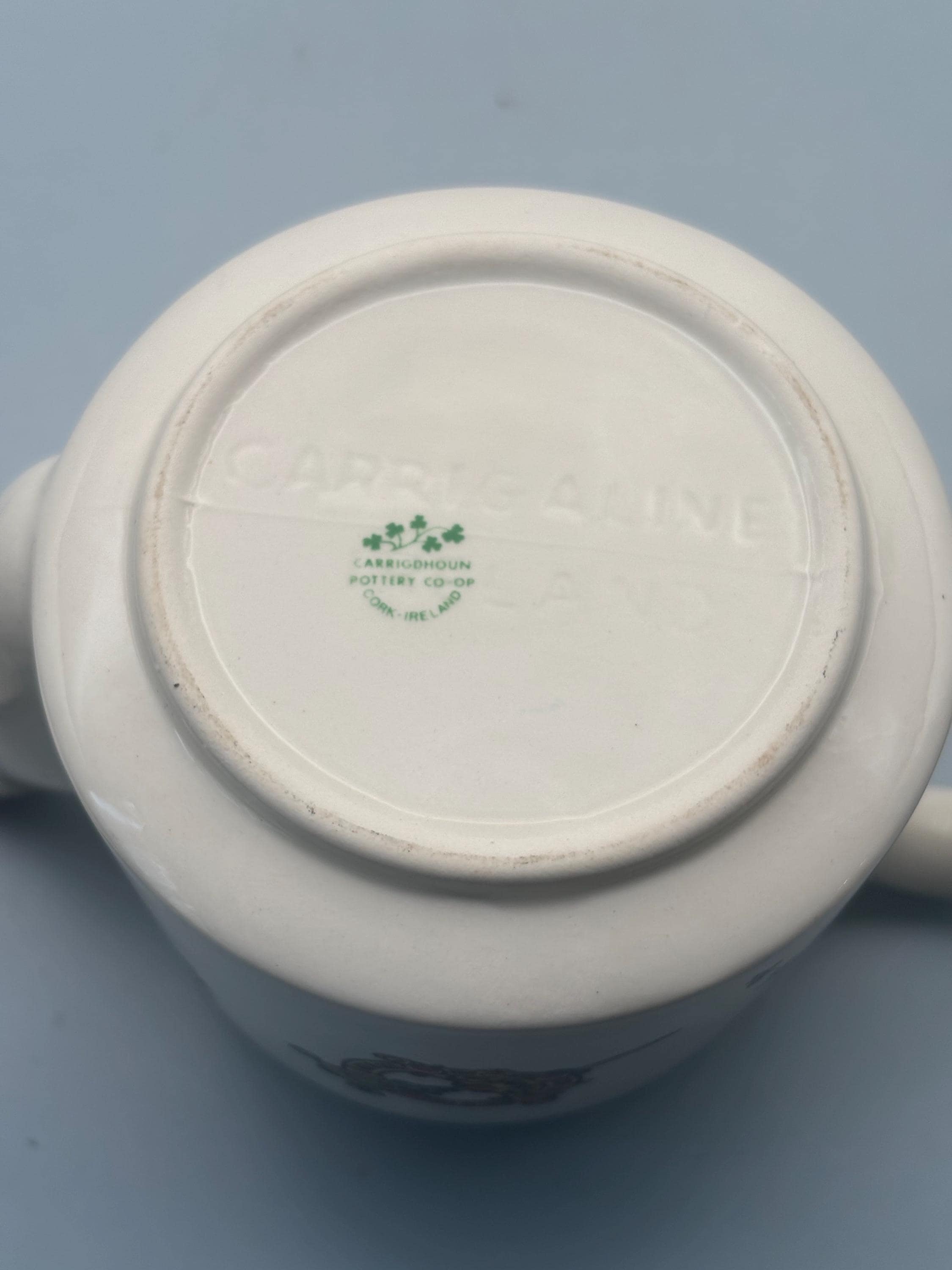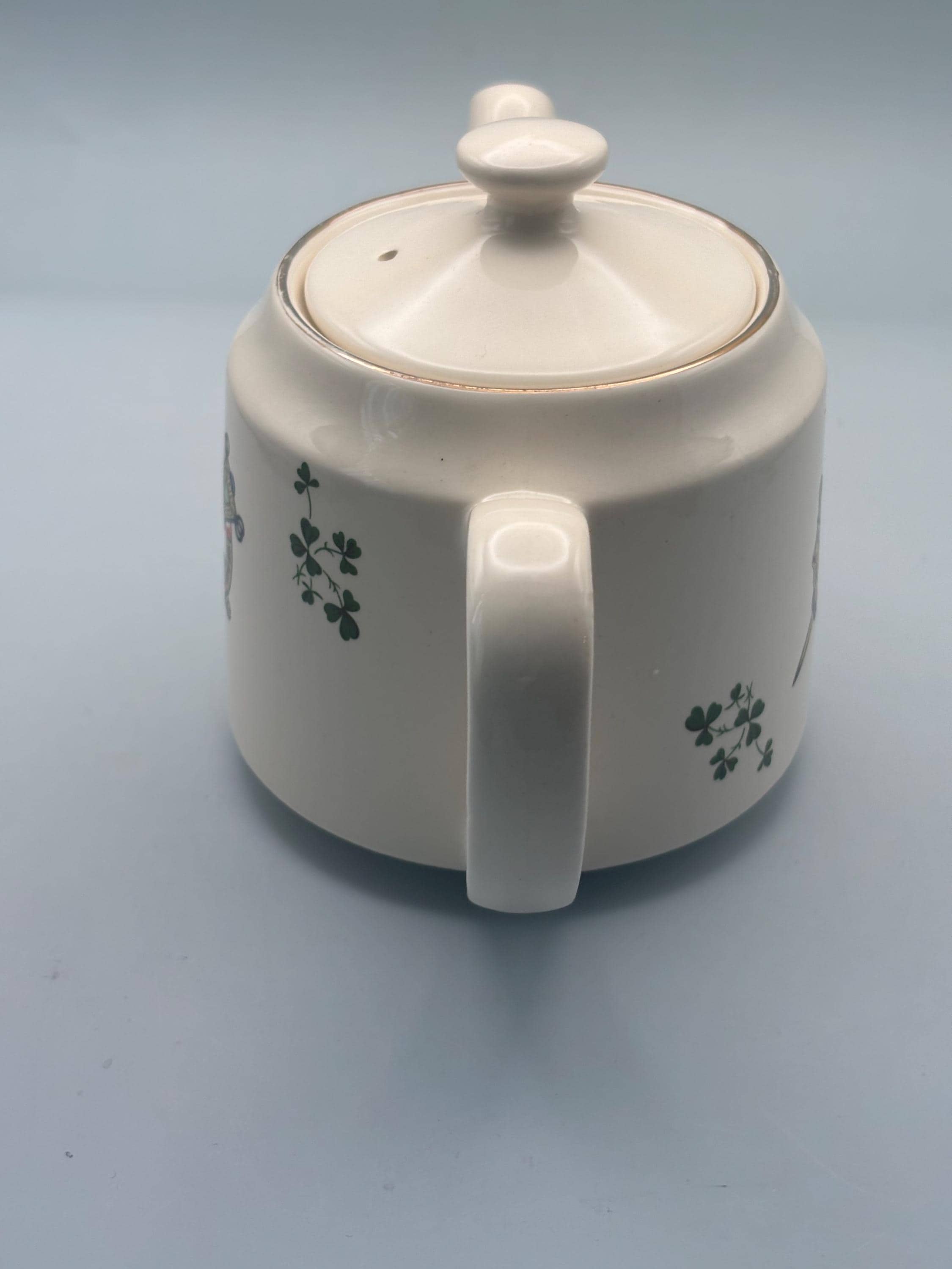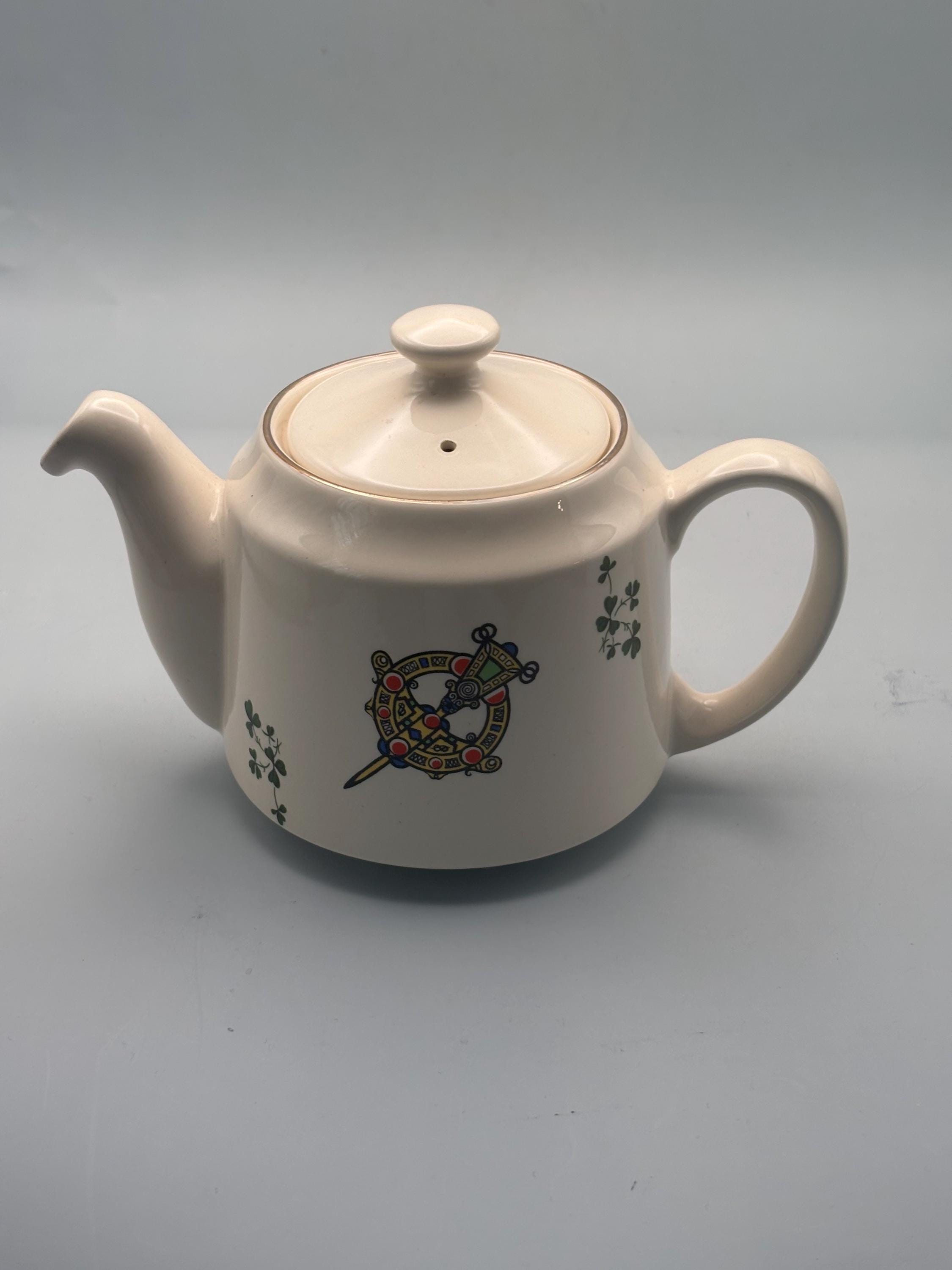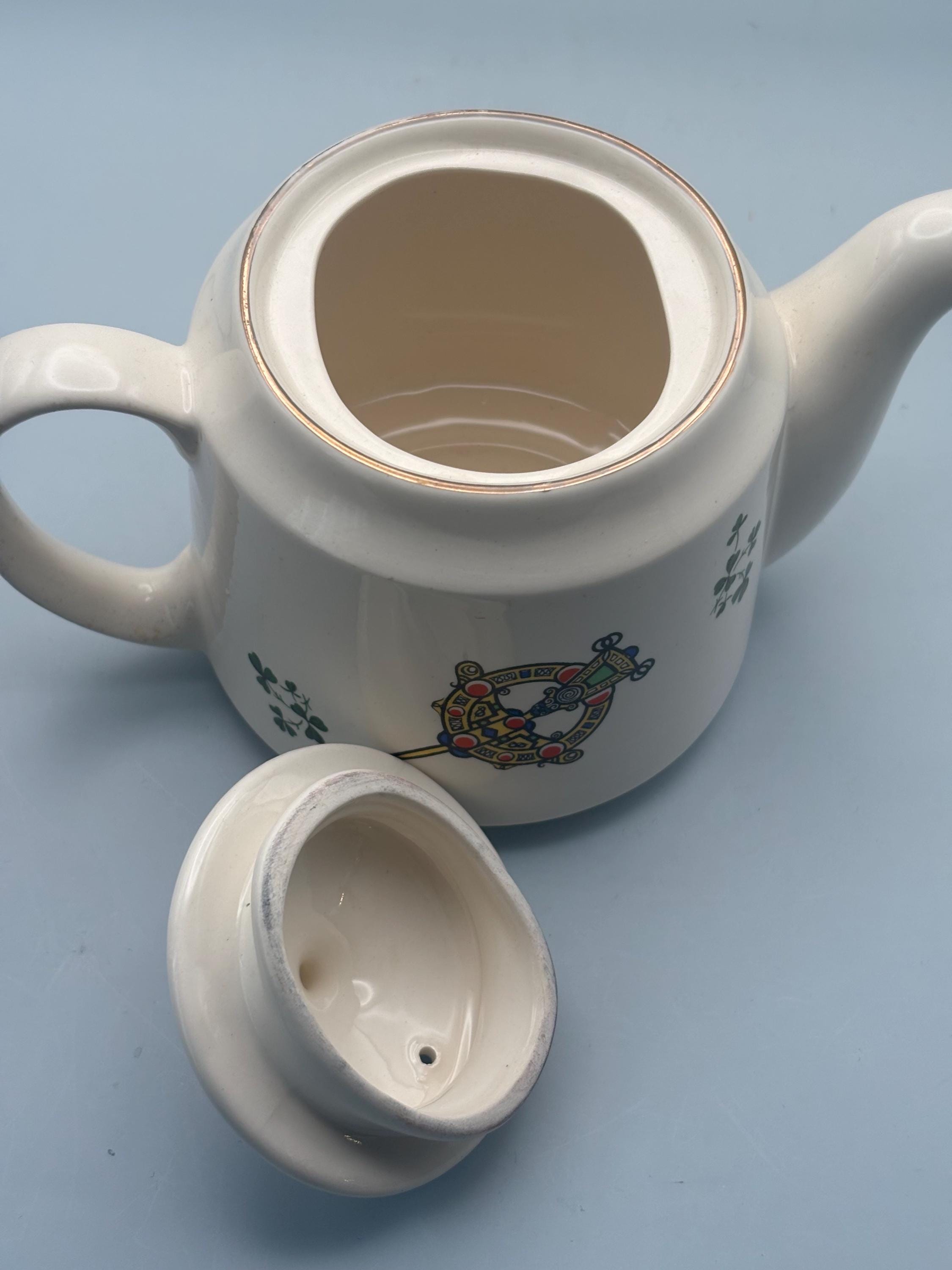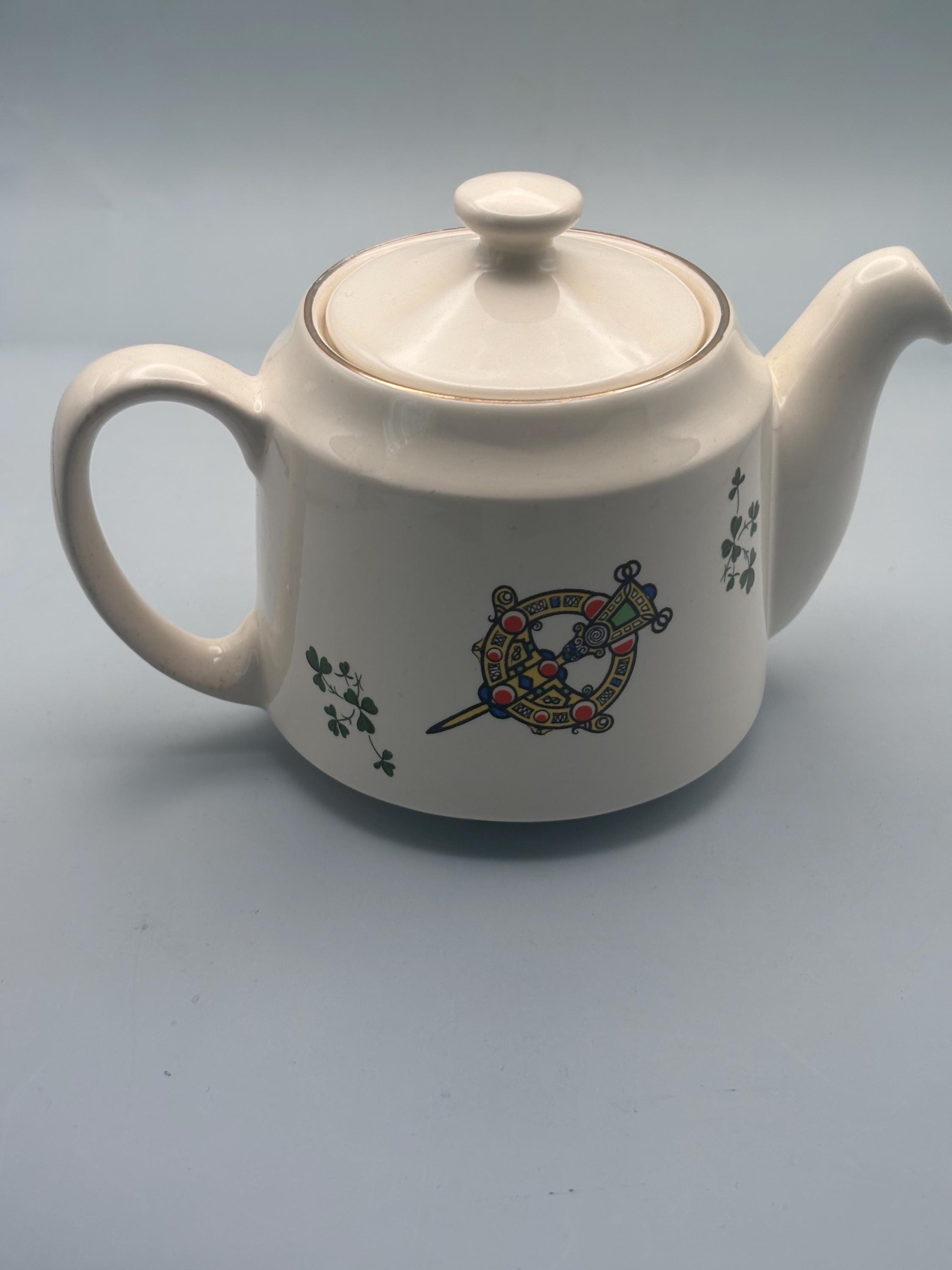 We have a gorgeous Vintage Carrigaline Pottery Teapot from Cork, Ireland. It has a Decorative Celtic Brooch & Shamrock Design.