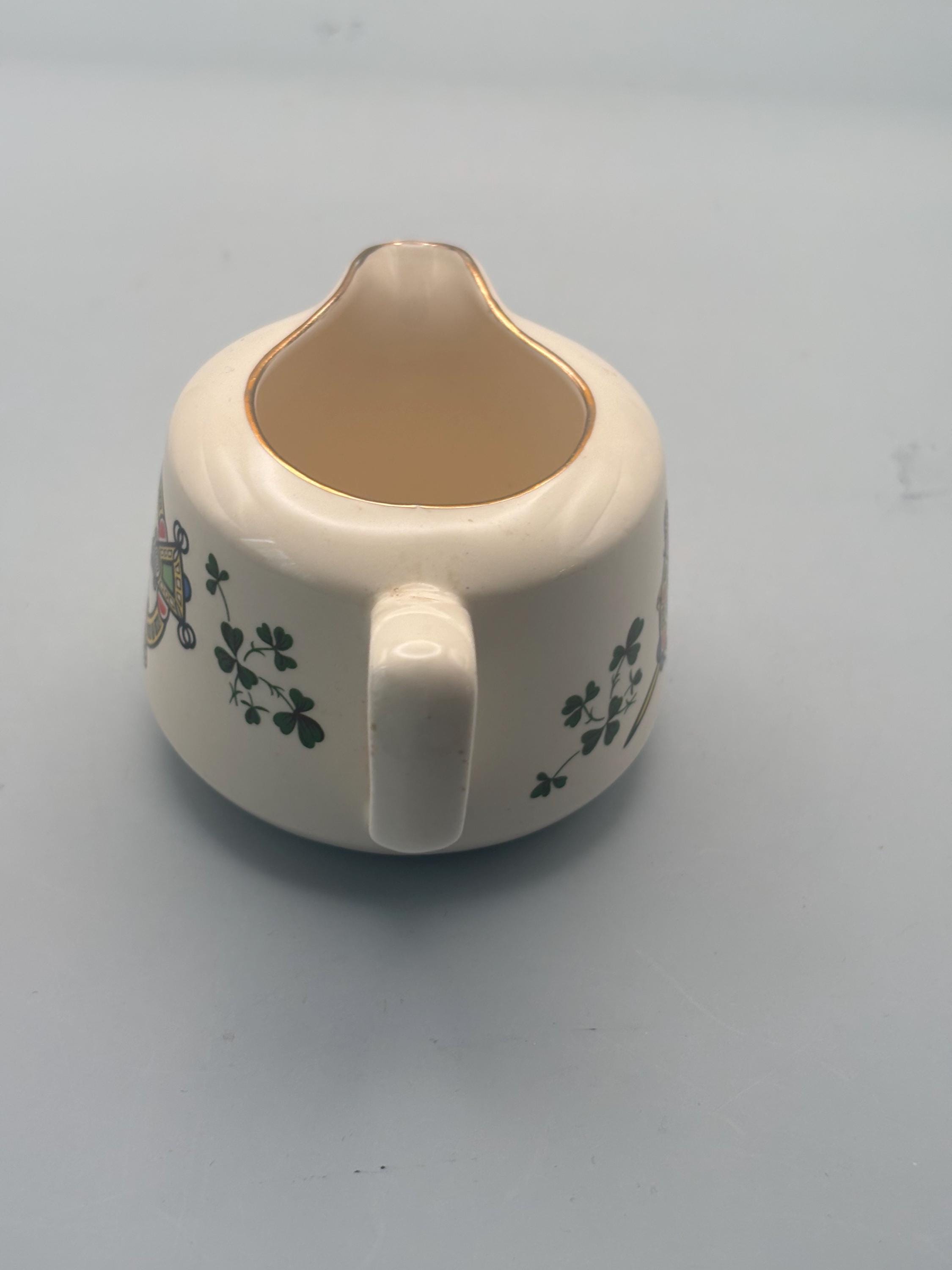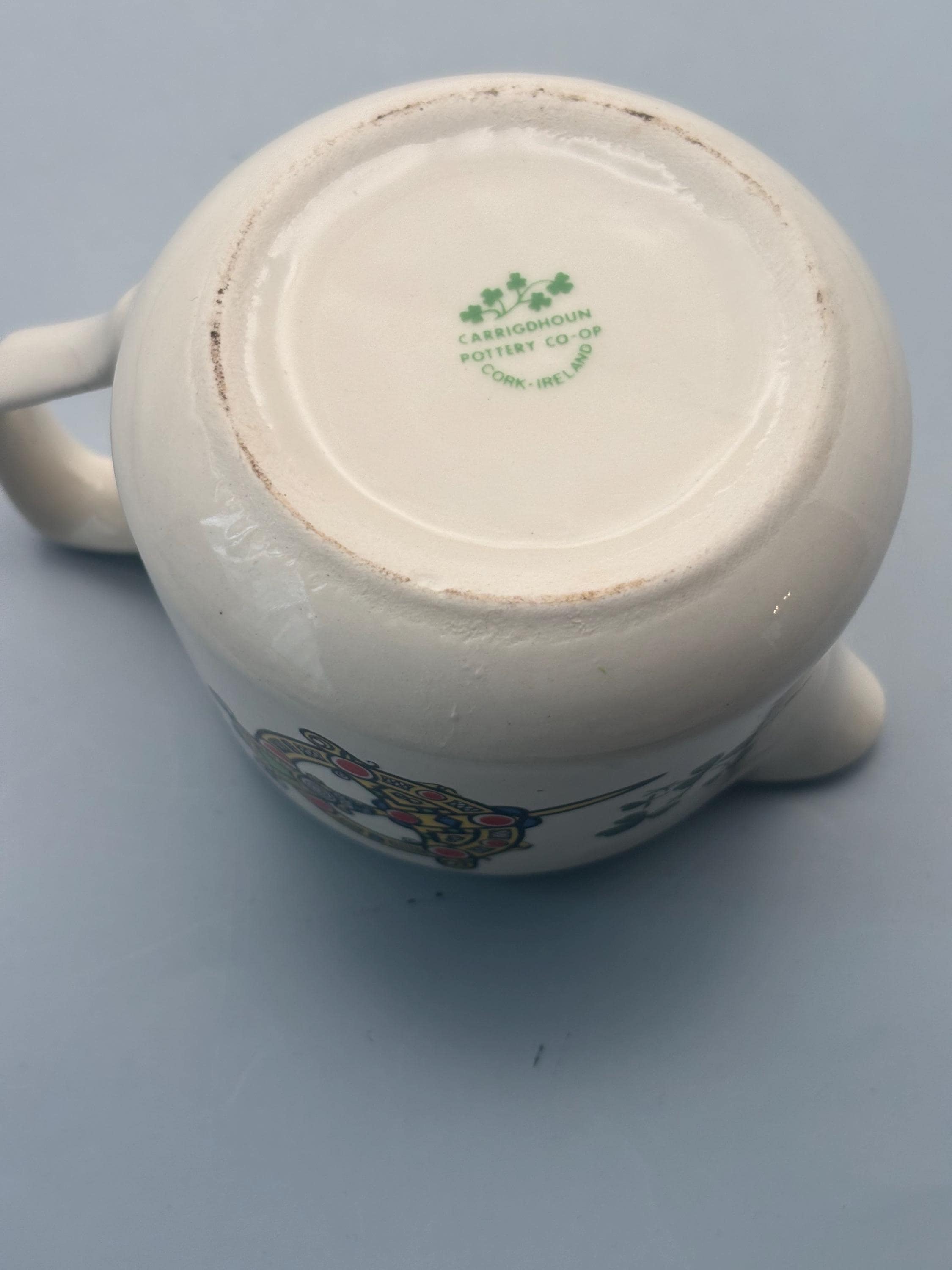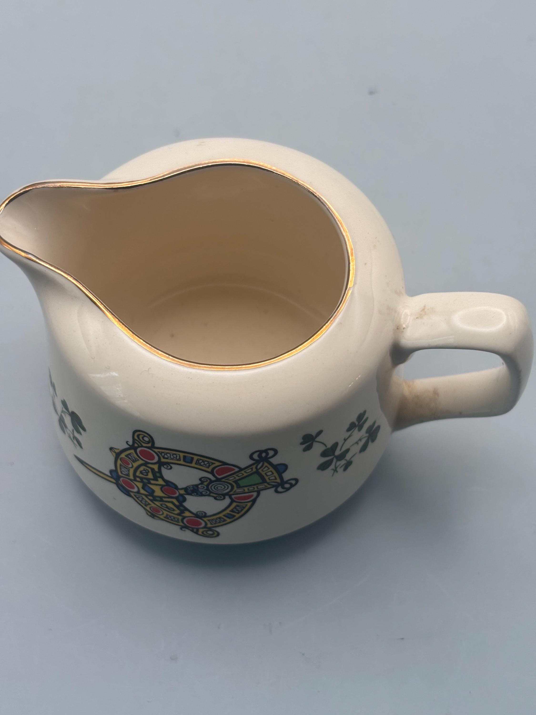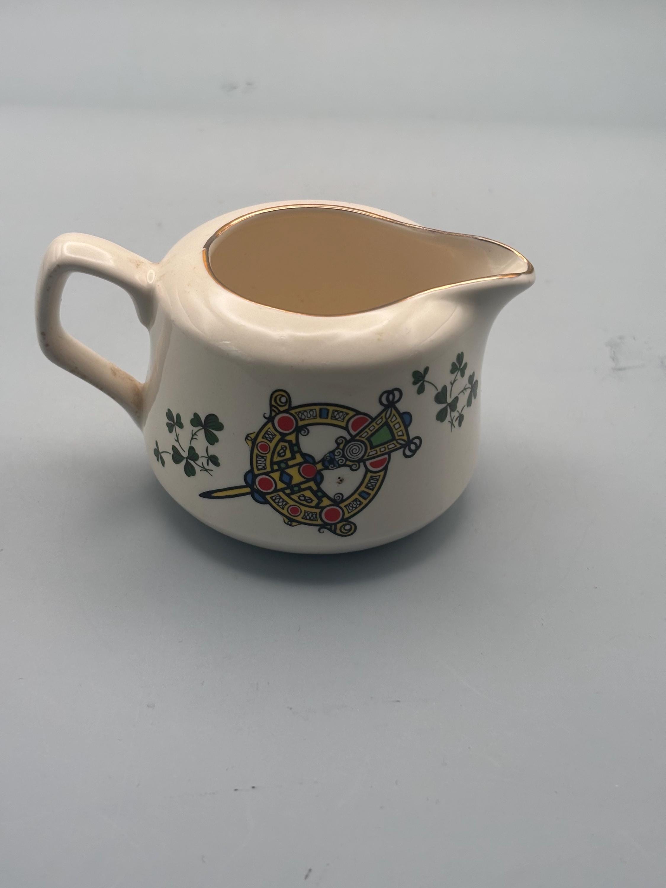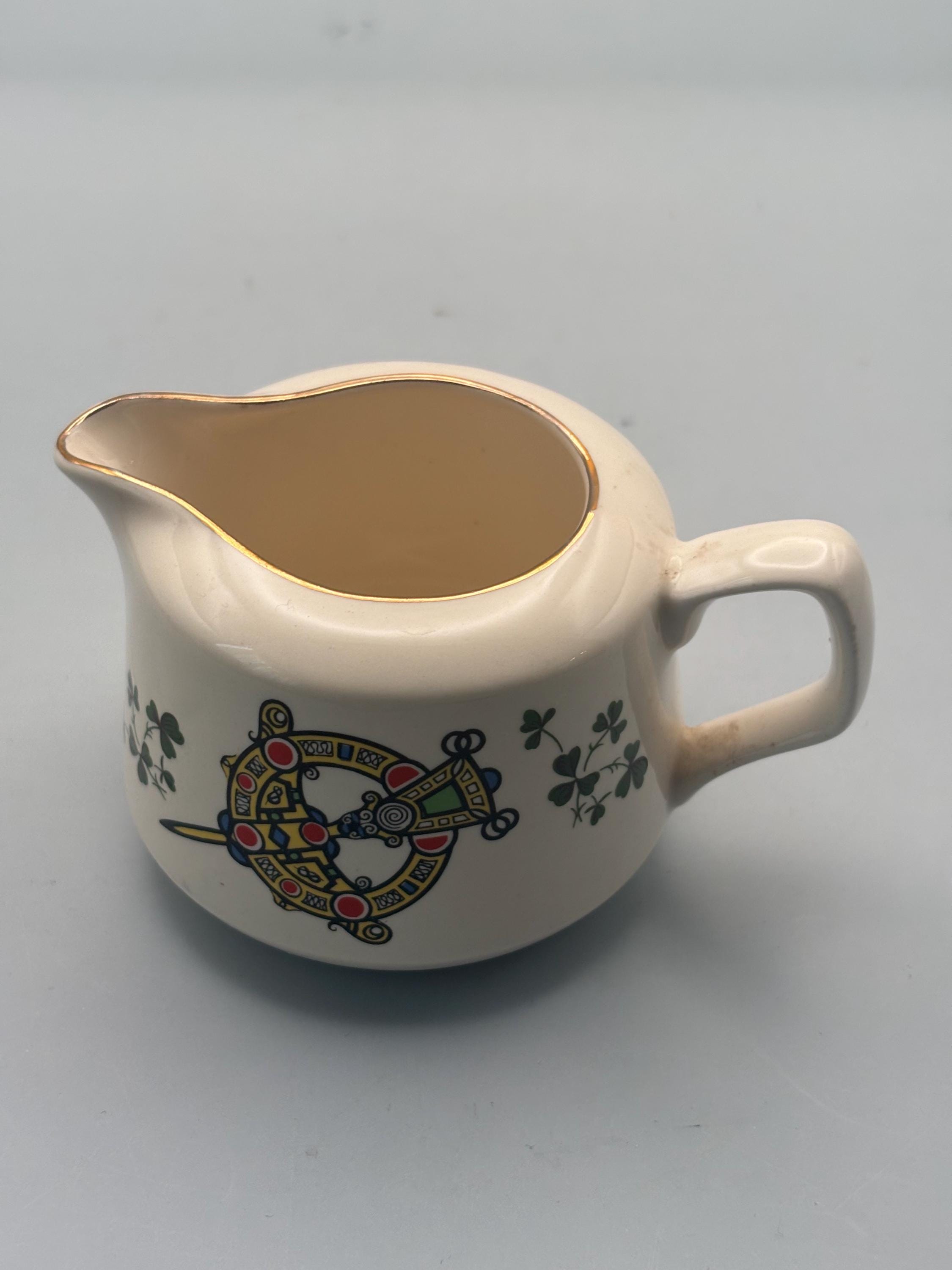 We have a gorgeous Vintage Carrigaline Pottery Creamer from Cork, Ireland. It has a Decorative Celtic Brooch & Shamrock Design.