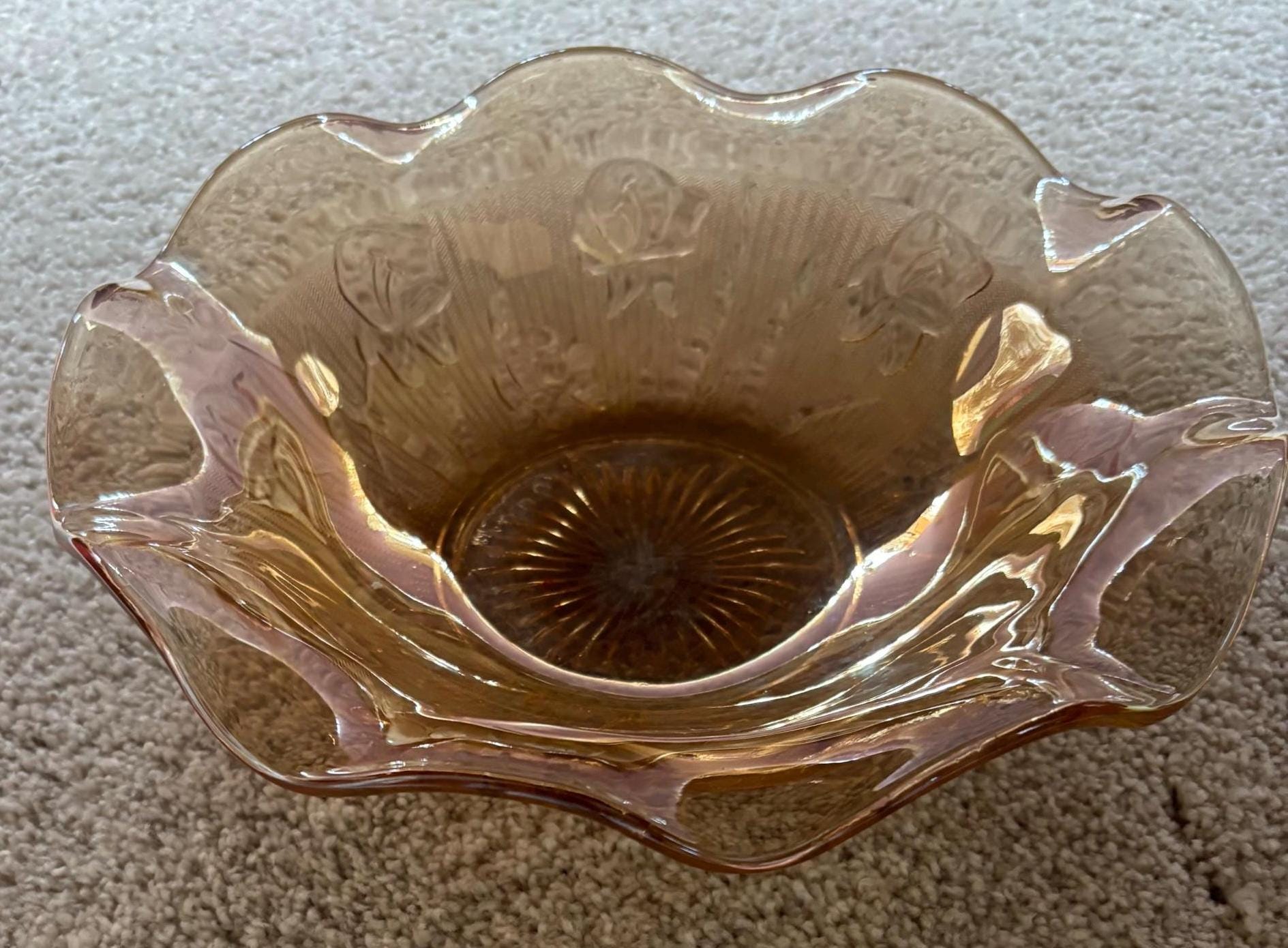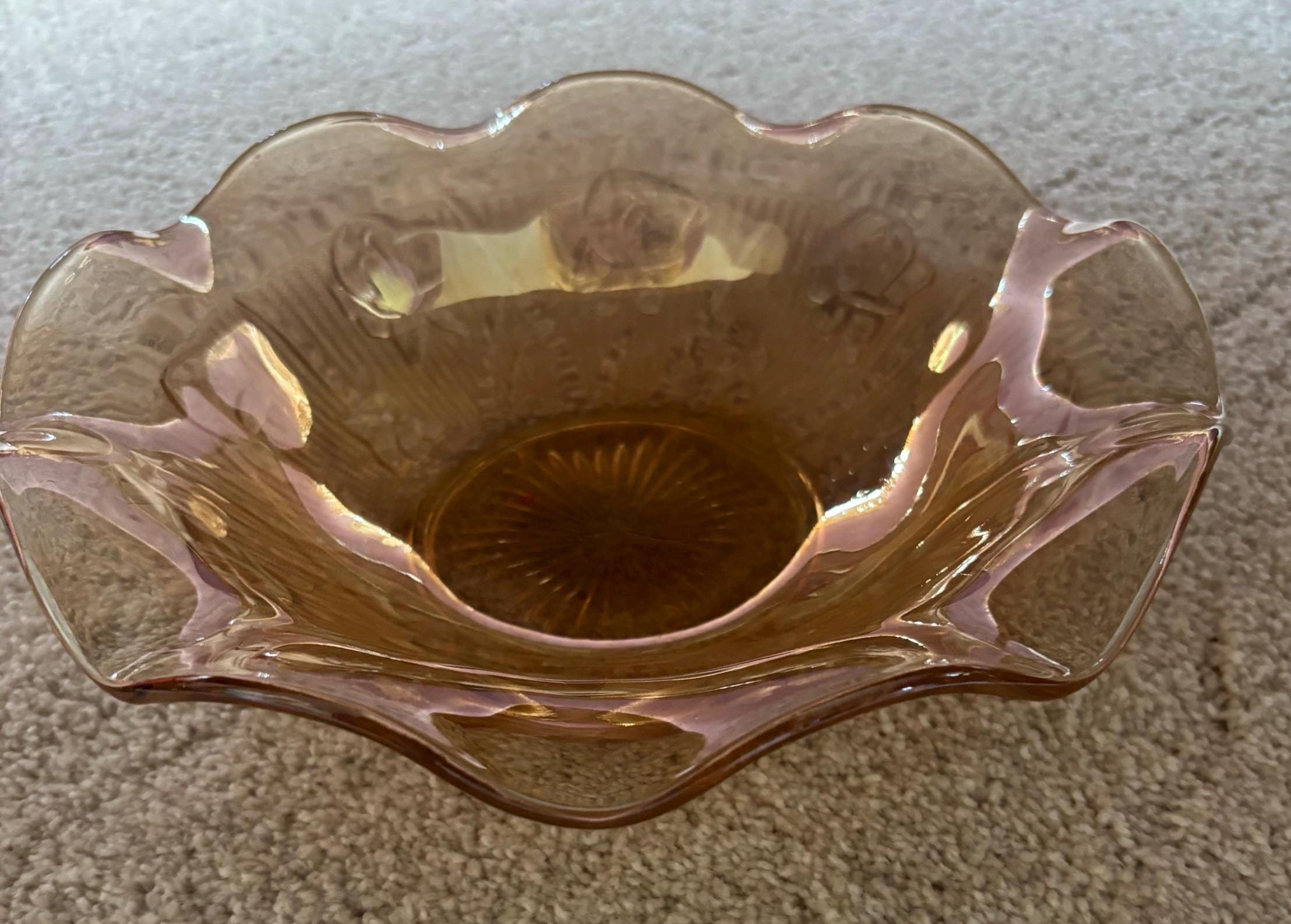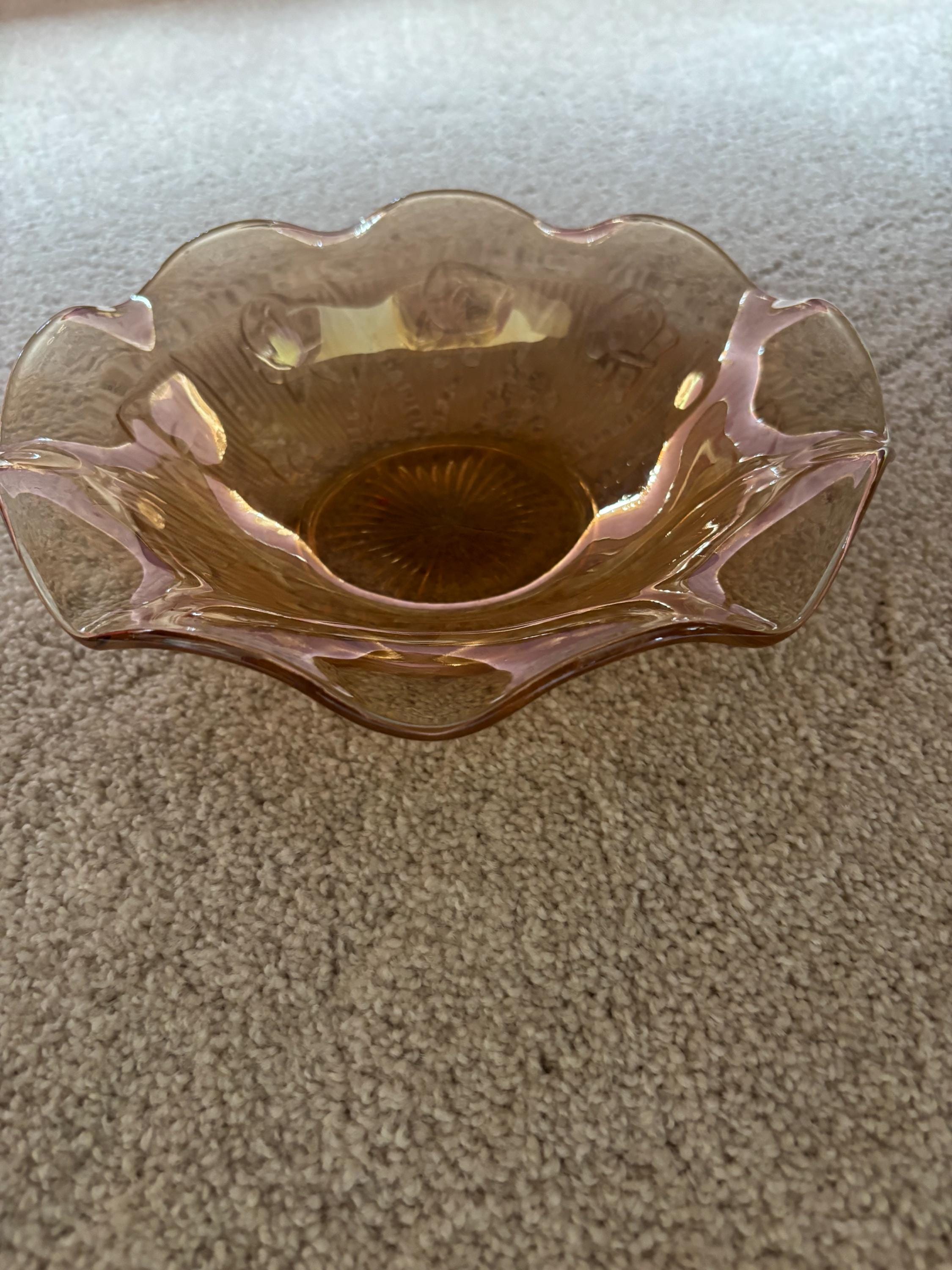 We are pleased to present this gorgeous Jeanette Iris and Herringbone Marigold Carnival Glass Ruffled Bowl.