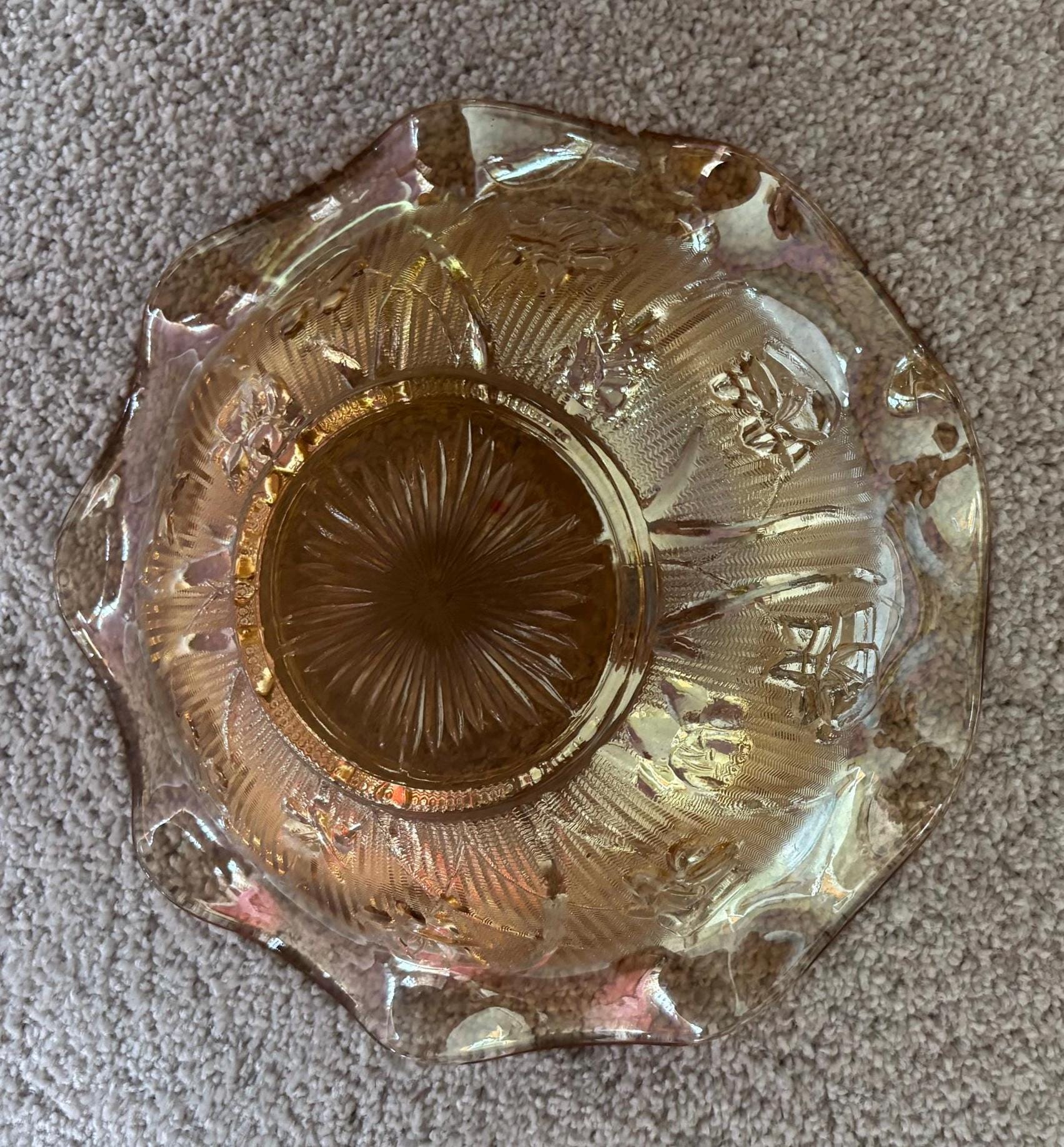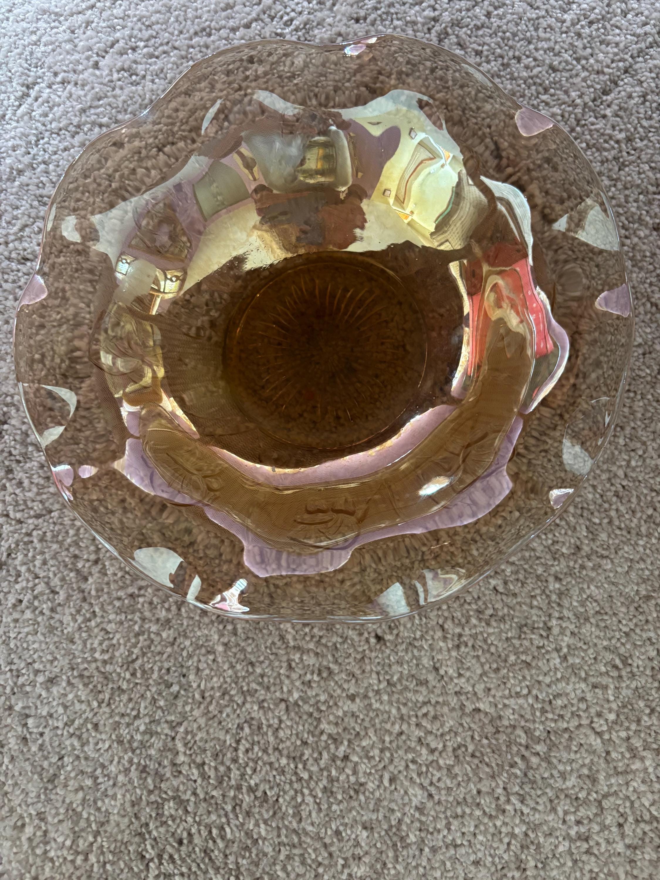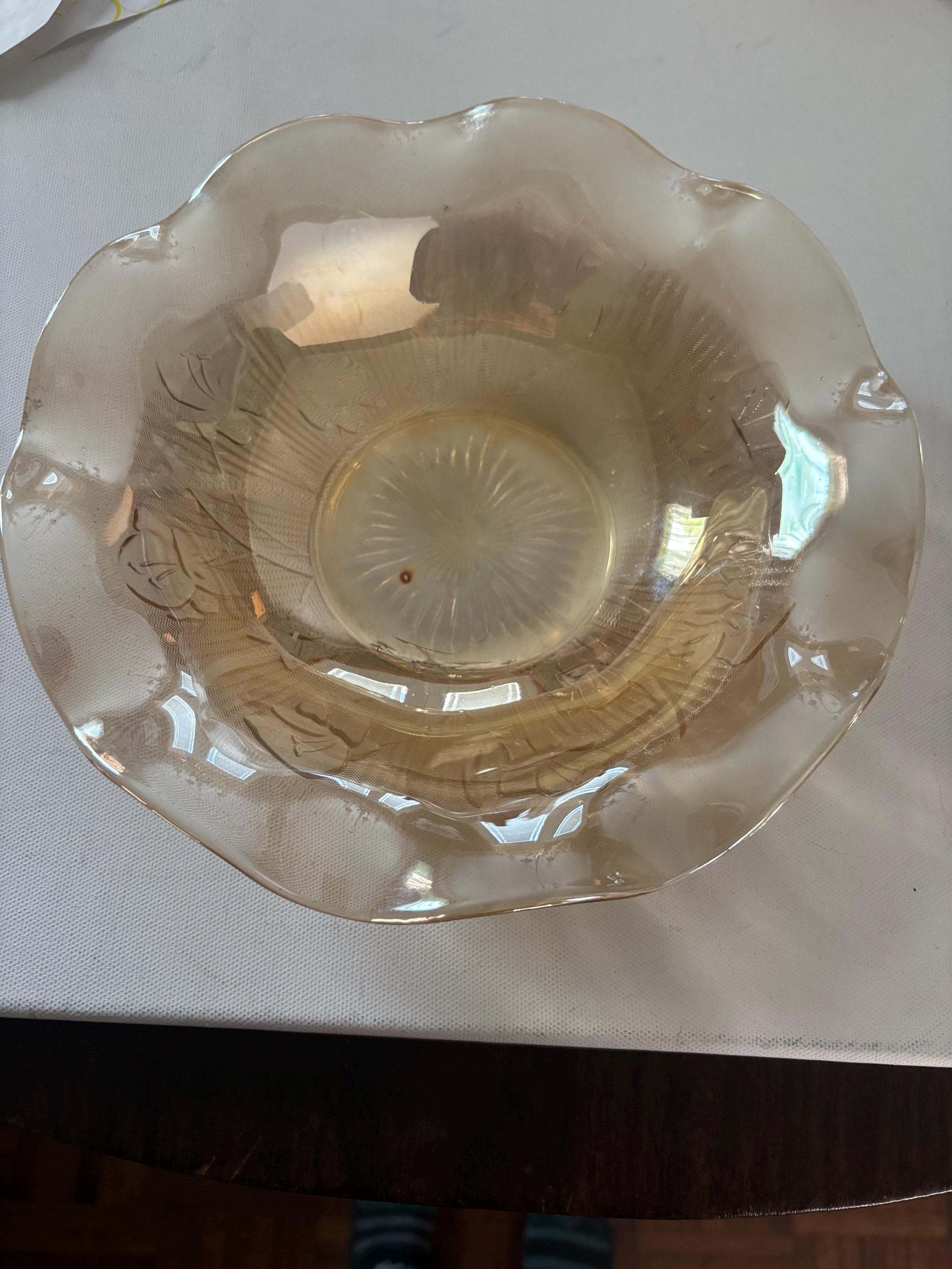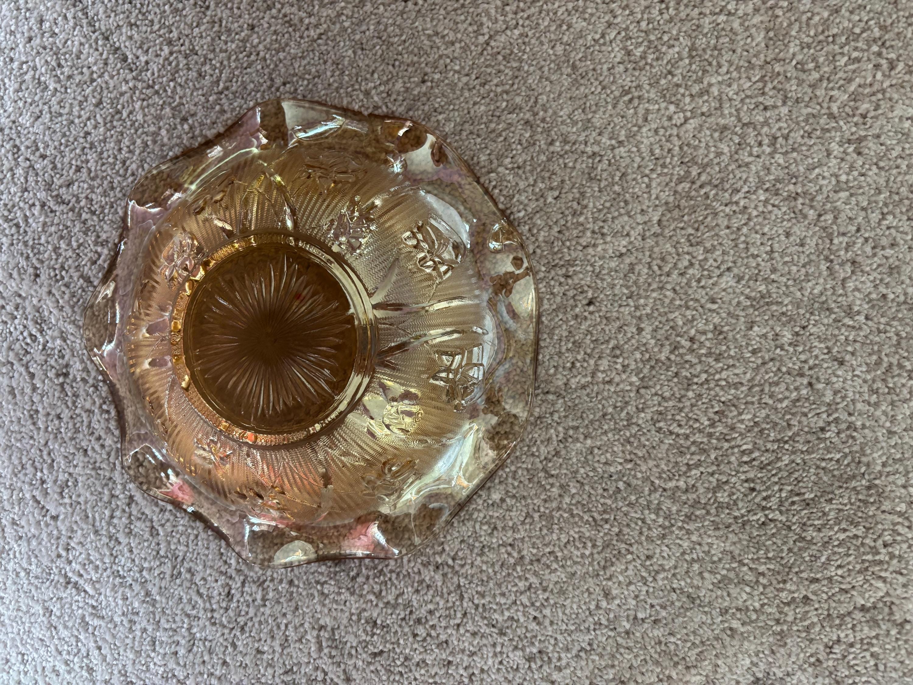 We are pleased to present this gorgeous Jeanette Iris and Herringbone Marigold Carnival Glass Ruffled Bowl.