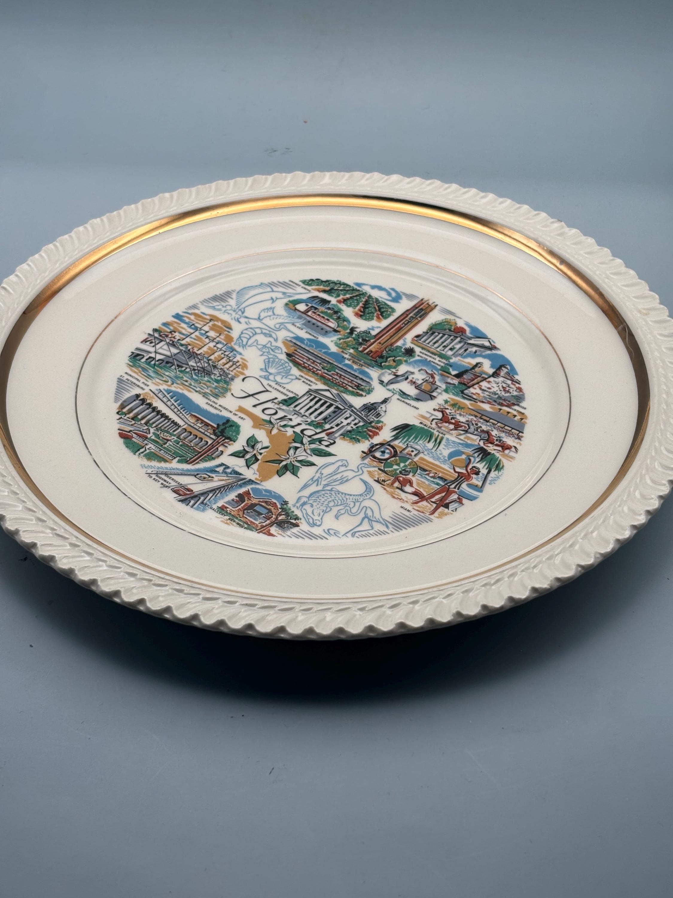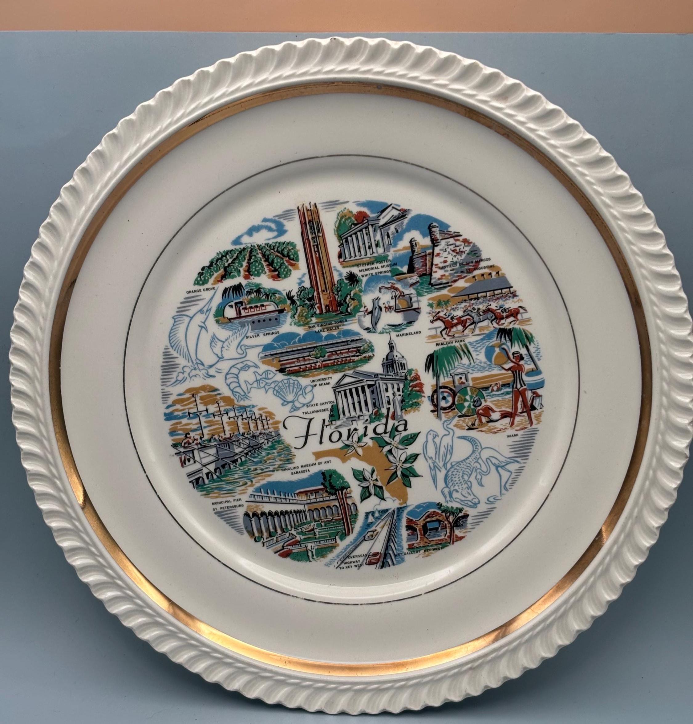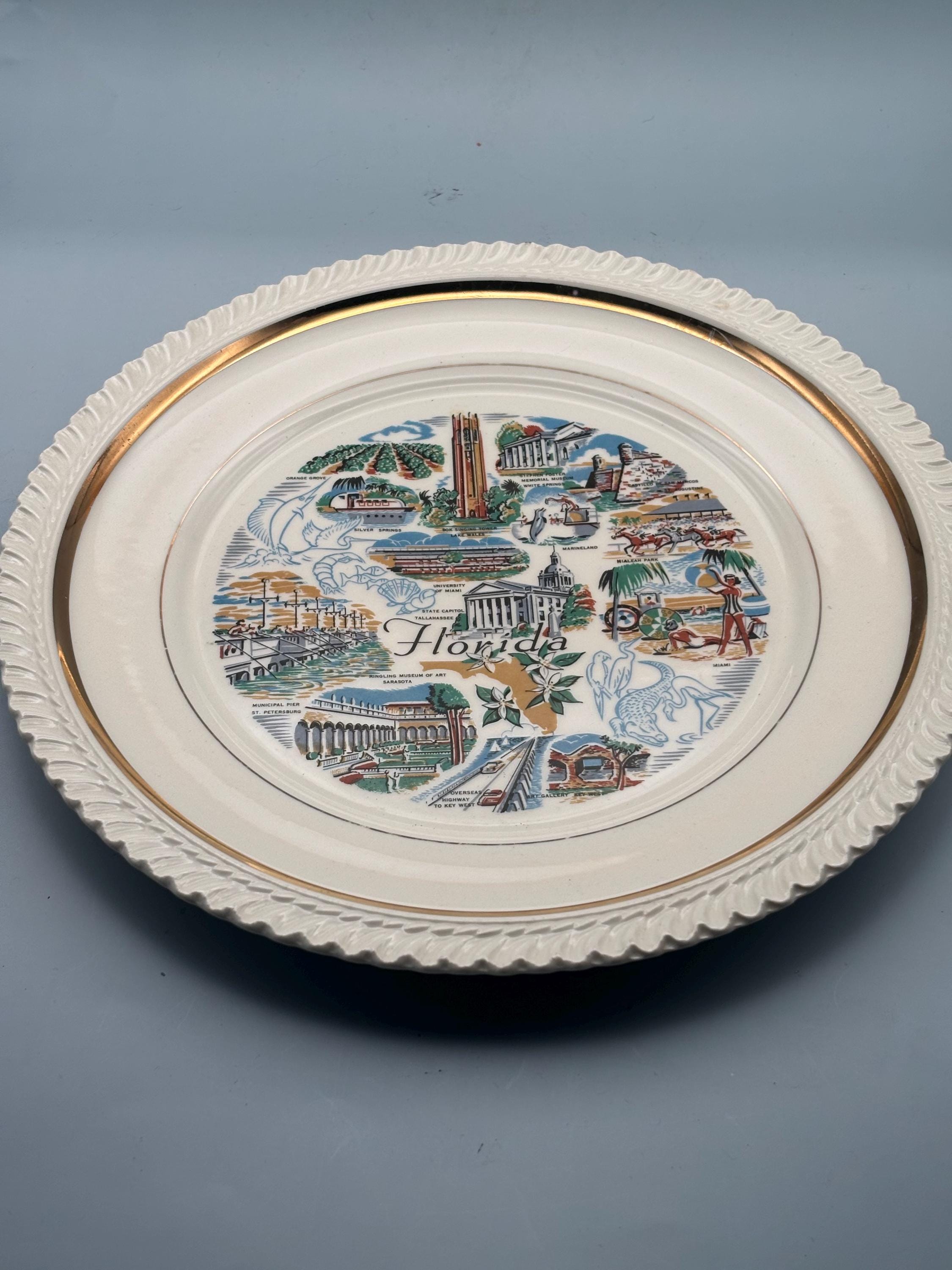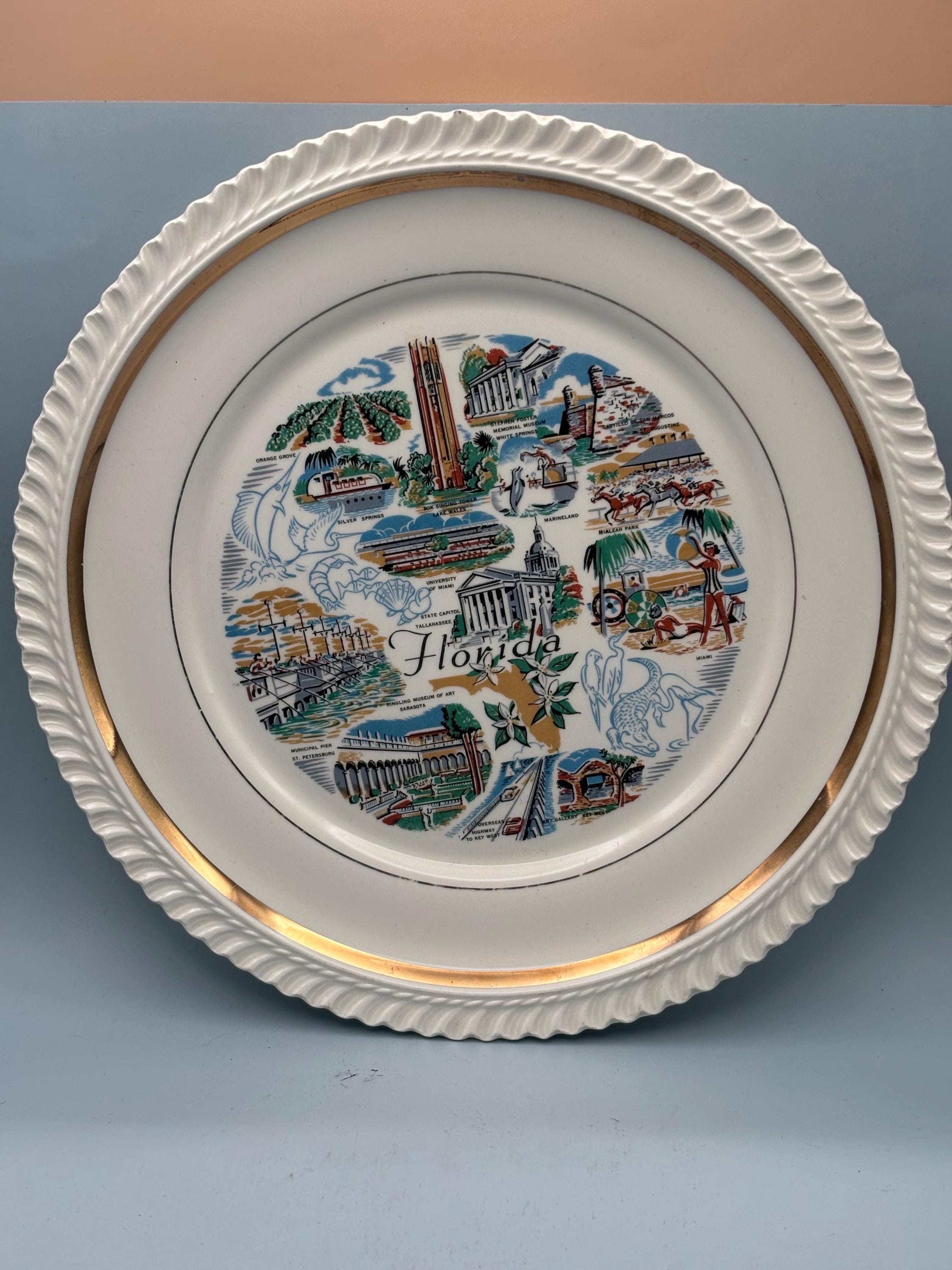 We have a gorgeous, Mid Century Florida Souvenir Plate. It has a white ruffled, gold trimmed edge and multi color illustrations of state landmarks.