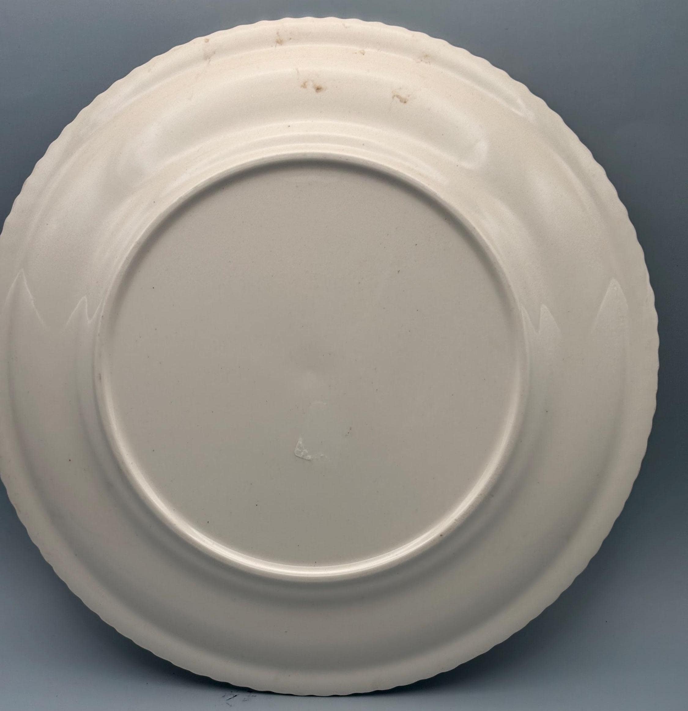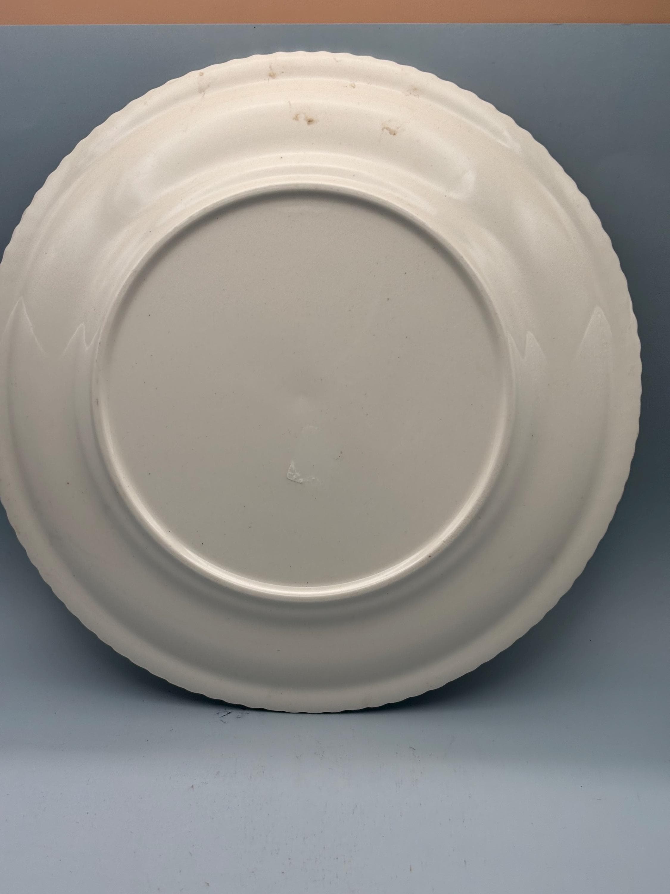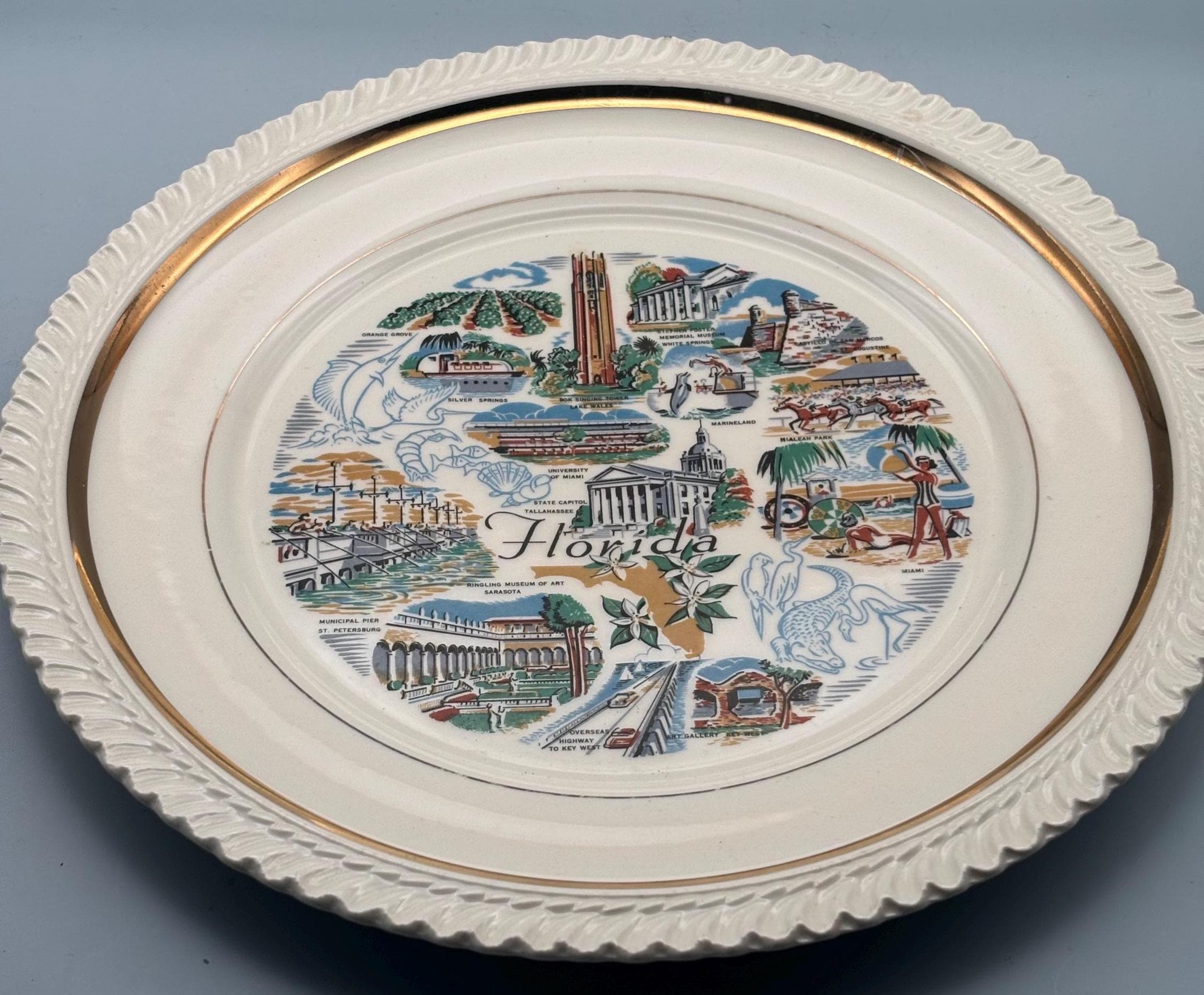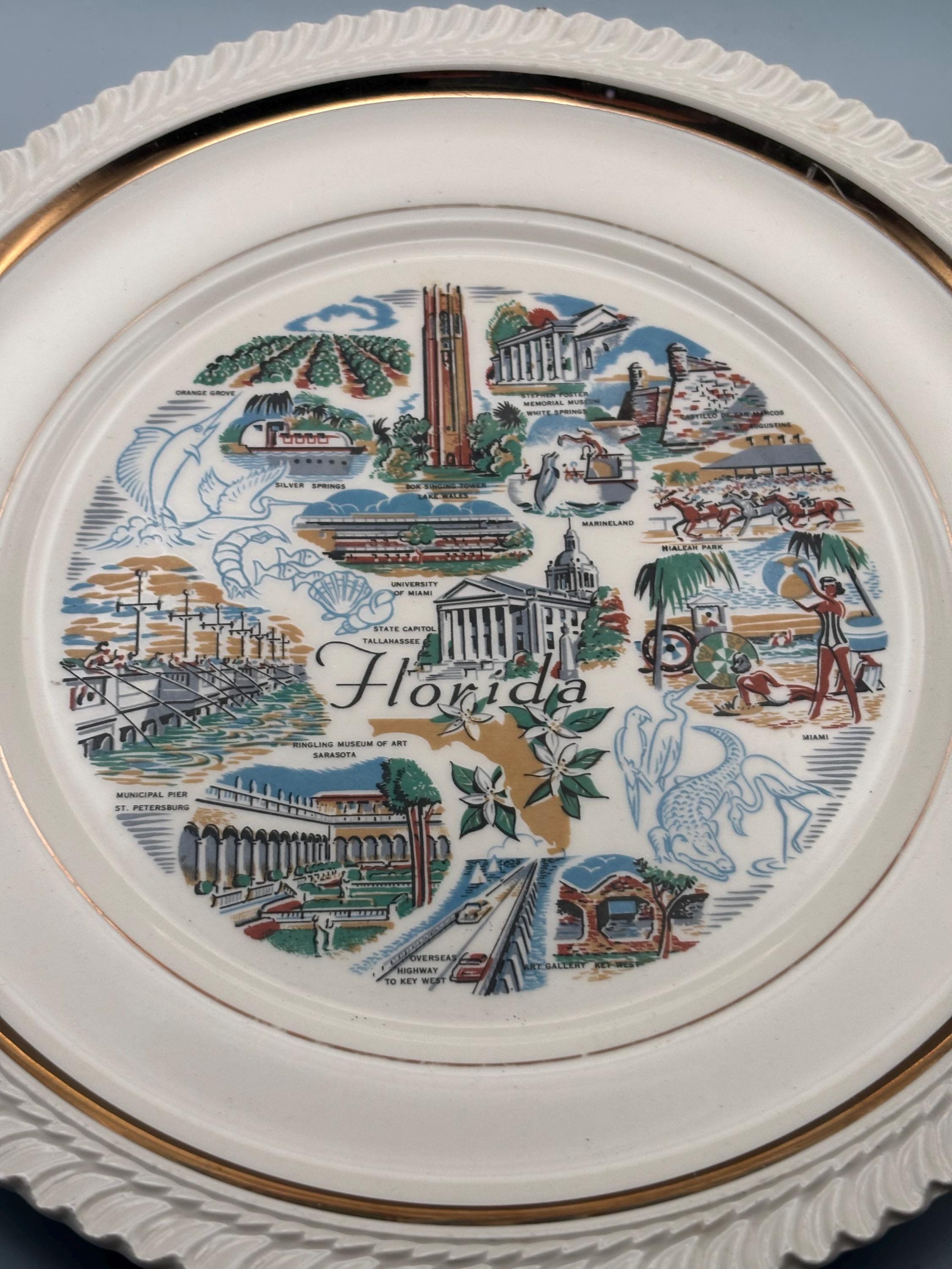 We have a gorgeous, Mid Century Florida Souvenir Plate. It has a white ruffled, gold trimmed edge and multi color illustrations of state landmarks.