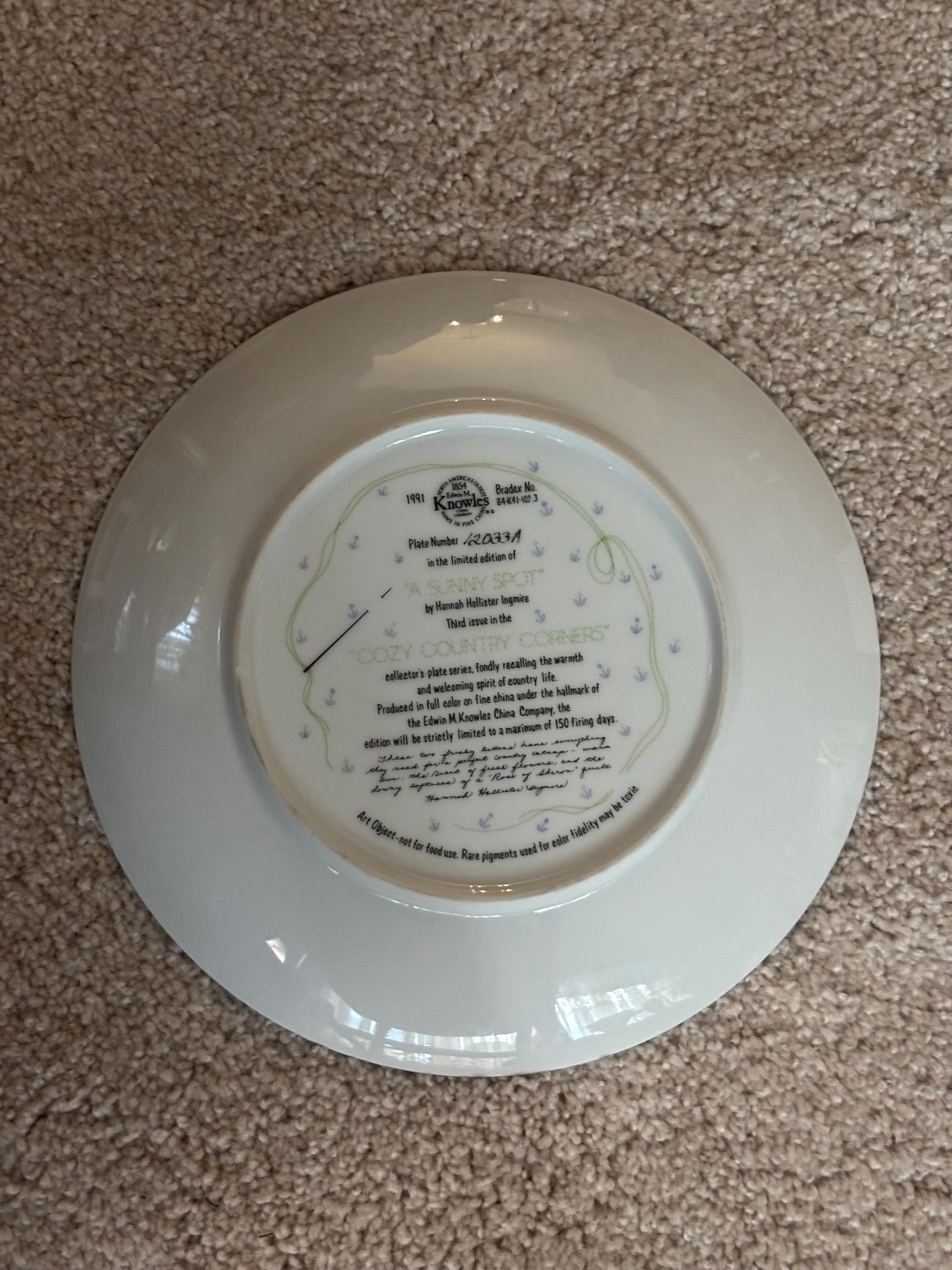 We have a lovely Series Sunny Spot Cat Plate. It was created in 1991 by Edwin K. Knowles China Company, First Issue Limited Edition. It is #12033A.