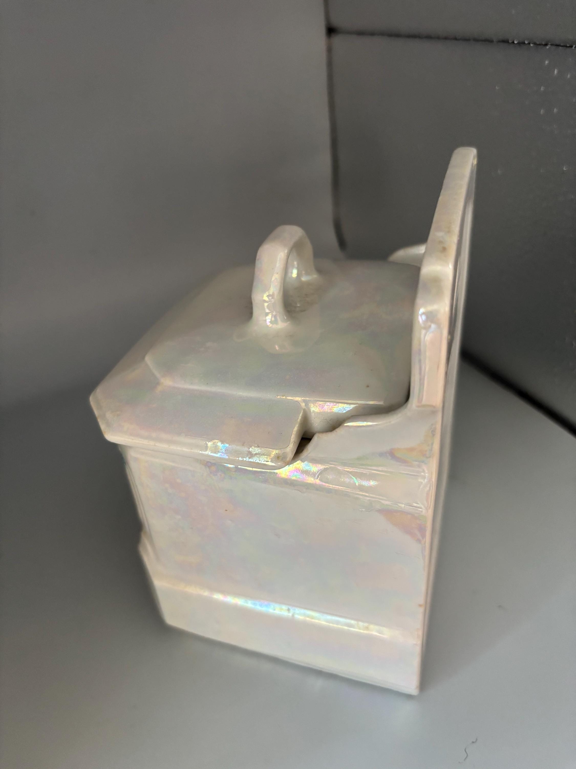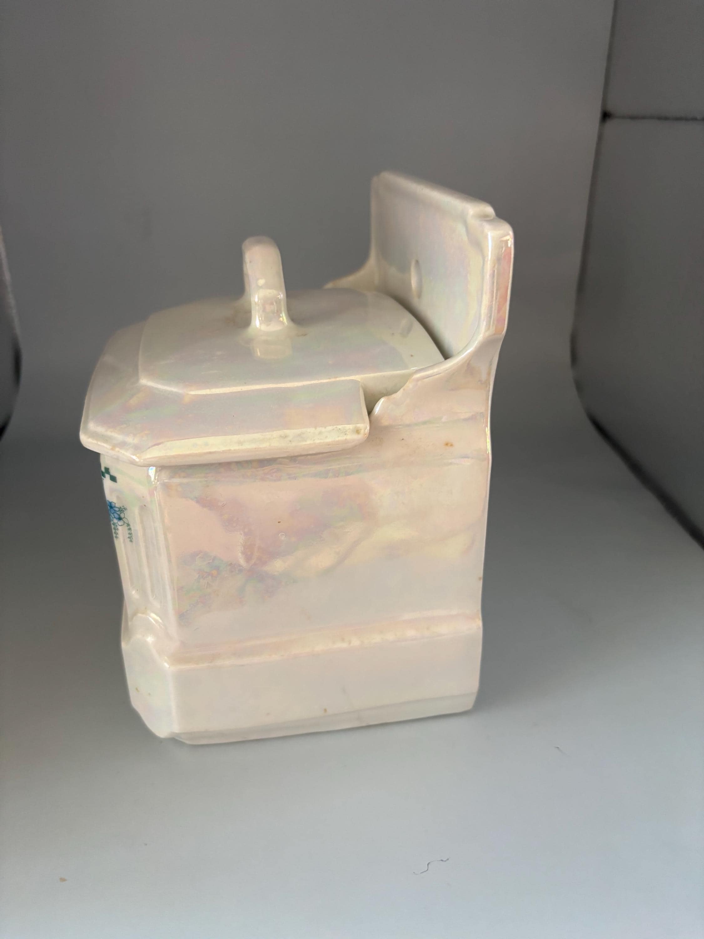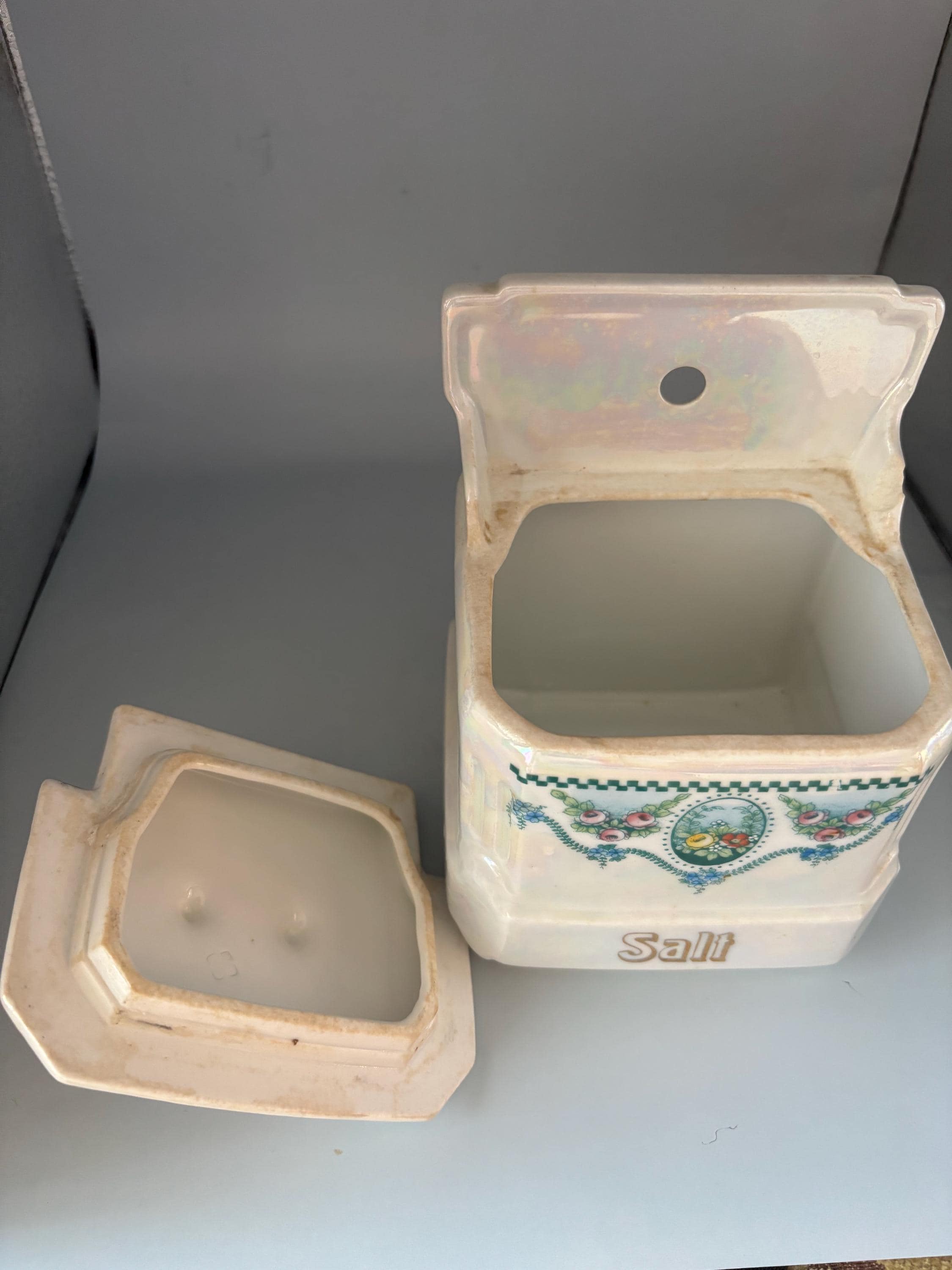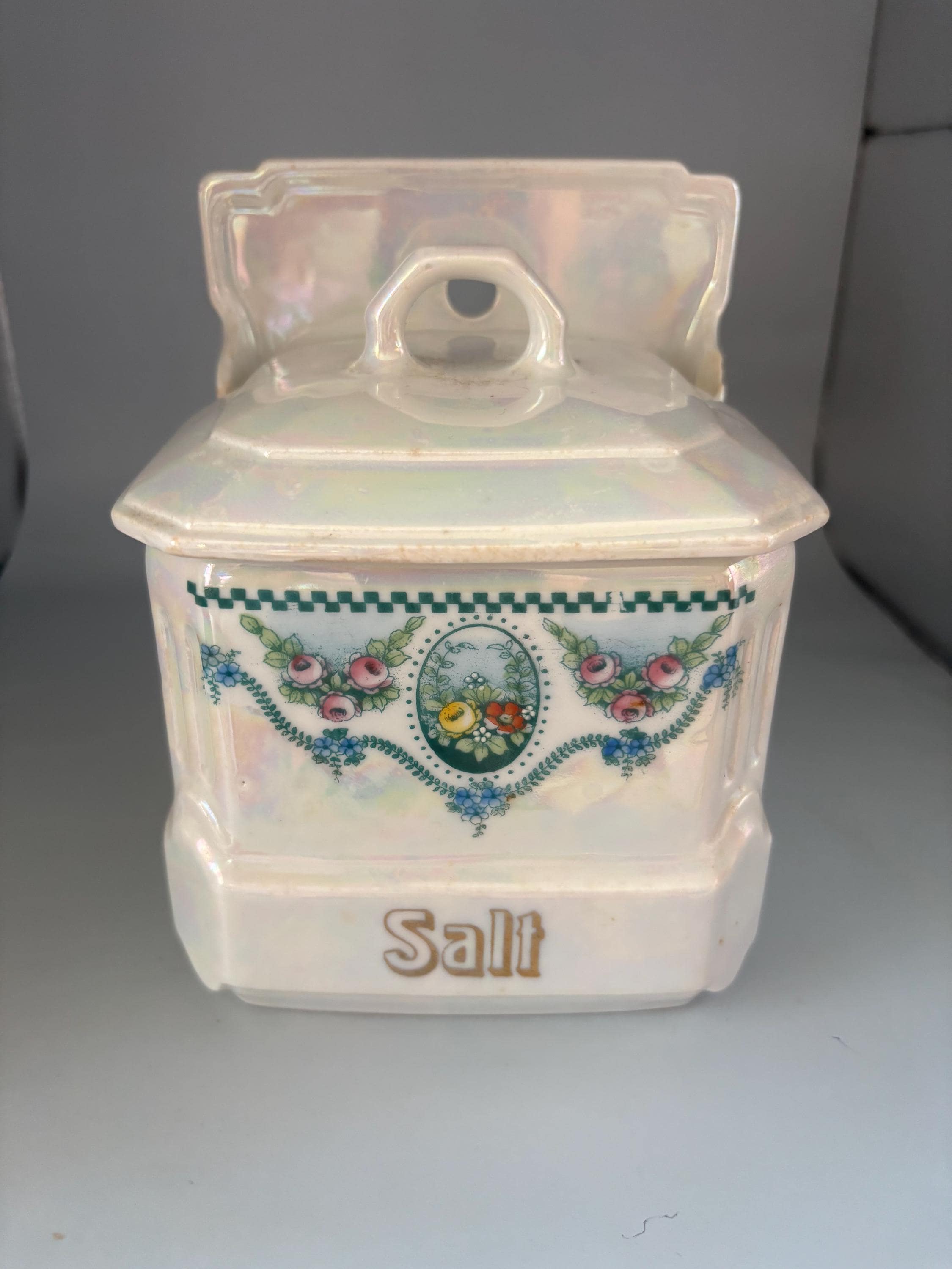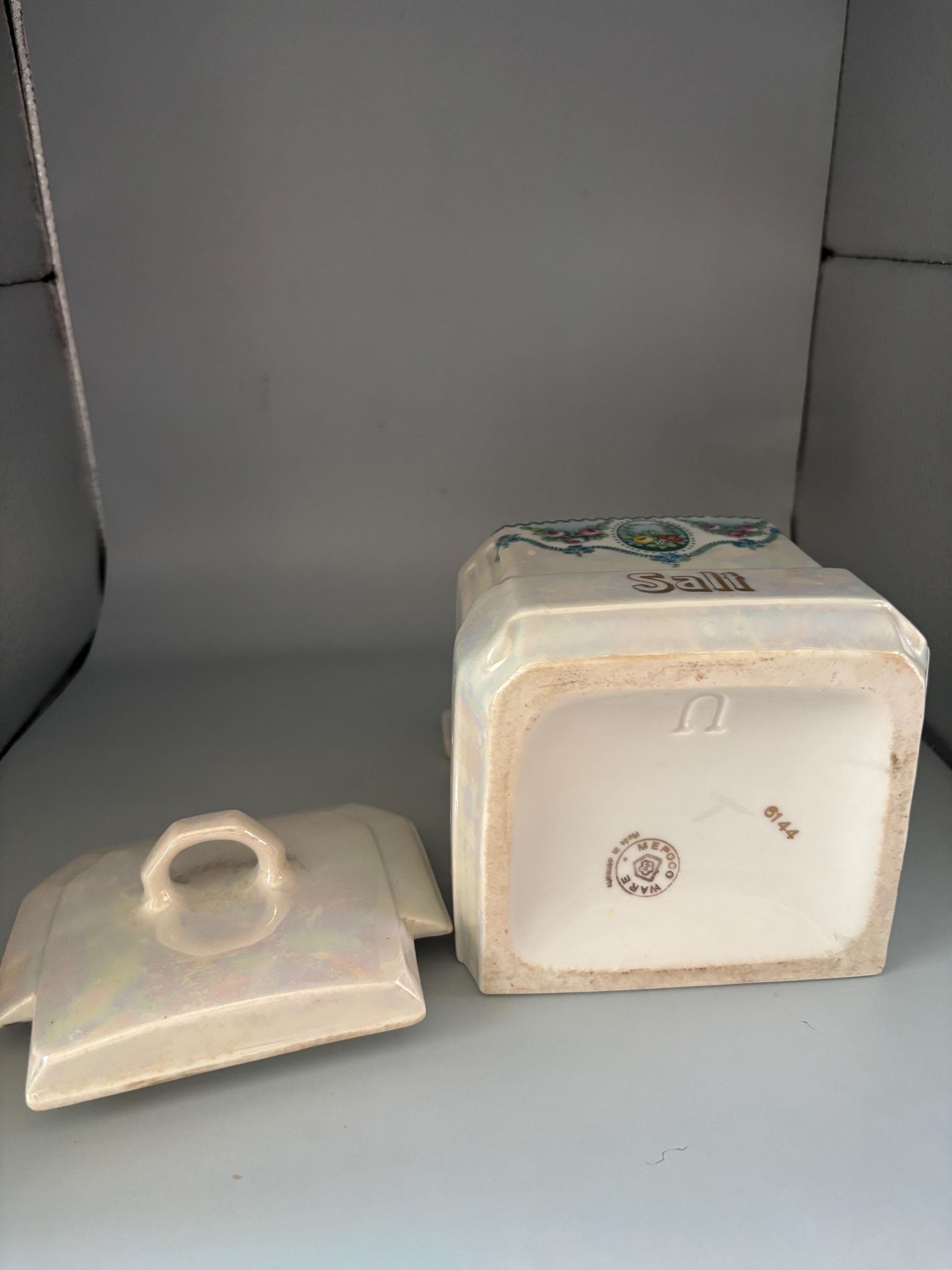 We are featuring this Vintage Mepoco Germany Lusterware Salt Box with Lid. This ceramic canister was made in Germany and produced around the early 1900's.