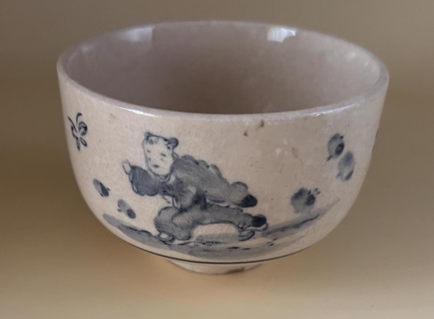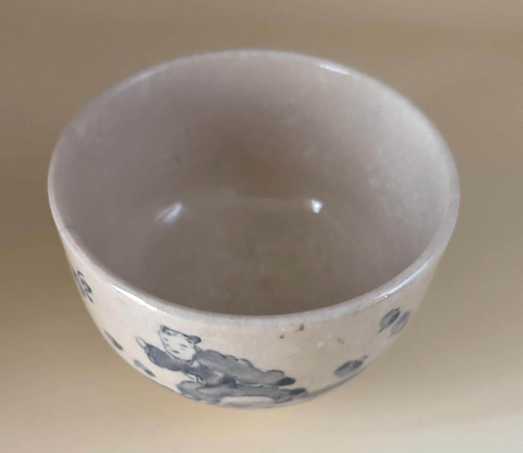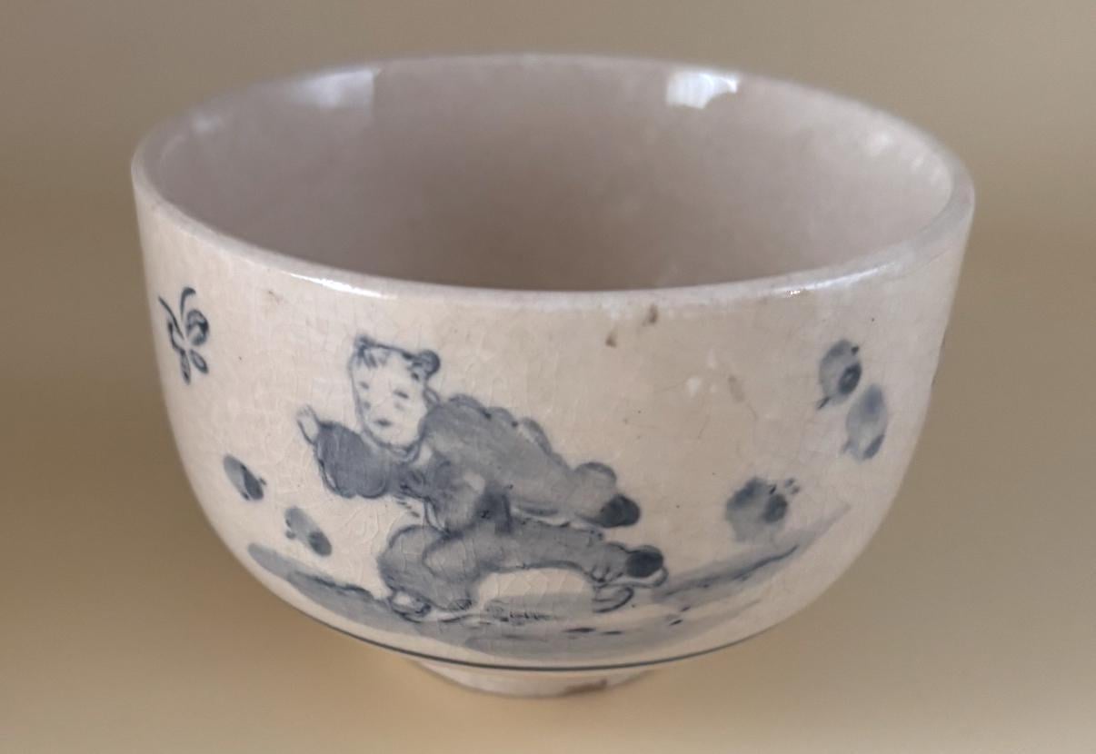 We have a gorgeous Antique Cobalt Blue Chawan Japanese Bowl. It is approximately 18th Century. It featurdes a simple, underglaze cobalt blue painting on a light, slightly crackled glaze. Crazing is common age related feature in such pieces. The figure resembles the common East Asian "karako", a motif of playing boys that is highly auspicious, symbolizing a wish for many sons, longevity and good fortune.