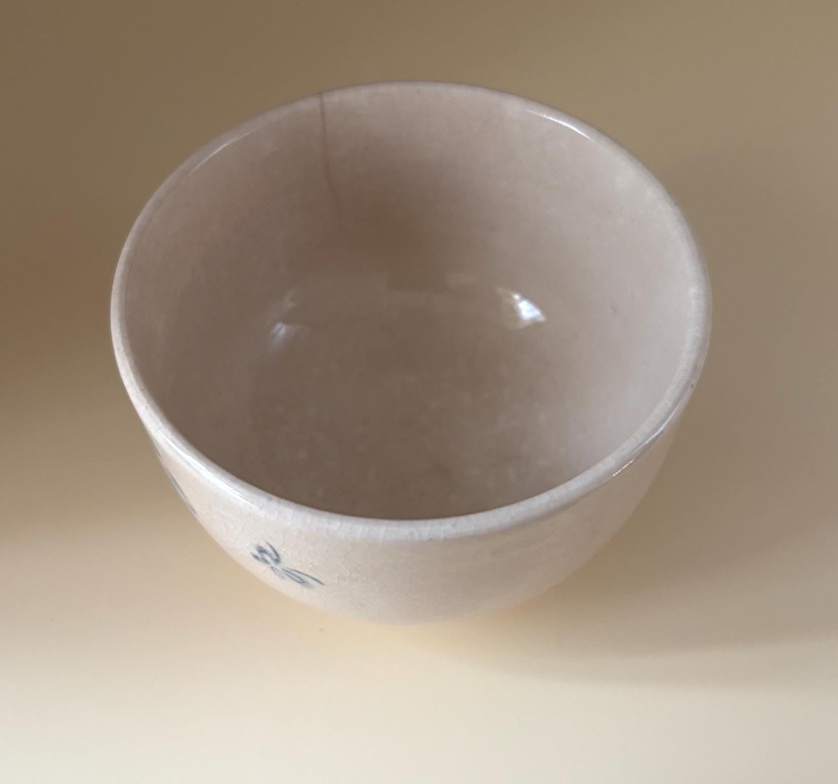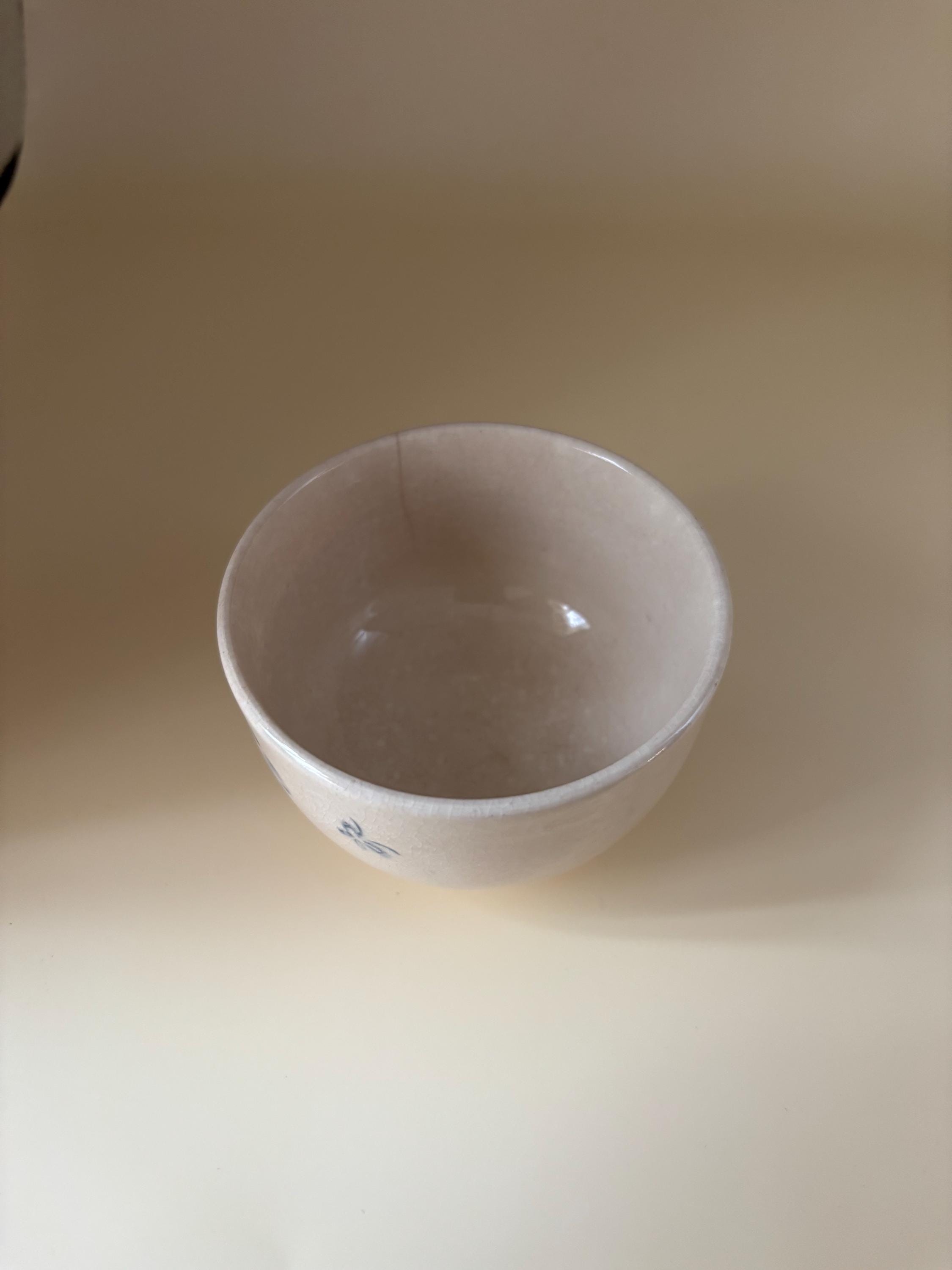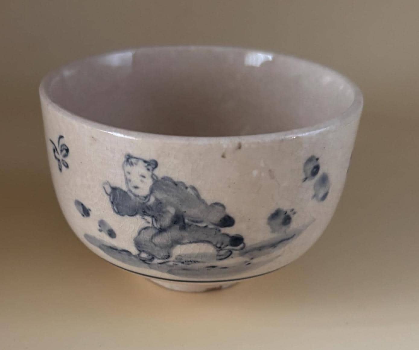 We have a gorgeous Antique Cobalt Blue Chawan Japanese Bowl. It is approximately 18th Century. It featurdes a simple, underglaze cobalt blue painting on a light, slightly crackled glaze. Crazing is common age related feature in such pieces. The figure resembles the common East Asian "karako", a motif of playing boys that is highly auspicious, symbolizing a wish for many sons, longevity and good fortune.