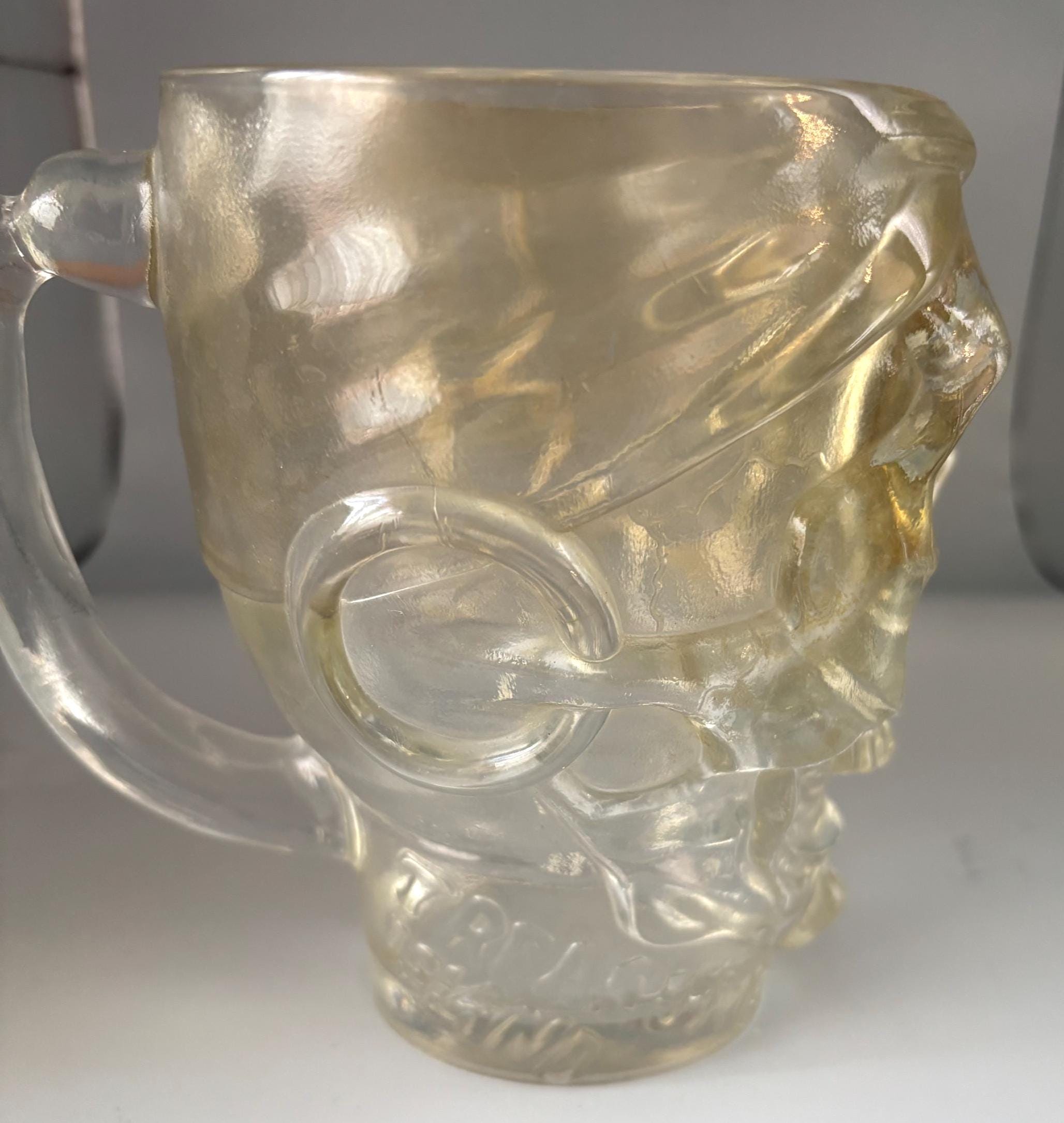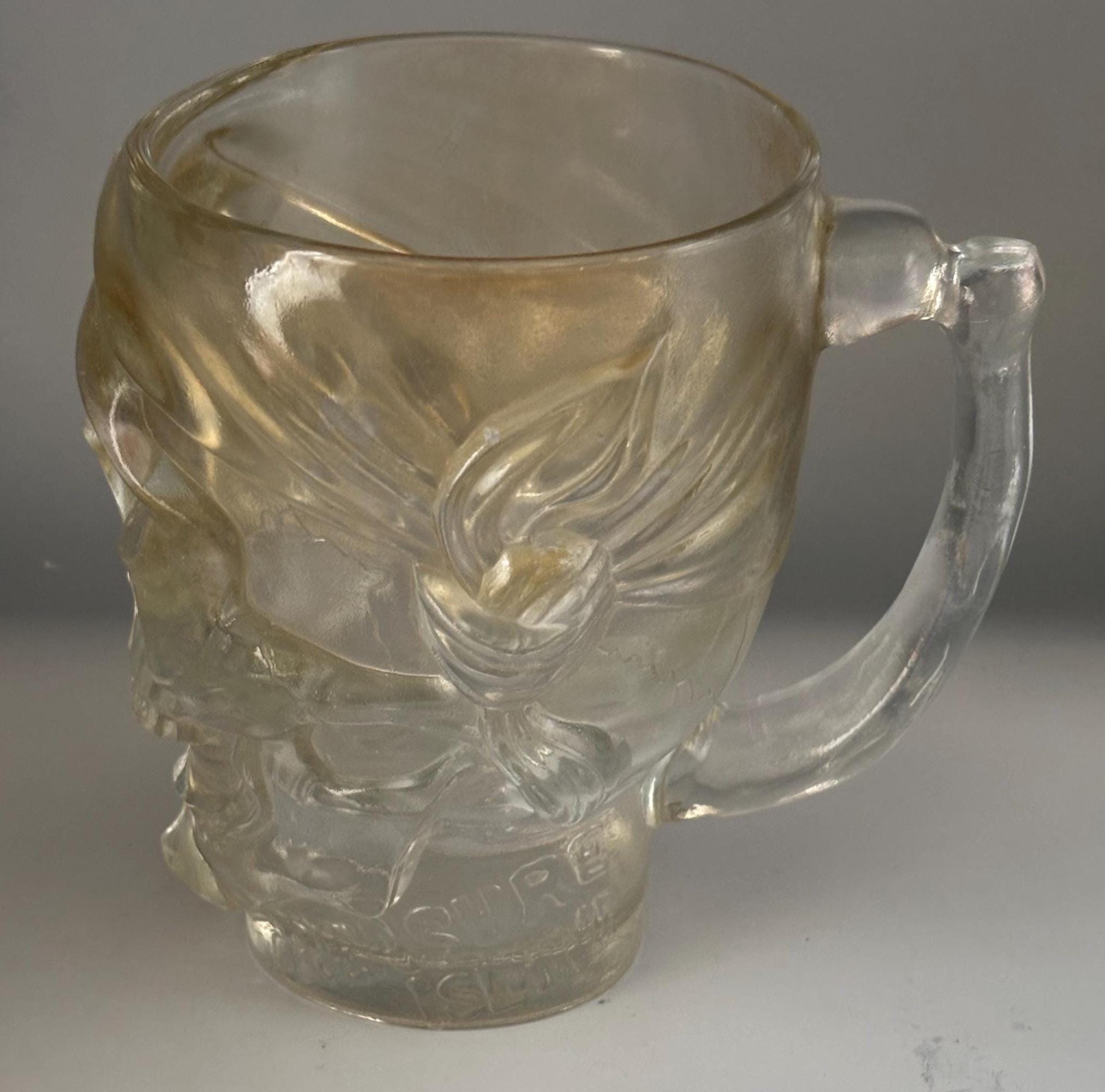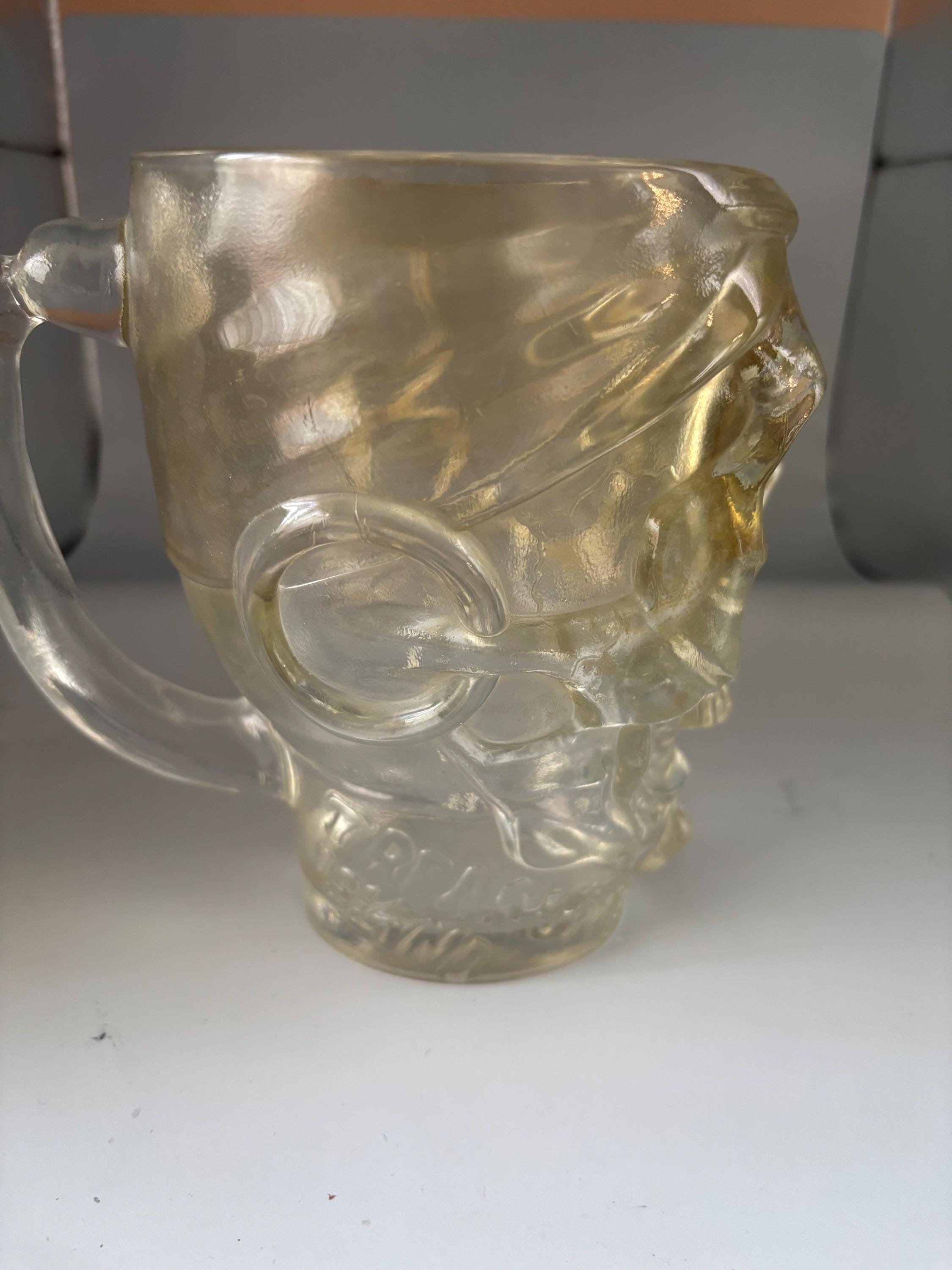 We have a lovely Vintage Luminarc USA Glass Pirate Skull Mug. It is made of heavy glass and fetures a detailed pirate skull design with a handle.
