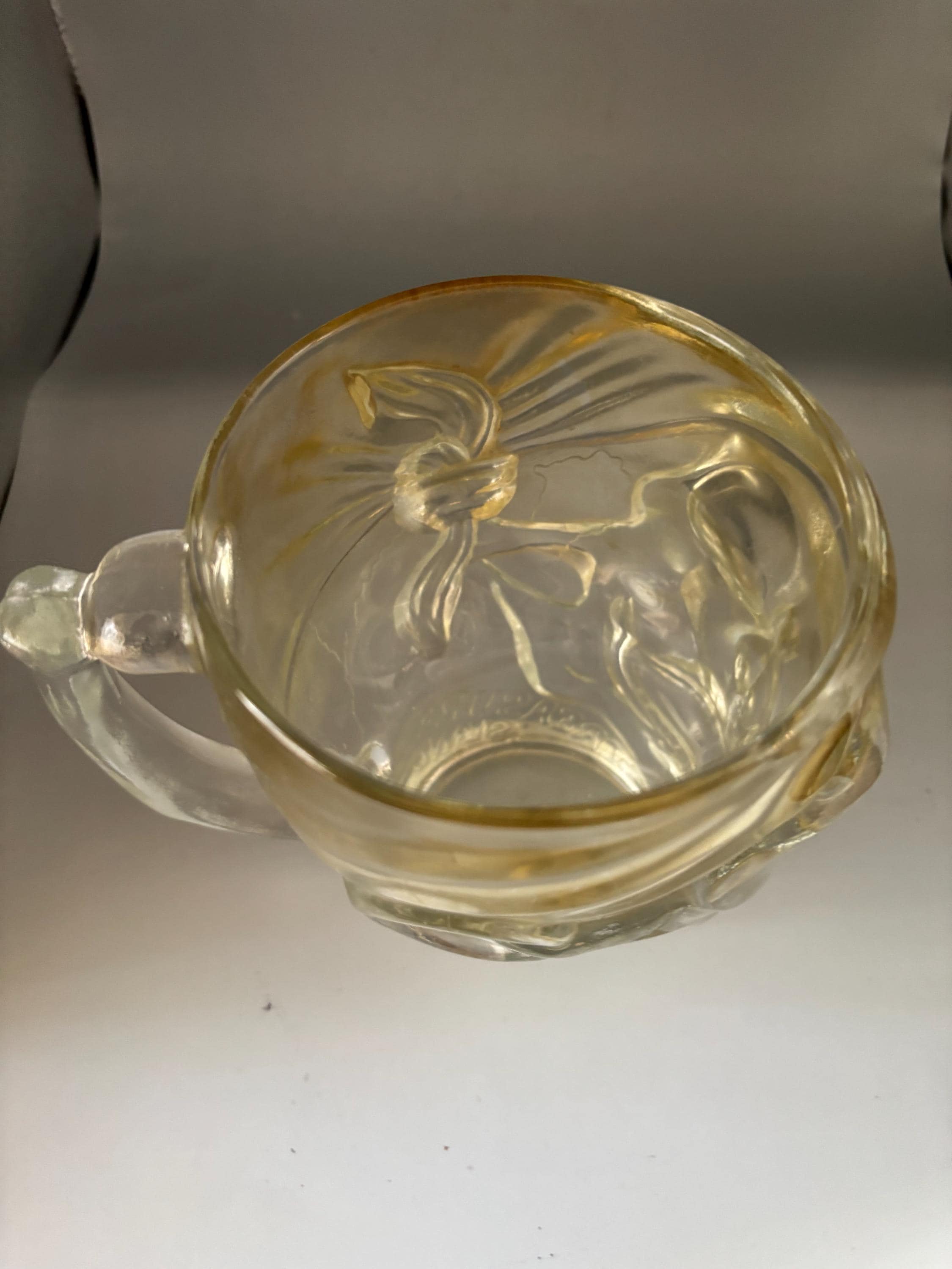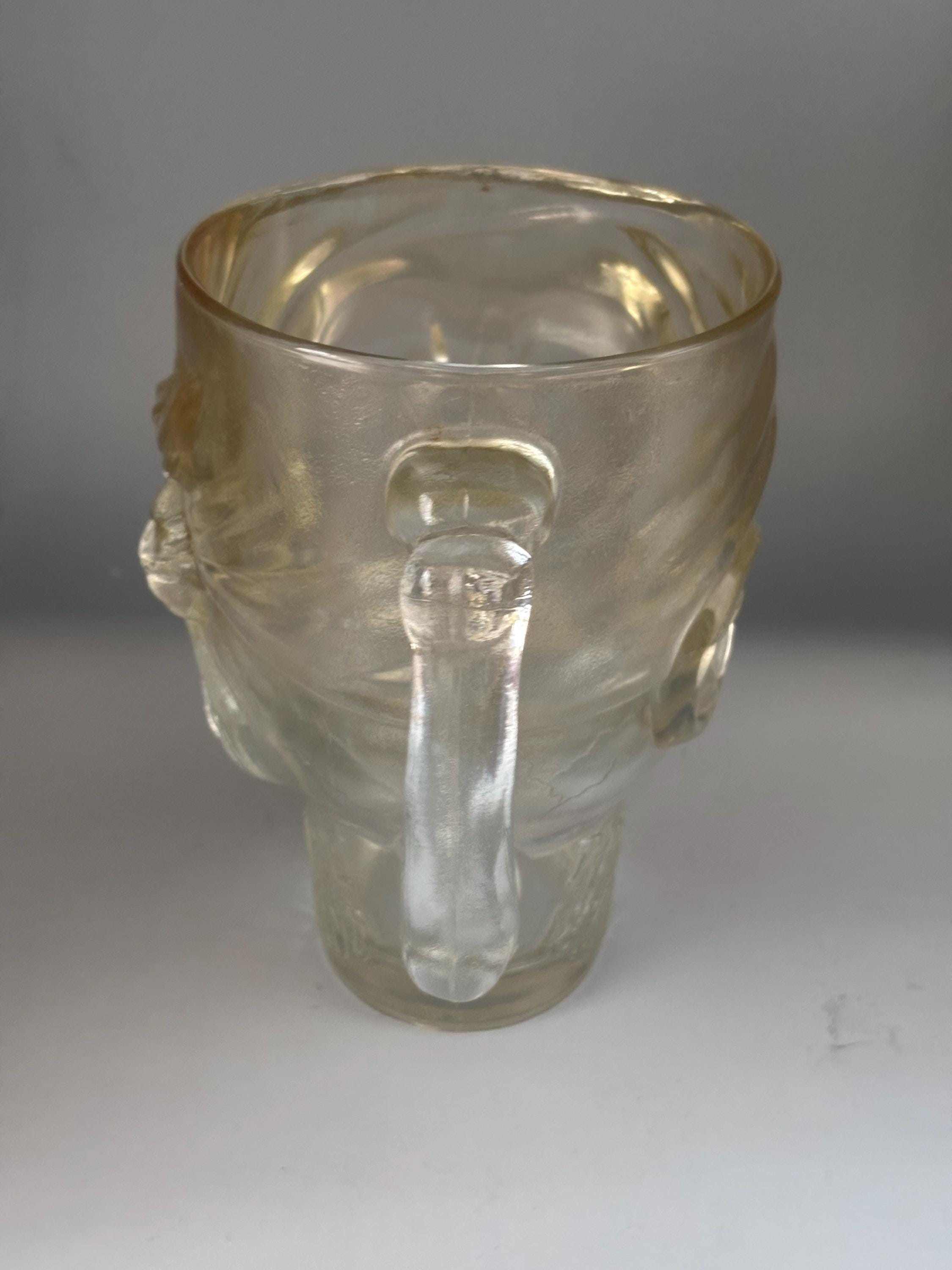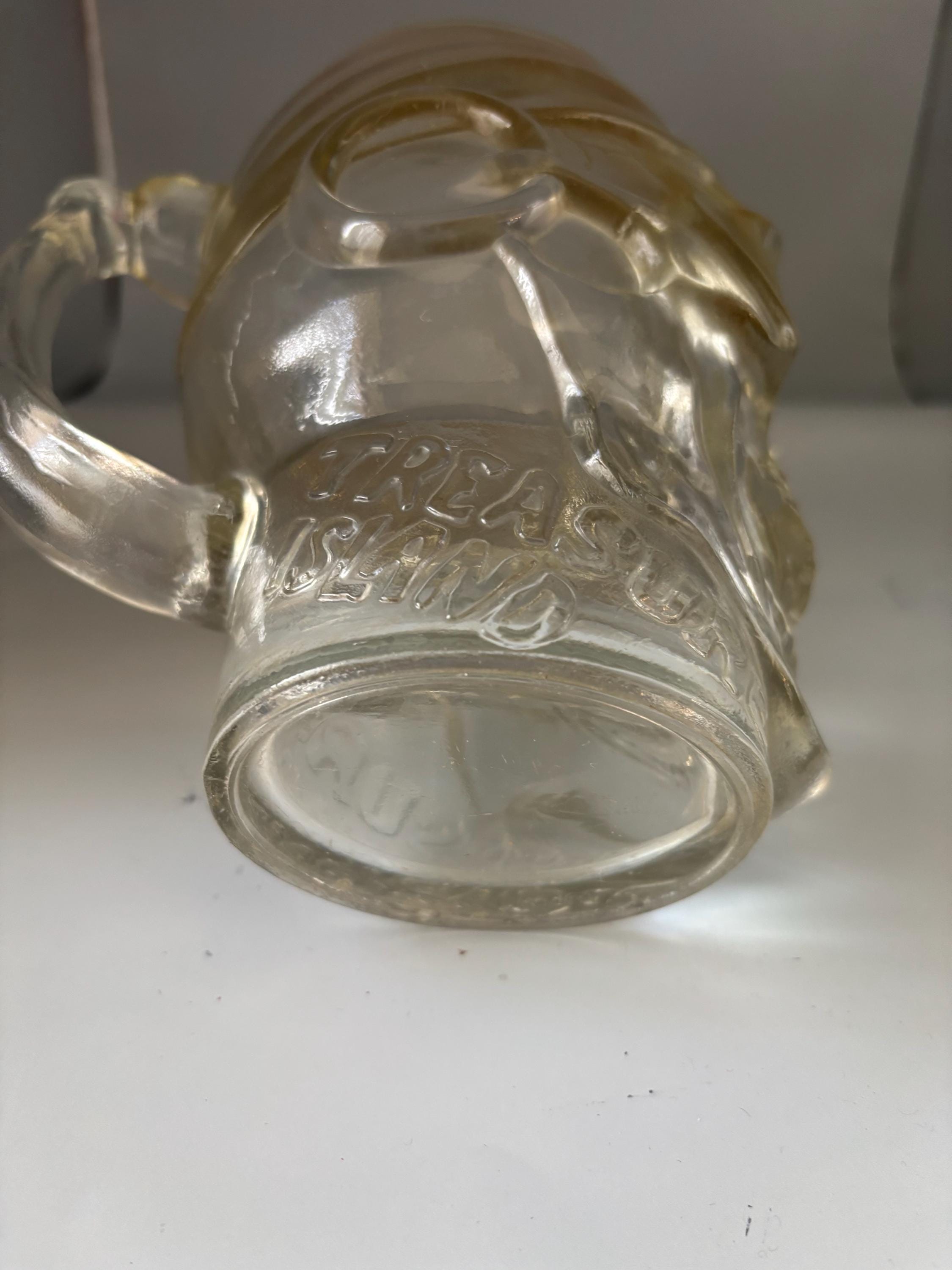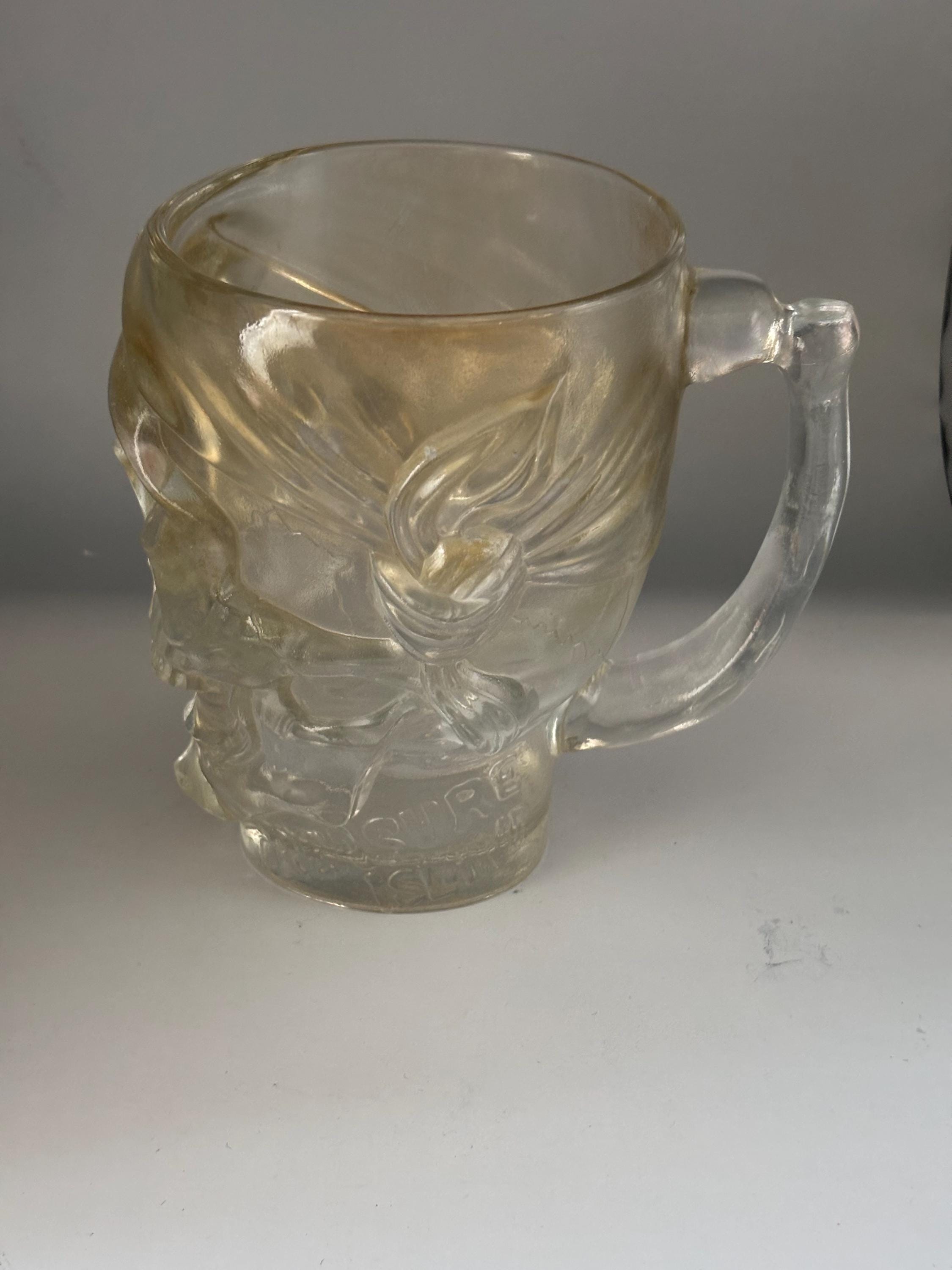 We have a lovely Vintage Luminarc USA Glass Pirate Skull Mug. It is made of heavy glass and fetures a detailed pirate skull design with a handle.