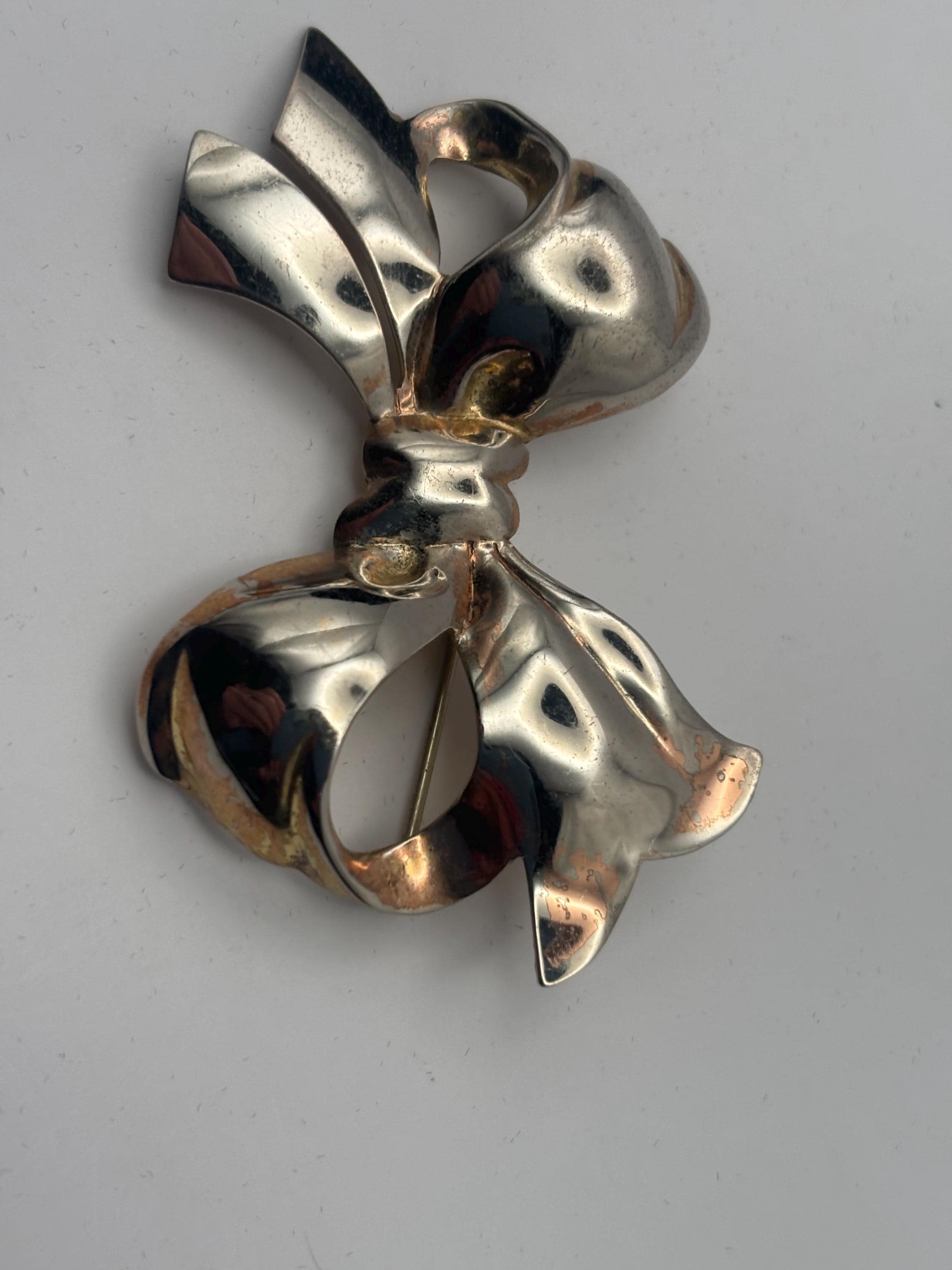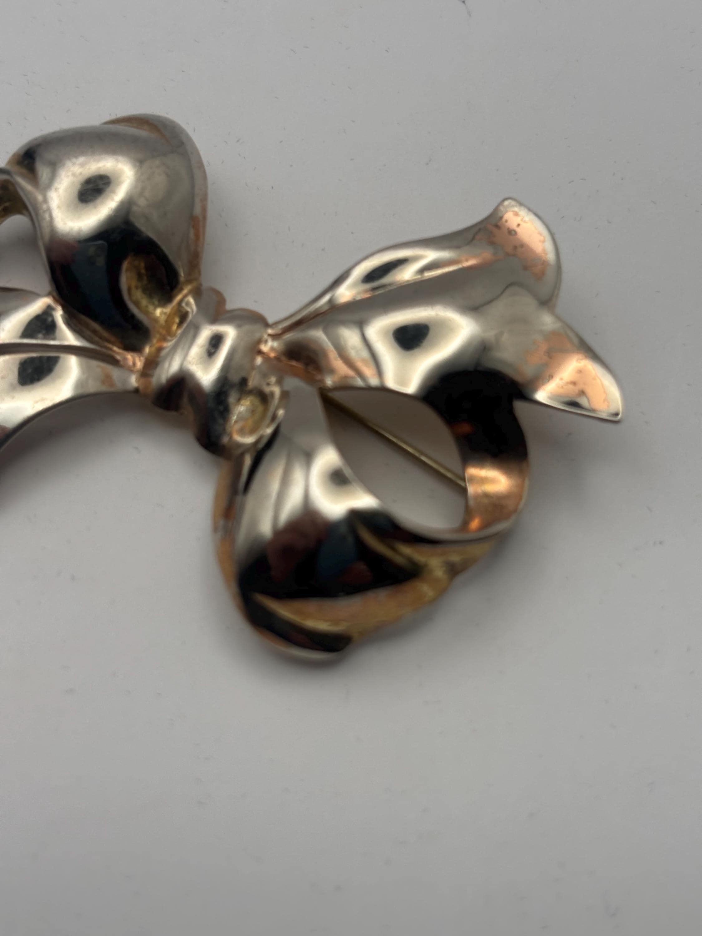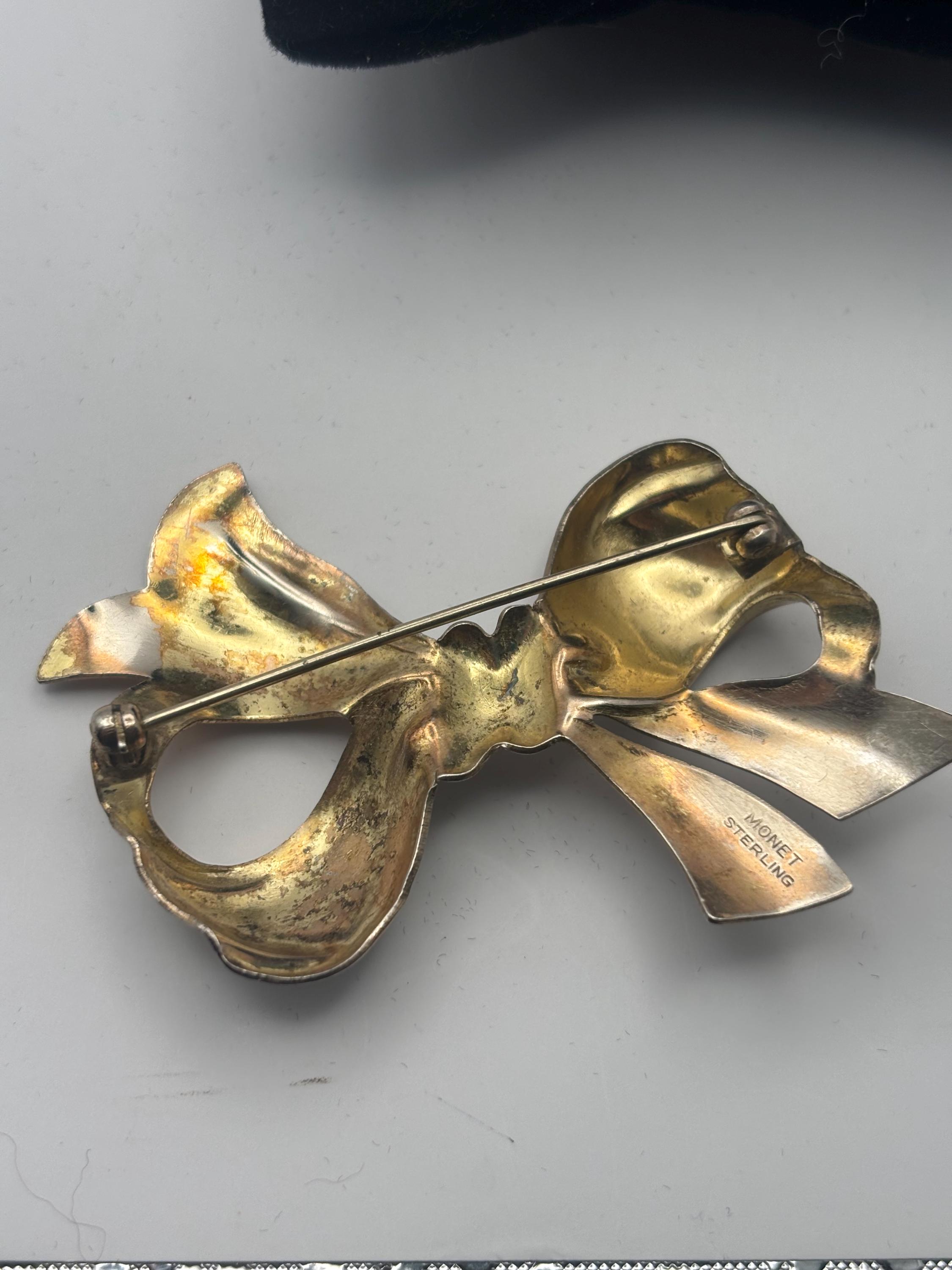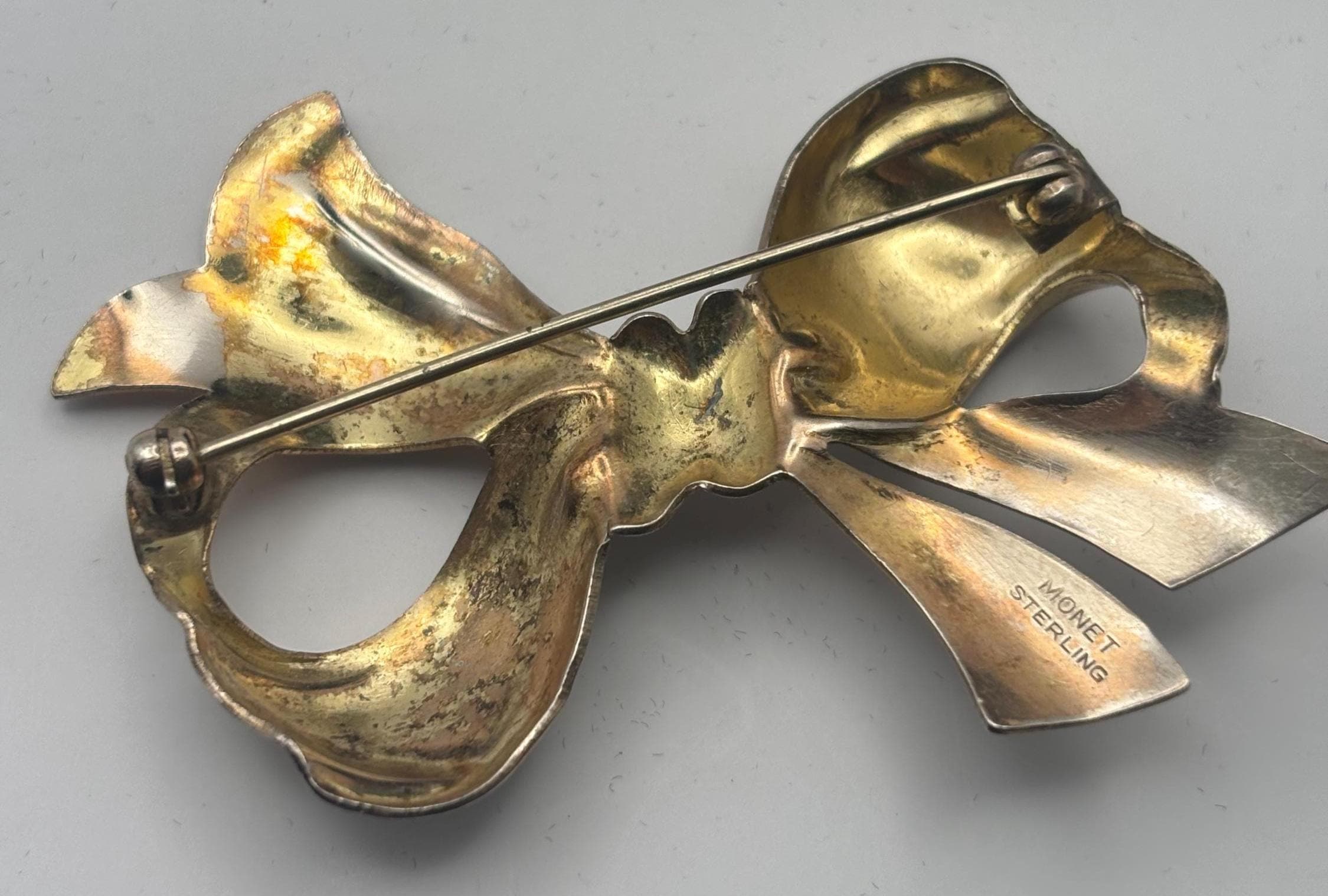 We have a Vintage Monet Sterling Silver Bow Pin/Brooch. It is marked Monet and .925 Sterling Silver. It has its original patina, as shown in the pictures. Could use a good cleaning, if you so choose. We leave it au natural!