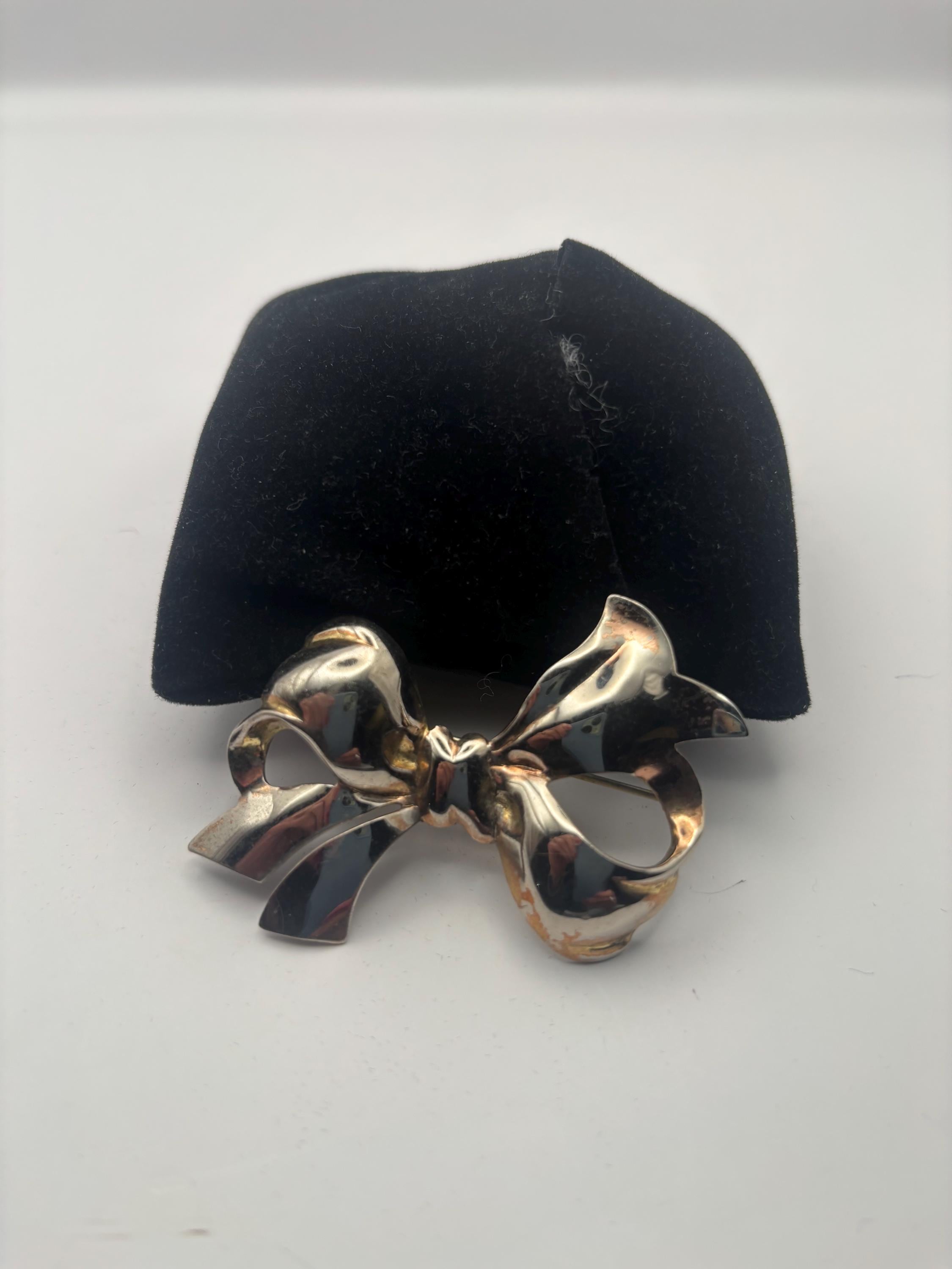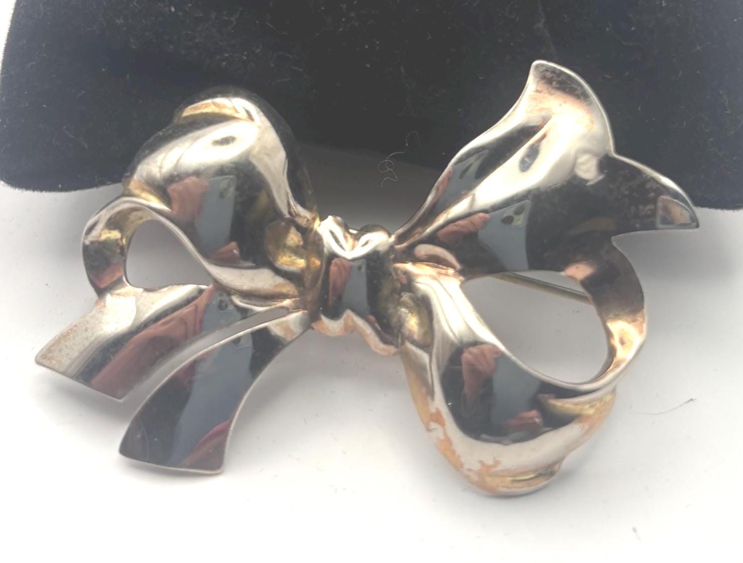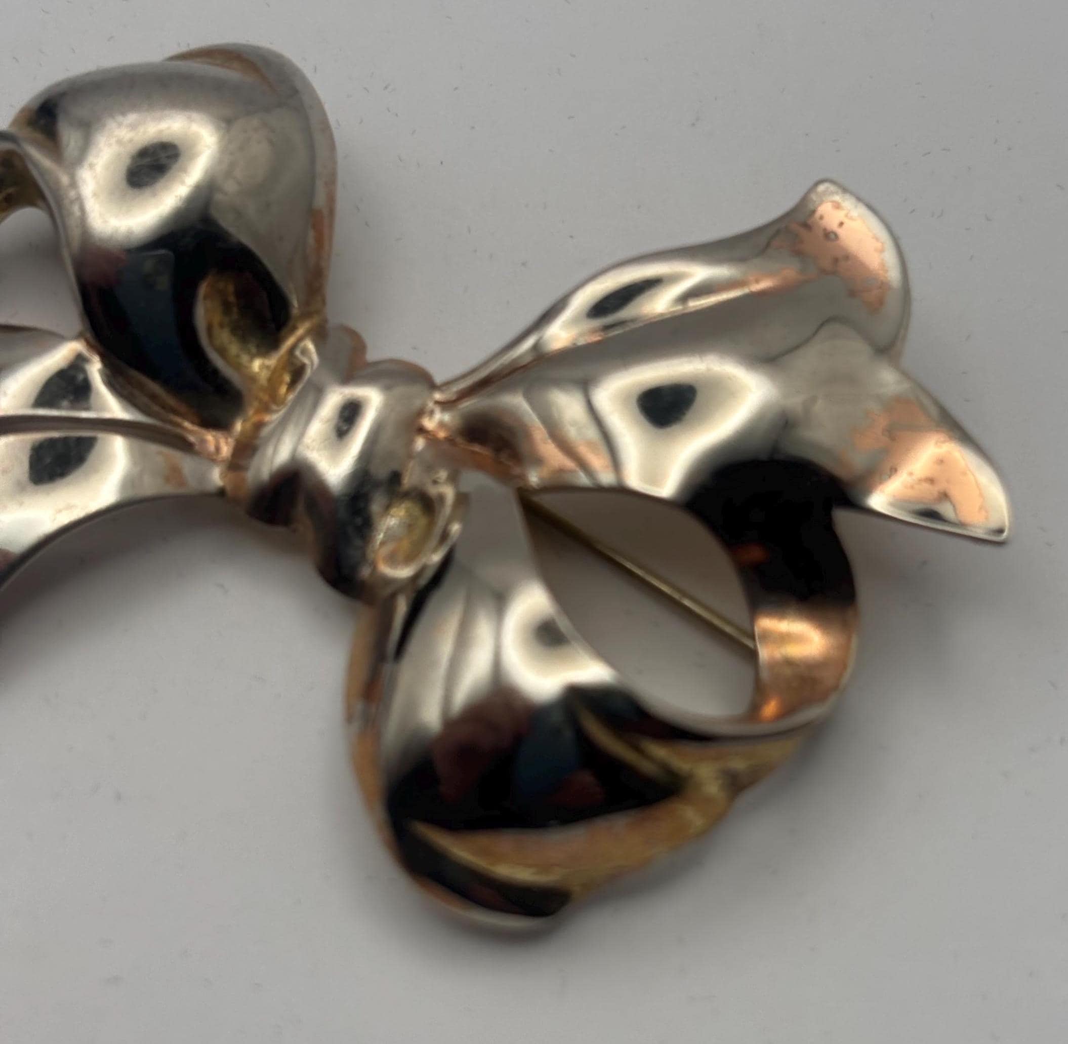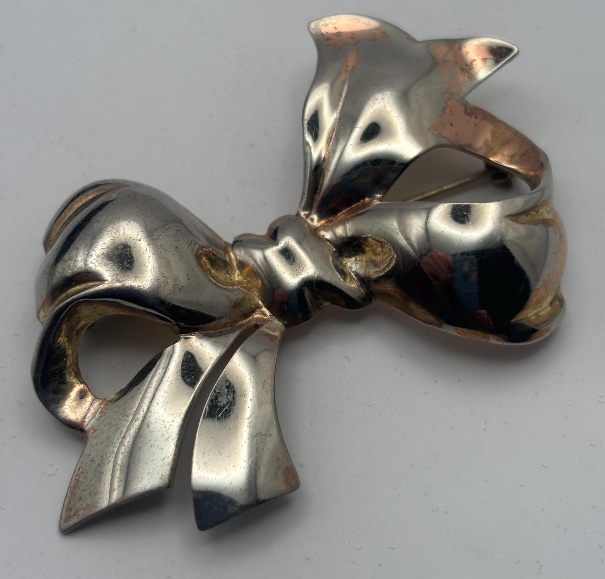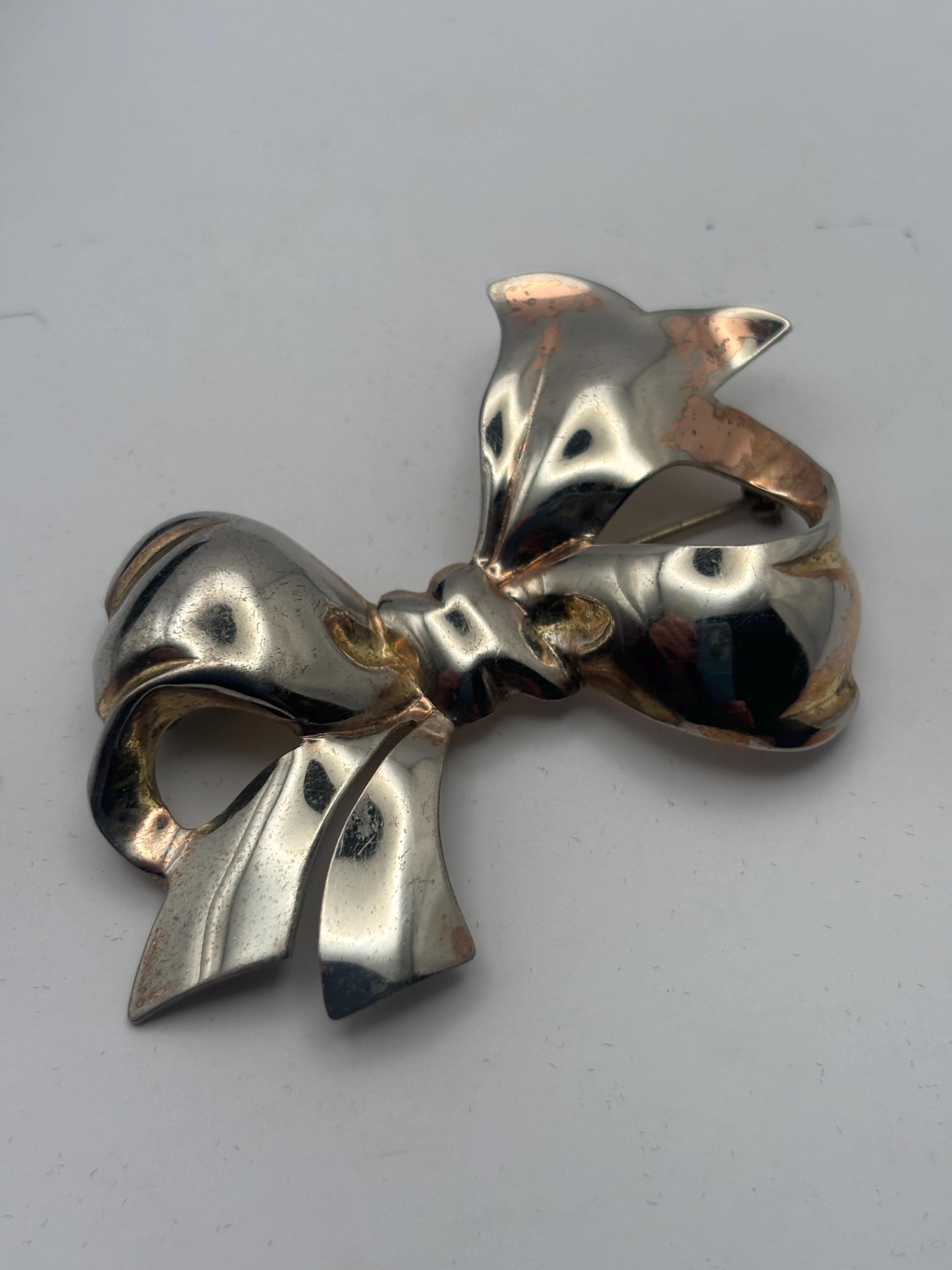We have a Vintage Monet Sterling Silver Bow Pin/Brooch. It is marked Monet and .925 Sterling Silver. It has its original patina, as shown in the pictures. Could use a good cleaning, if you so choose. We leave it au natural!