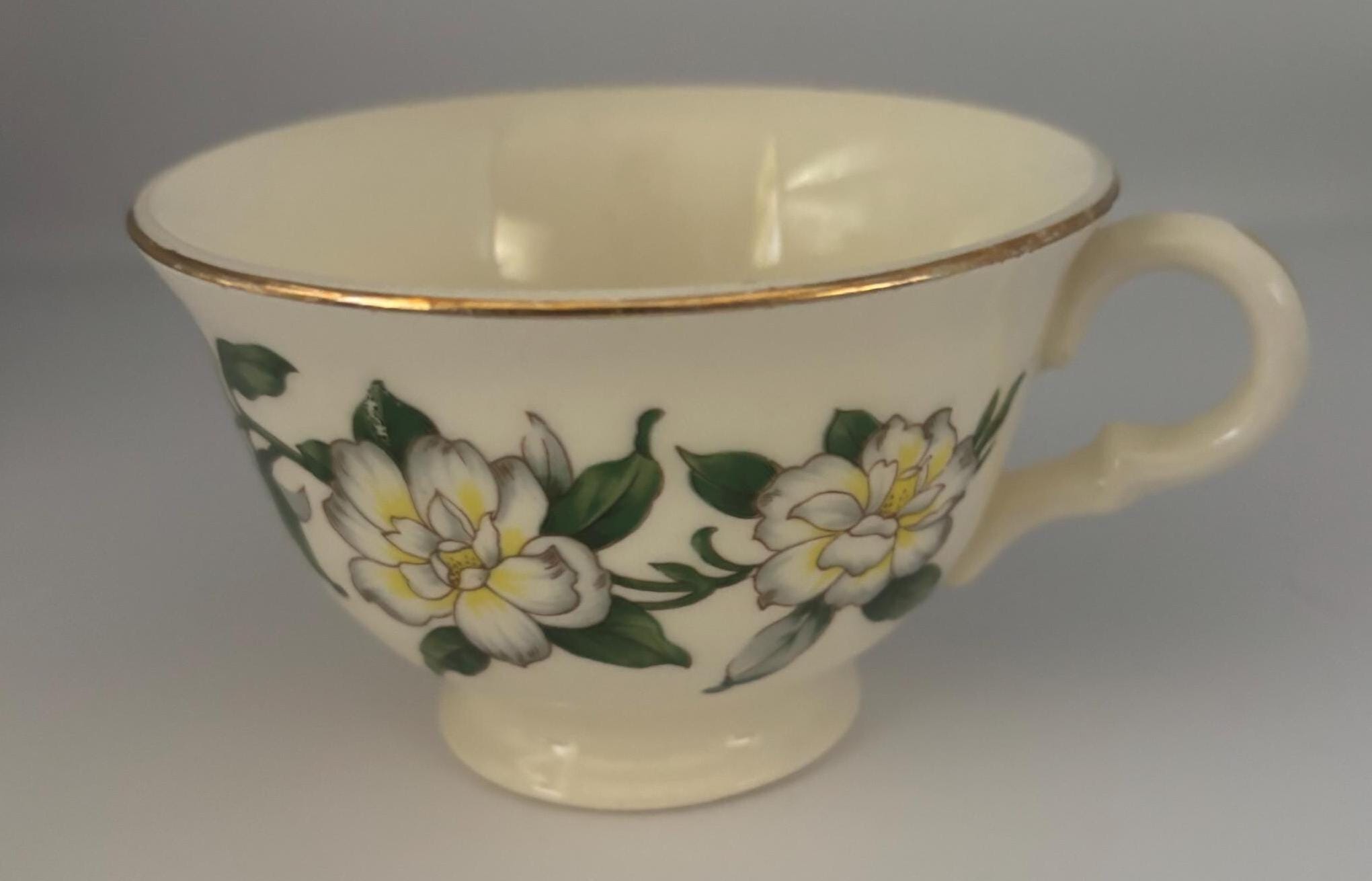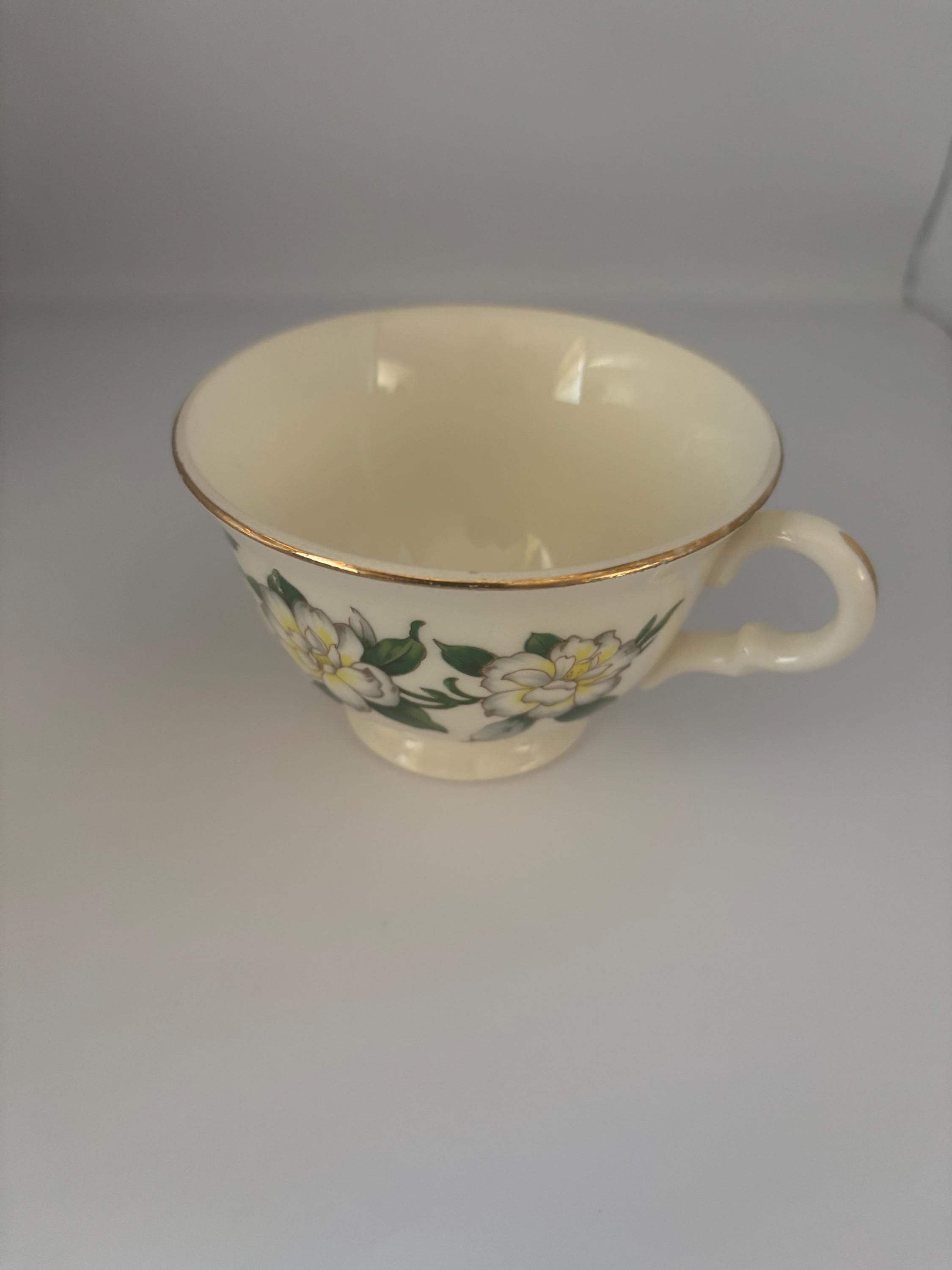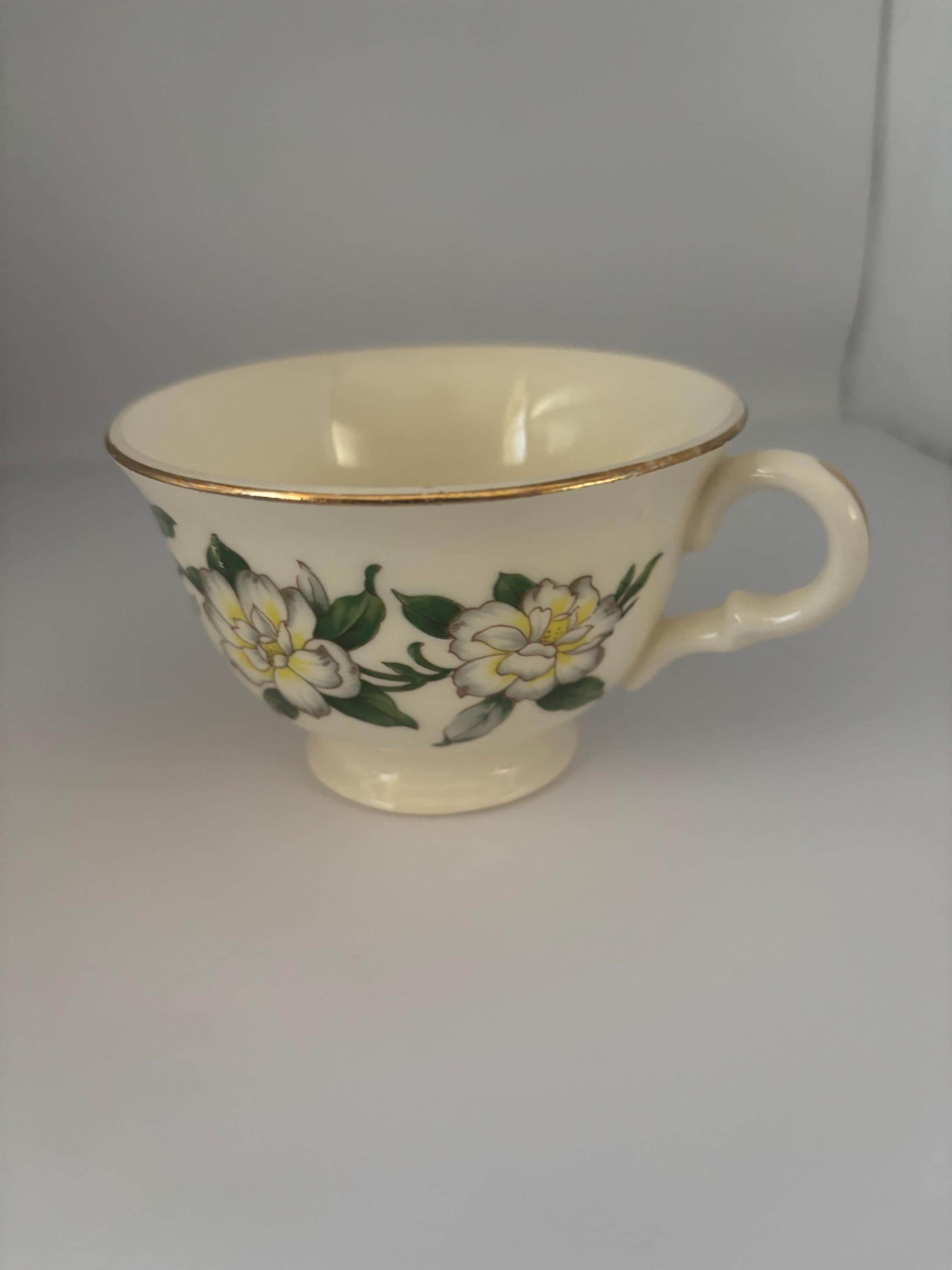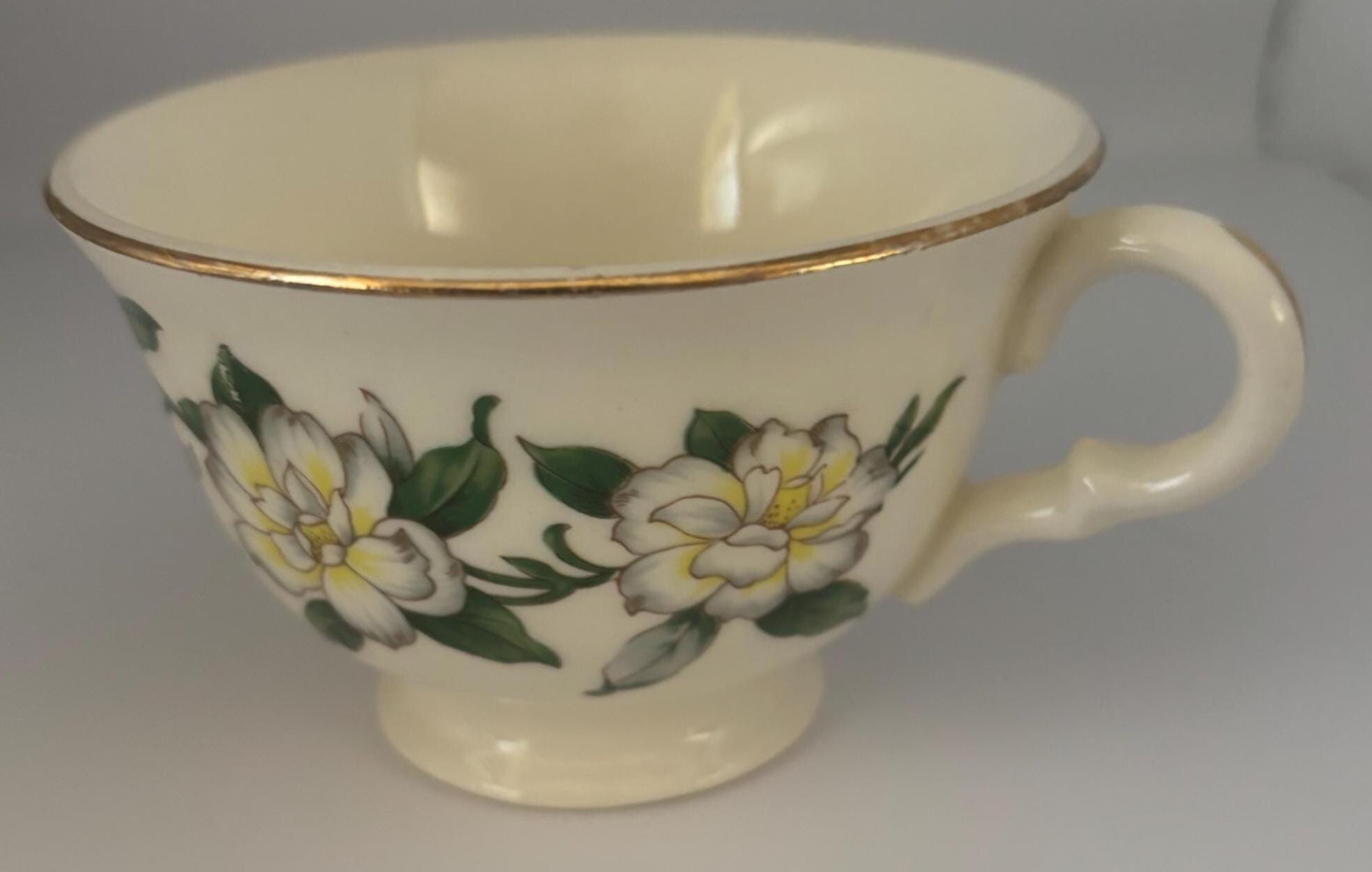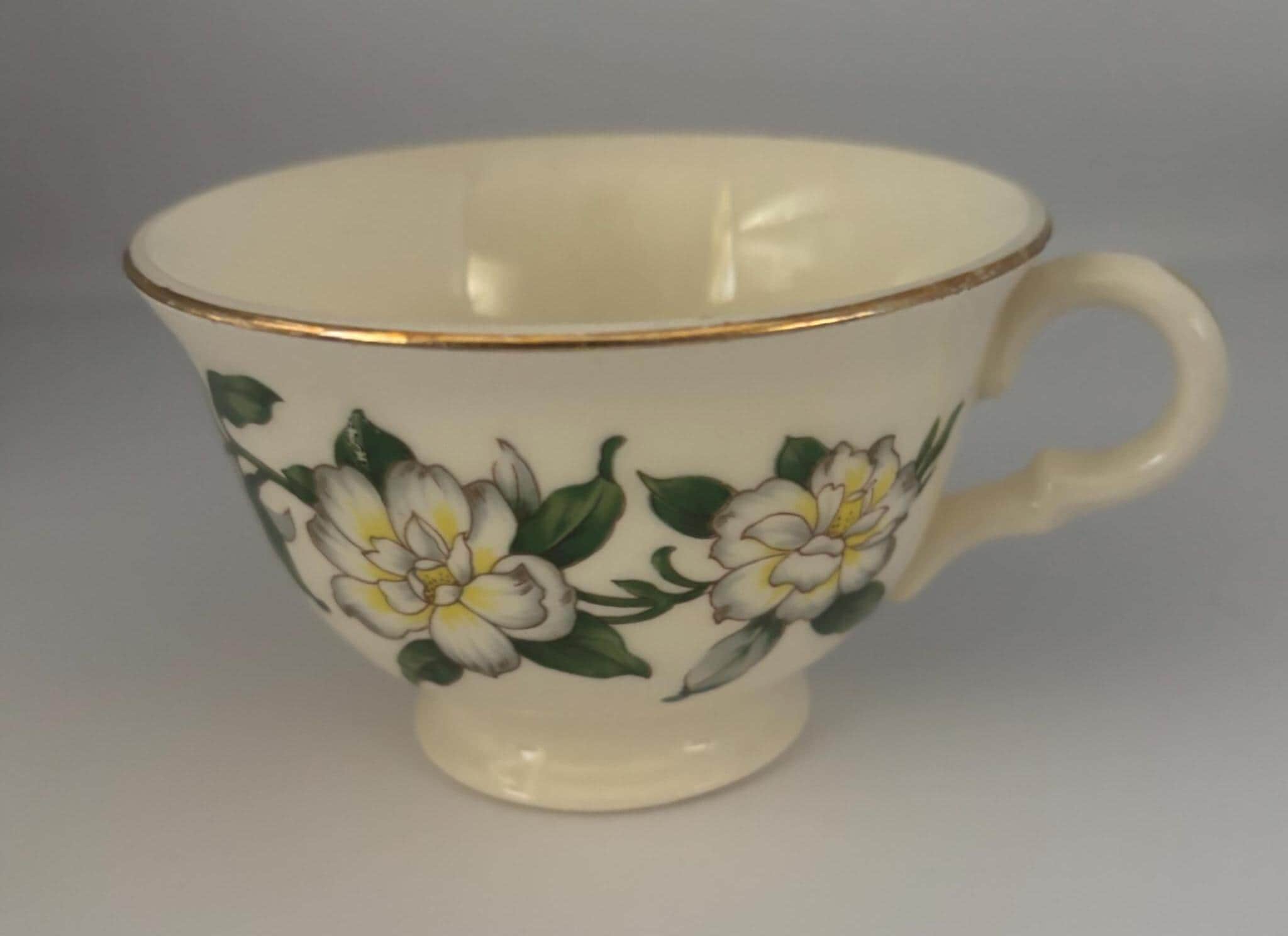 We have a lovely Vintage Homer Laughlin Eggshell Georgian Cotillion Teacup. It has a gorgeous white floral magnolia pattern and gold trim.