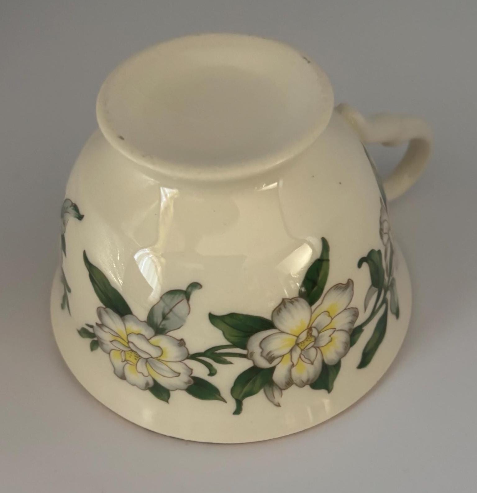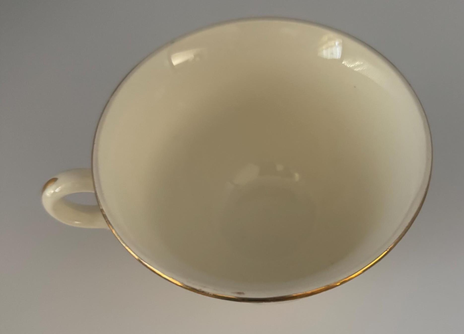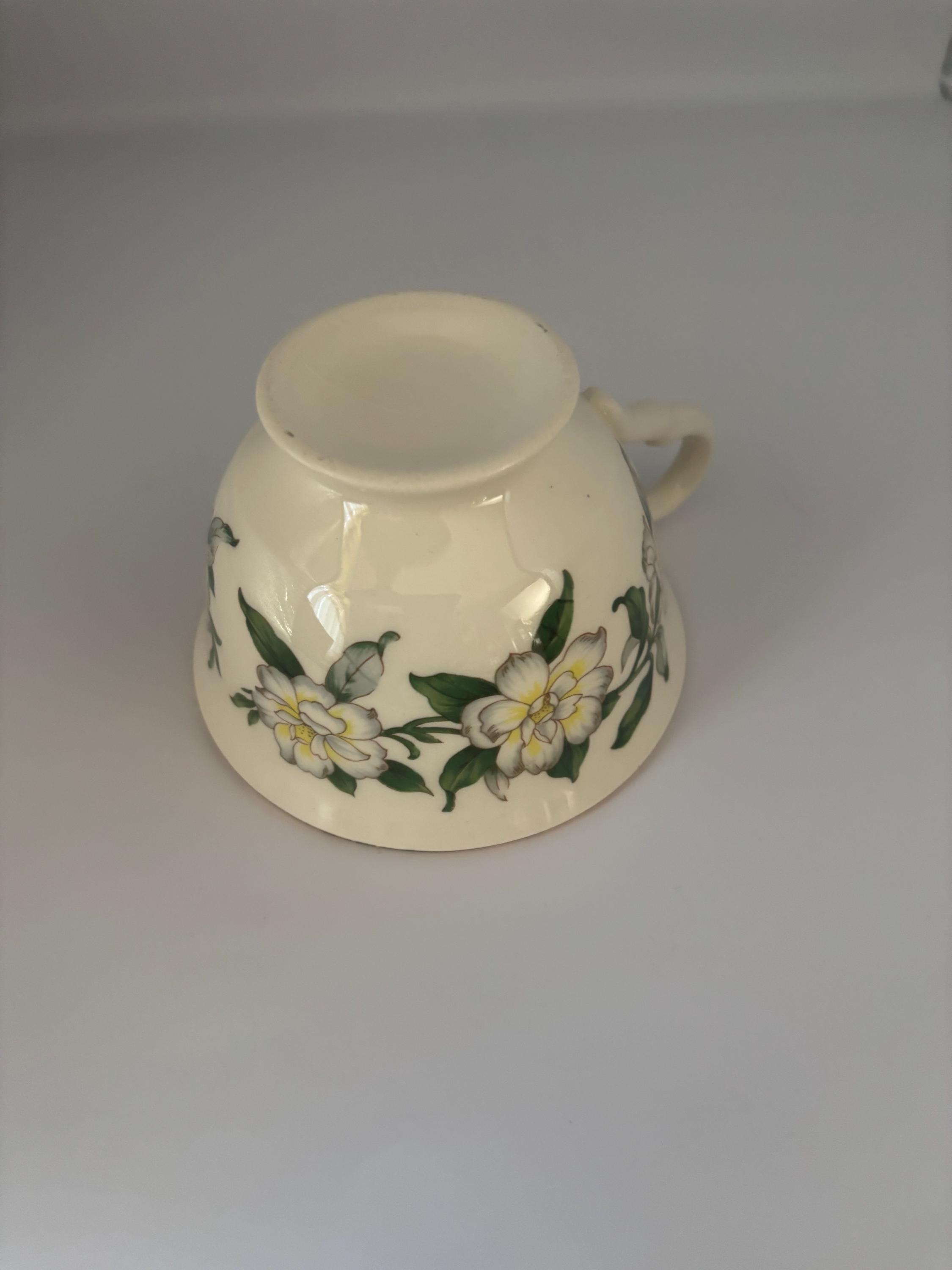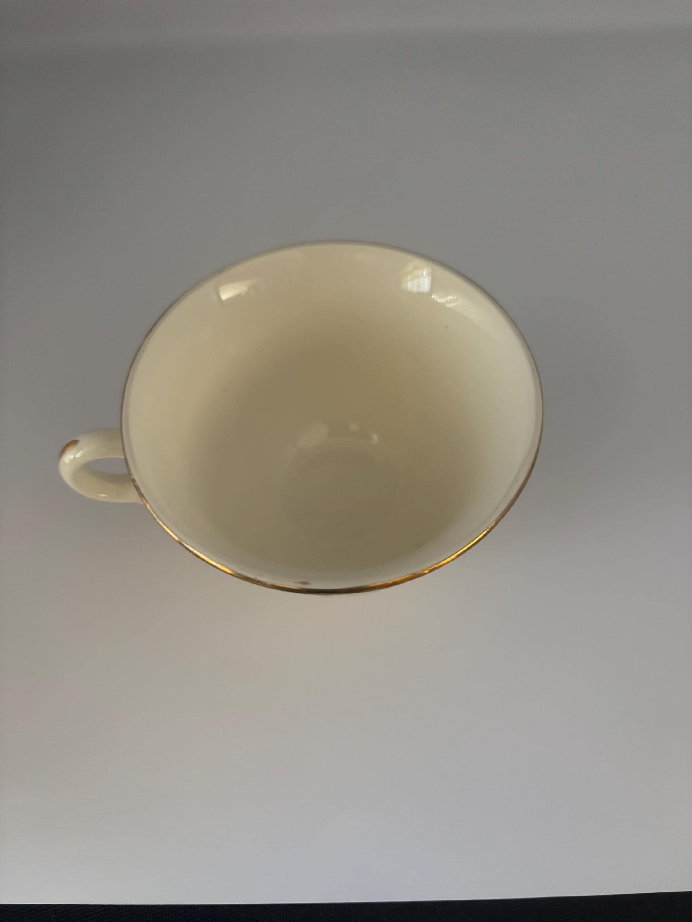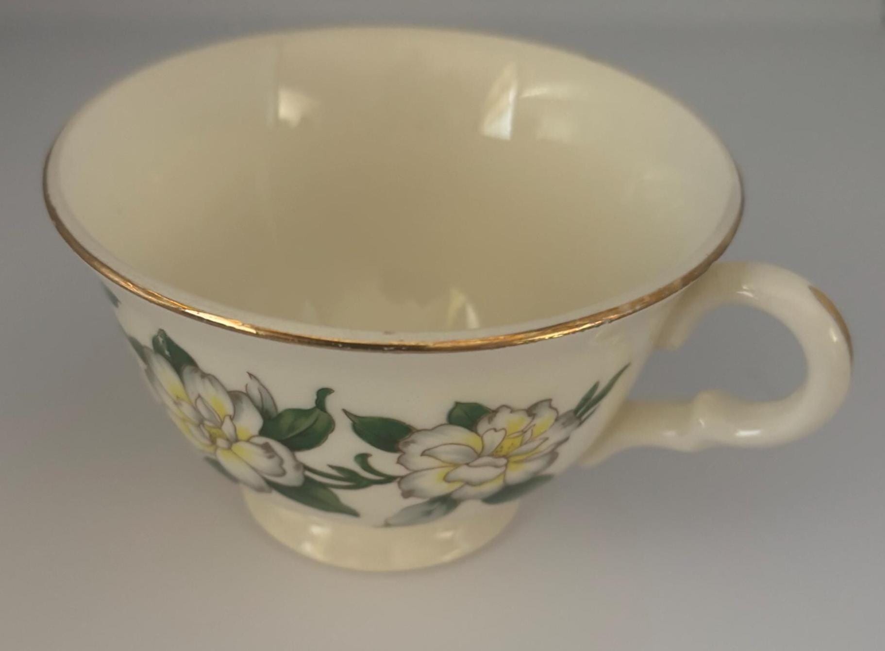 We have a lovely Vintage Homer Laughlin Eggshell Georgian Cotillion Teacup. It has a gorgeous white floral magnolia pattern and gold trim.