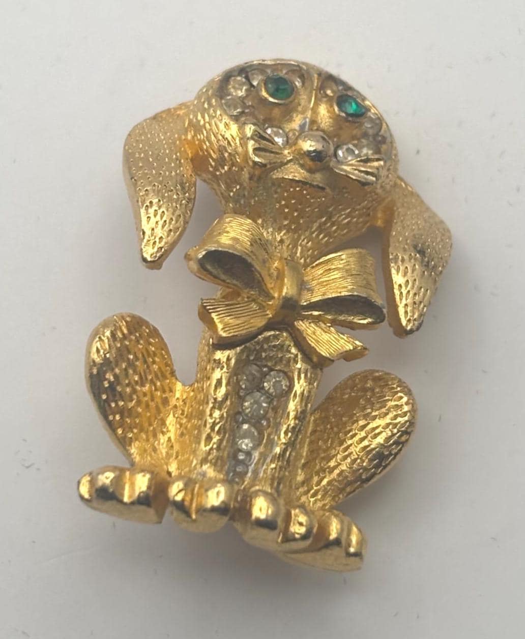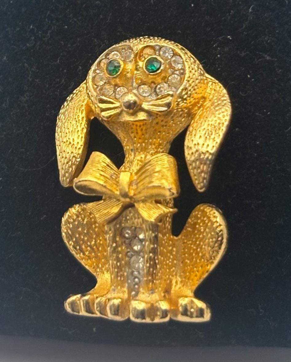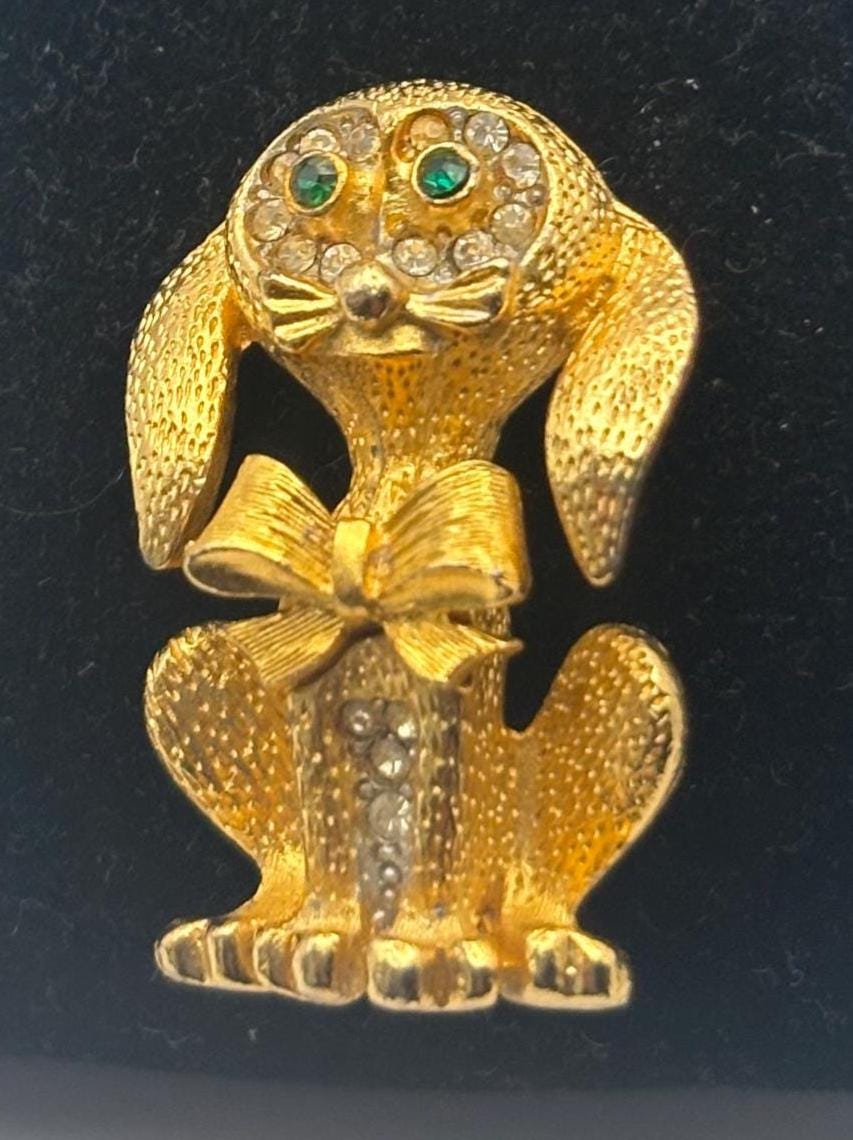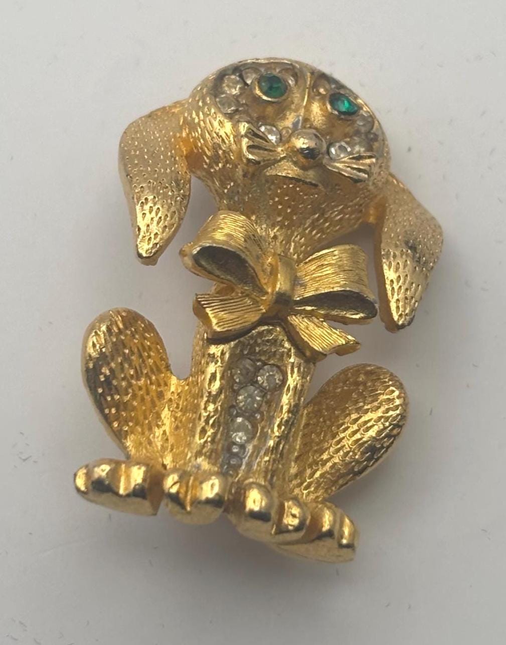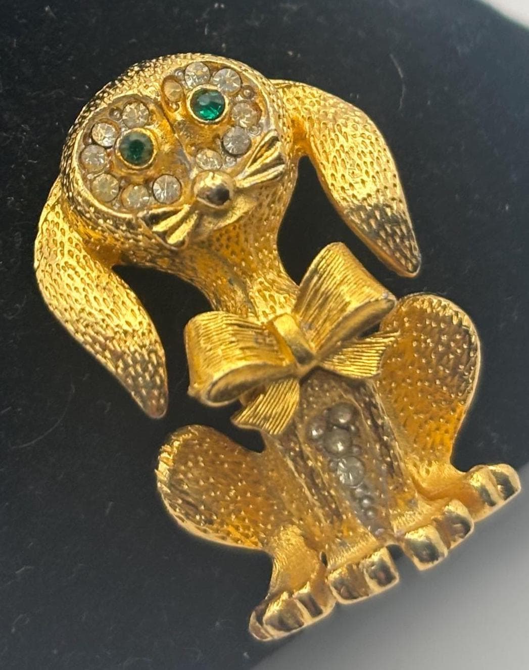 We have a gorgeous Vintage Puppy with Green Rhinestone Eyes Brooch/Pin. It is in beautiful condition. It is signed SAO.