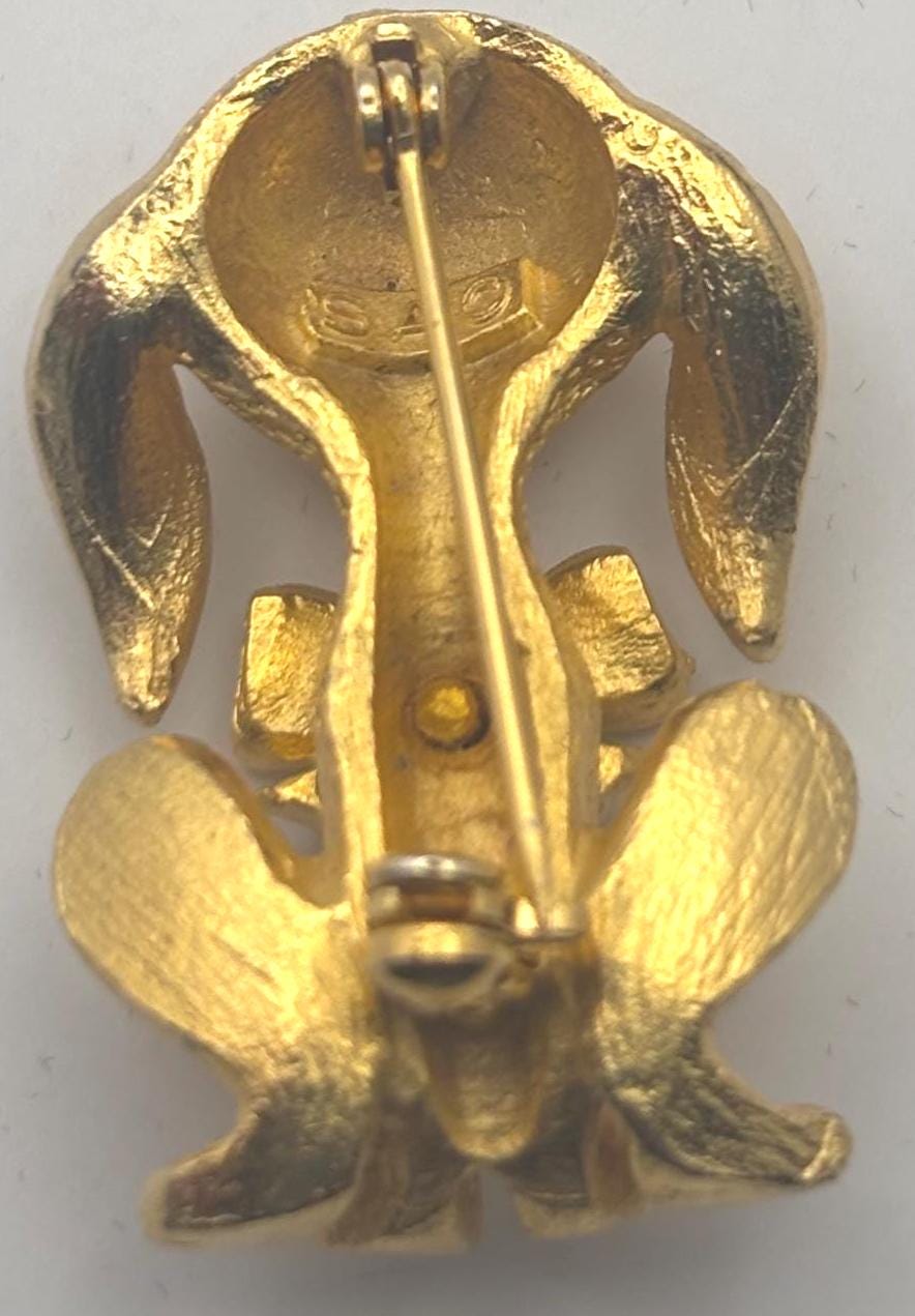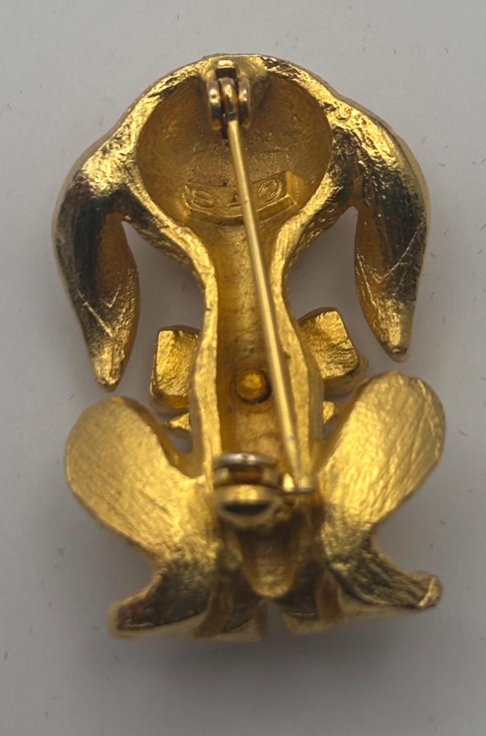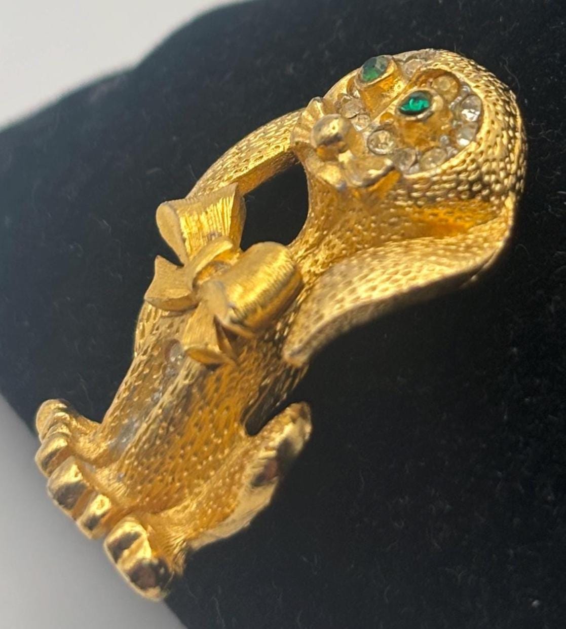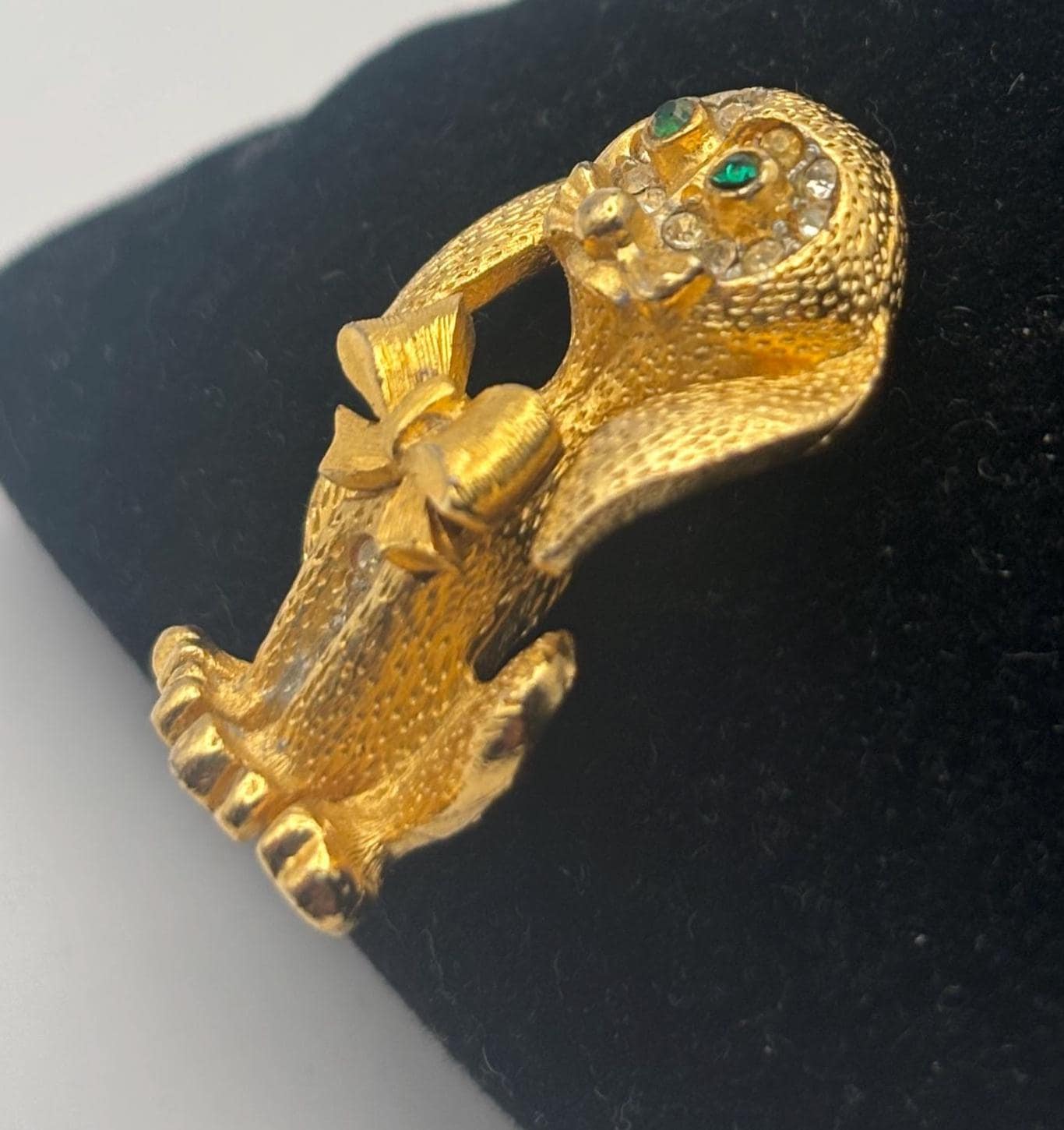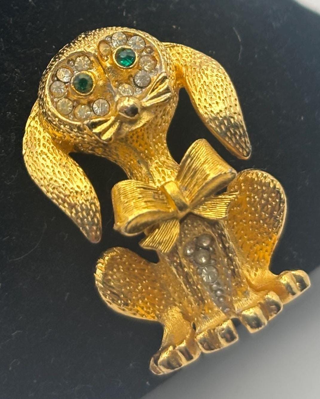 We have a gorgeous Vintage Puppy with Green Rhinestone Eyes Brooch/Pin. It is in beautiful condition. It is signed SAO.