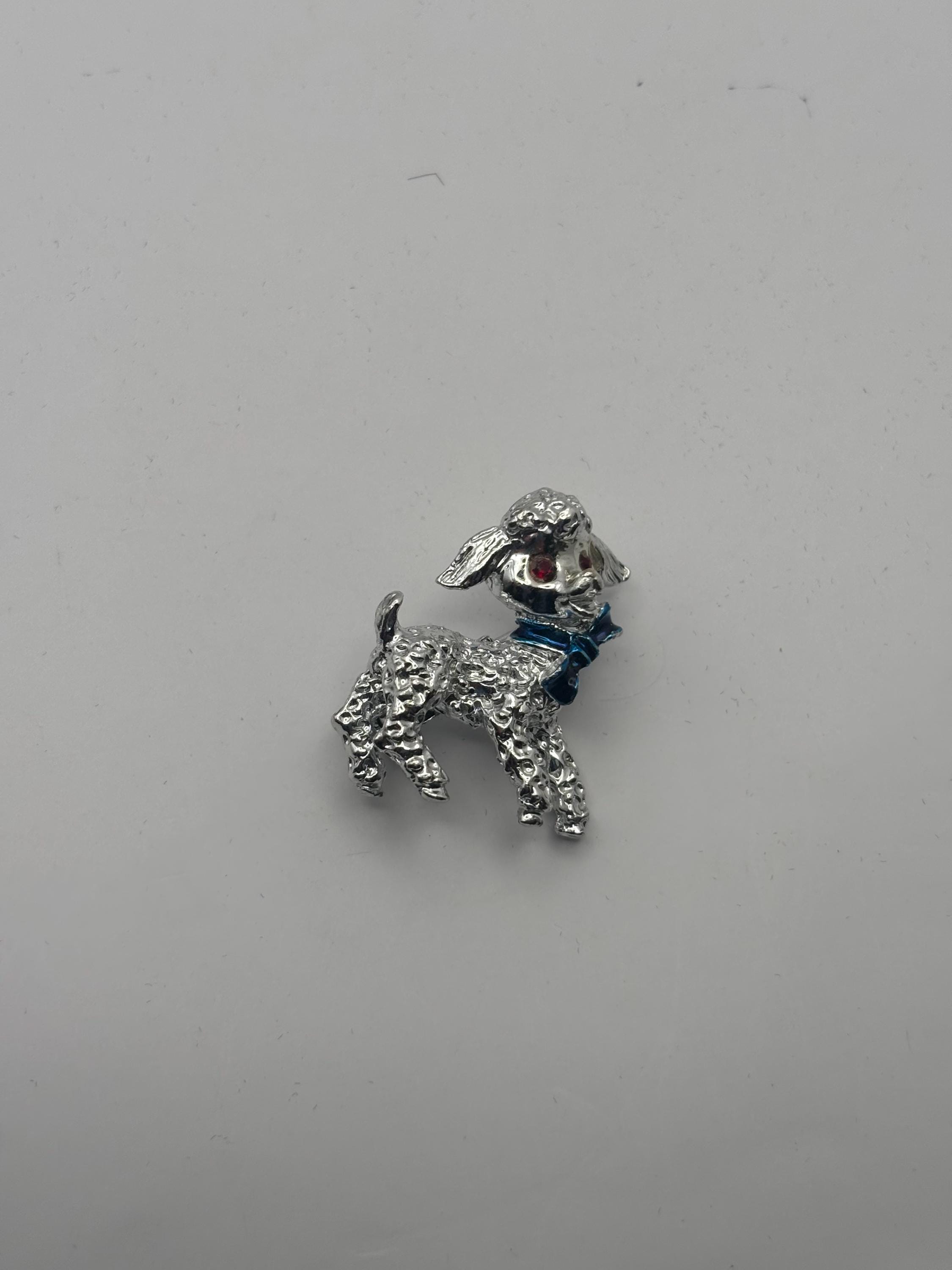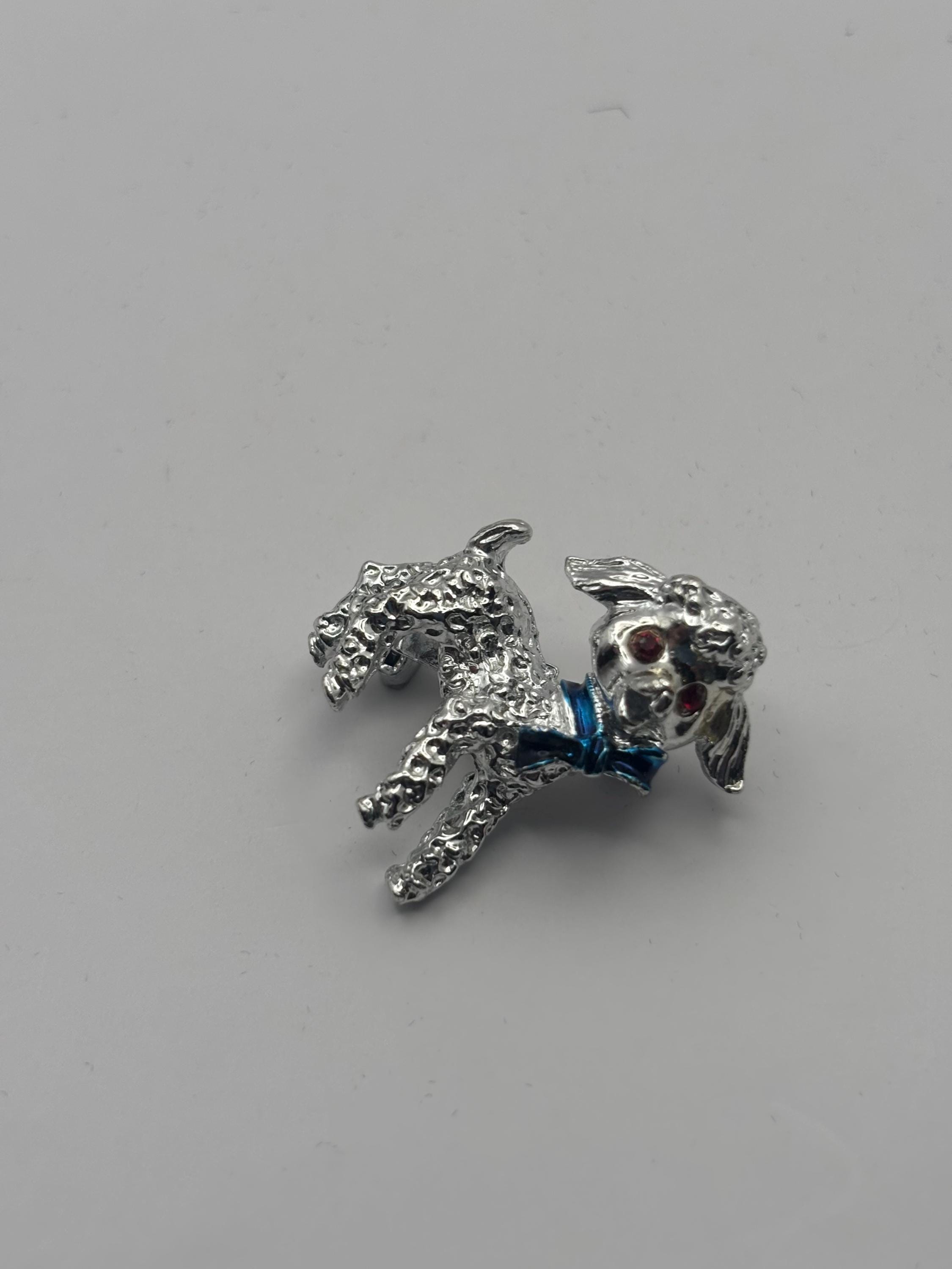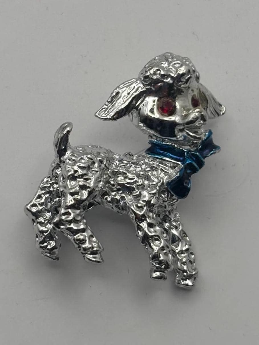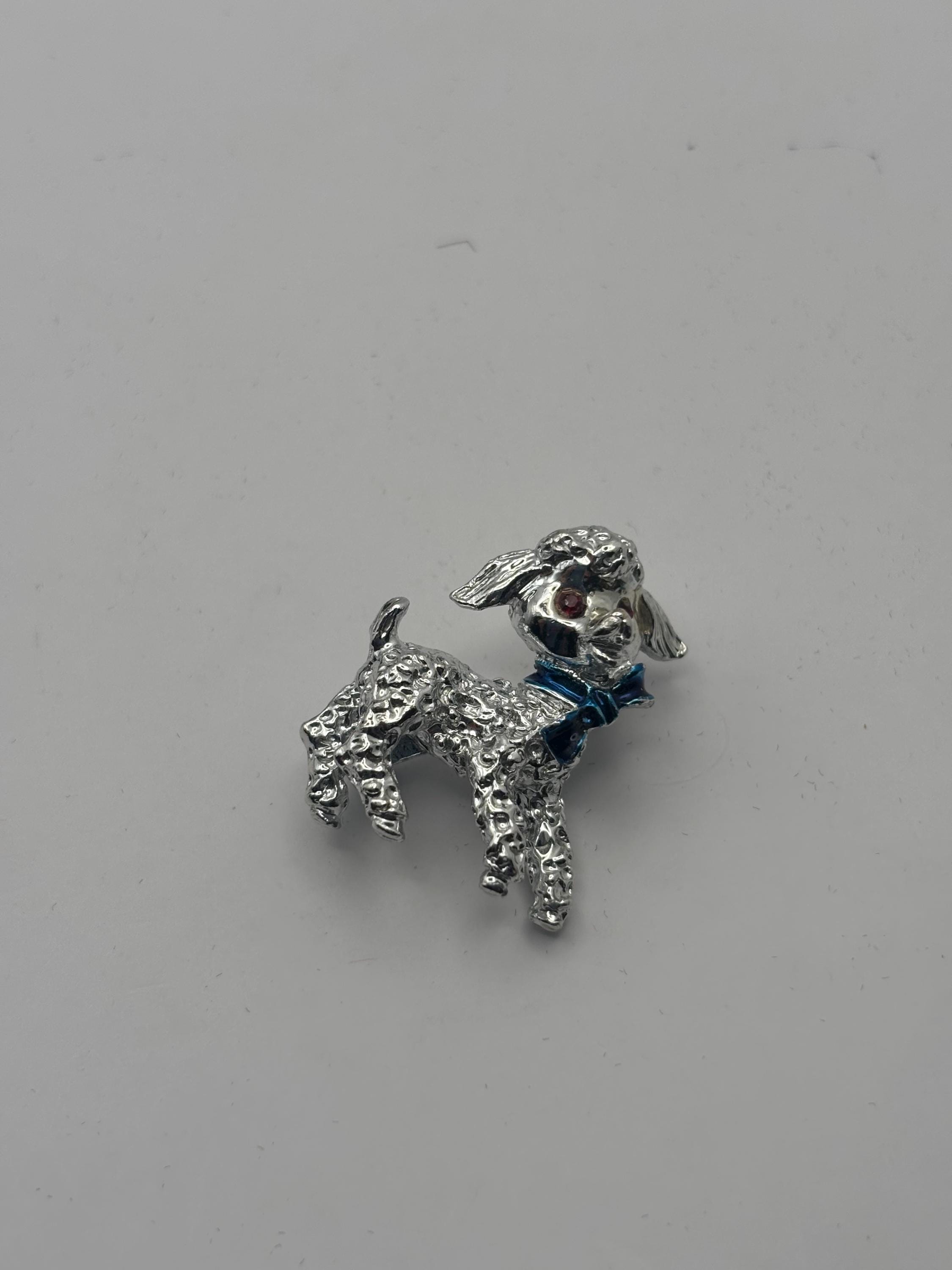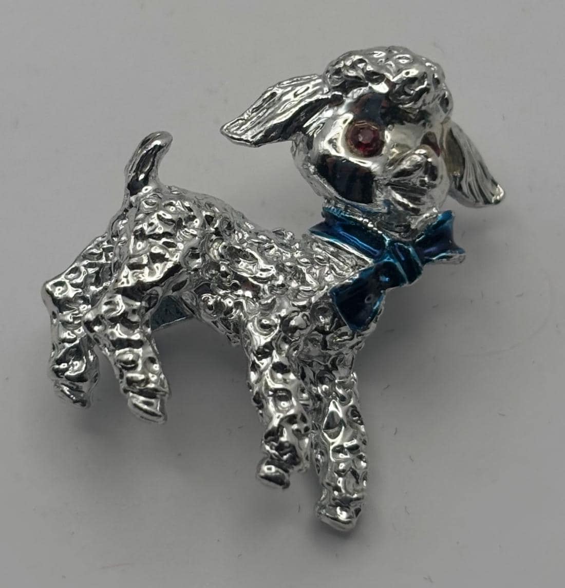 We have a Vintage Silver Lamb Brooch with Red Rhinestone Eyes & Blue Bow. It is in Very Good Condition.