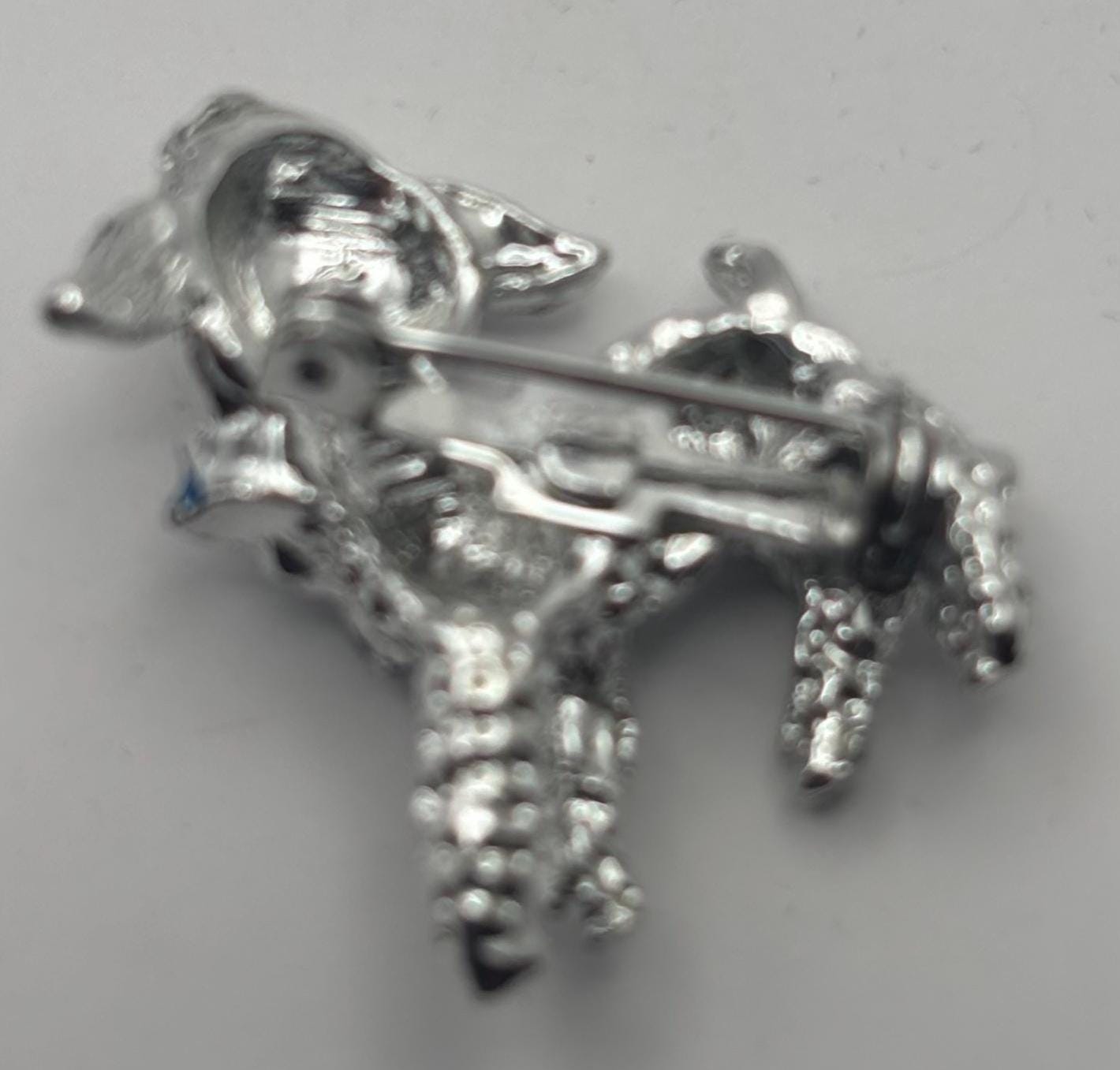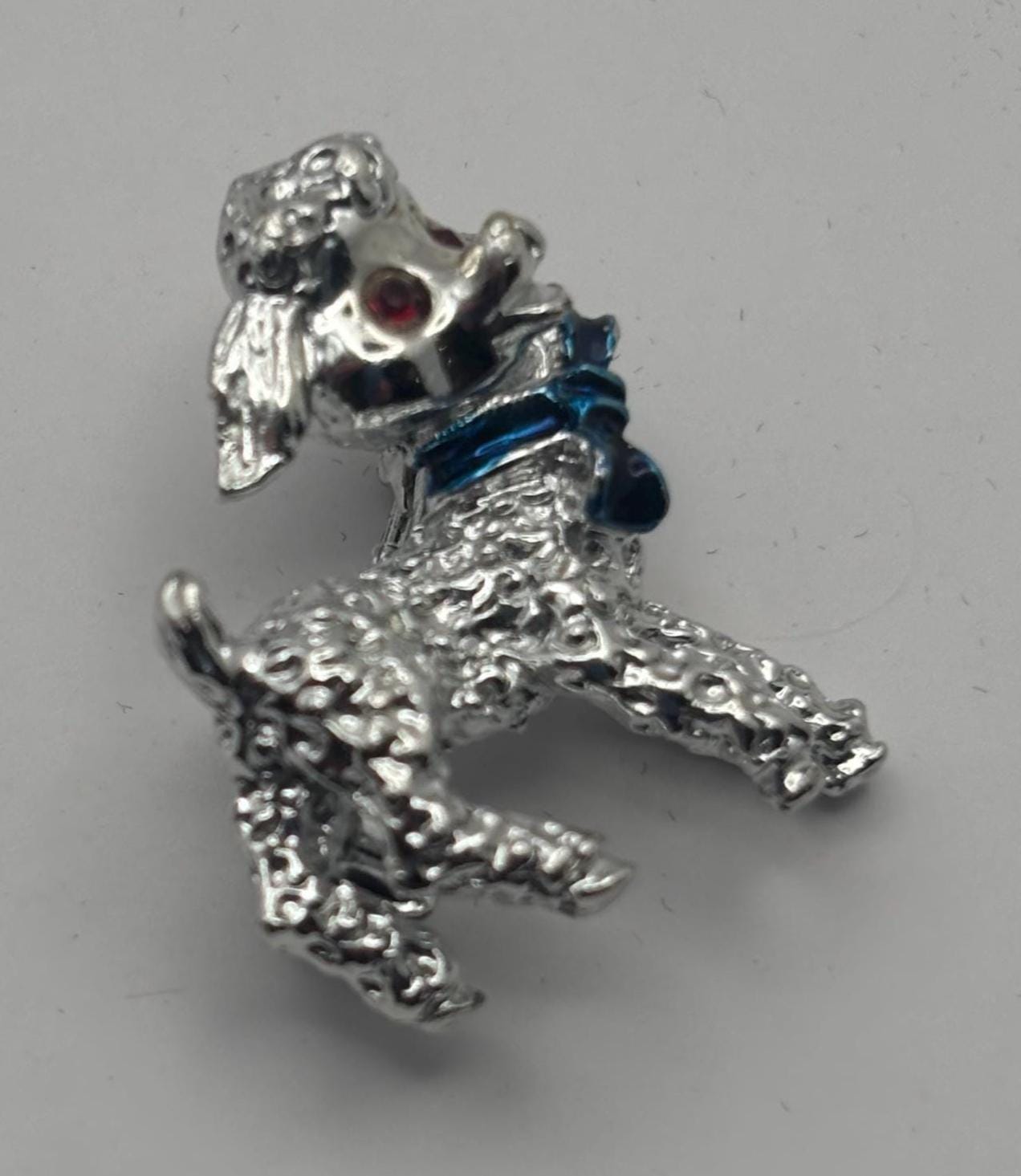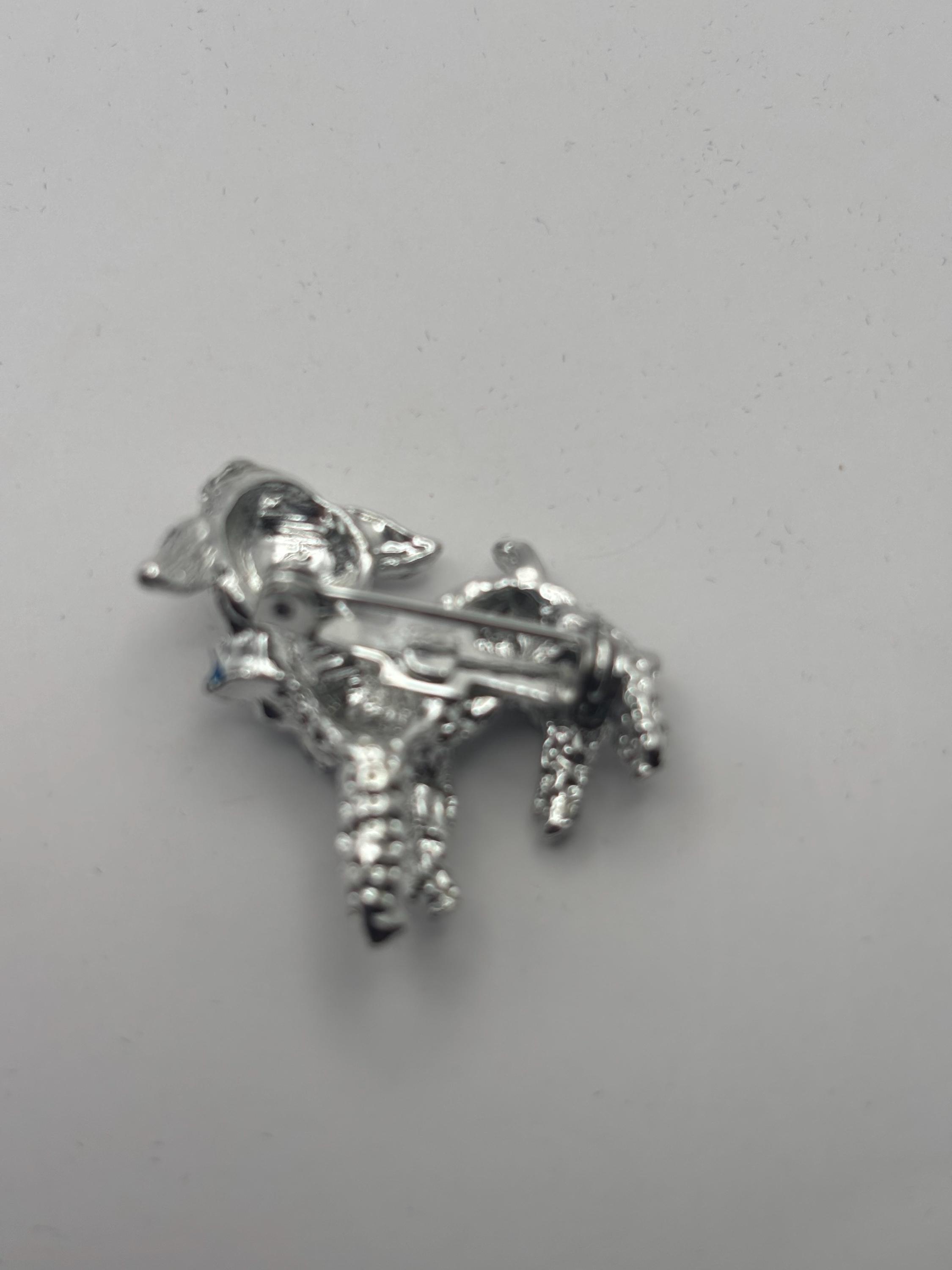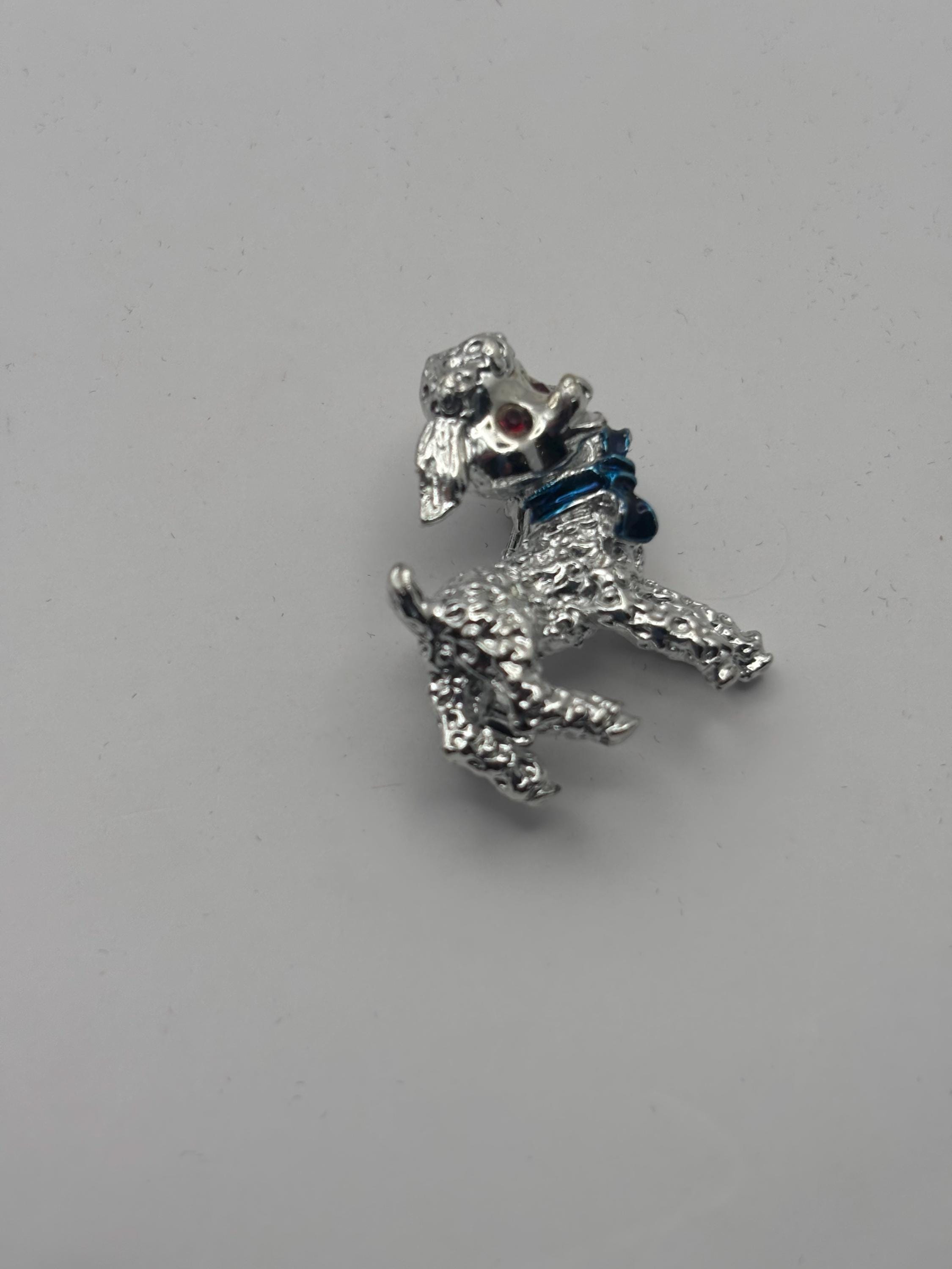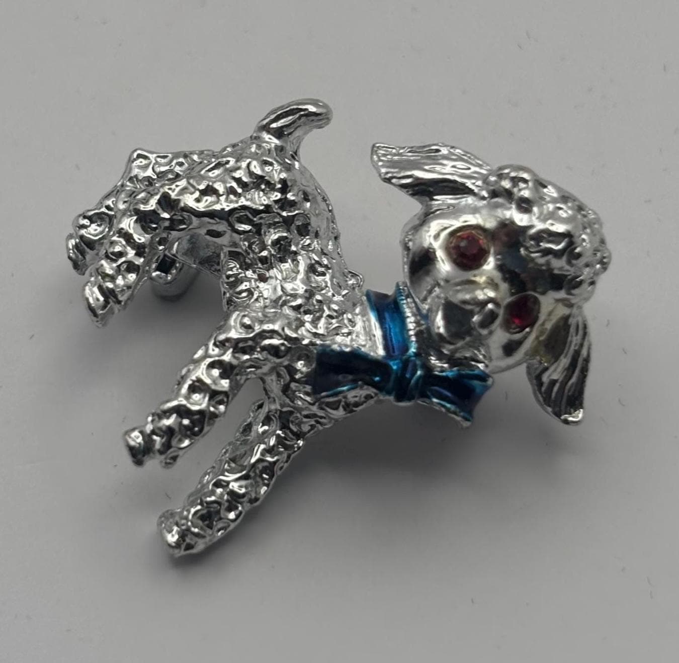 We have a Vintage Silver Lamb Brooch with Red Rhinestone Eyes & Blue Bow. It is in Very Good Condition.