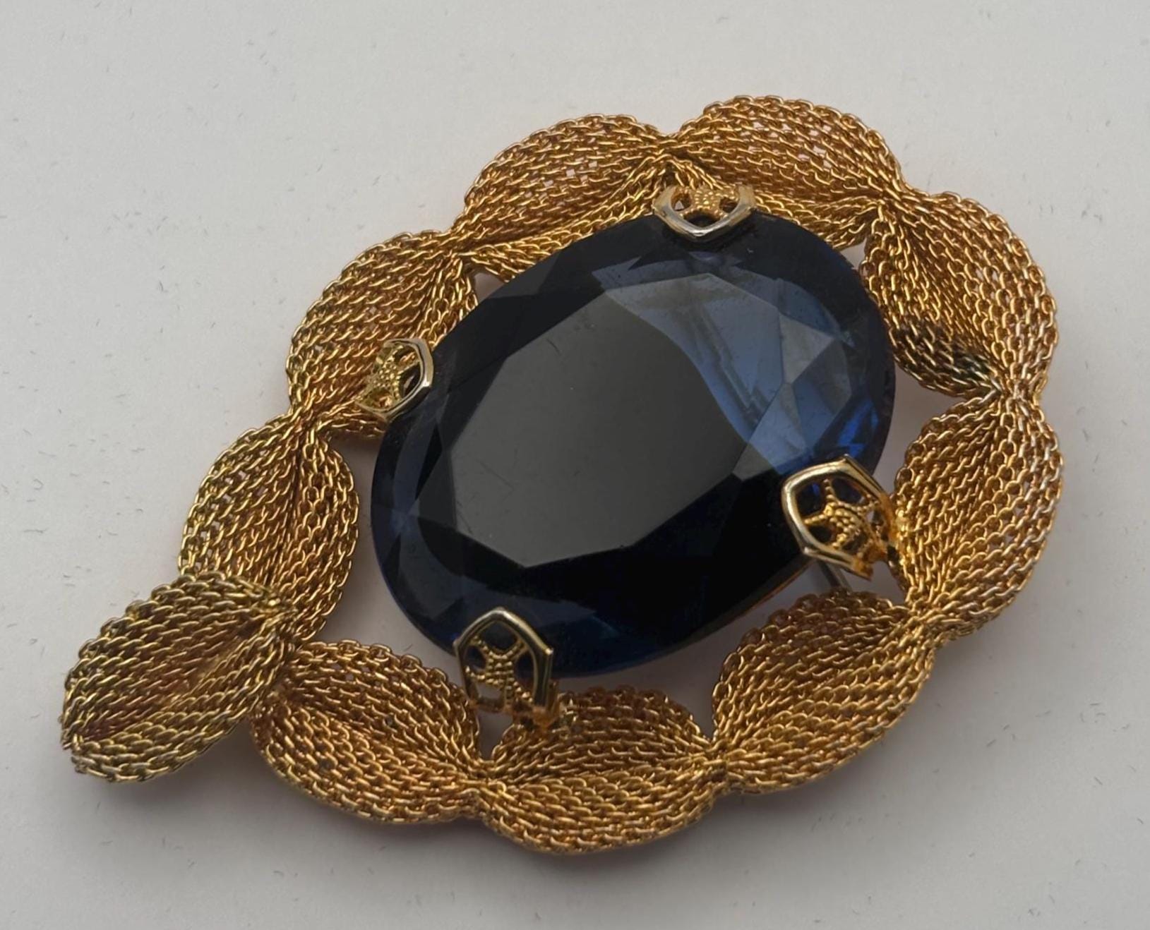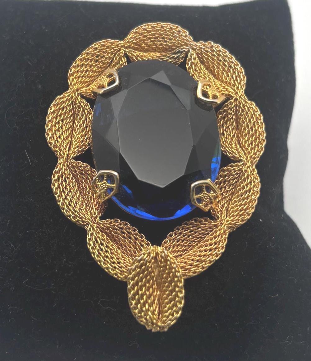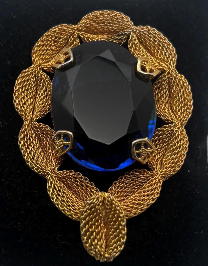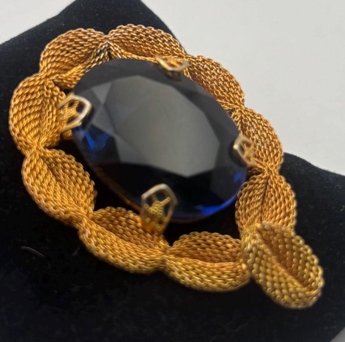 We have a lovely Gold Tone Mesh Brooch with Large Blue Crystal Stone. It is quite lovely and would make a perfect gift.