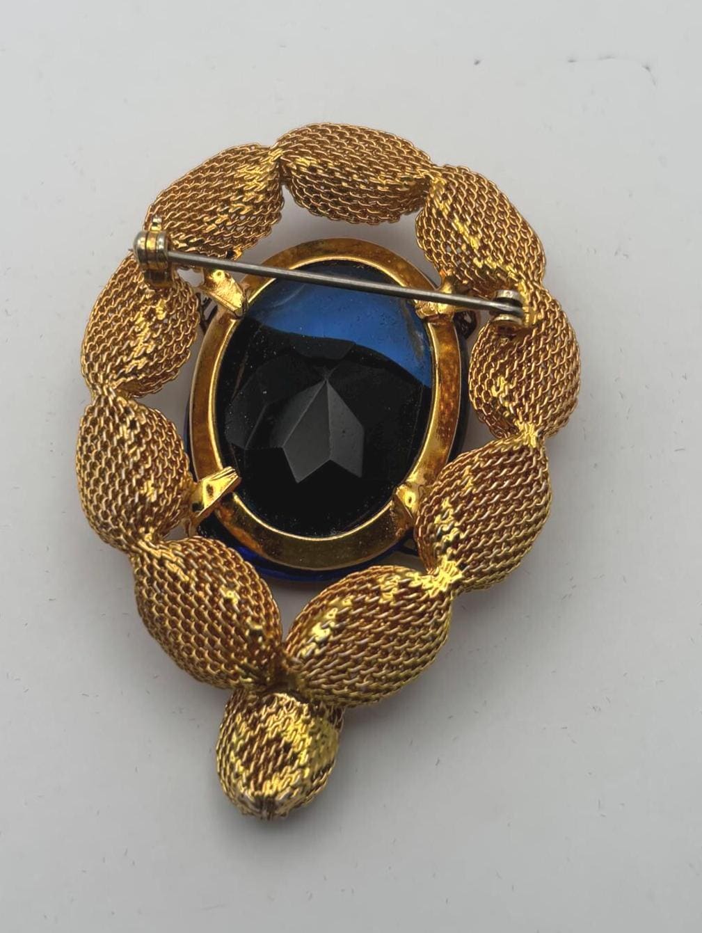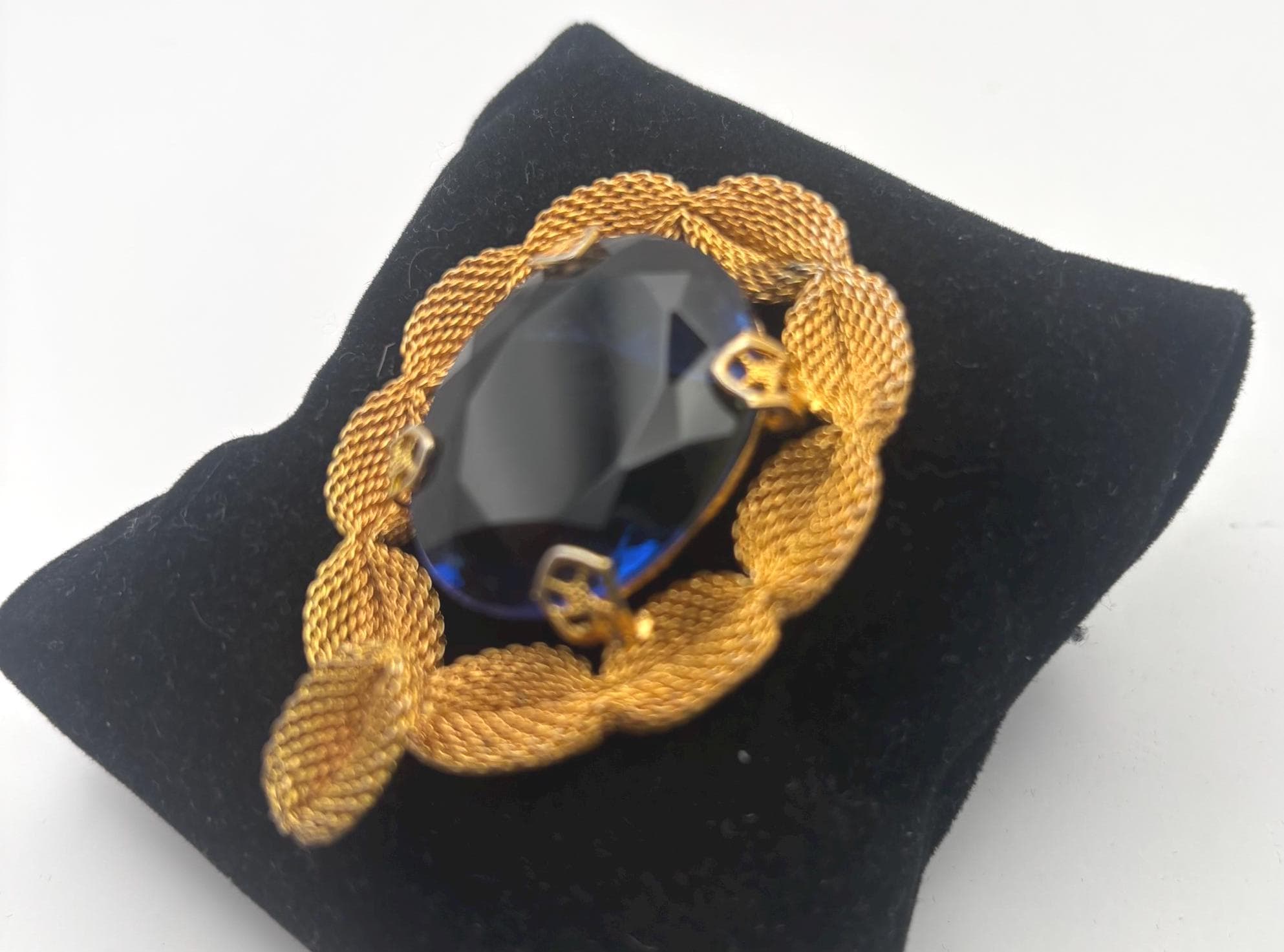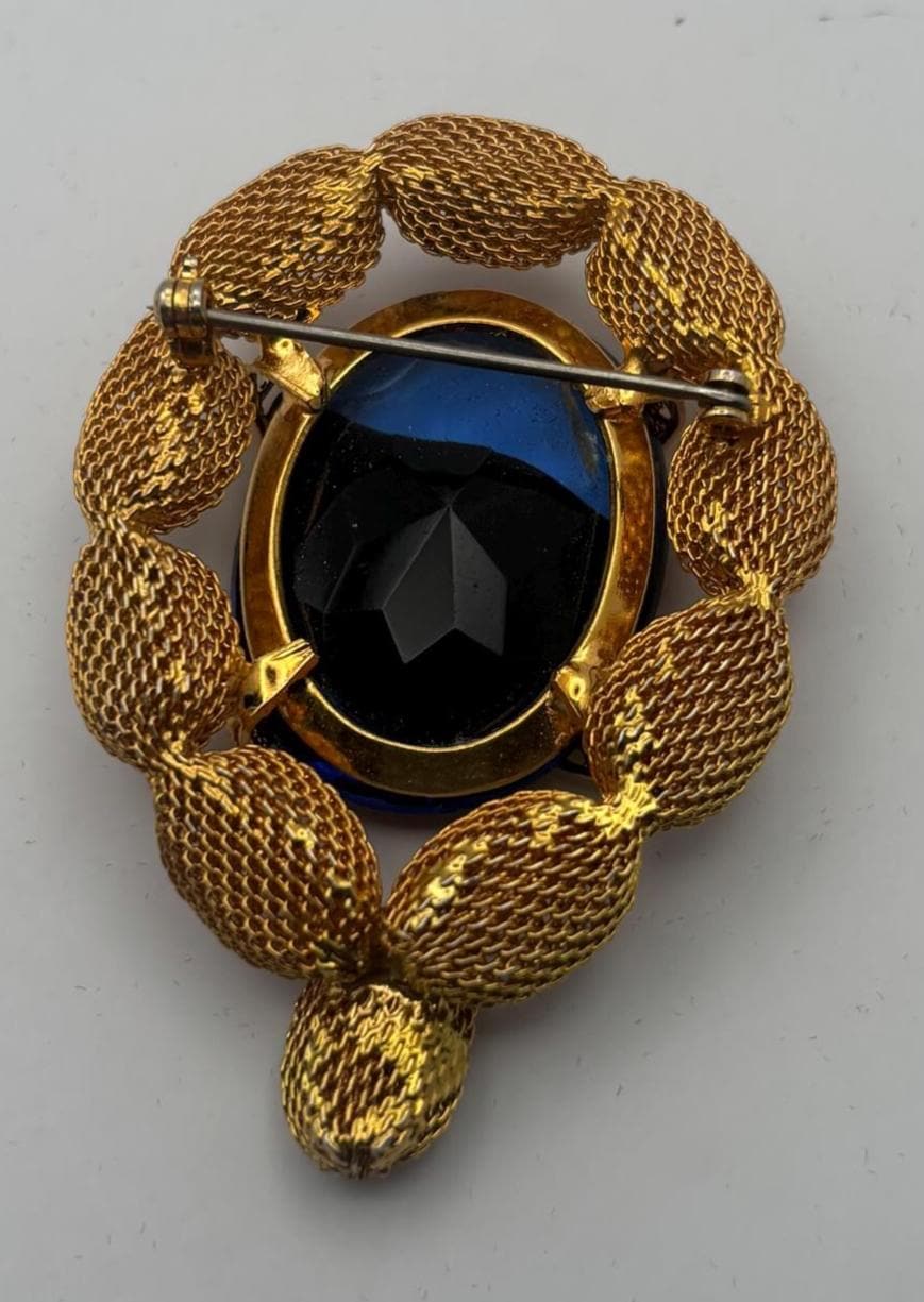 We have a lovely Gold Tone Mesh Brooch with Large Blue Crystal Stone. It is quite lovely and would make a perfect gift.