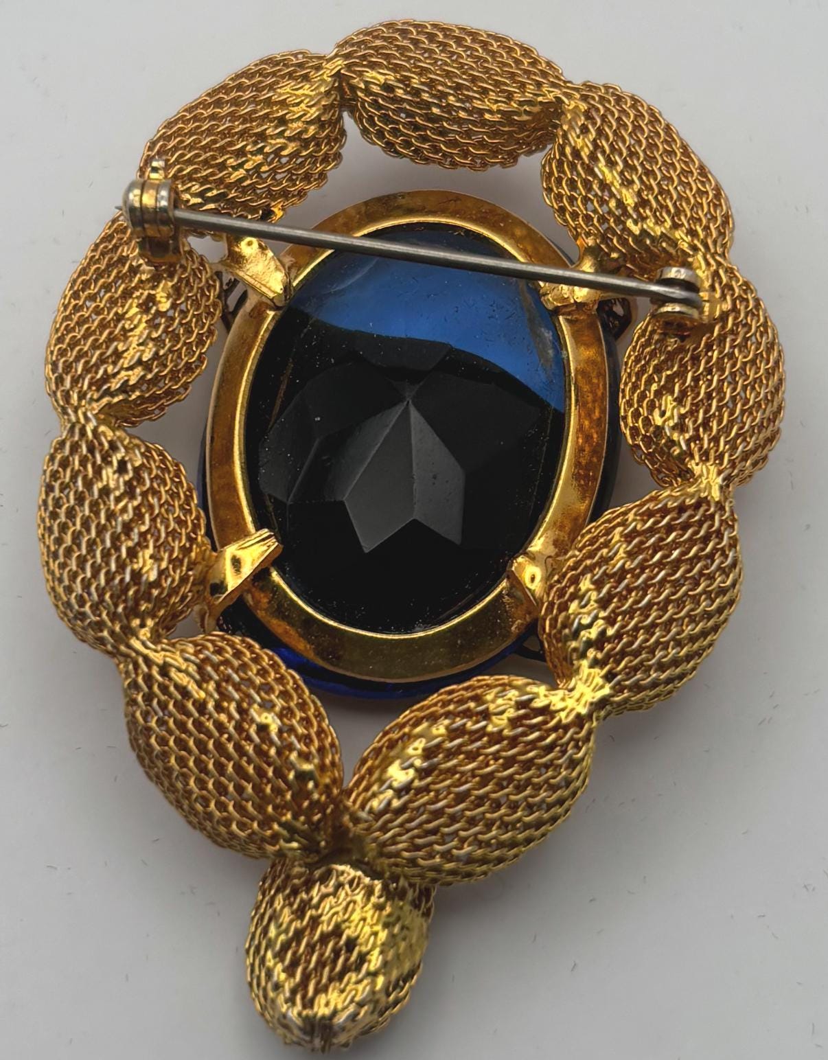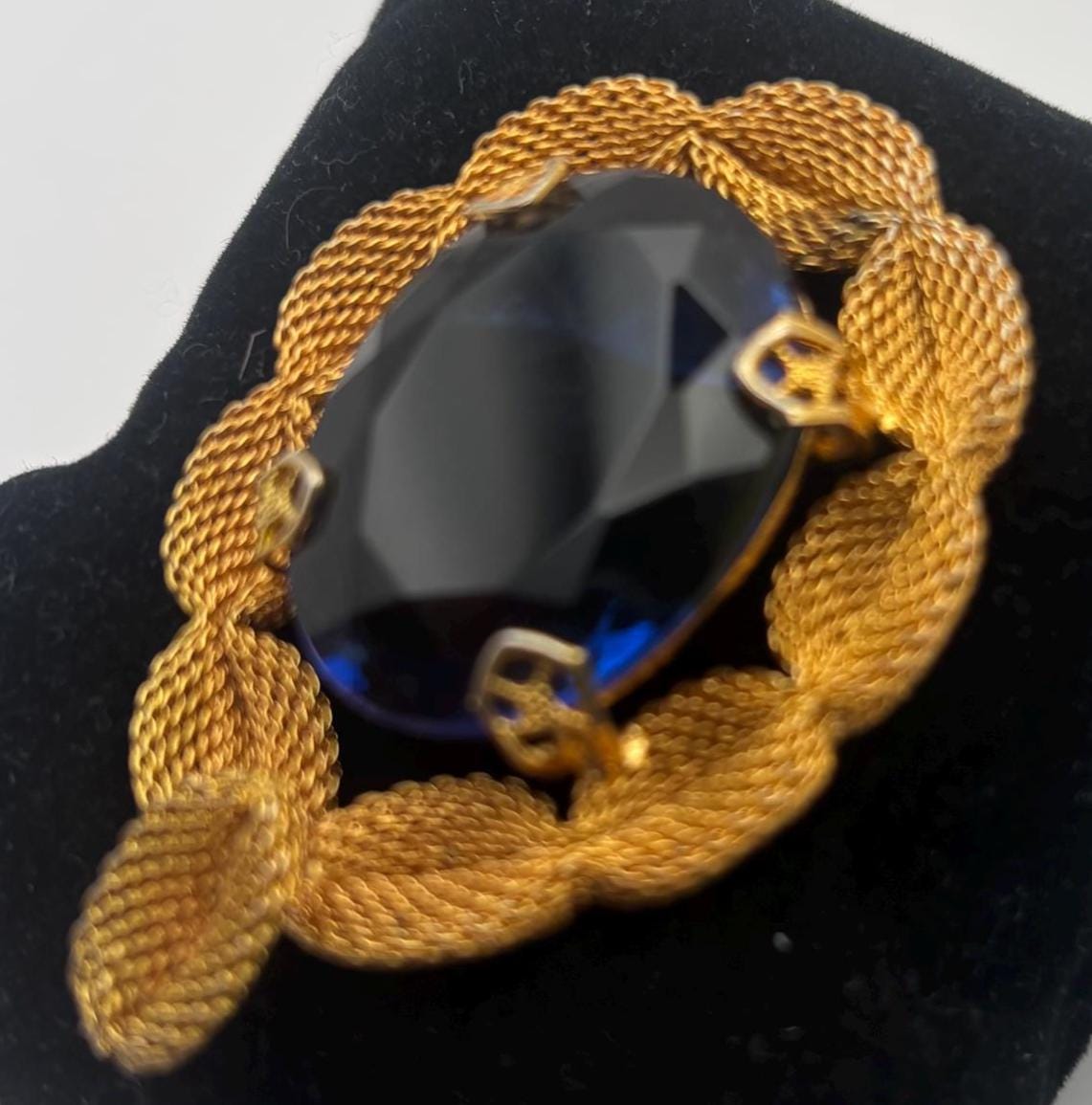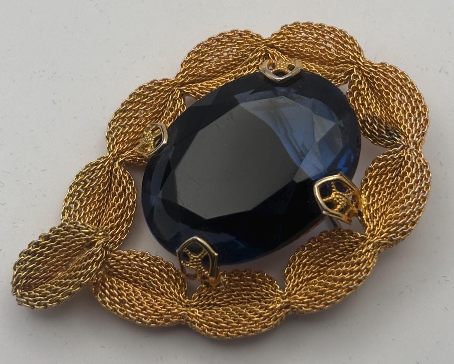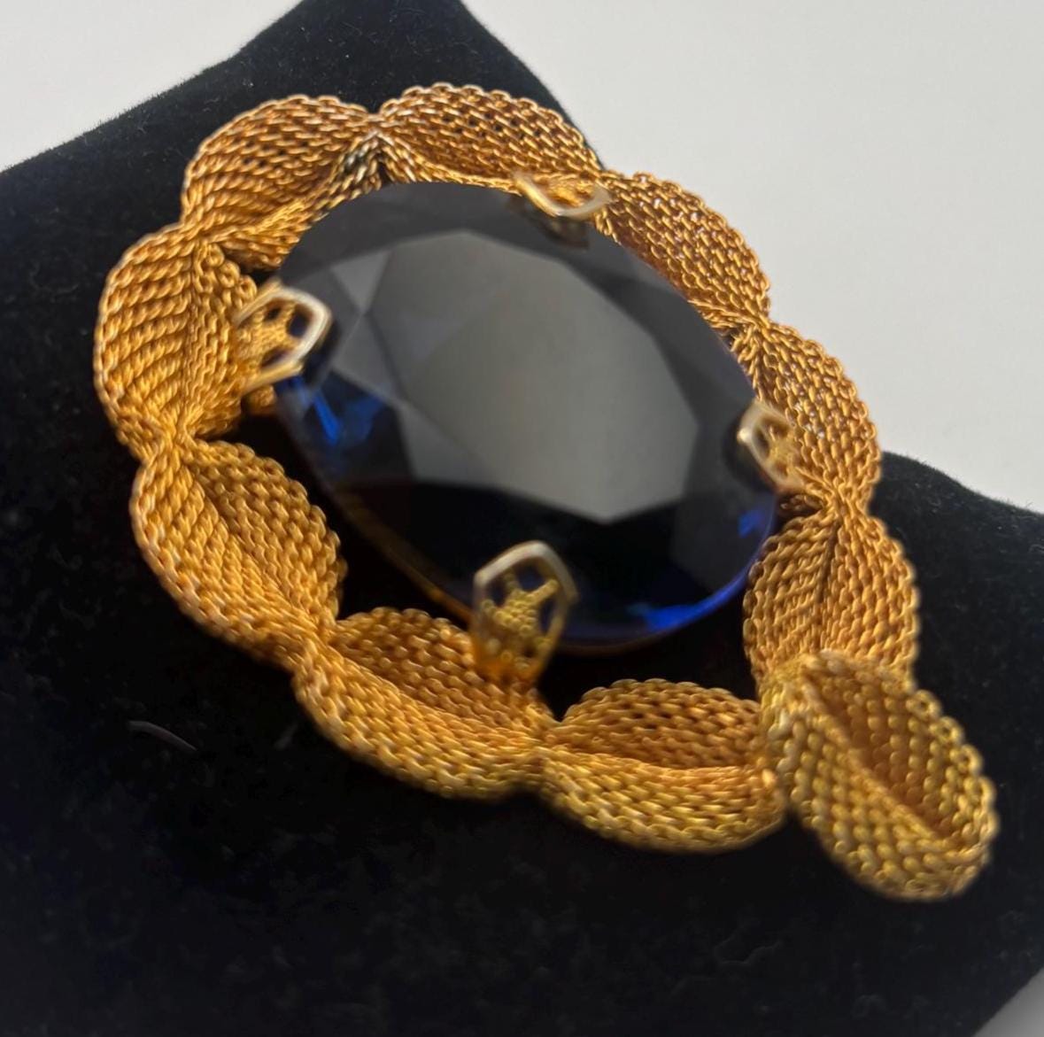 We have a lovely Gold Tone Mesh Brooch with Large Blue Crystal Stone. It is quite lovely and would make a perfect gift.