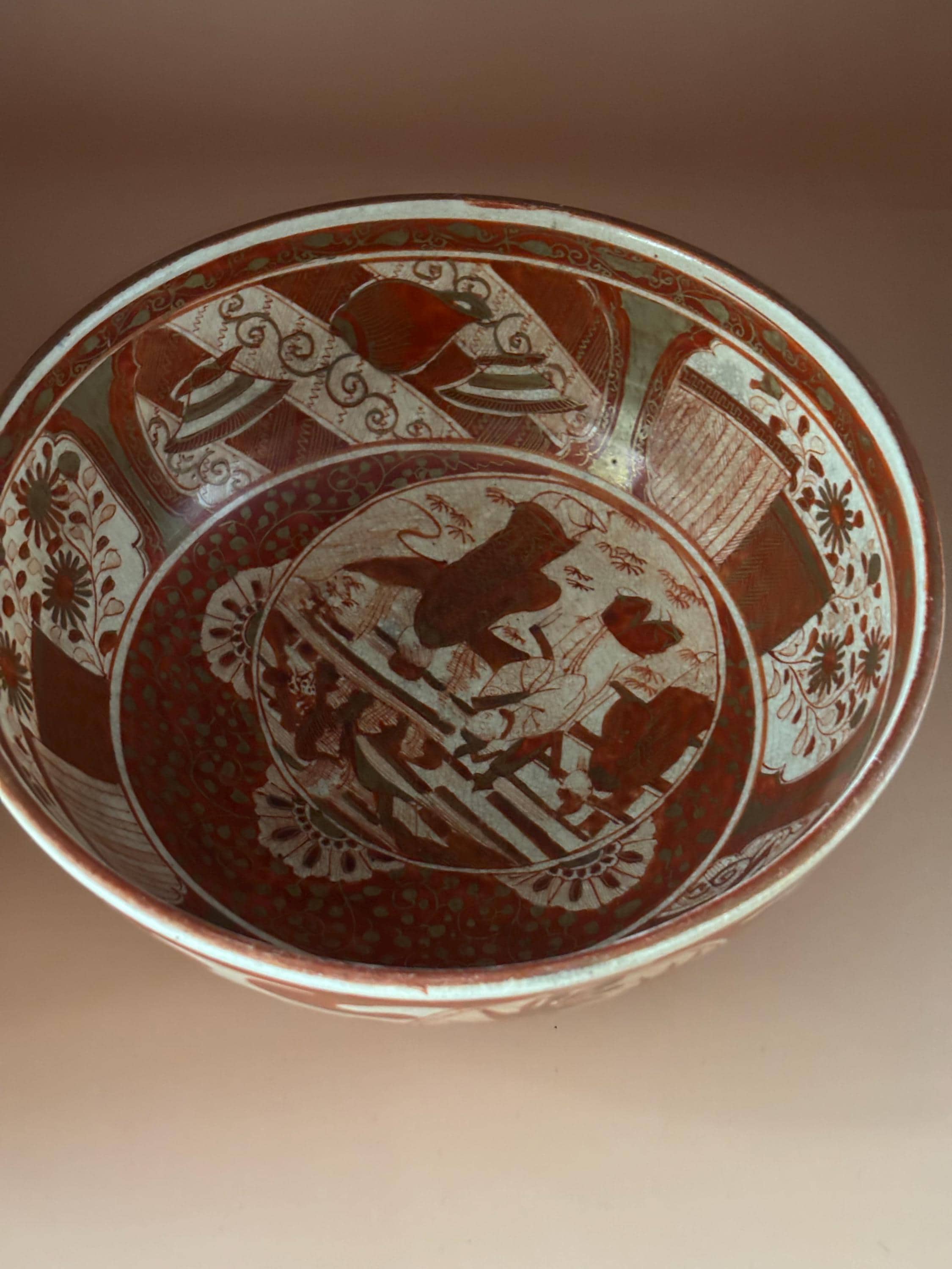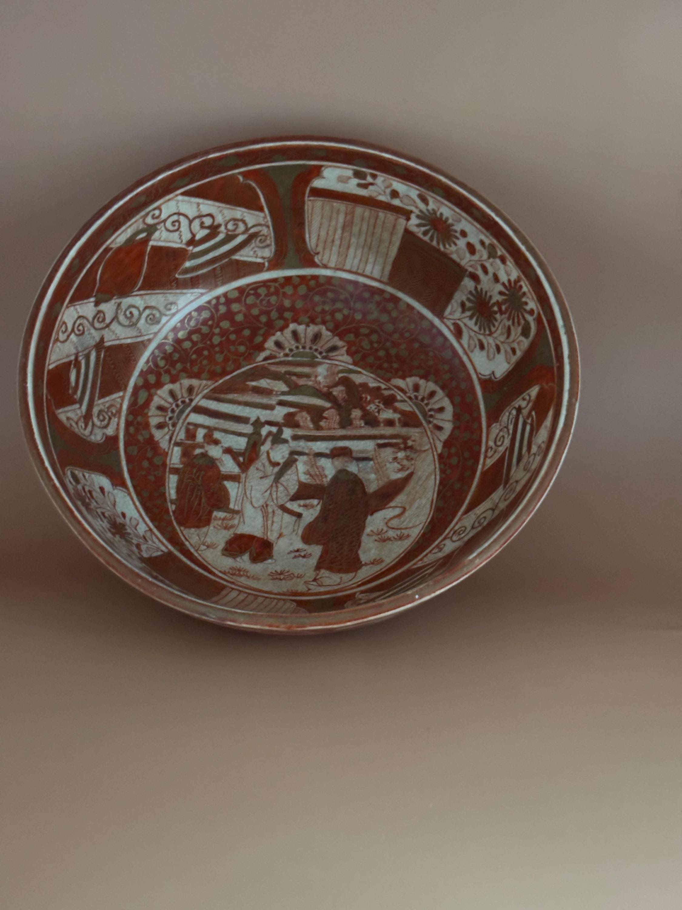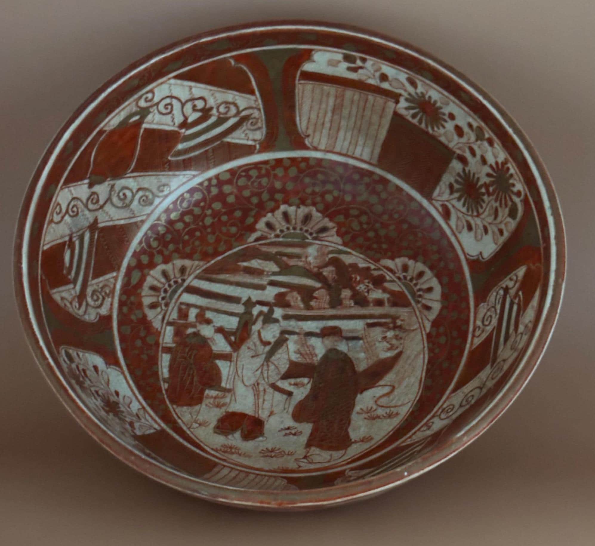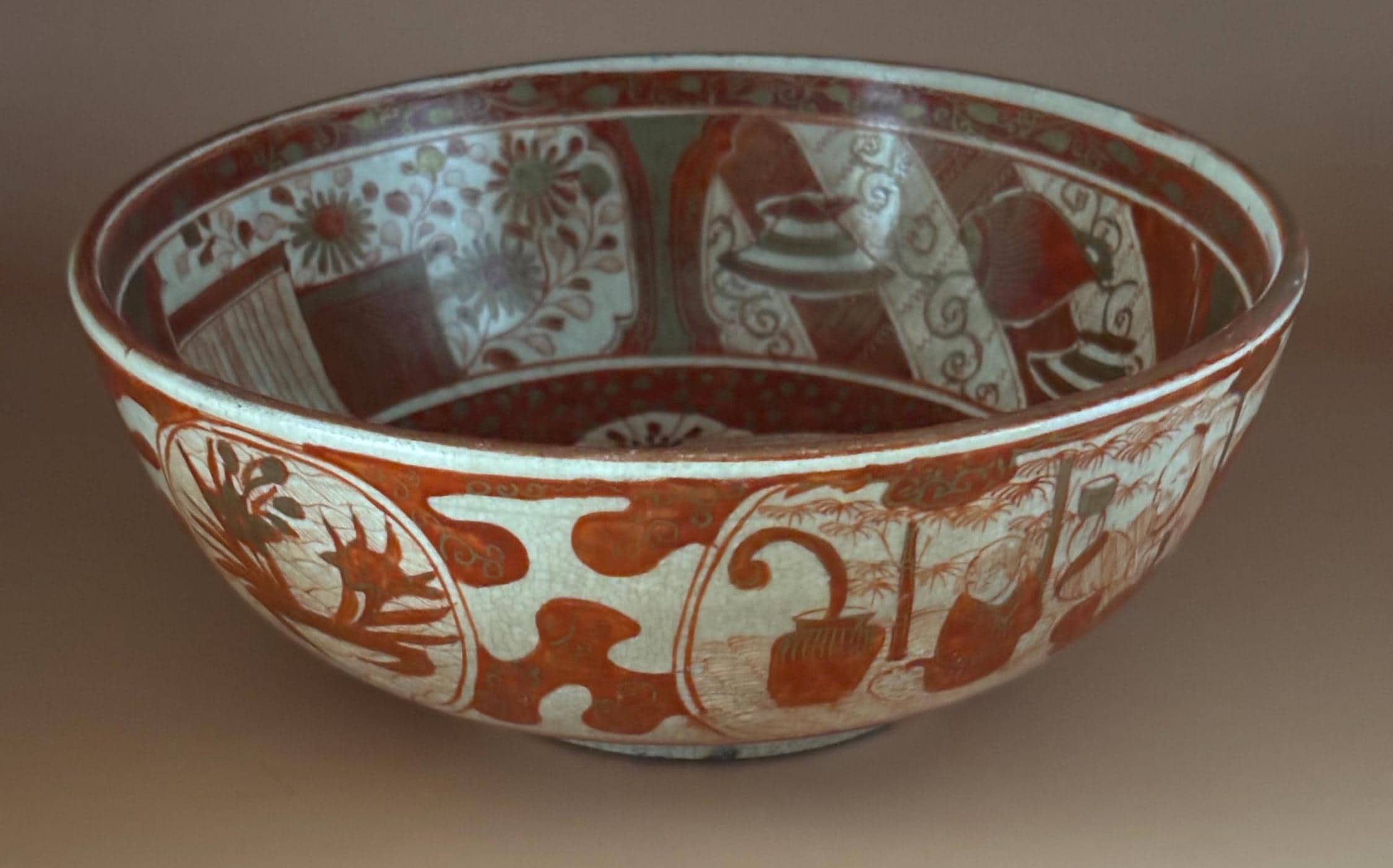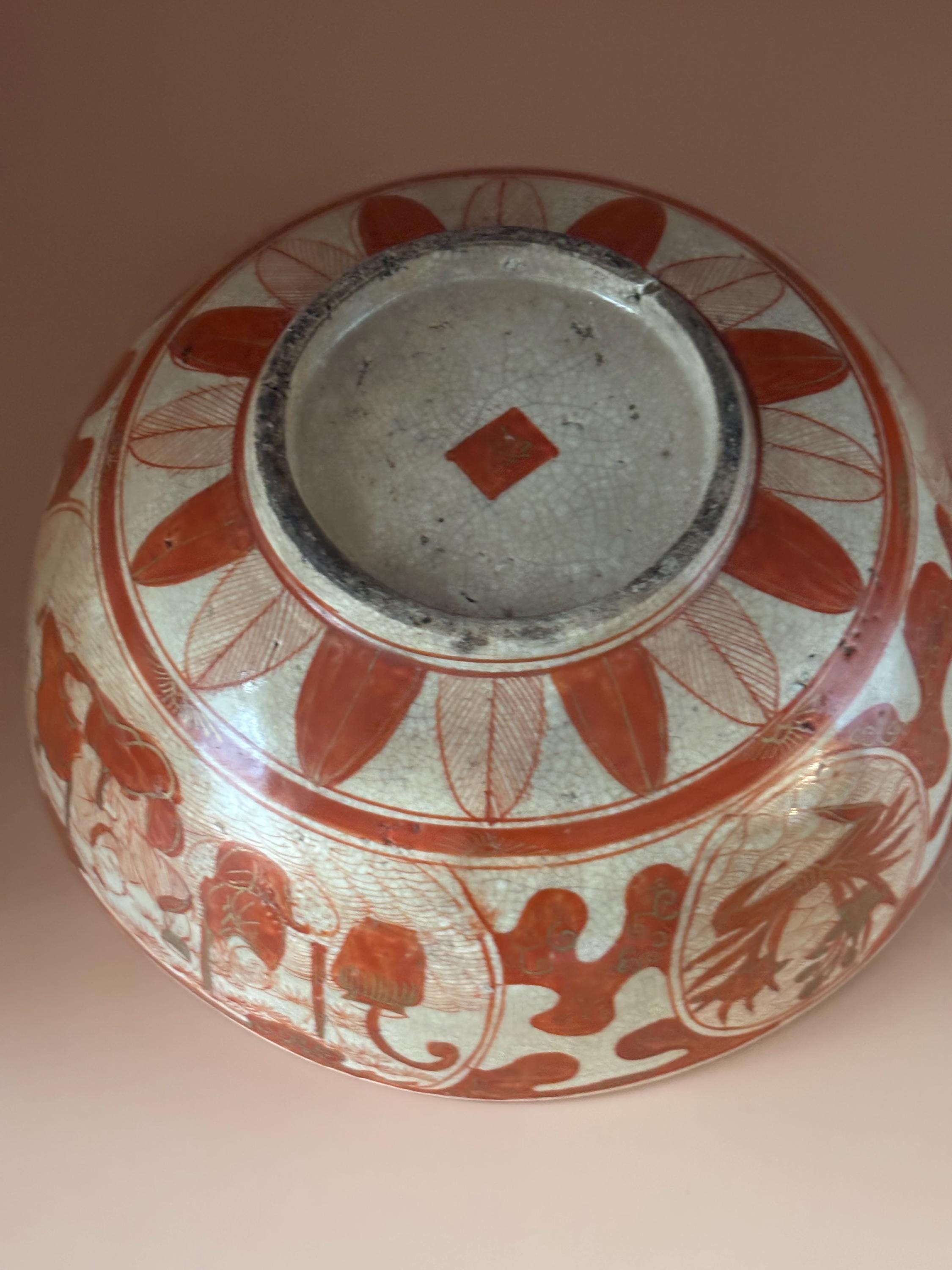 Kutani ware is produced in the souther part of Ishikawa Prefecture, Japan. It originated in the early Edo period, around 370 years ago. The style is known for its use of striking, vivid over-glaze painting. The red square mark in the center of the foot ring is a signature or kiln mark.
