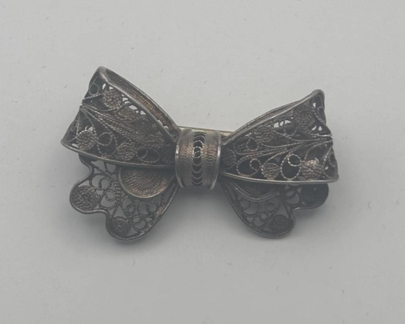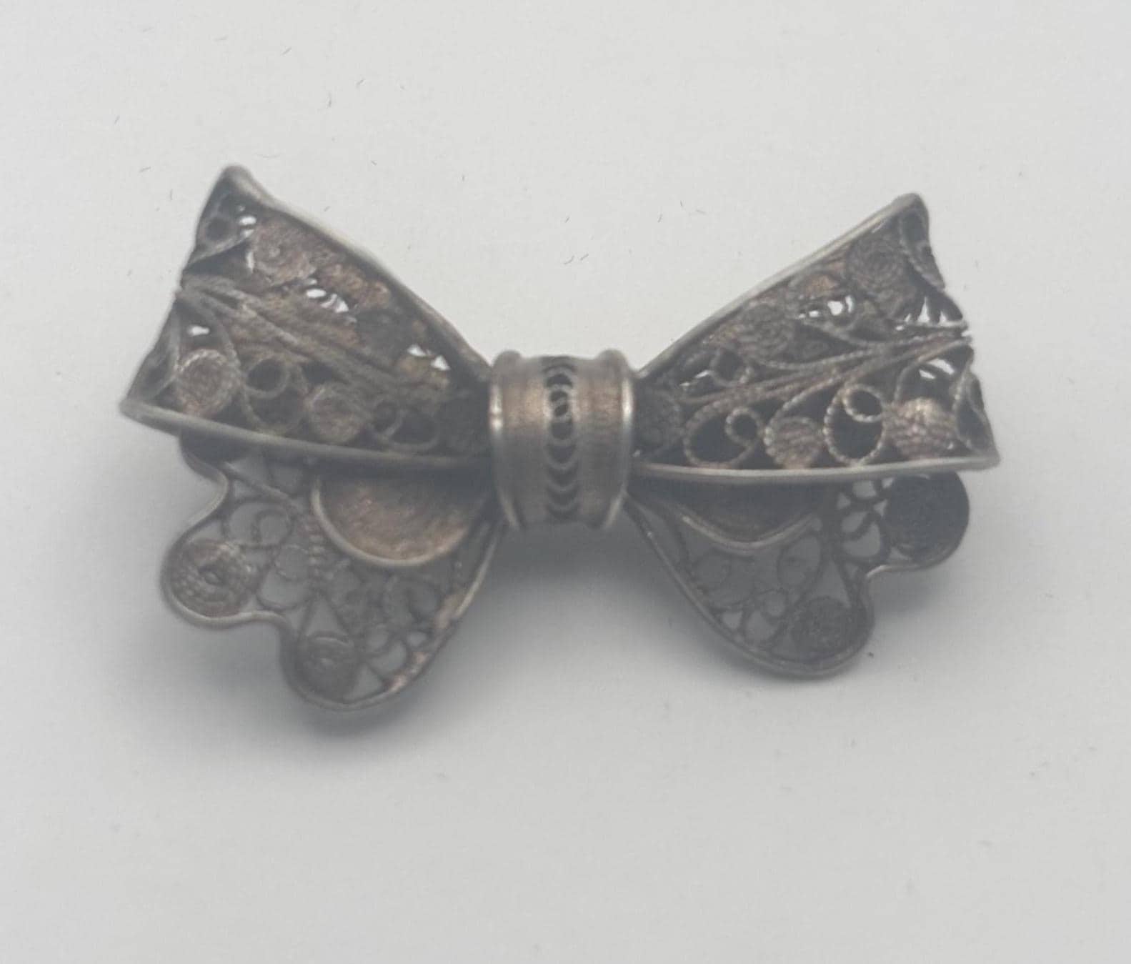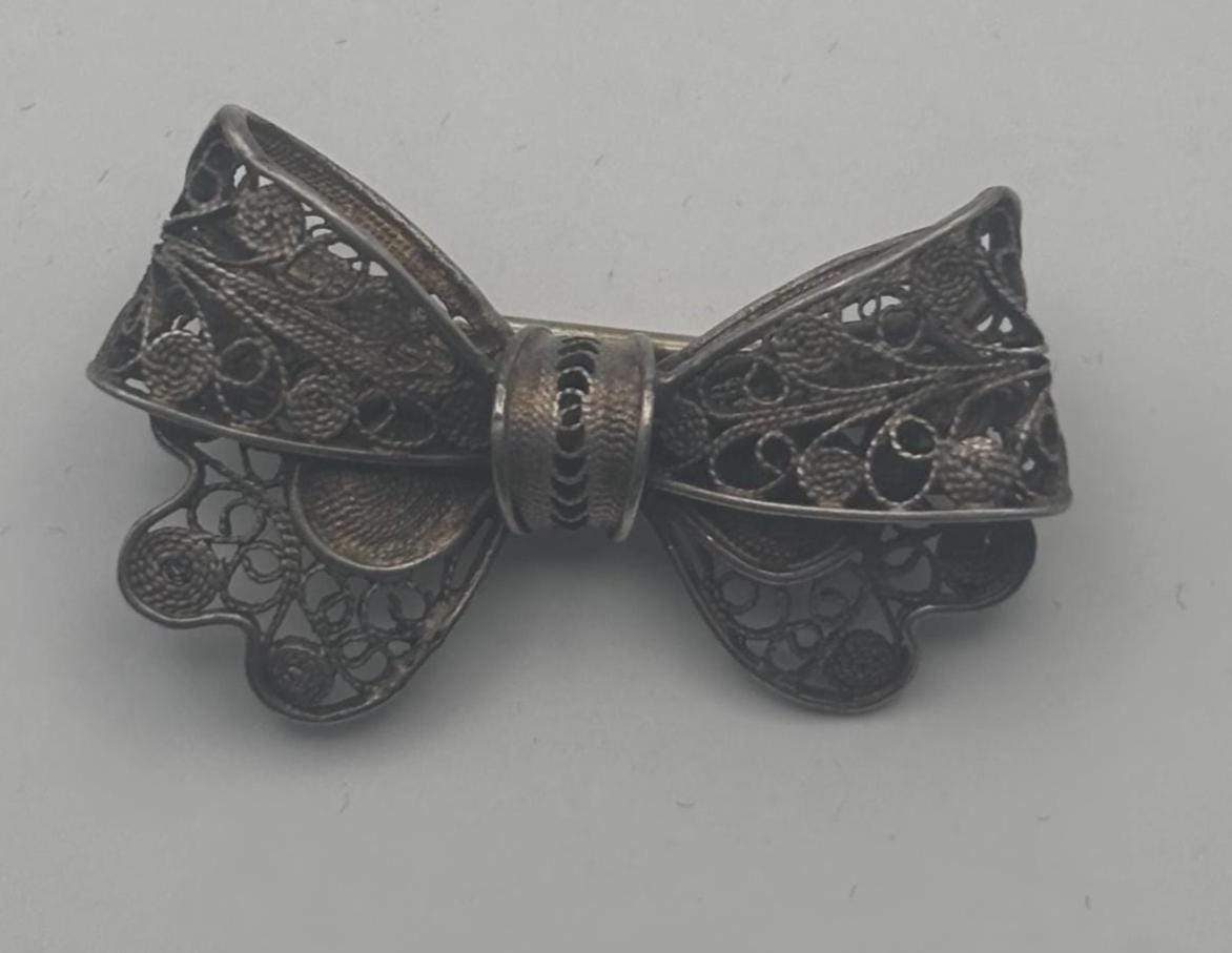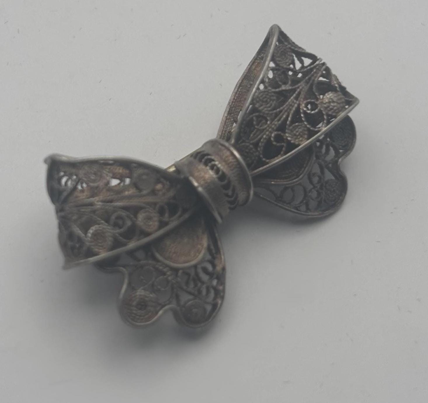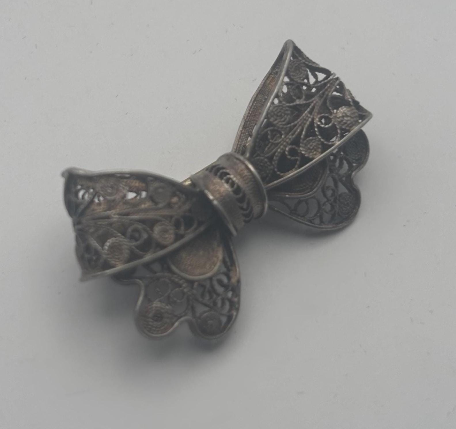 We have a Vintage Sterling Silver Filigree Bow Pin/Brooch. It measures approximately 1 1/4" wide.
