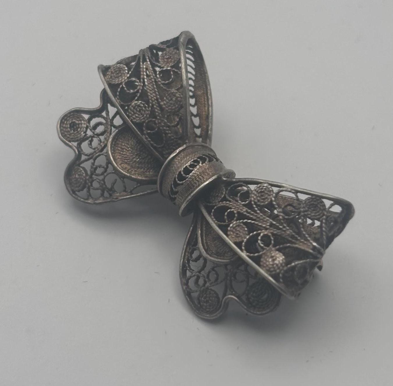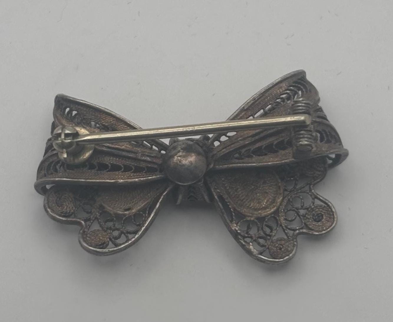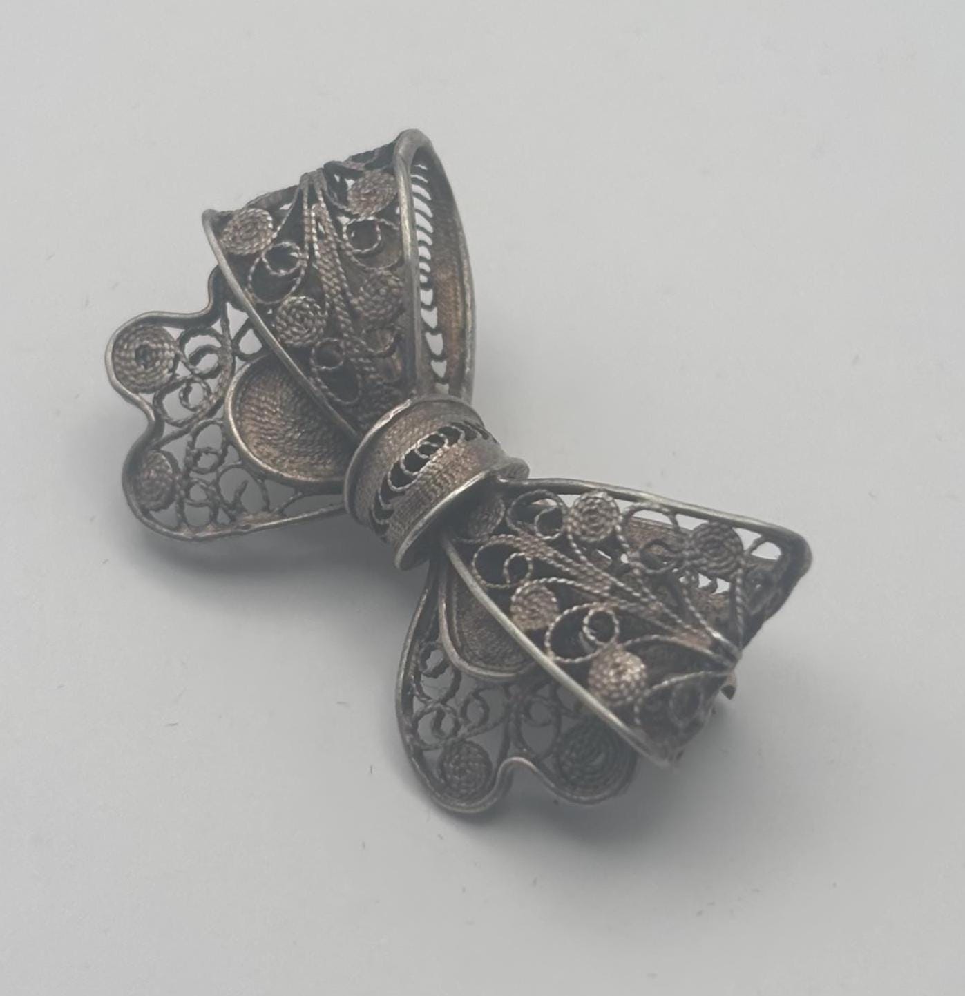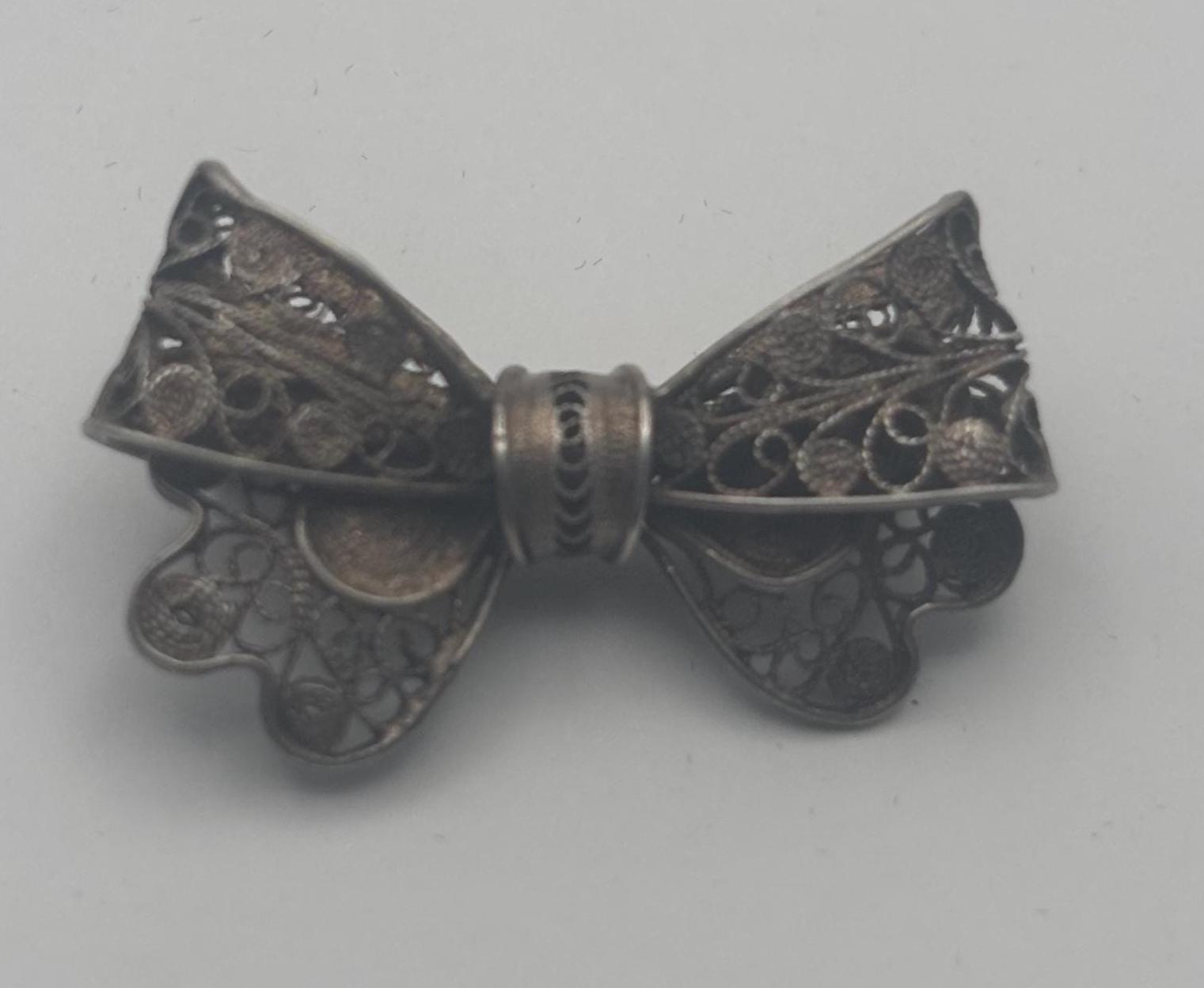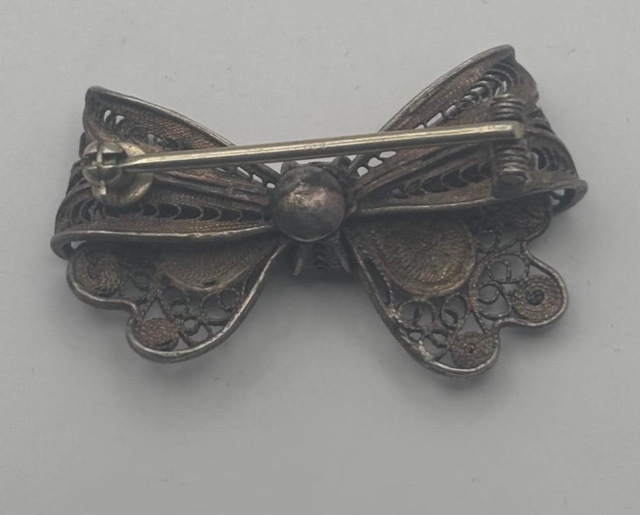 We have a Vintage Sterling Silver Filigree Bow Pin/Brooch. It measures approximately 1 1/4" wide.