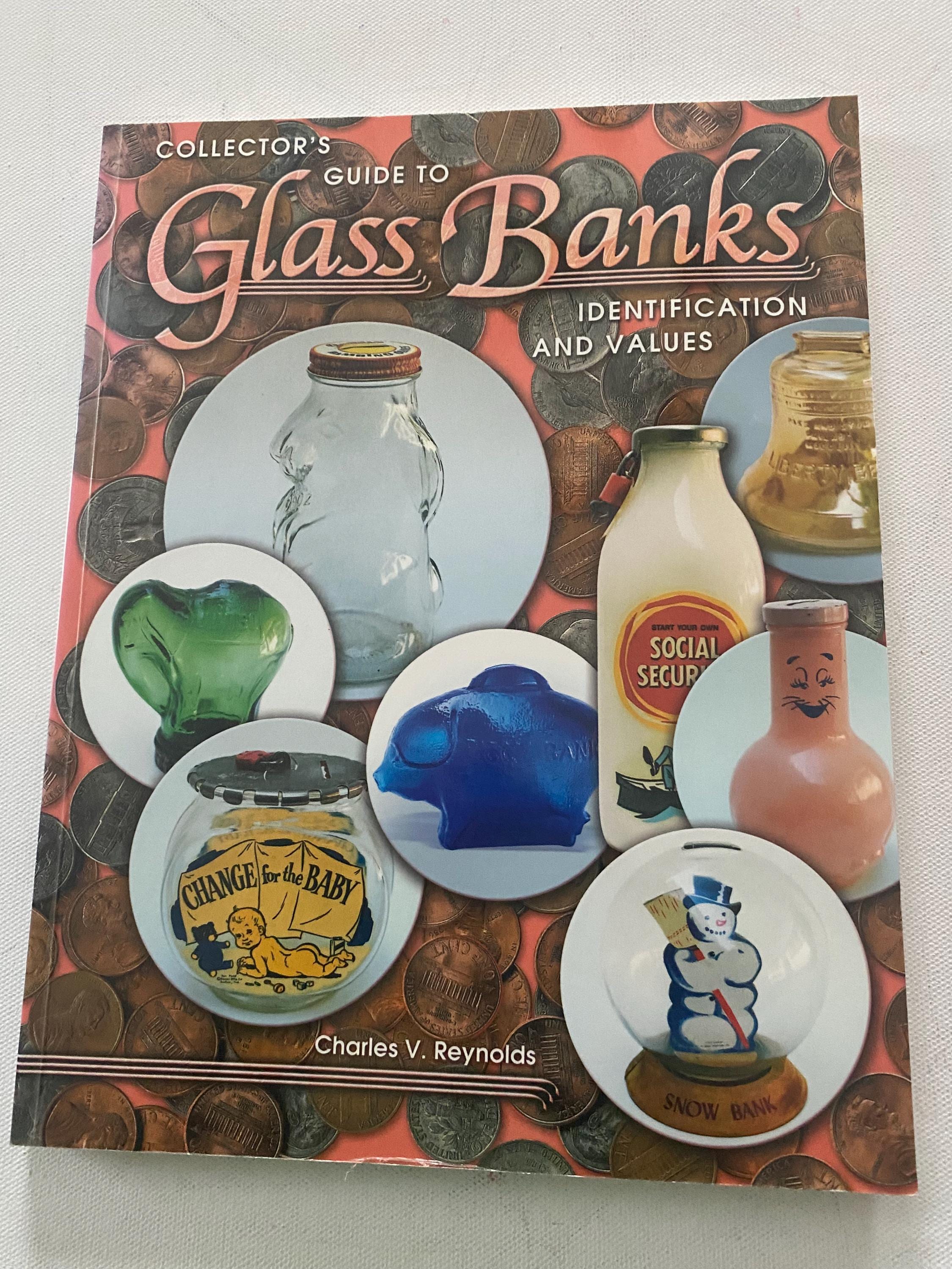 We are so happy to be featuring this vintage book, Glass Banks Identification and Value Guide. By Charles V. Reynolds. This is the most comprehensive book dedicated to glass banks available on today's collector's market, with over 1,100 full color photos. Glass banks, bottle banks, candy containers, bubble banks, fish bowls, glass blocks, advertising mugs, and others are shown and identified. Complete details are listed for each bank pictured, including height, category, price range, available colors, type of glass, slot and label information, and other pertinent information to aid in identification. Please note, these are 2001 values.
