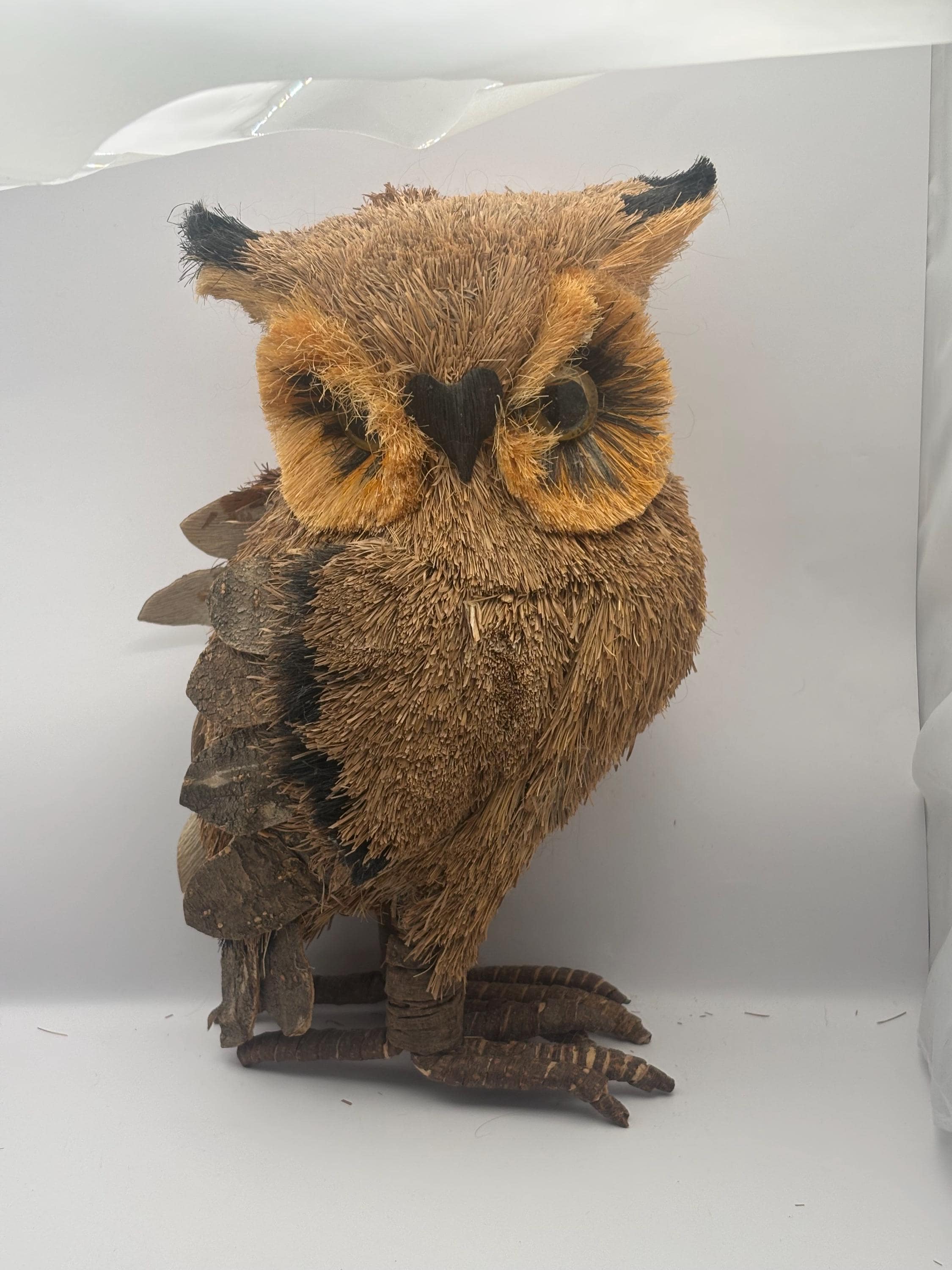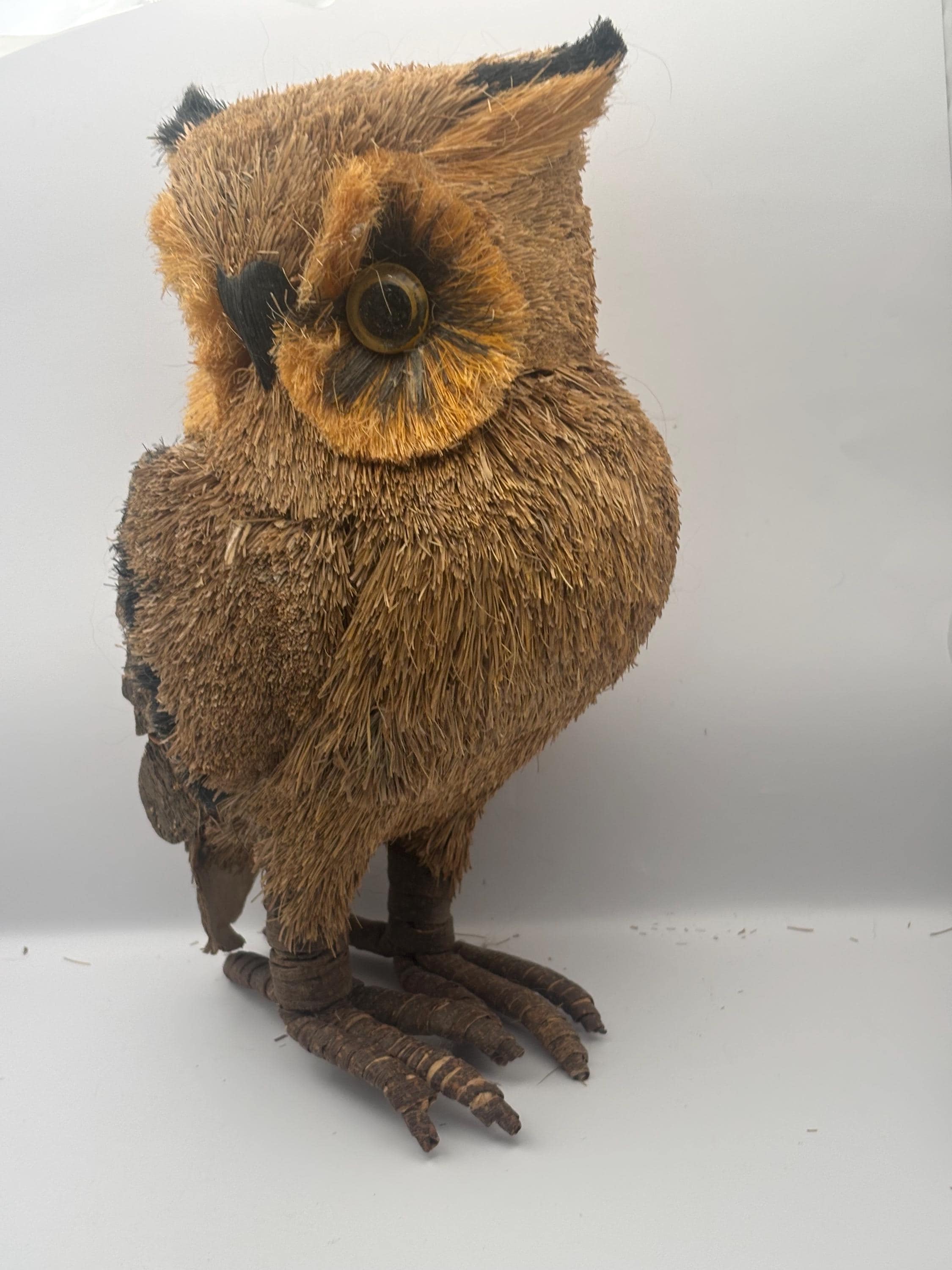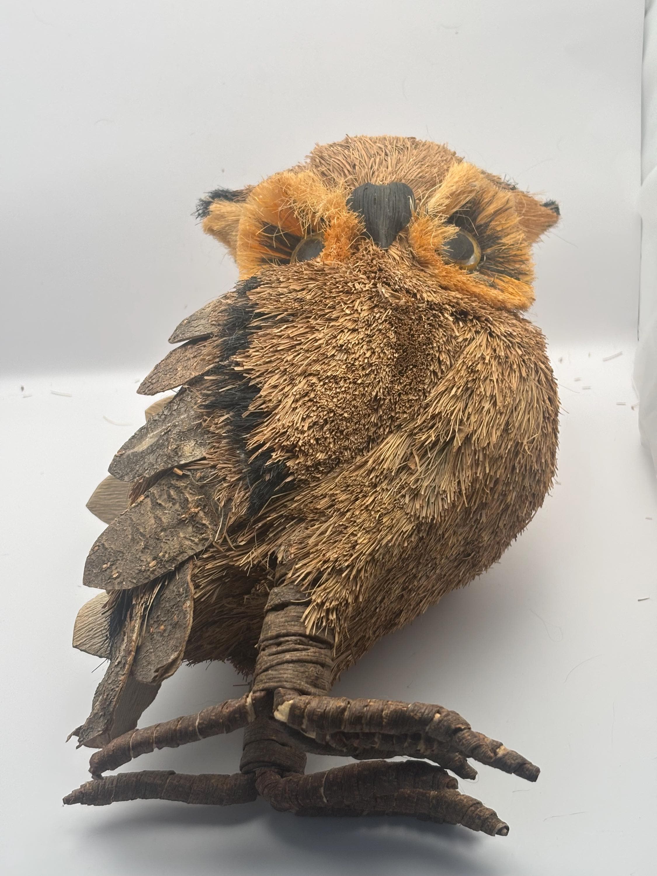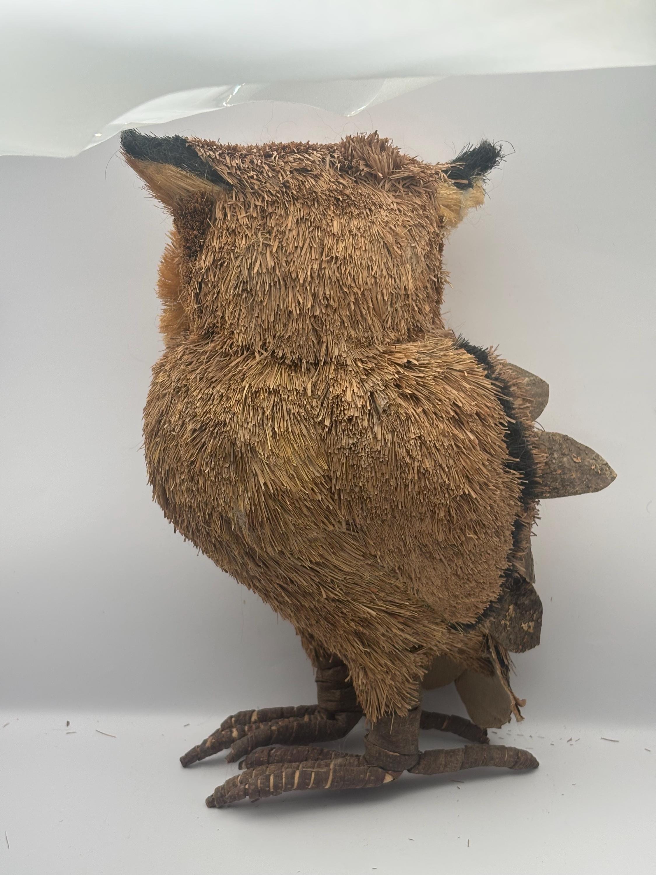 We have a gorgeous Vintage Handmade Rustic Owl Sculpture. It is signed Betty. Its body appears to be made of coconut fiber, straw or sisal. he eyes and ear tufts accented with orange and black coloring. The wings and feet are crafted from pieces of wood or bark. It's a lovely piece!