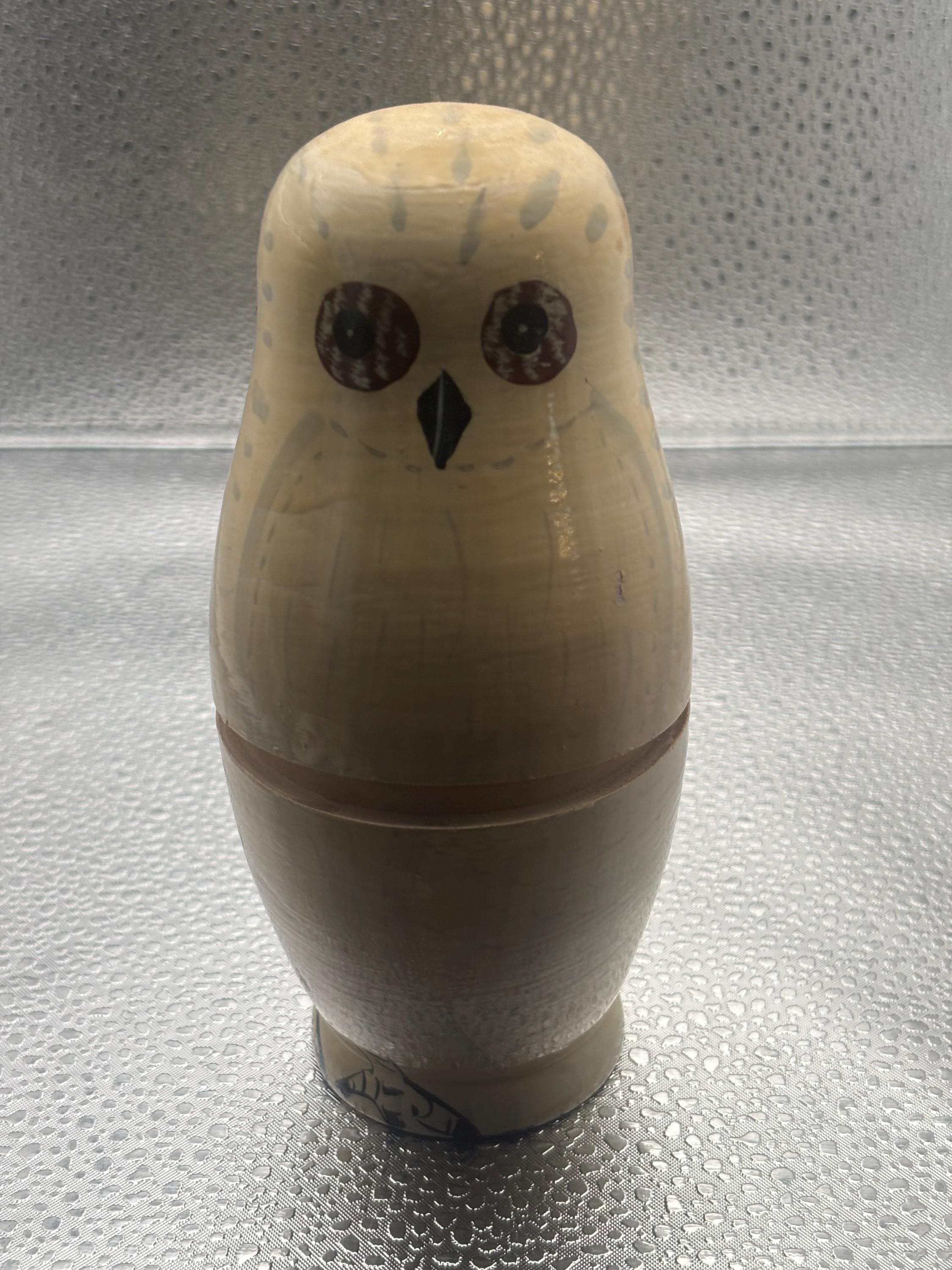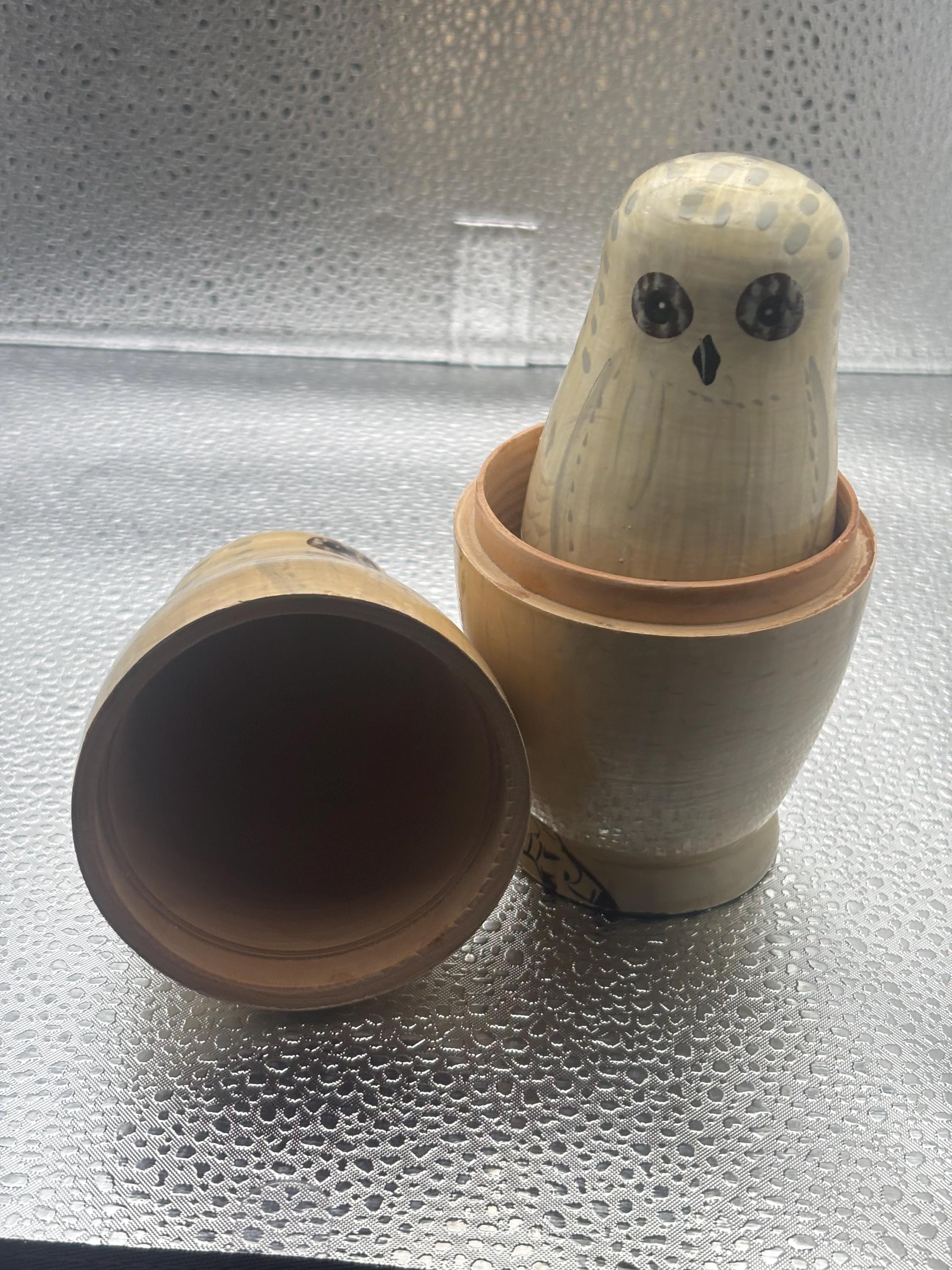 We are delighted to be featuring this Vintage Hand Painted Owl Matryoshka Nesting Dolls. The tallest is 6".