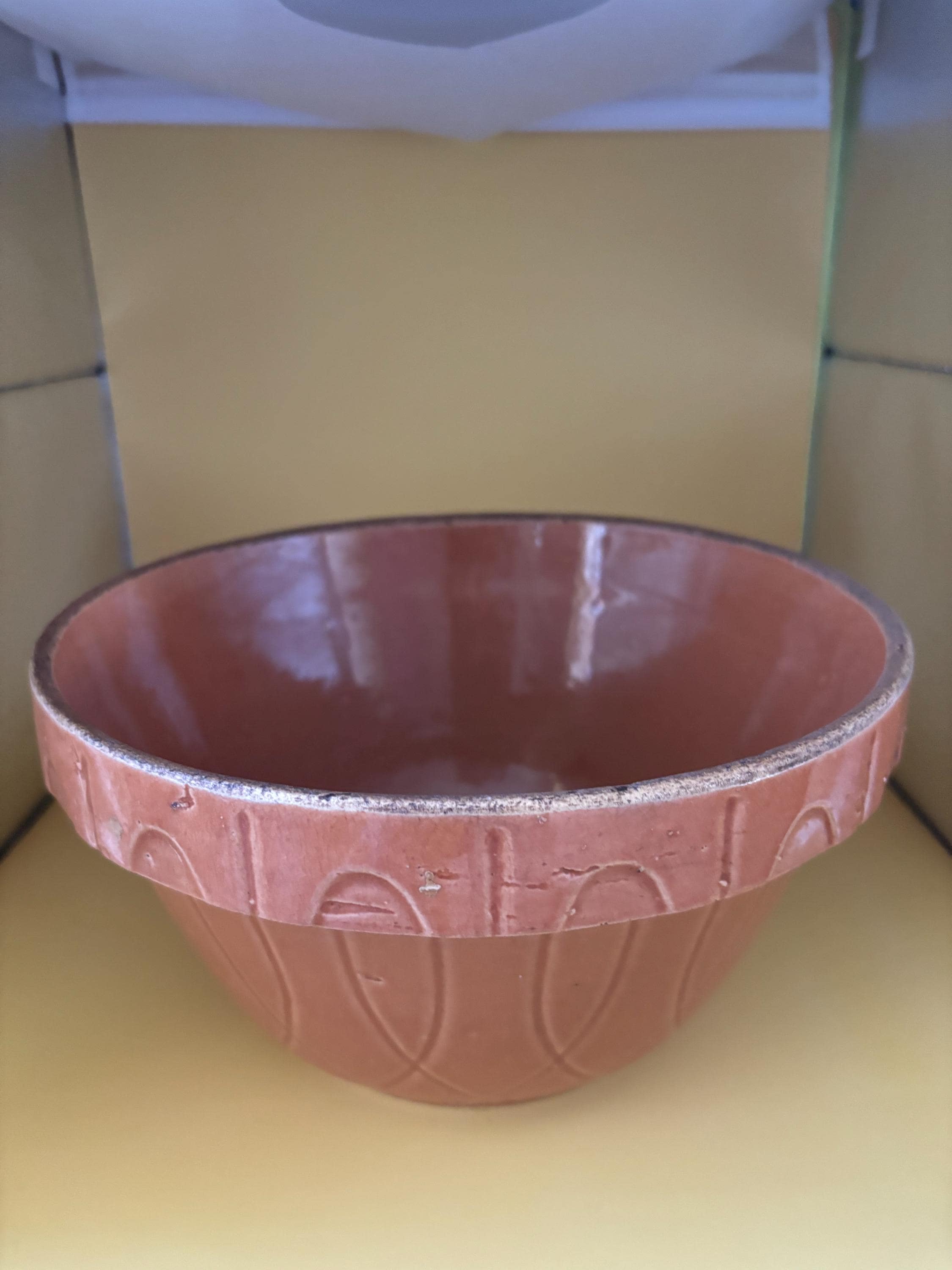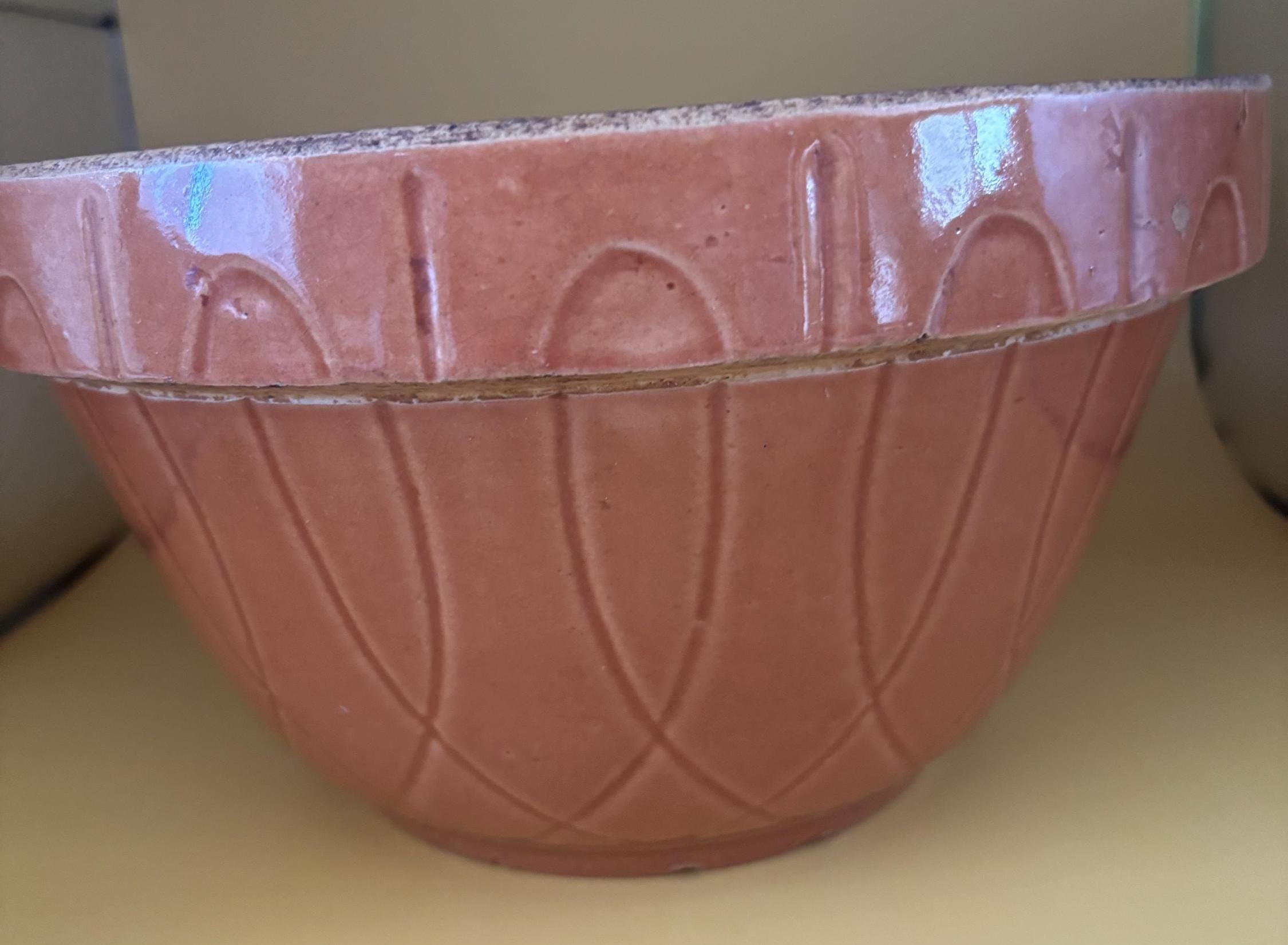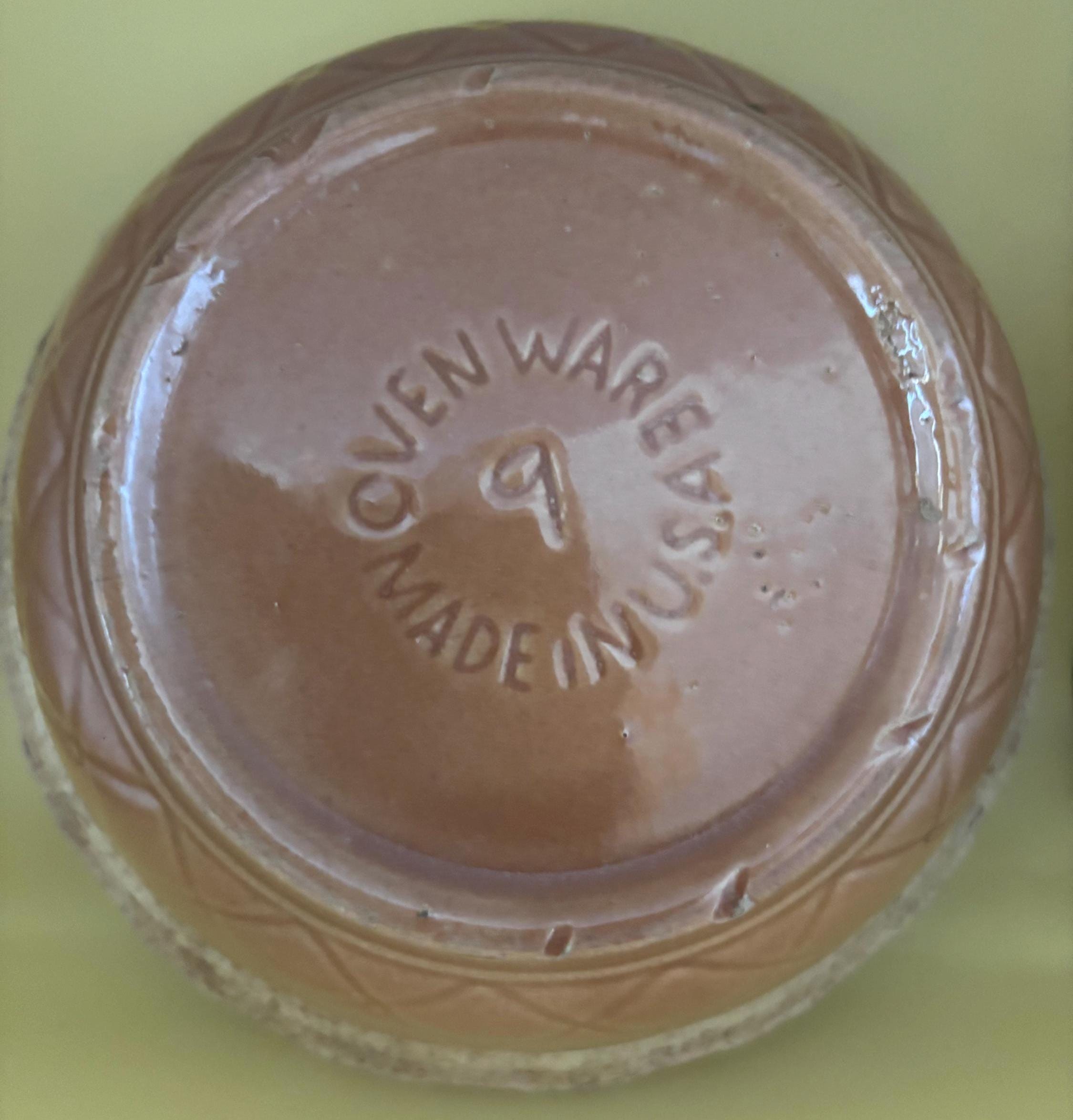 We are proud to present this Vintage WATT USA 9 Ovenware Bowl. Marked USA 9. Which makies this the larger size in the WATT Pottery line. The bowl is the Loops pattern and features the characteristic pumpkin orange glaze over a yelloware clay body. Circa 1930's to late 1940's.