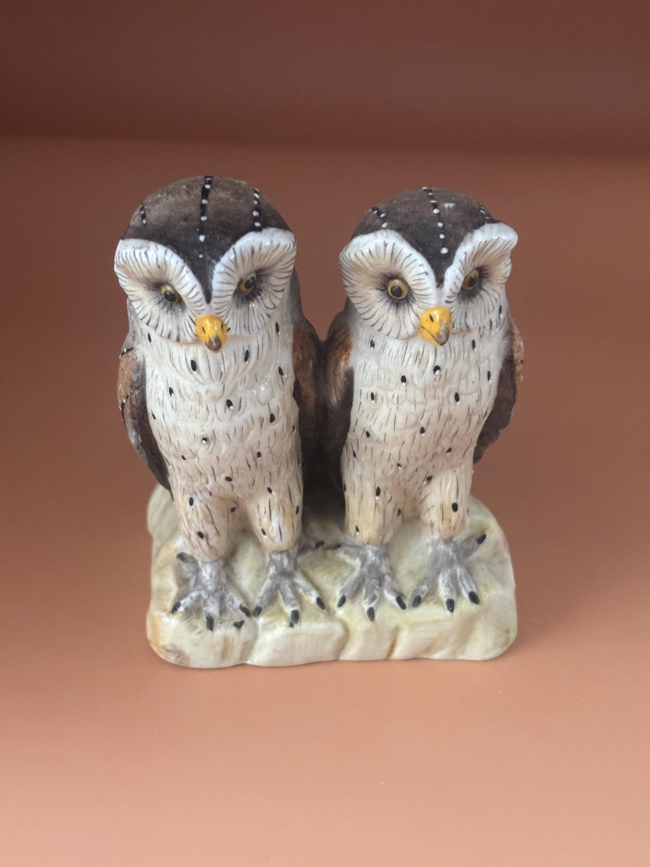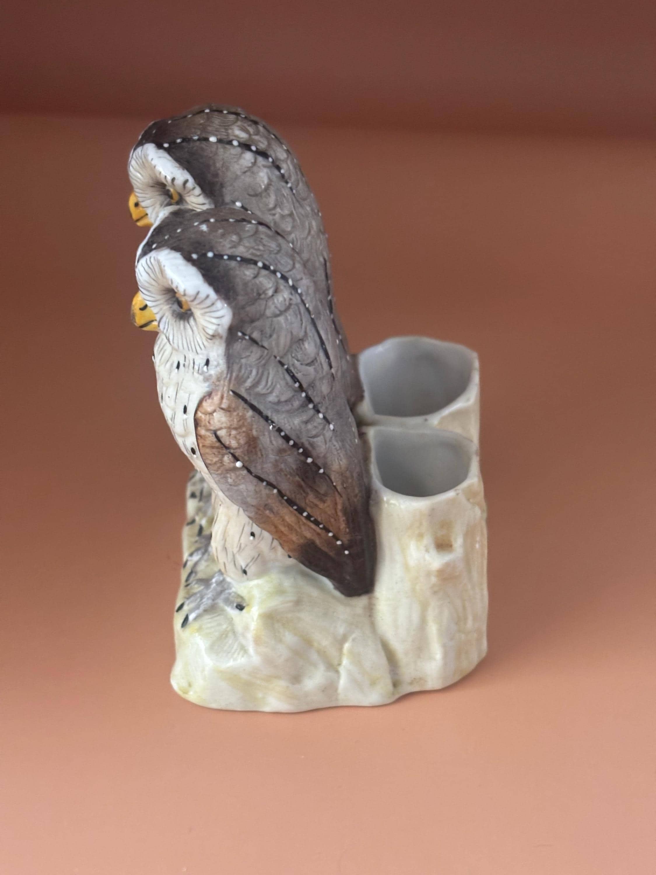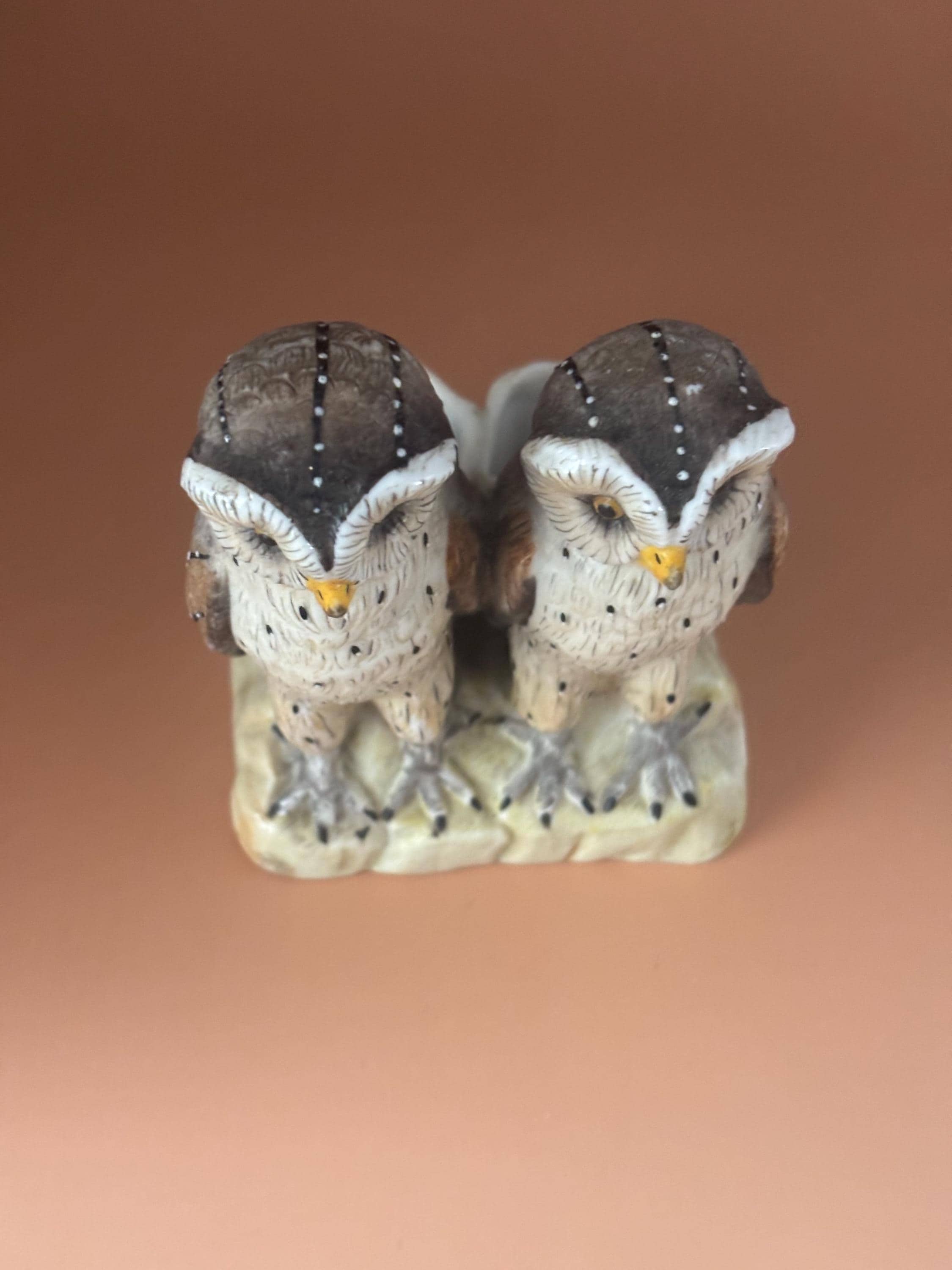 We are delighted to be featuring this lovely Antique Ernst Bohne & Sohne Two Owls on a Log Porcelain Figurine. It is signed EBS on the bottom. It measures approximately 3" wide, 3 3/4" high.